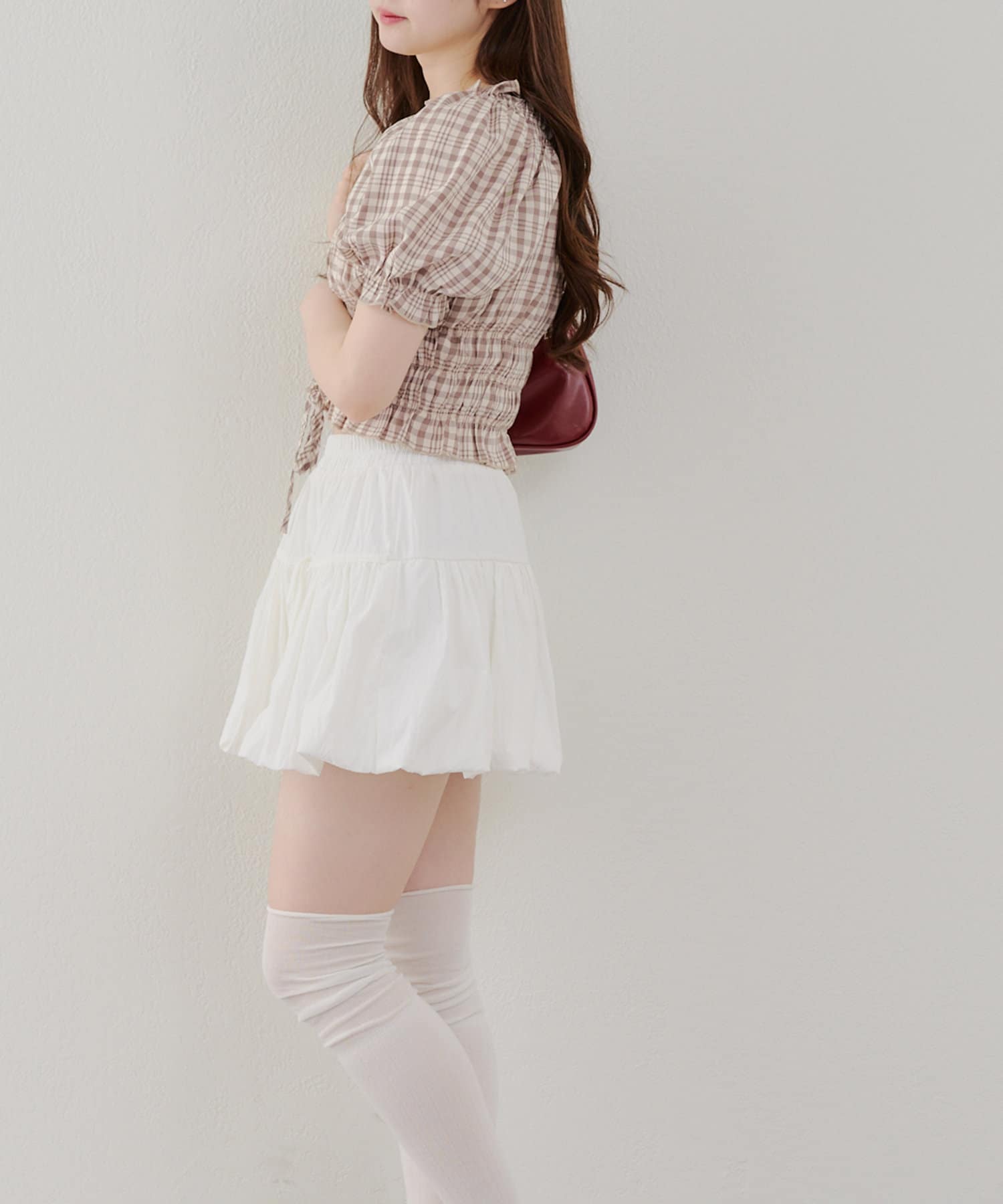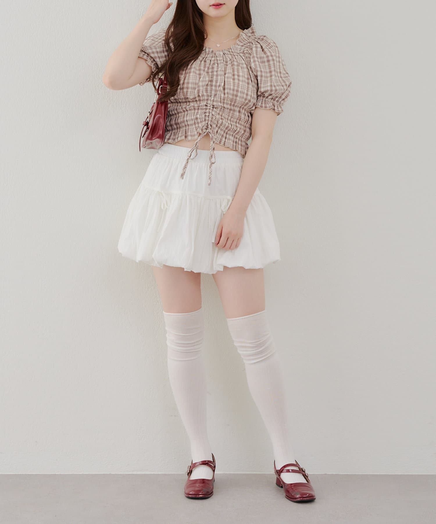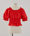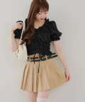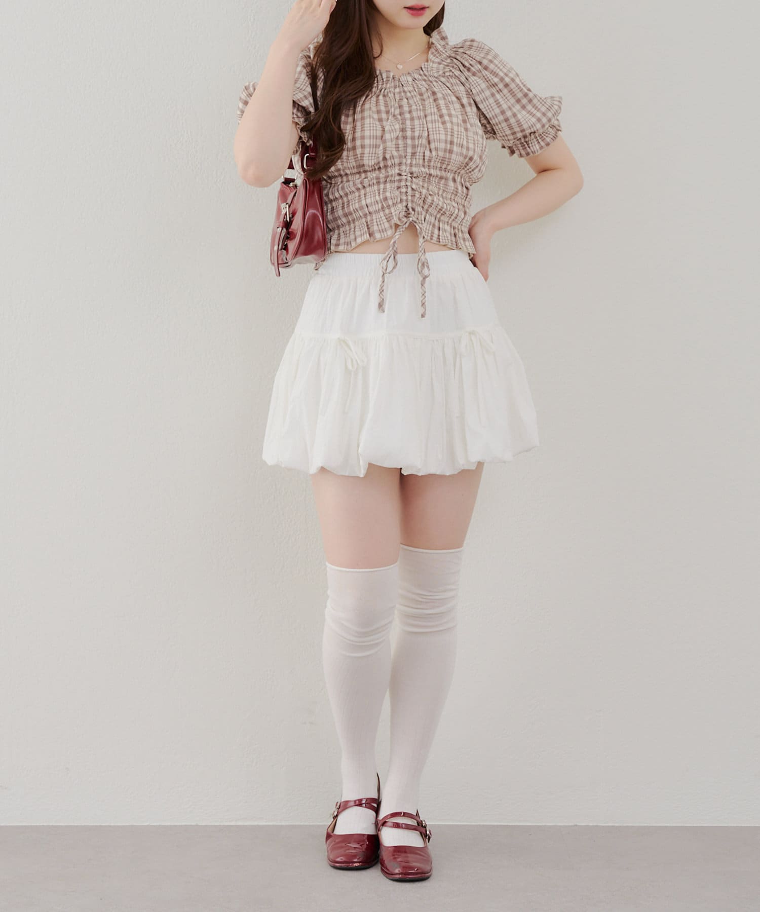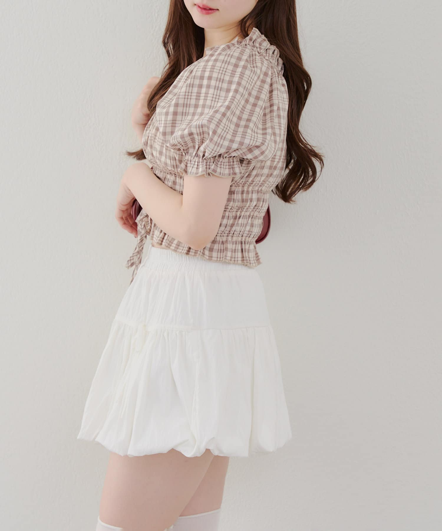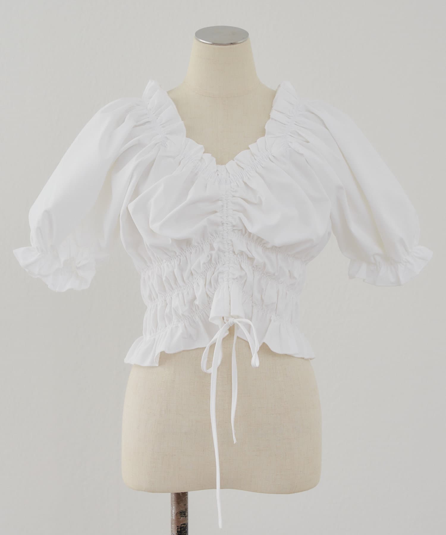 ・ウエスト周りに施されたシャーリングがスタイルアップ効果に。