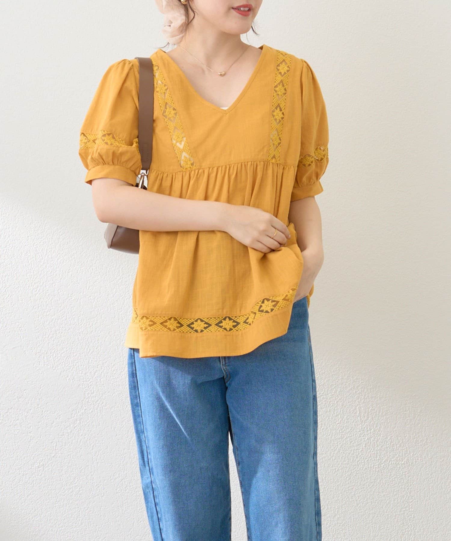 マスタードカラーが鮮やかだが単体で見ればシンプルなのに、上記スカートと合わせると一気に異国に大変身できる。