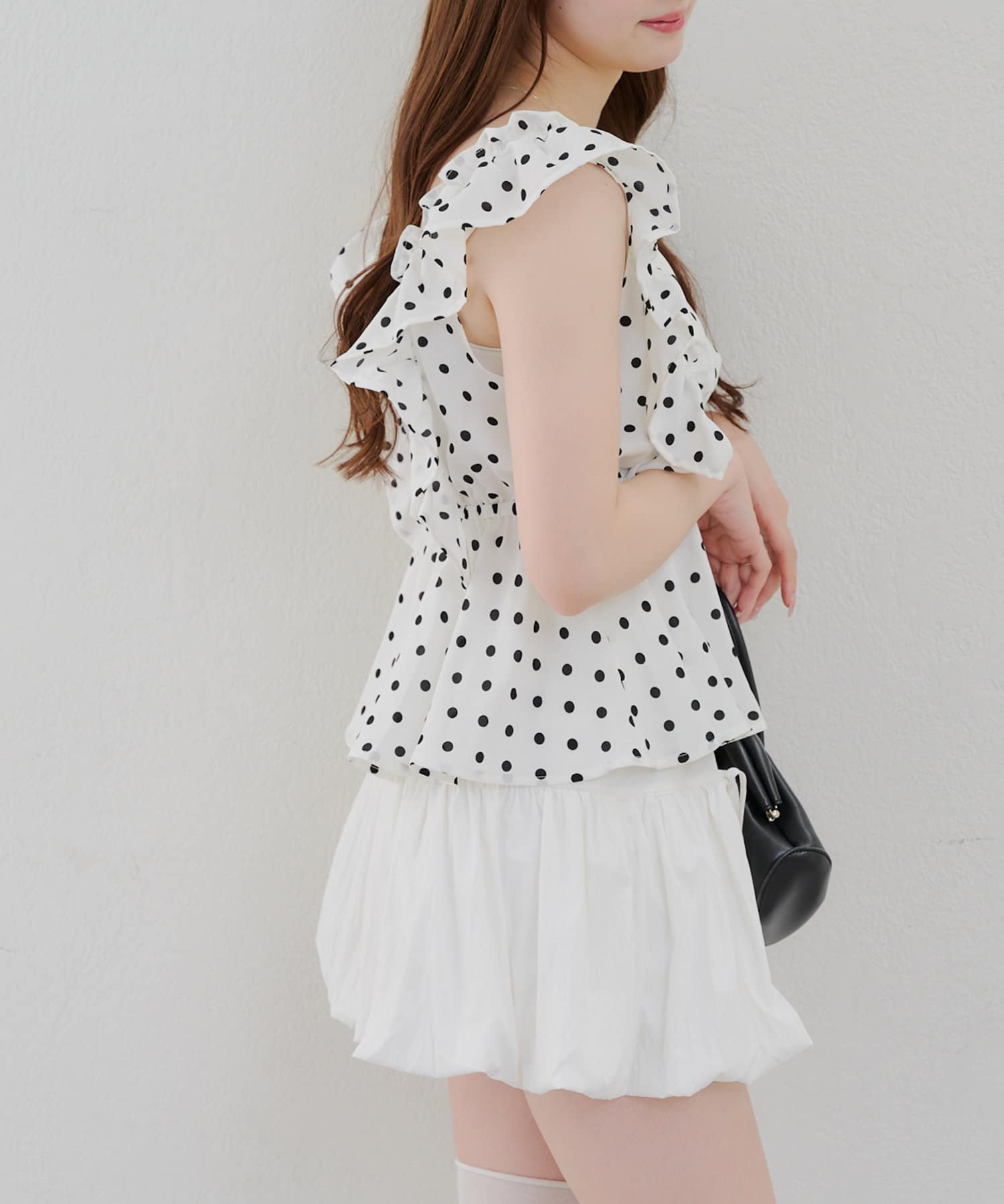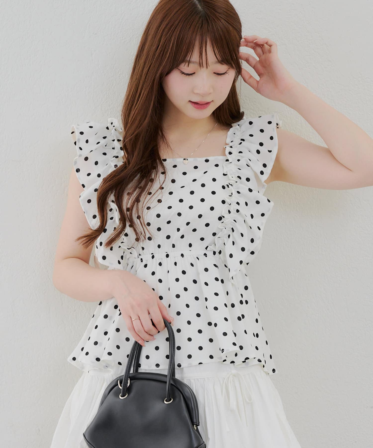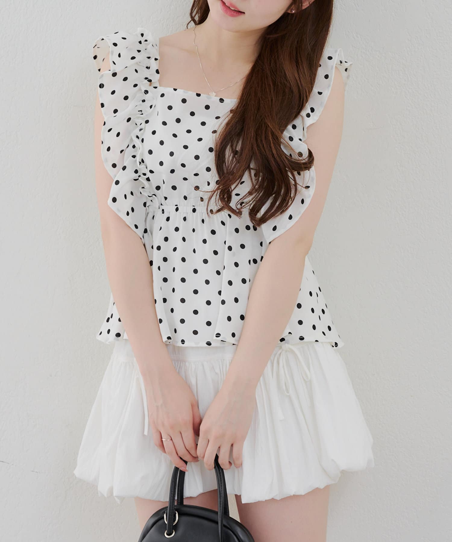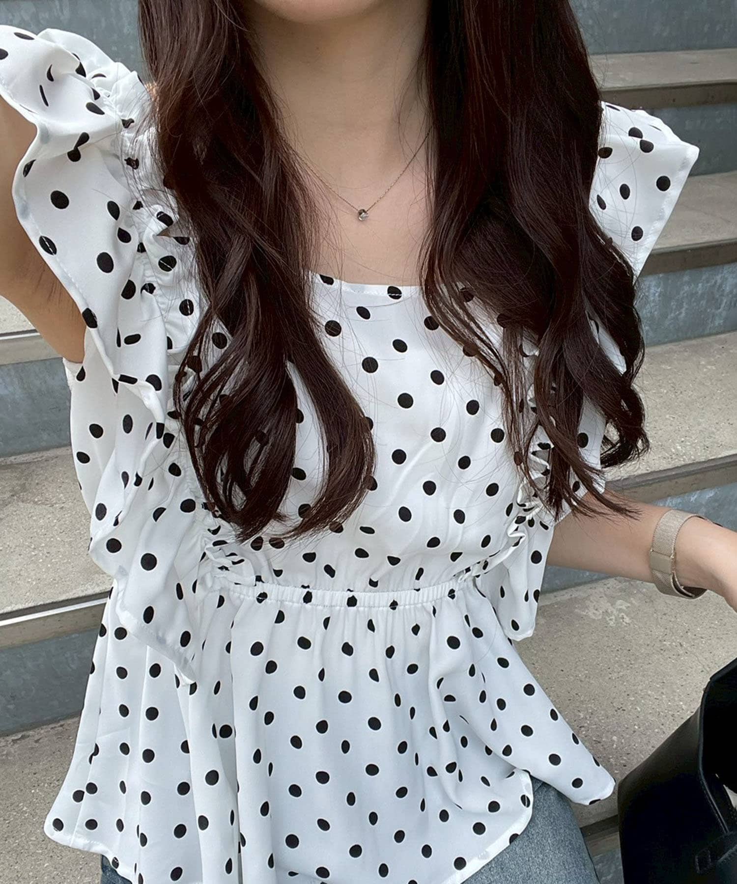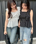 ・コーデの主役になるドット柄のガーリーなブラウス。