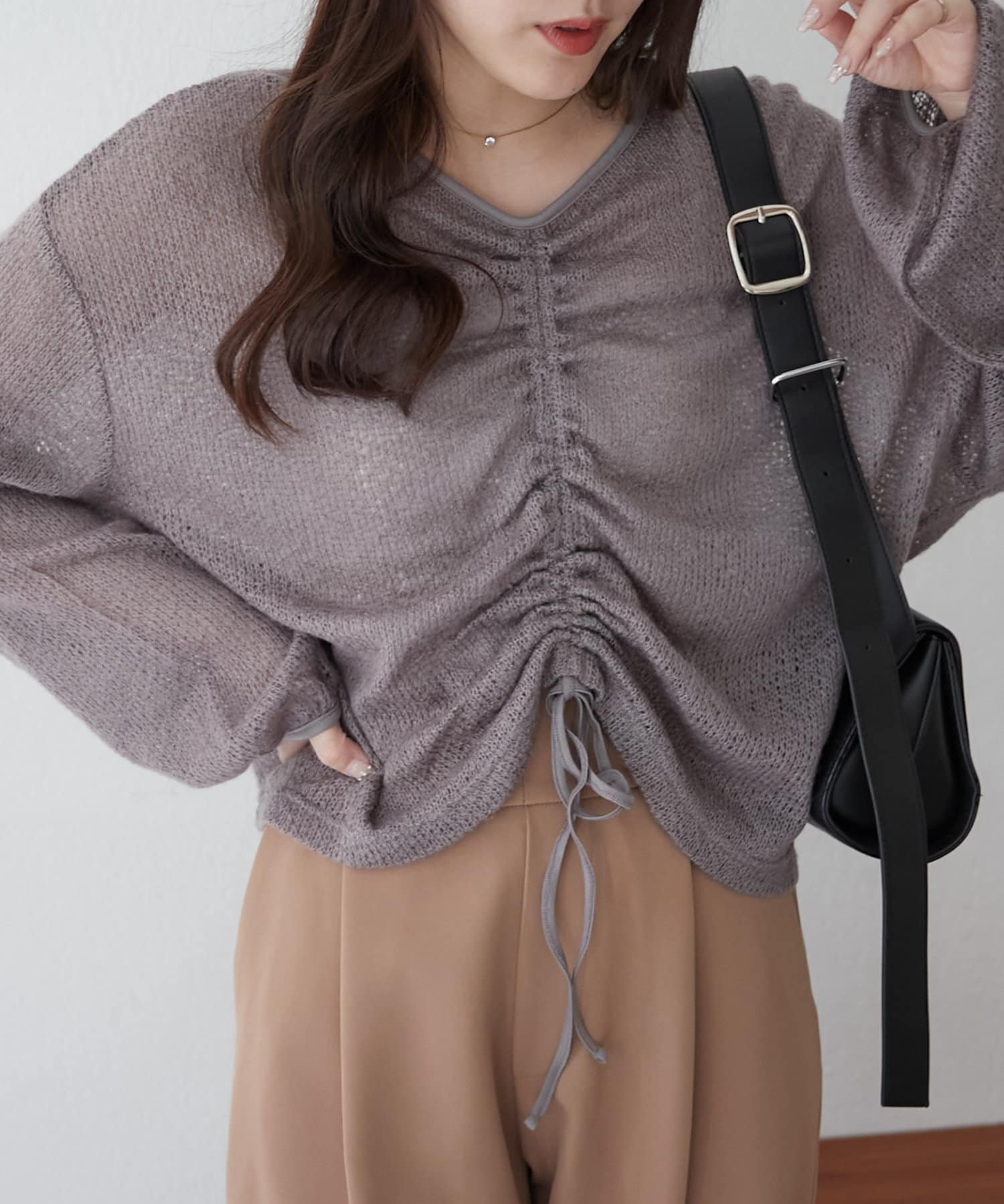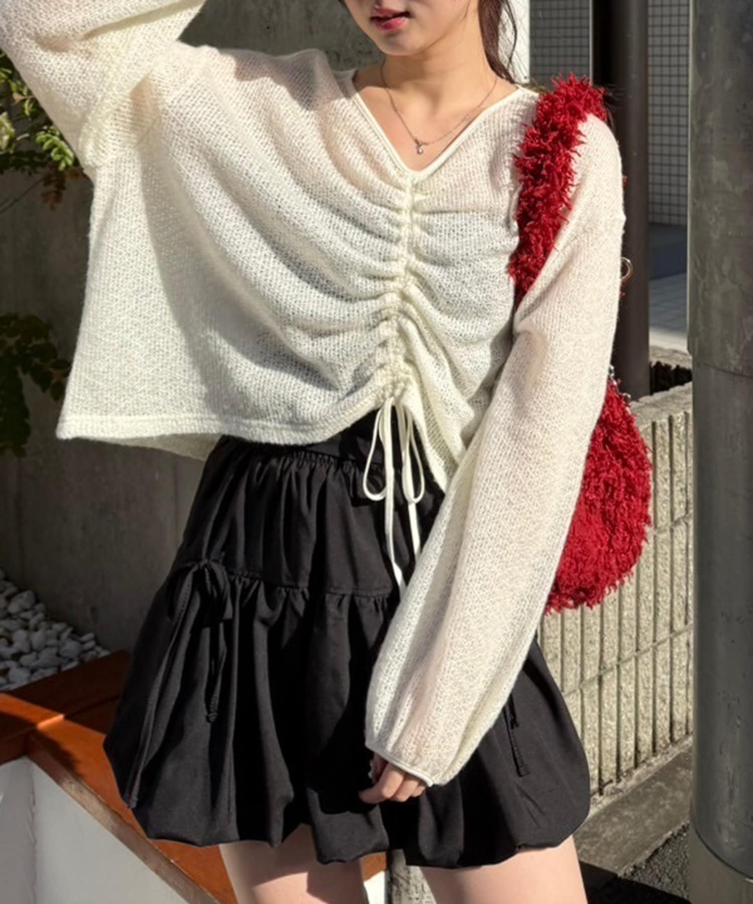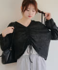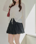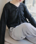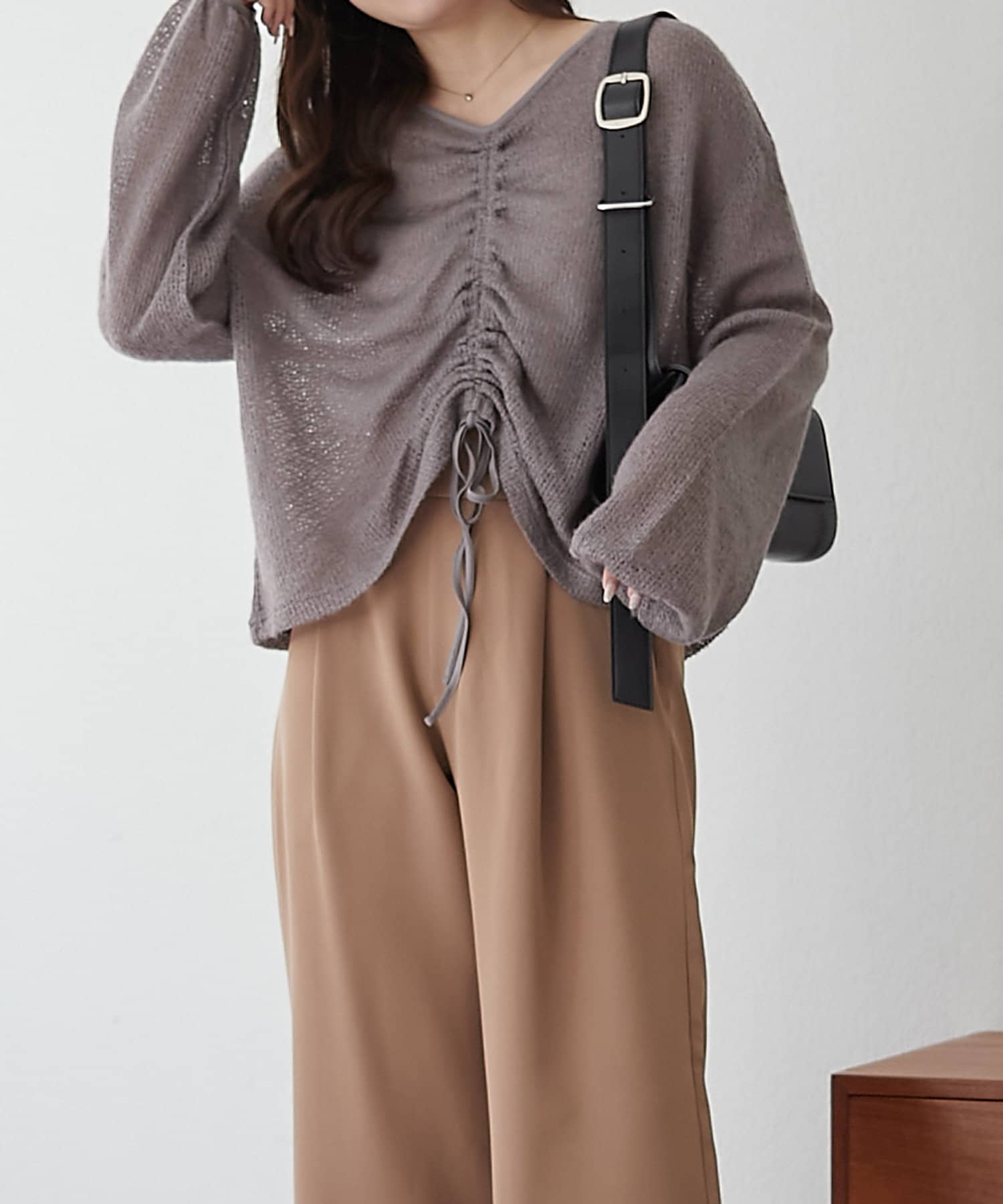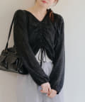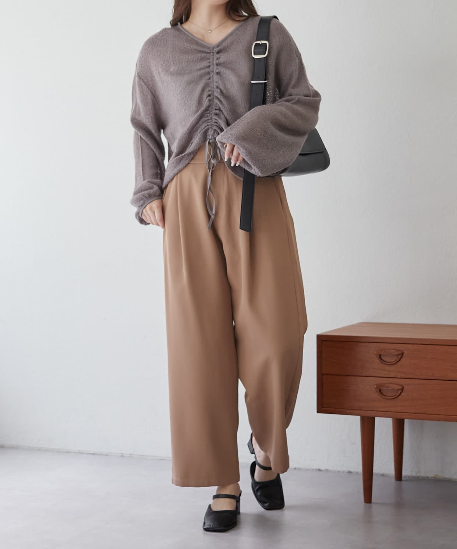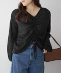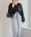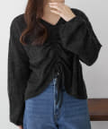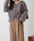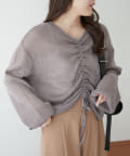 着用感:ドロスト部分をしぼることでくしゅくしゅ具合を調整でき、 合わせるインナーやボトムスによってテイストを変えられます