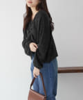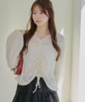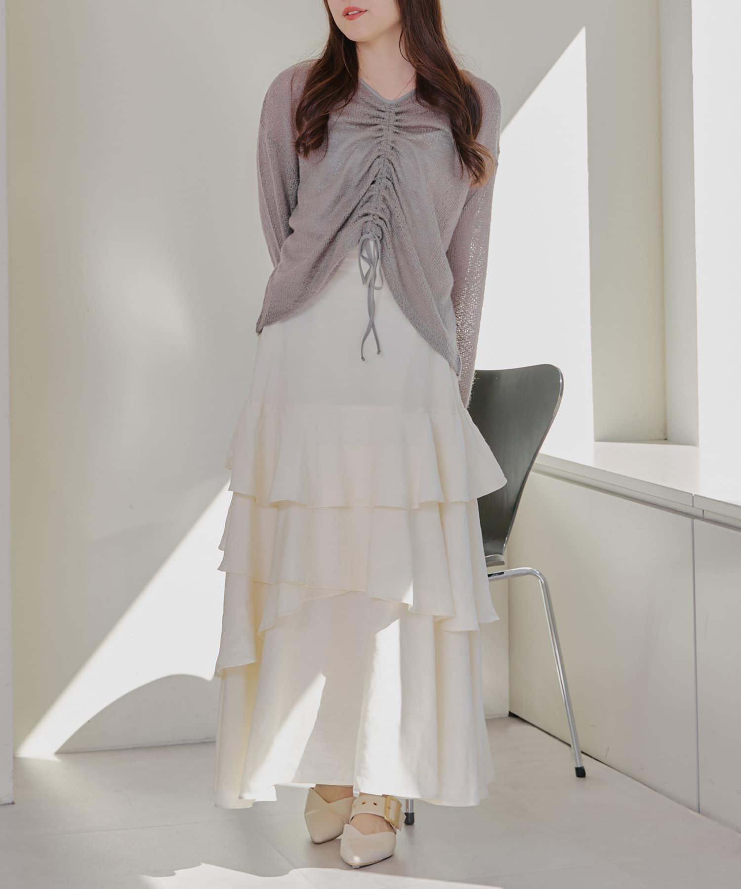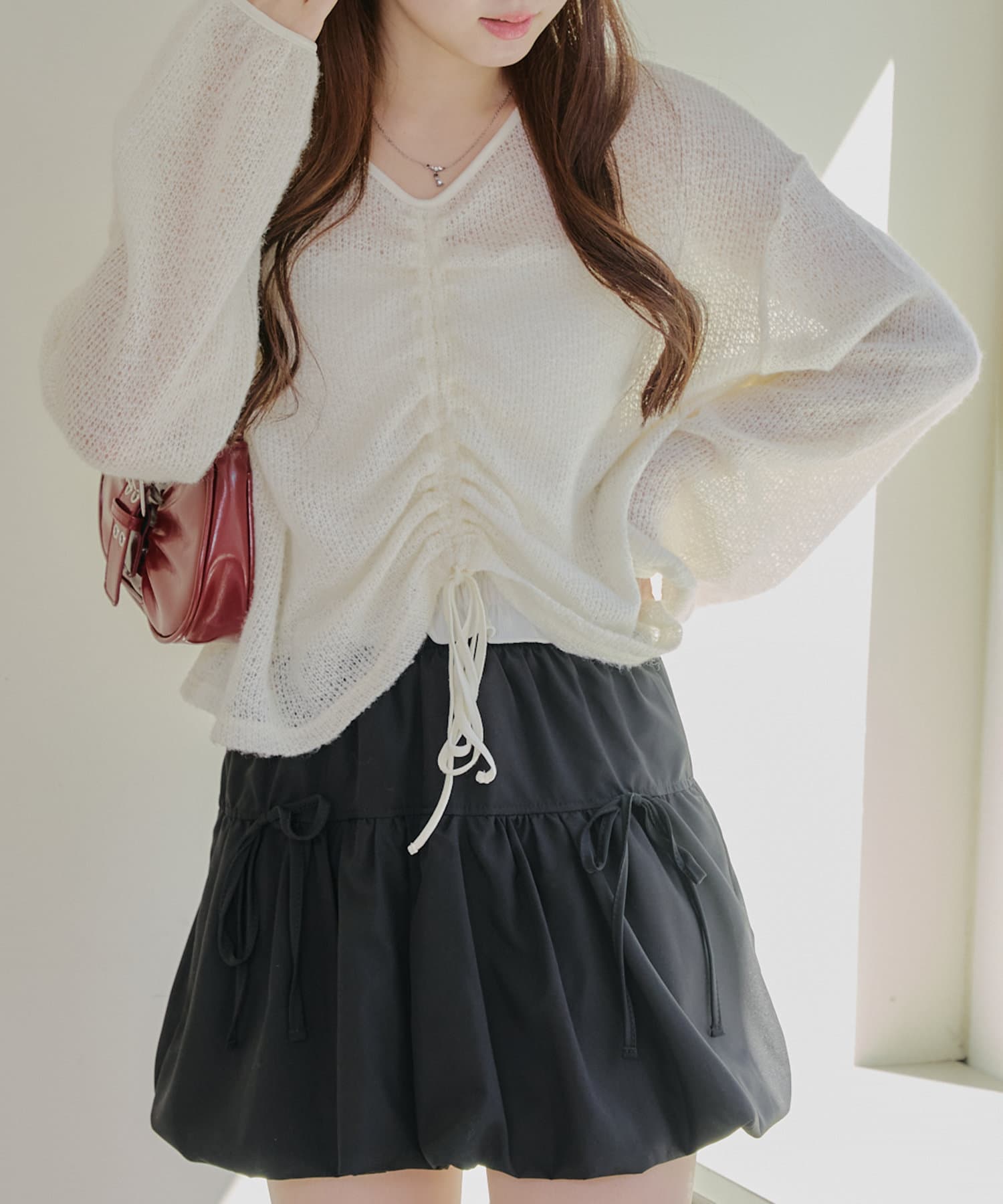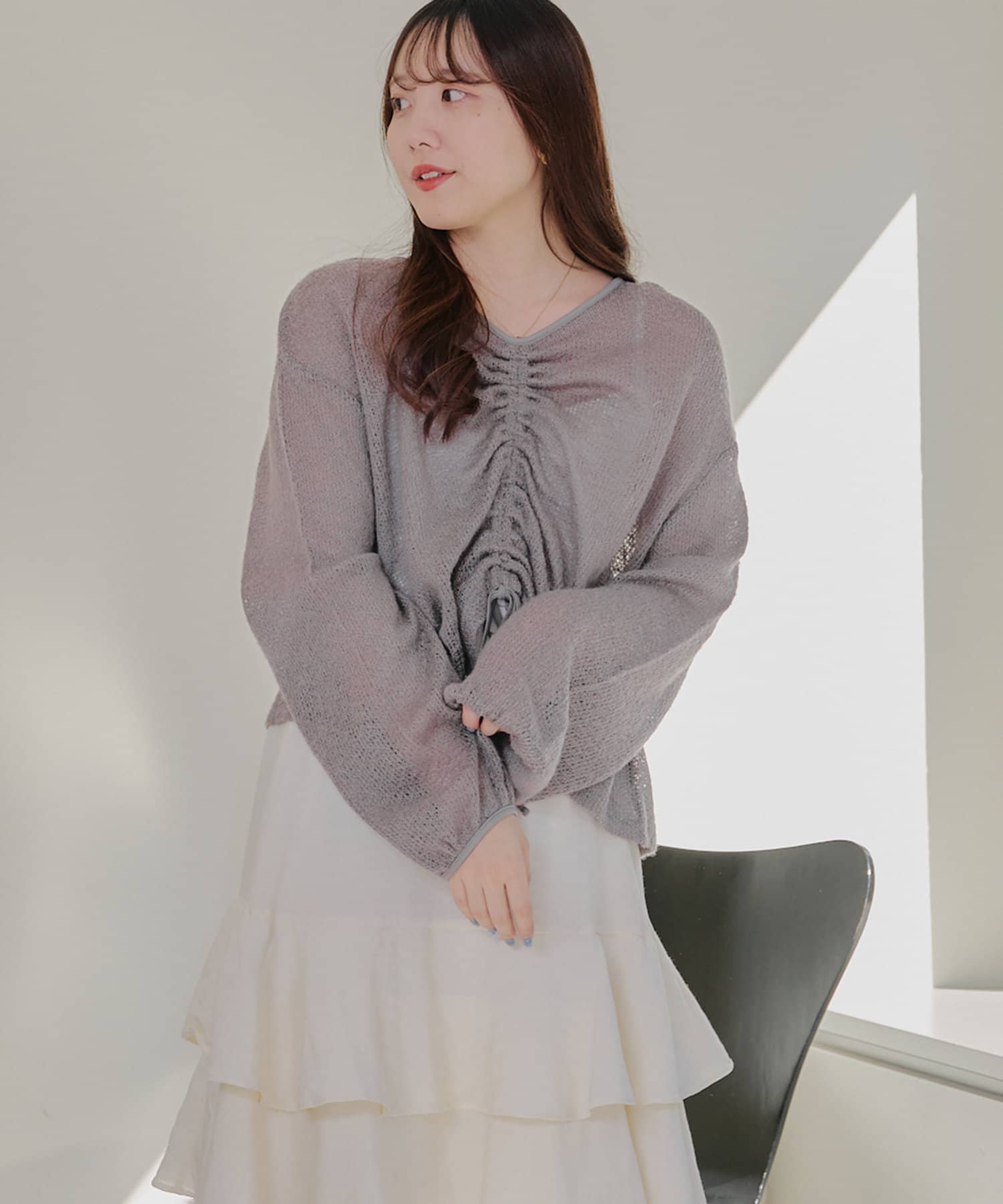 着用感:ドロスト部分をしぼることでくしゅくしゅ具合を調整でき、 合わせるインナーやボトムスによってテイストを変えられます