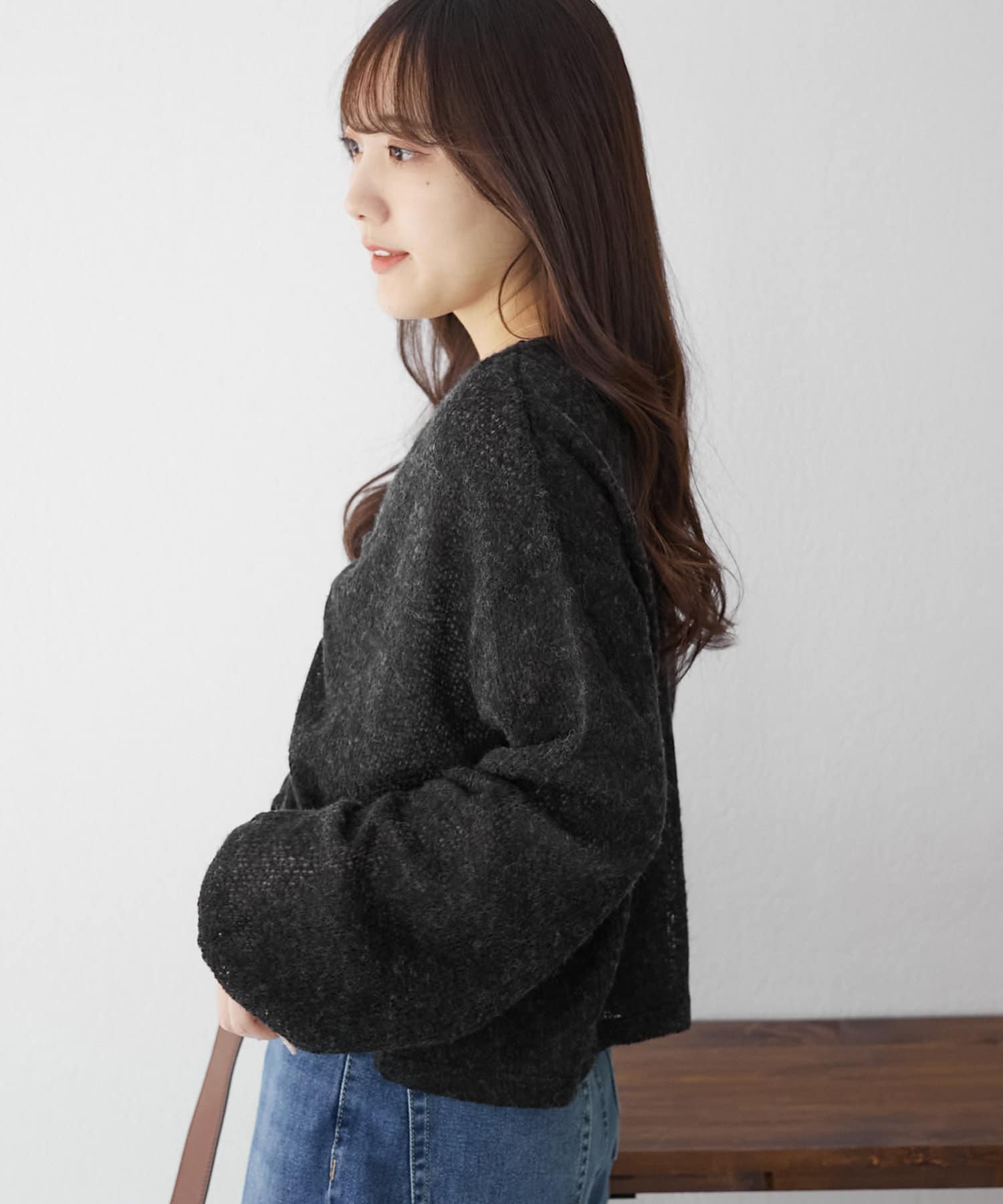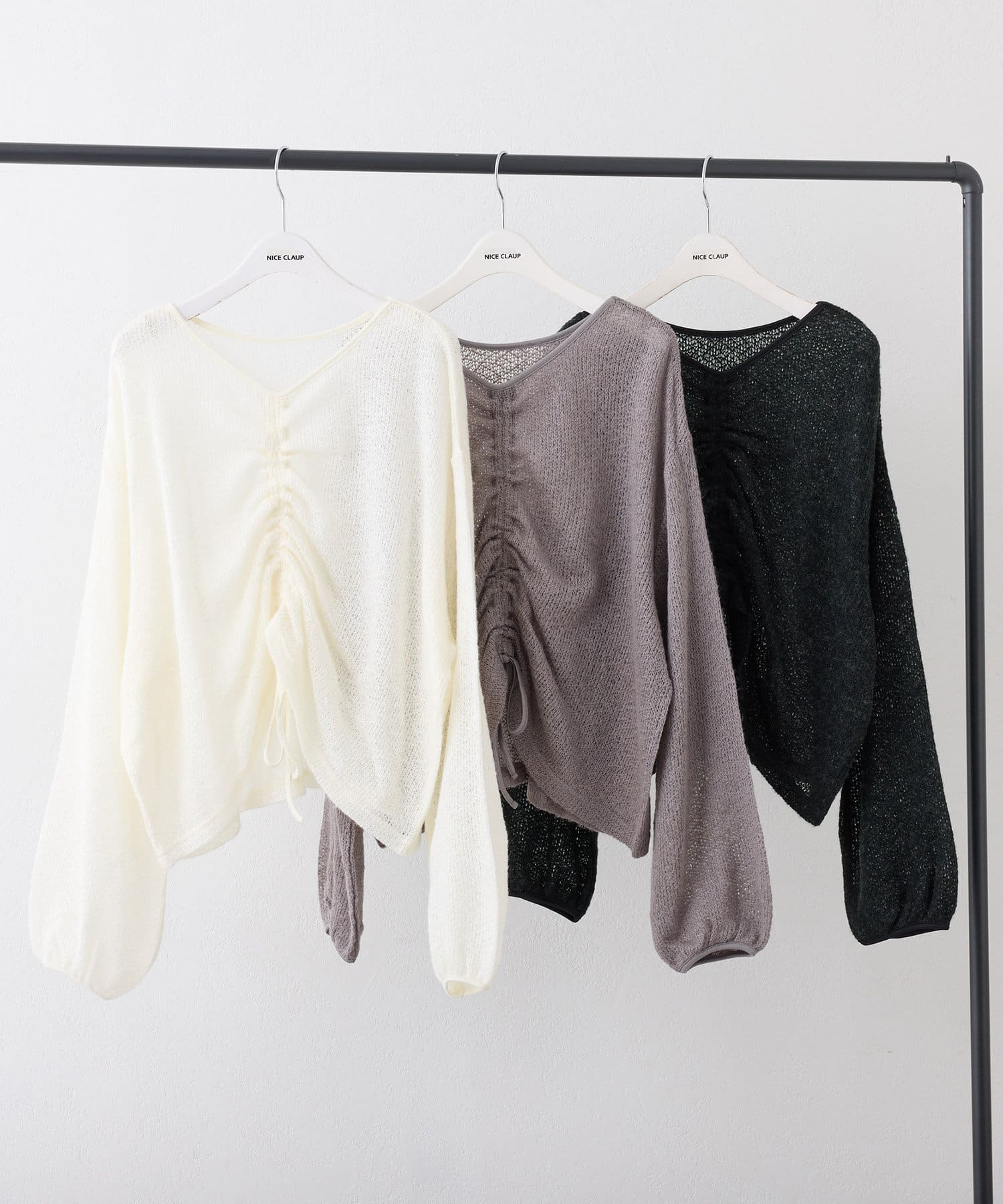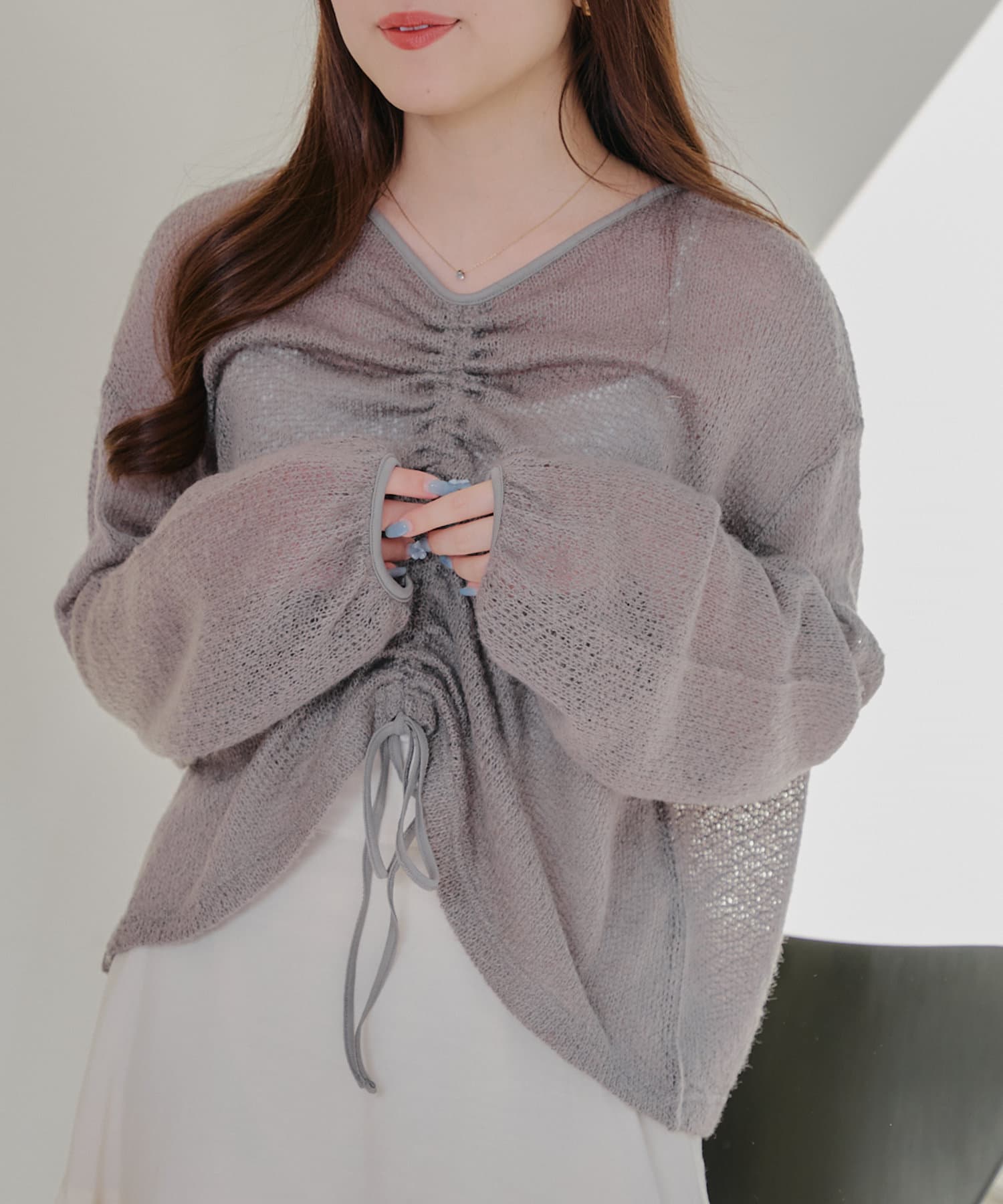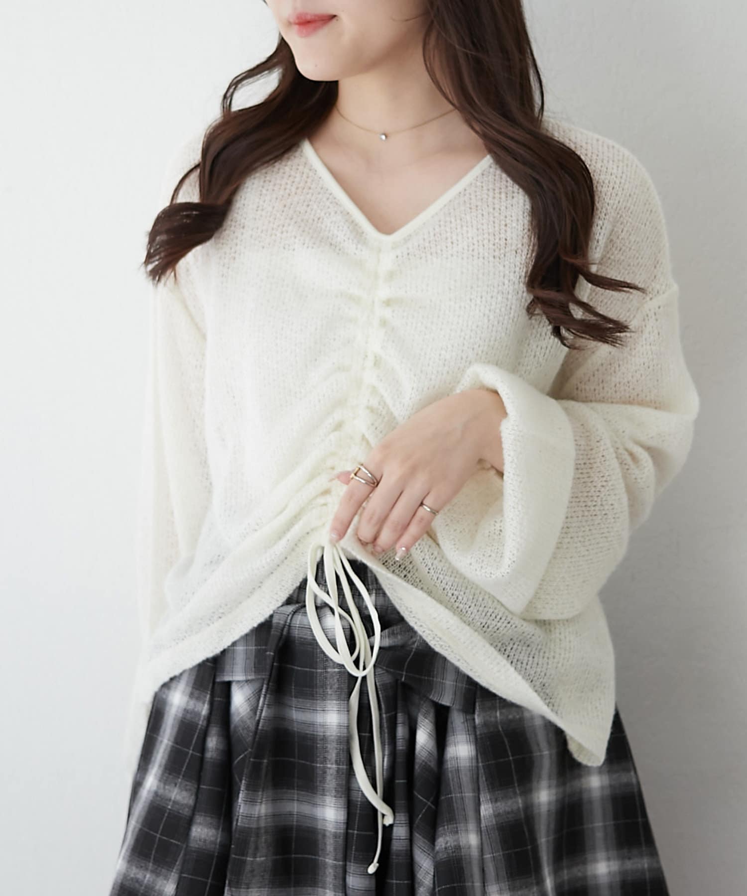 着用感:ドロスト部分をしぼることでくしゅくしゅ具合を調整でき、 合わせるインナーやボトムスによってテイストを変えられます