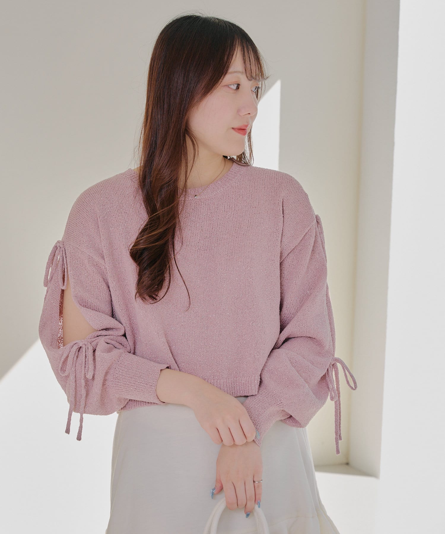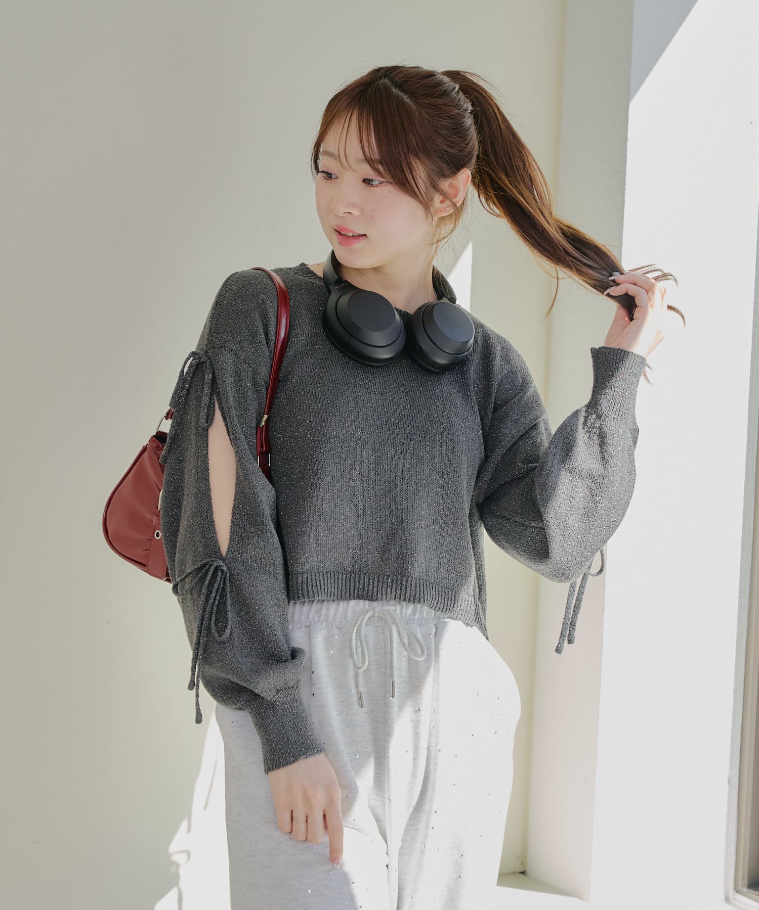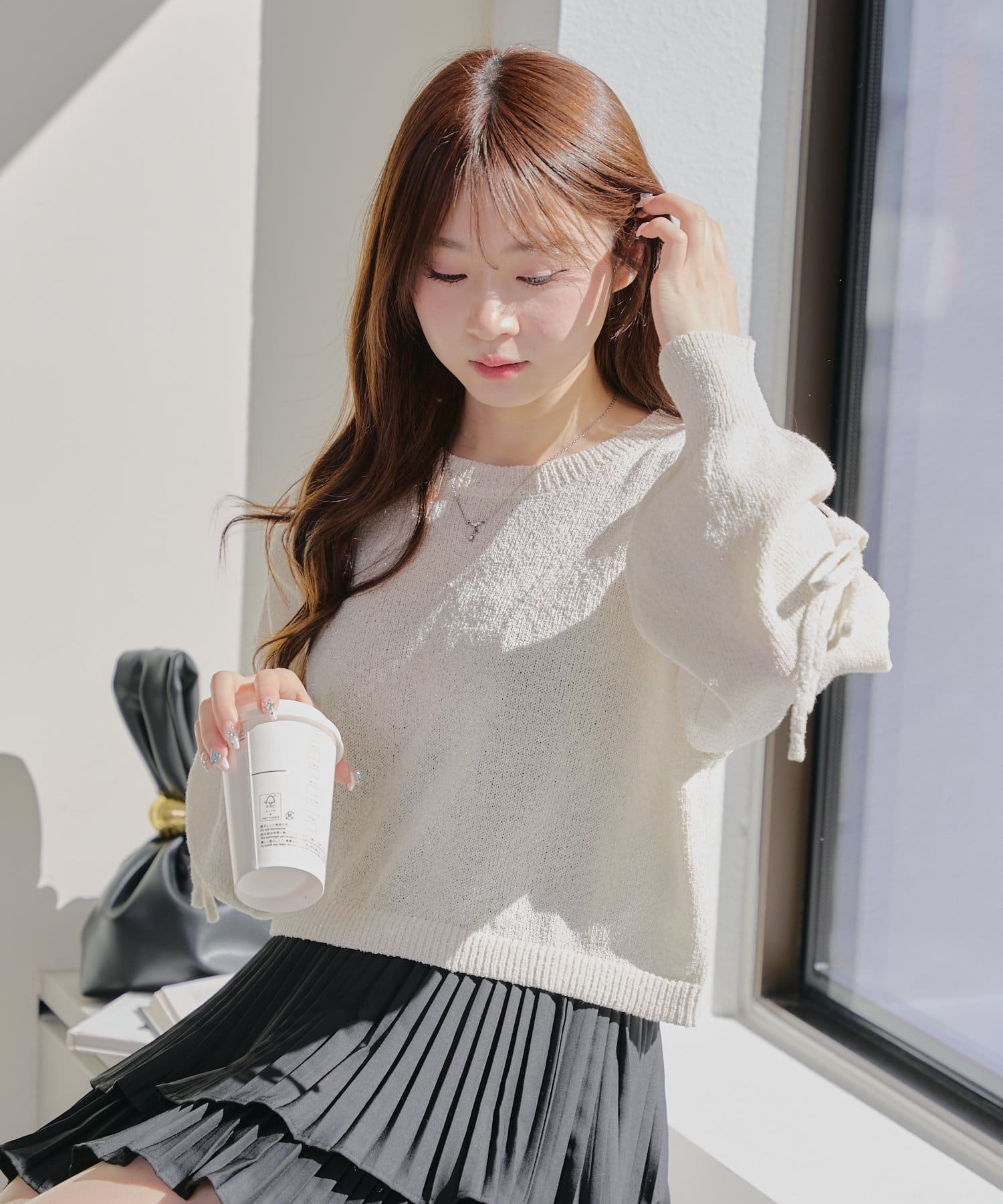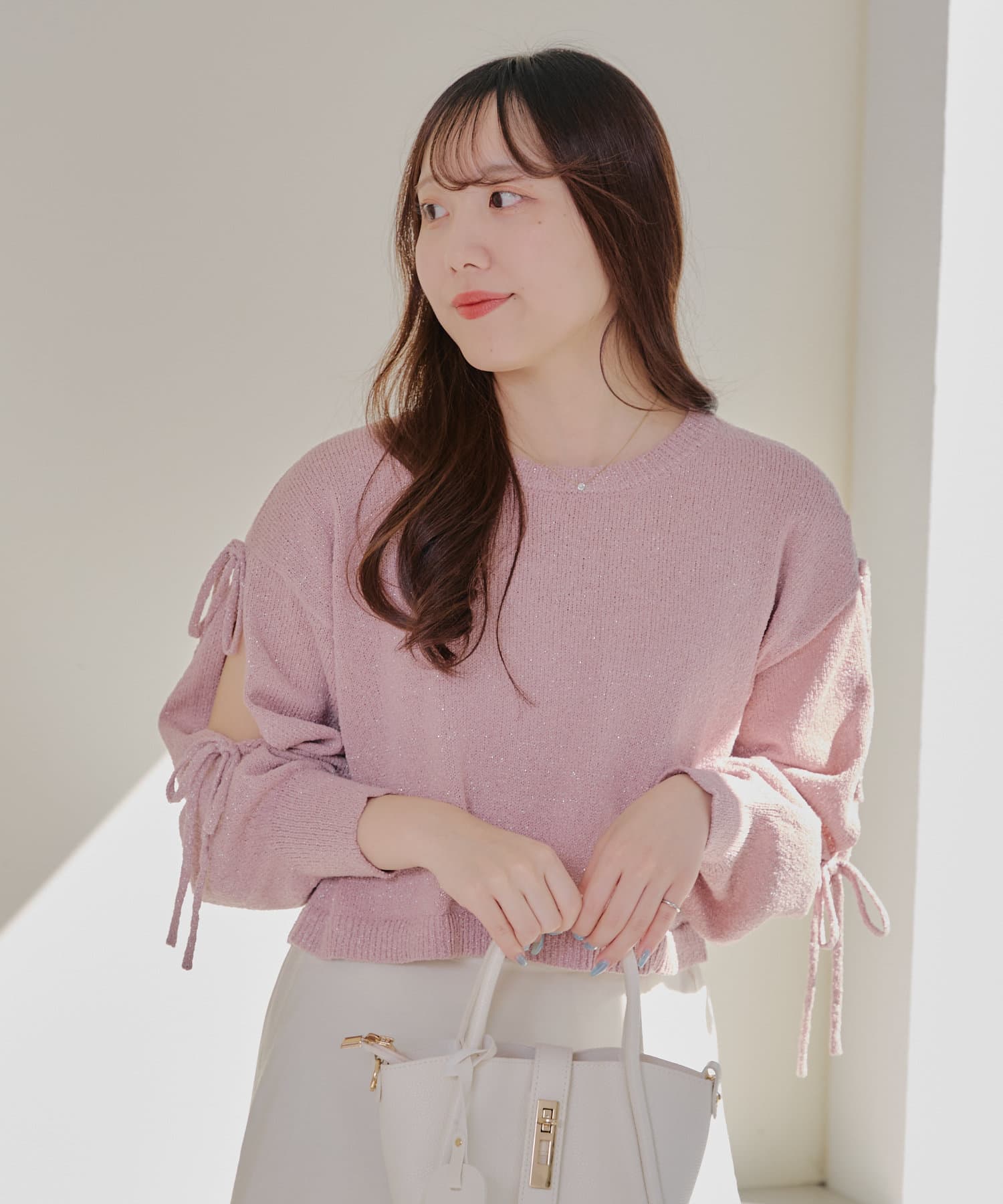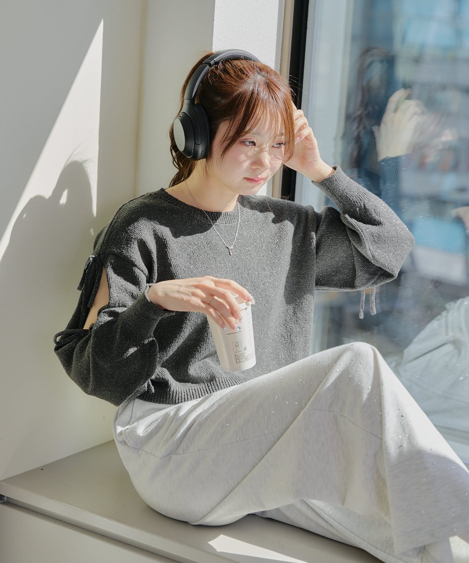 ・肩開きデザインでヘルシーな肌見せができるニットプルオーバー