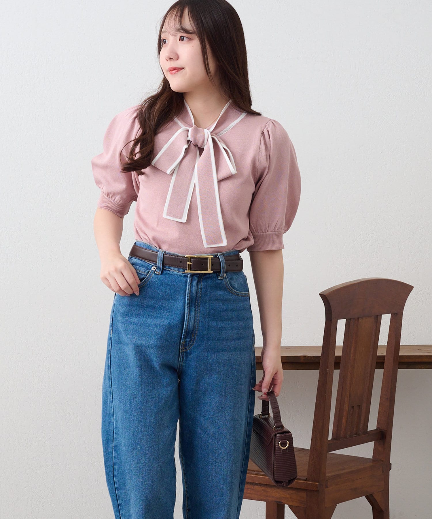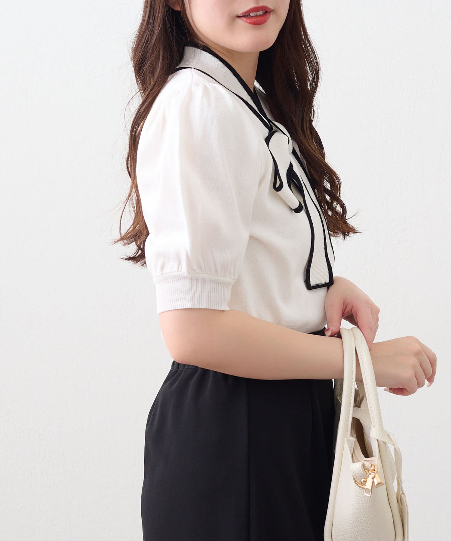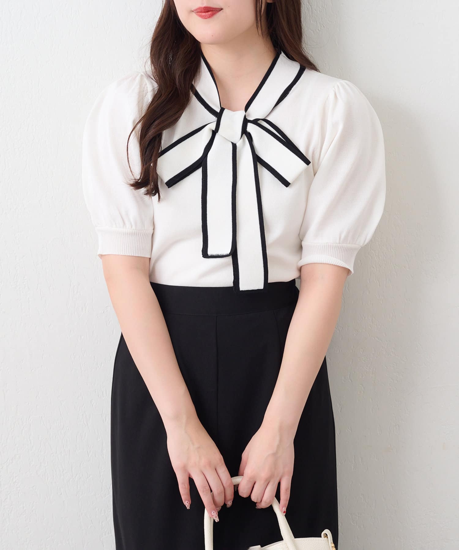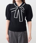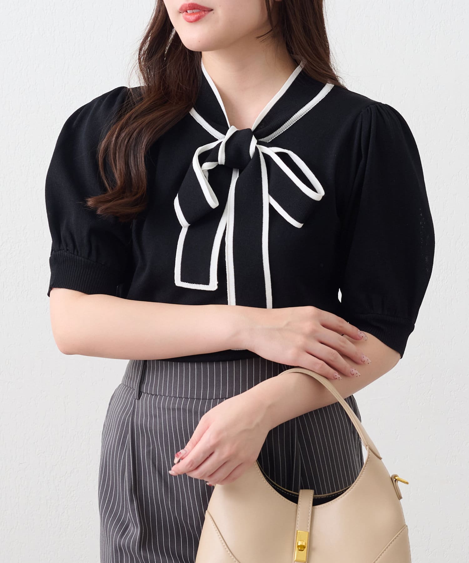 ボウタイデザインがフェミニンな印象に♪半袖ニット