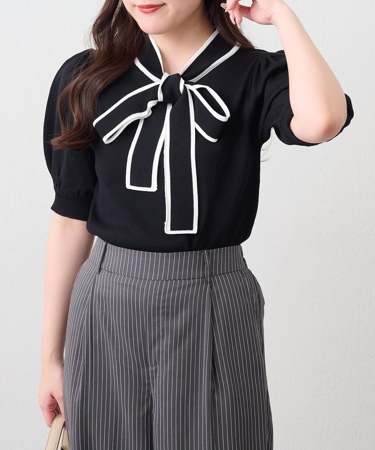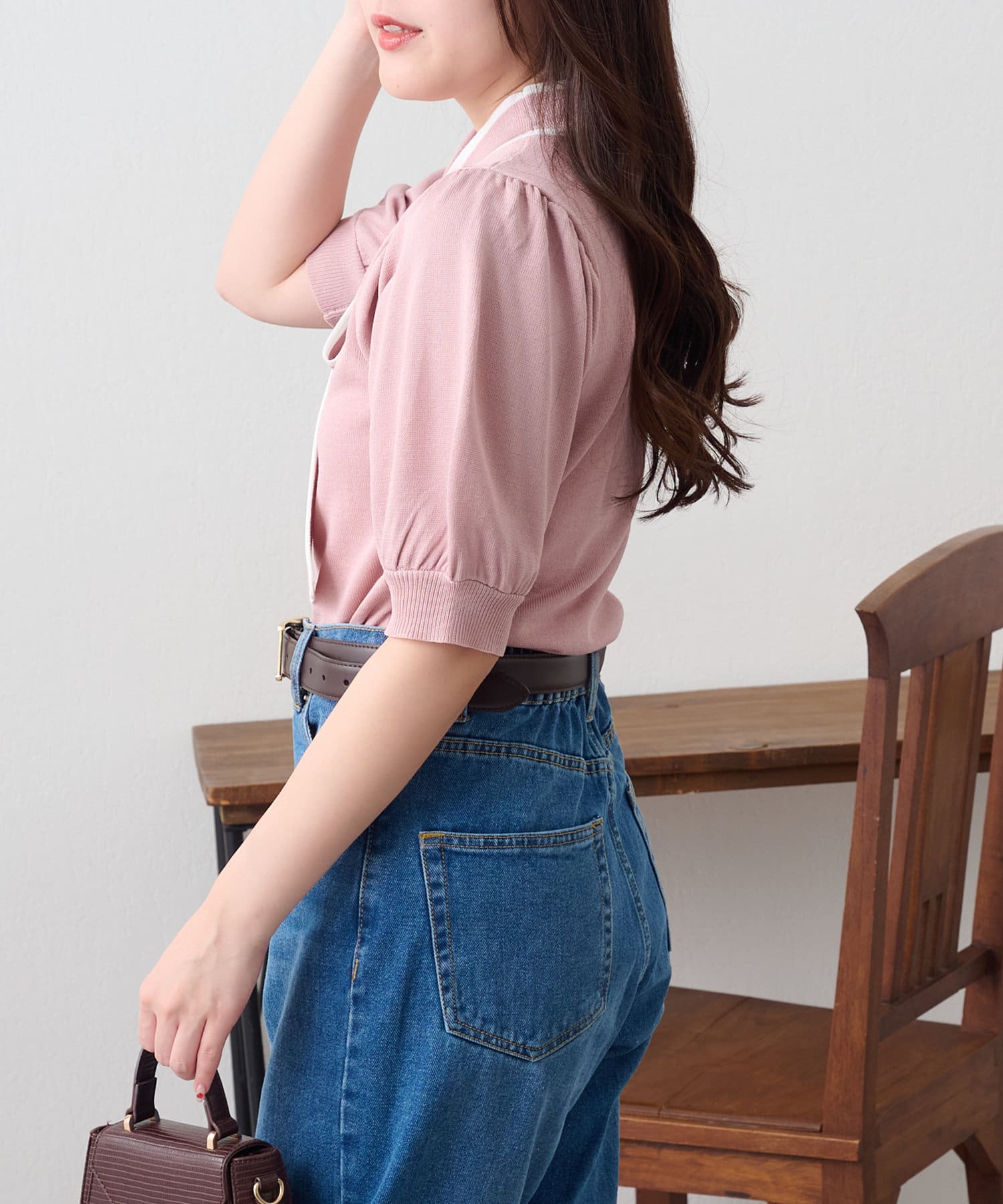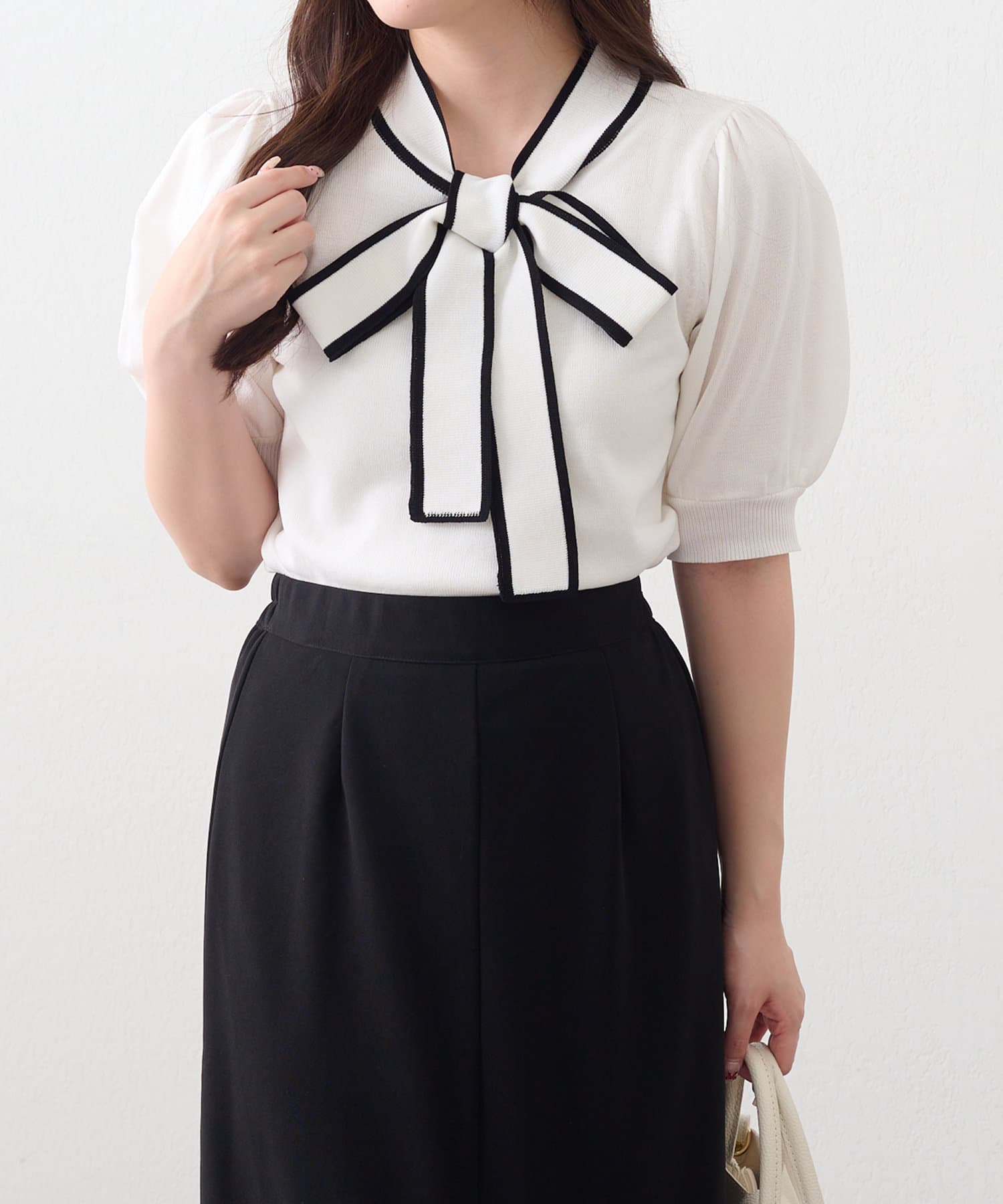 ボウタイデザインがフェミニンな印象に♪半袖ニット