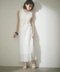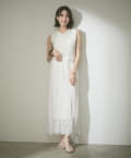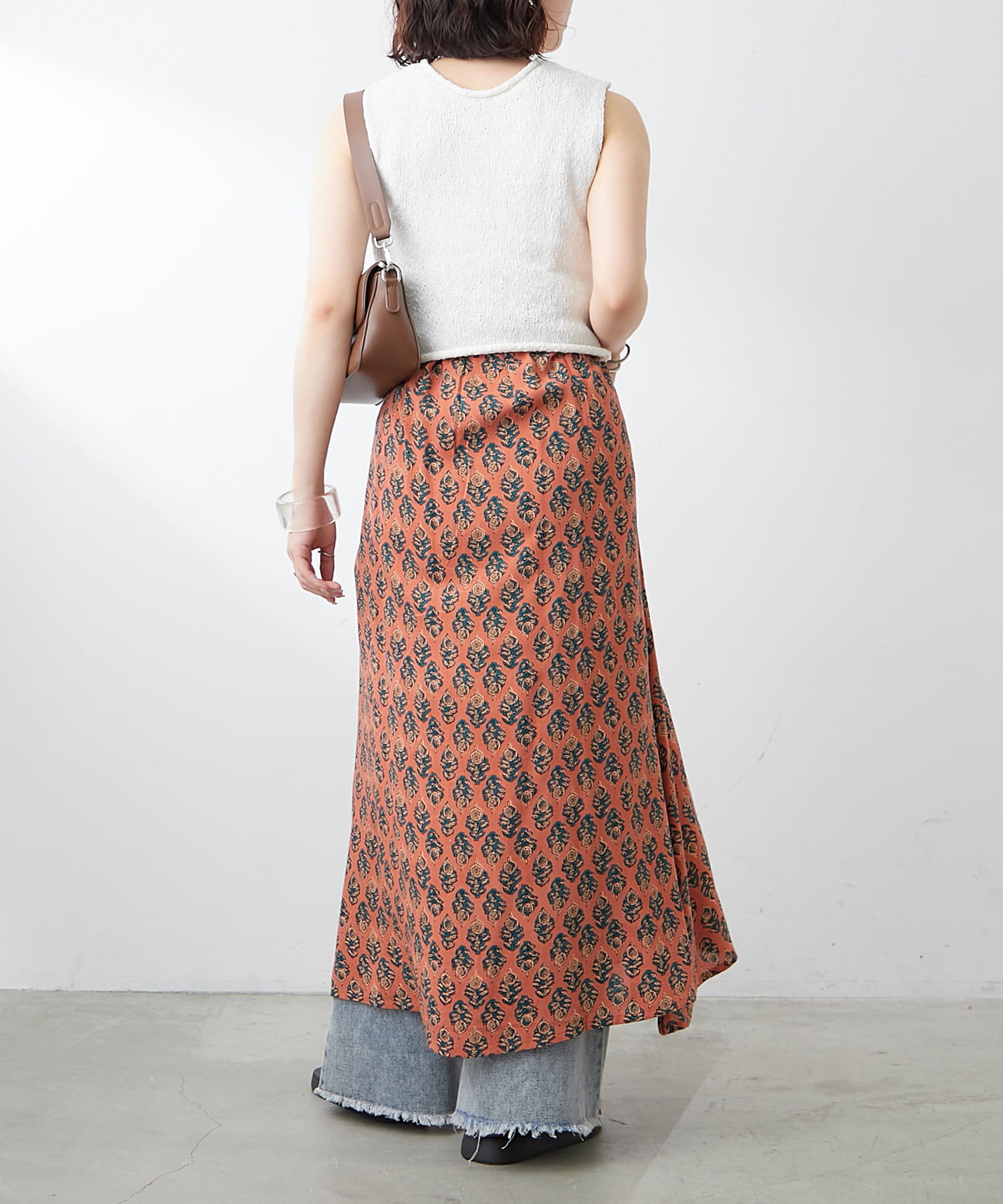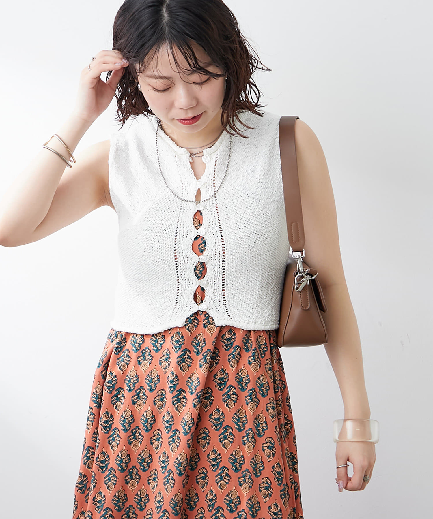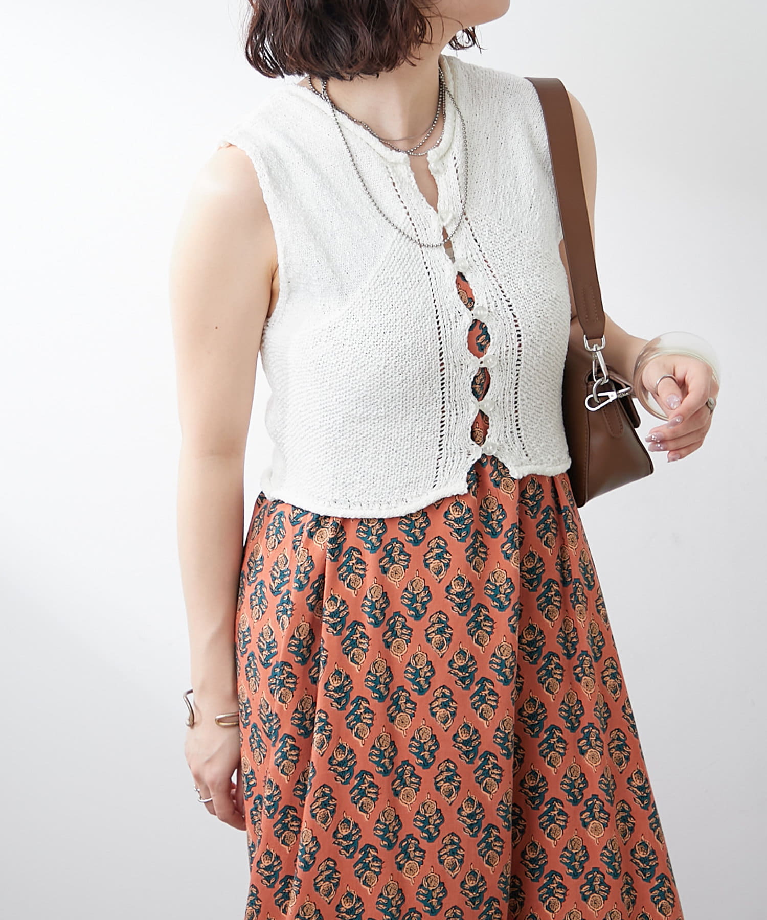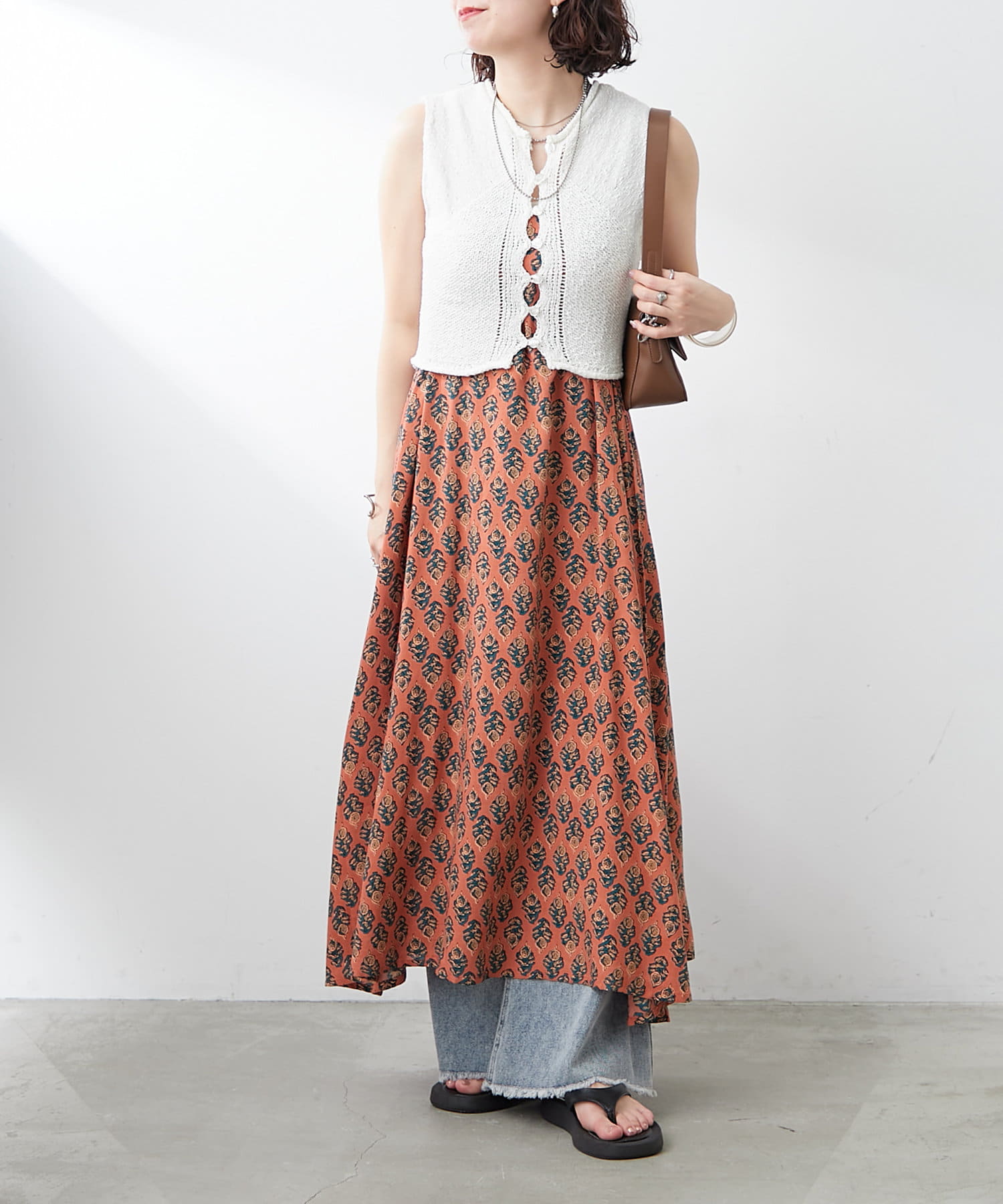 ・総柄のワンピースにレイヤードして華やかさを演出するのも◎