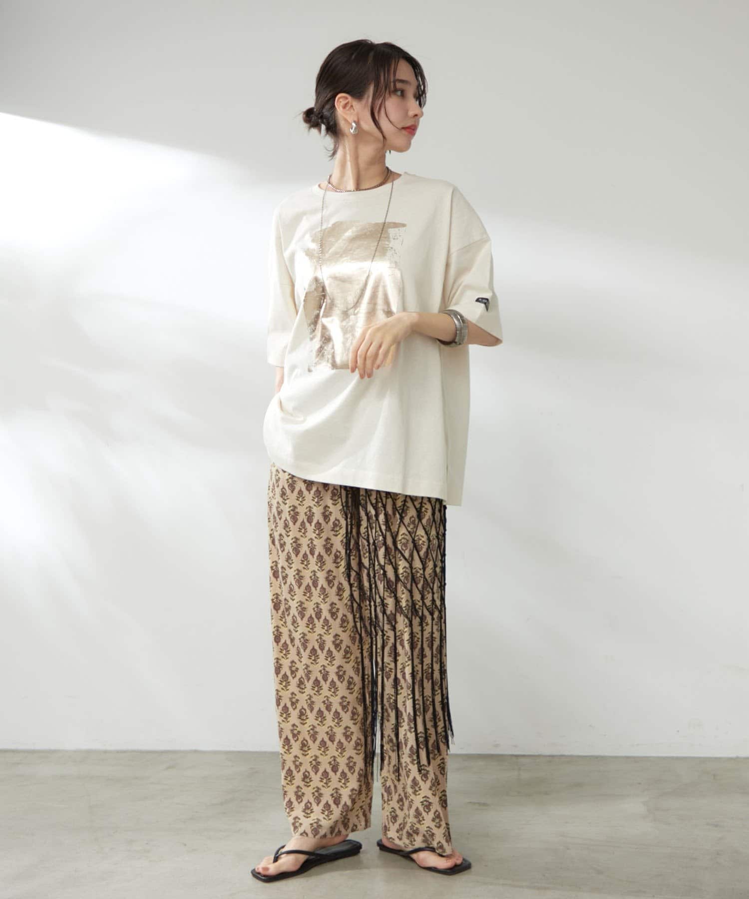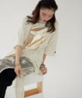 華やかな箔プリントが目を引き、スタイリングの主役になる一枚。