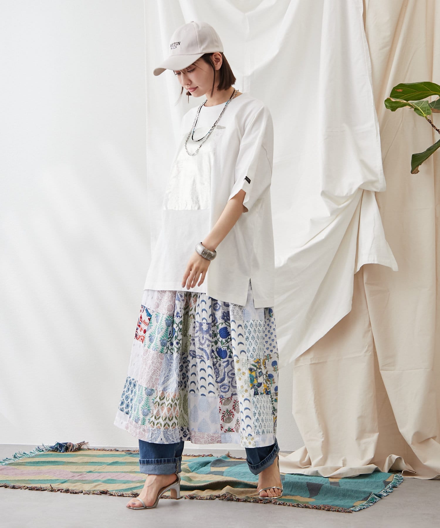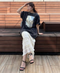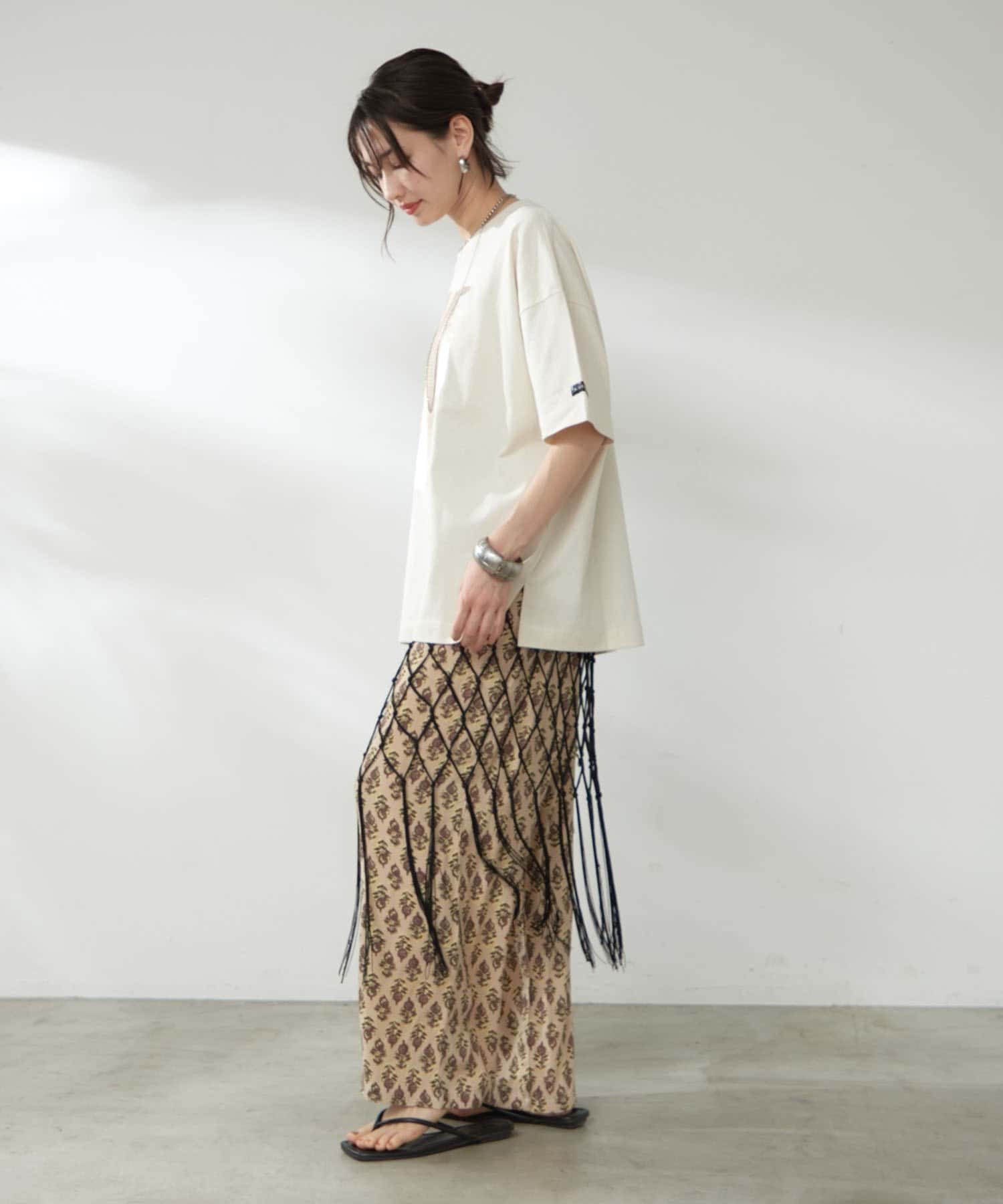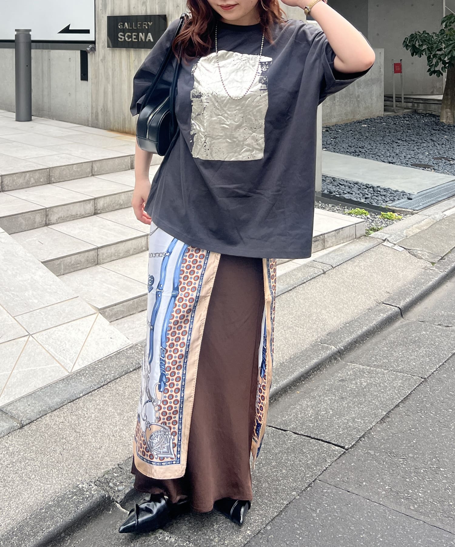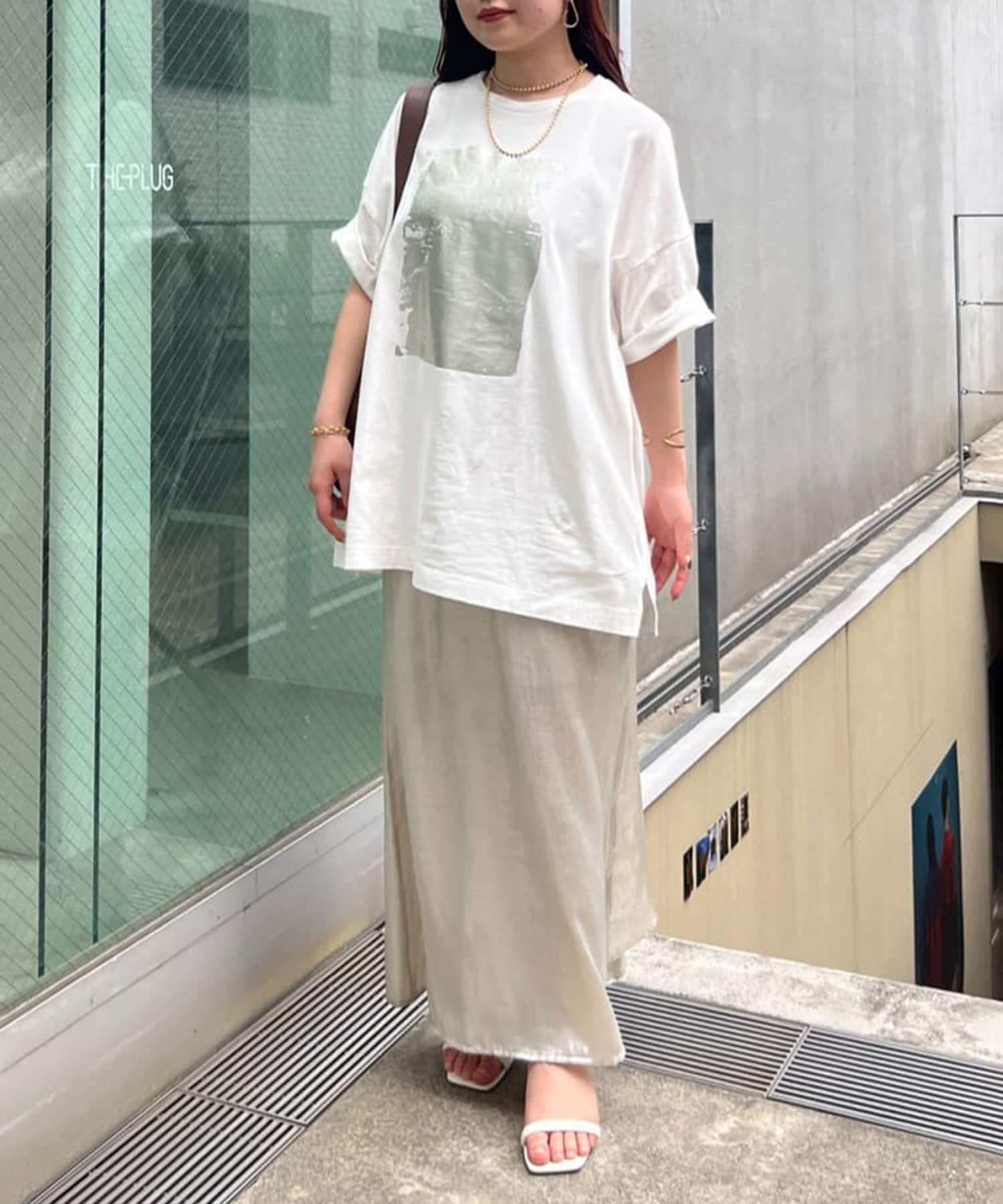 ゆったりとしたシルエットなので、インせずに着用する場合、Iラインスカートや、