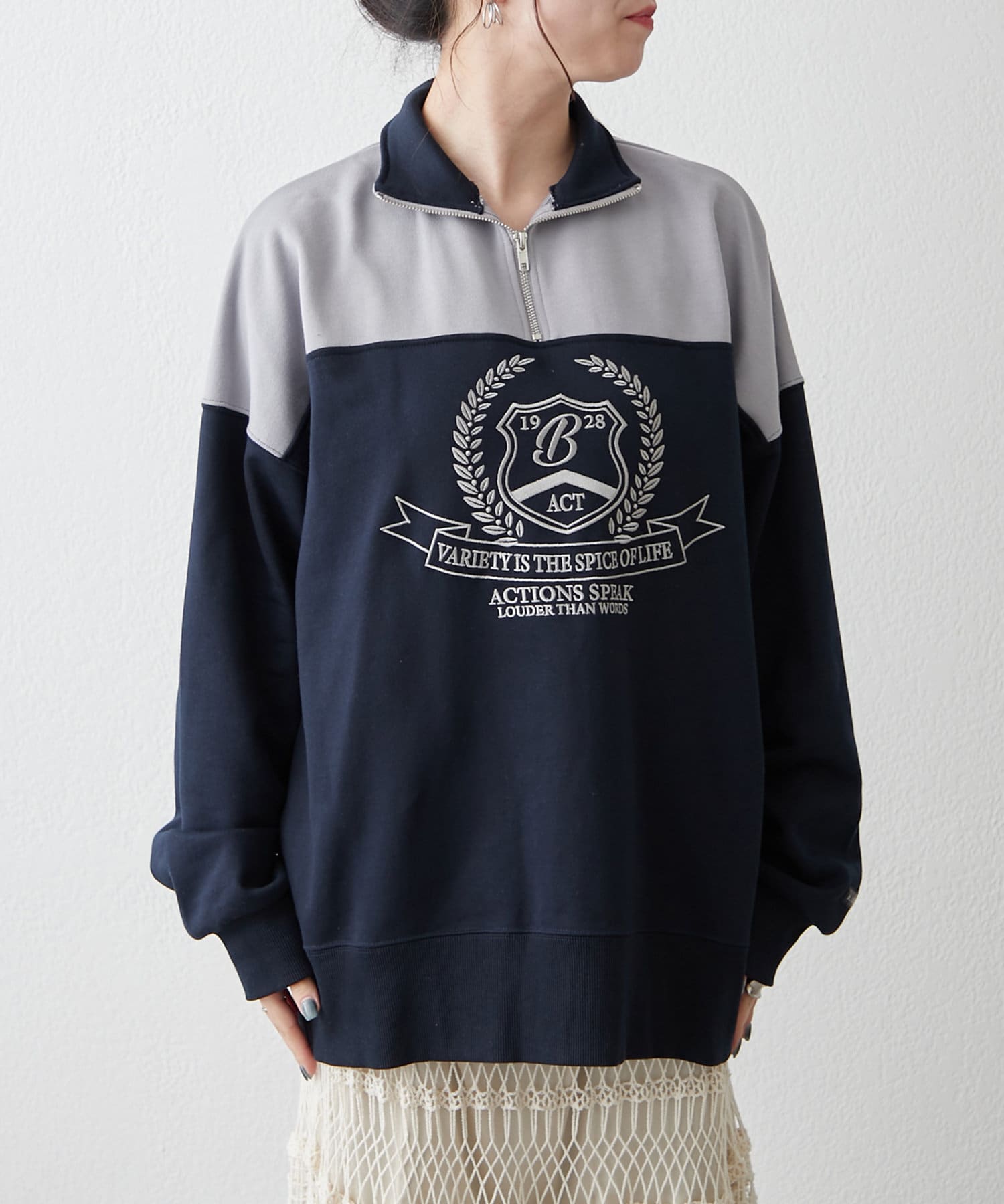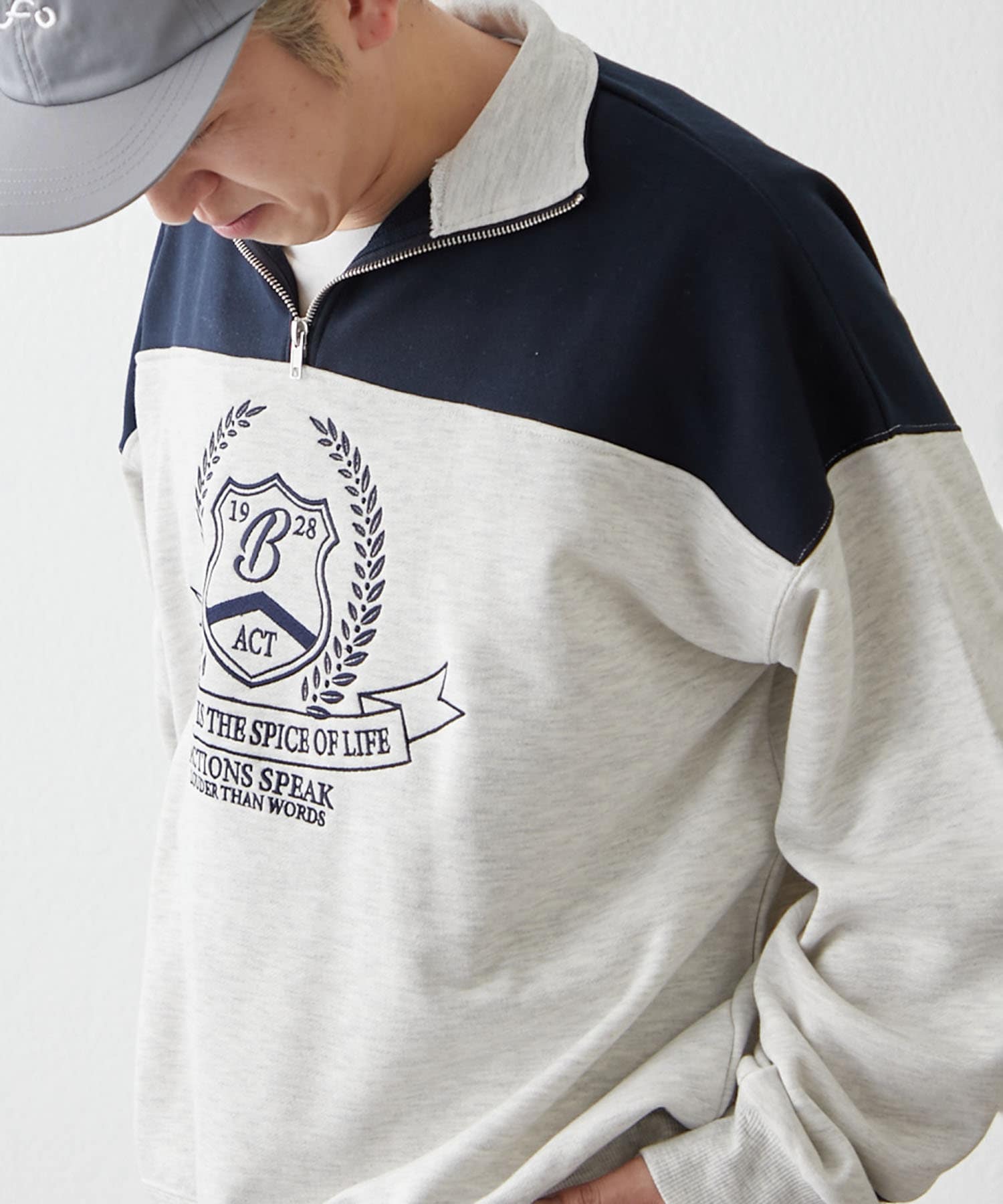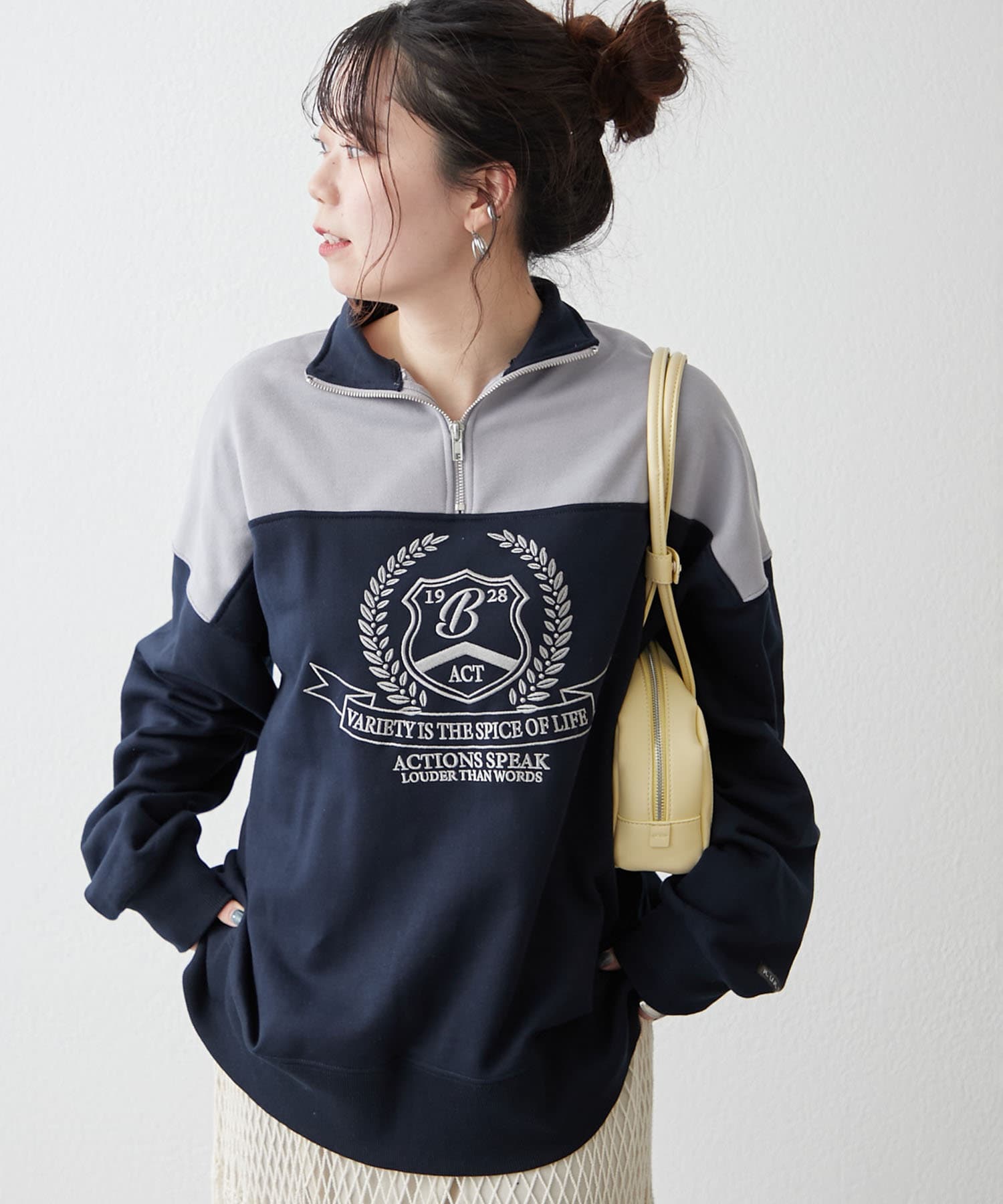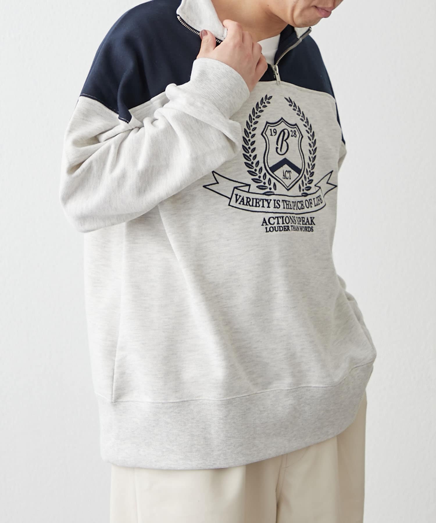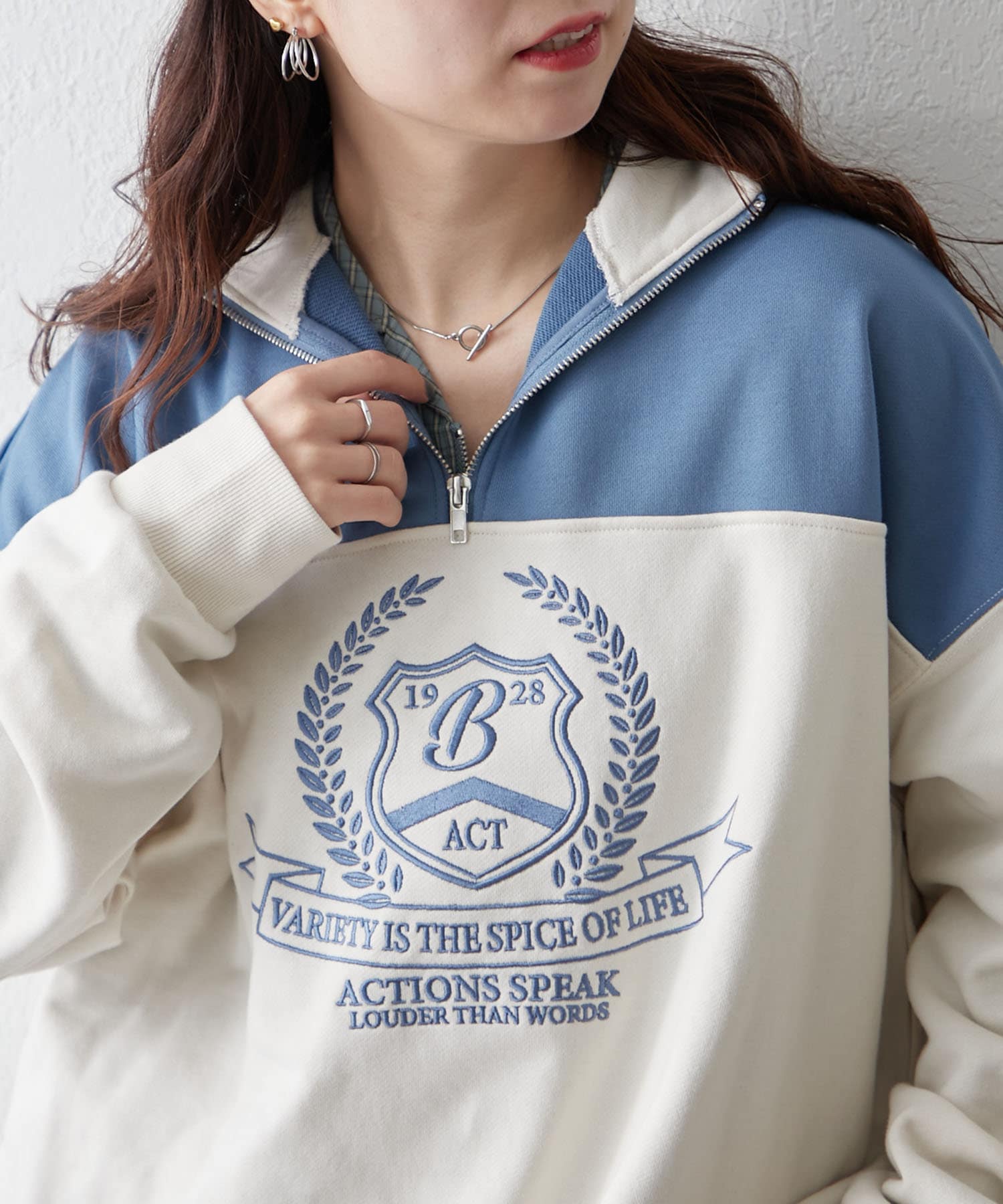・立体刺繍と配色がポイントのハーフジッププルオーバー。