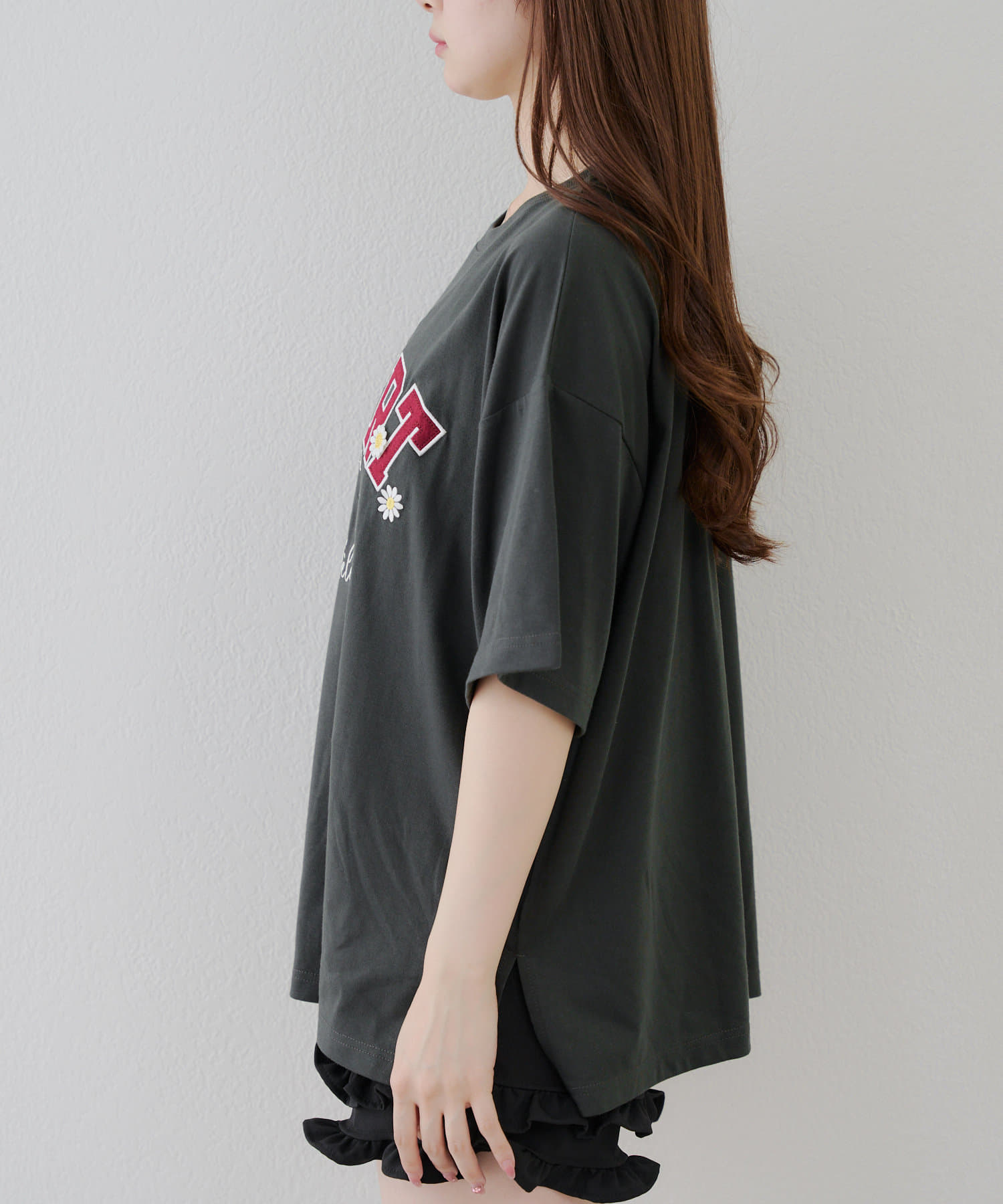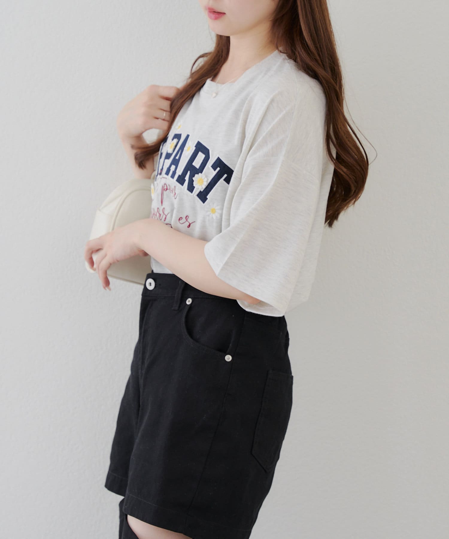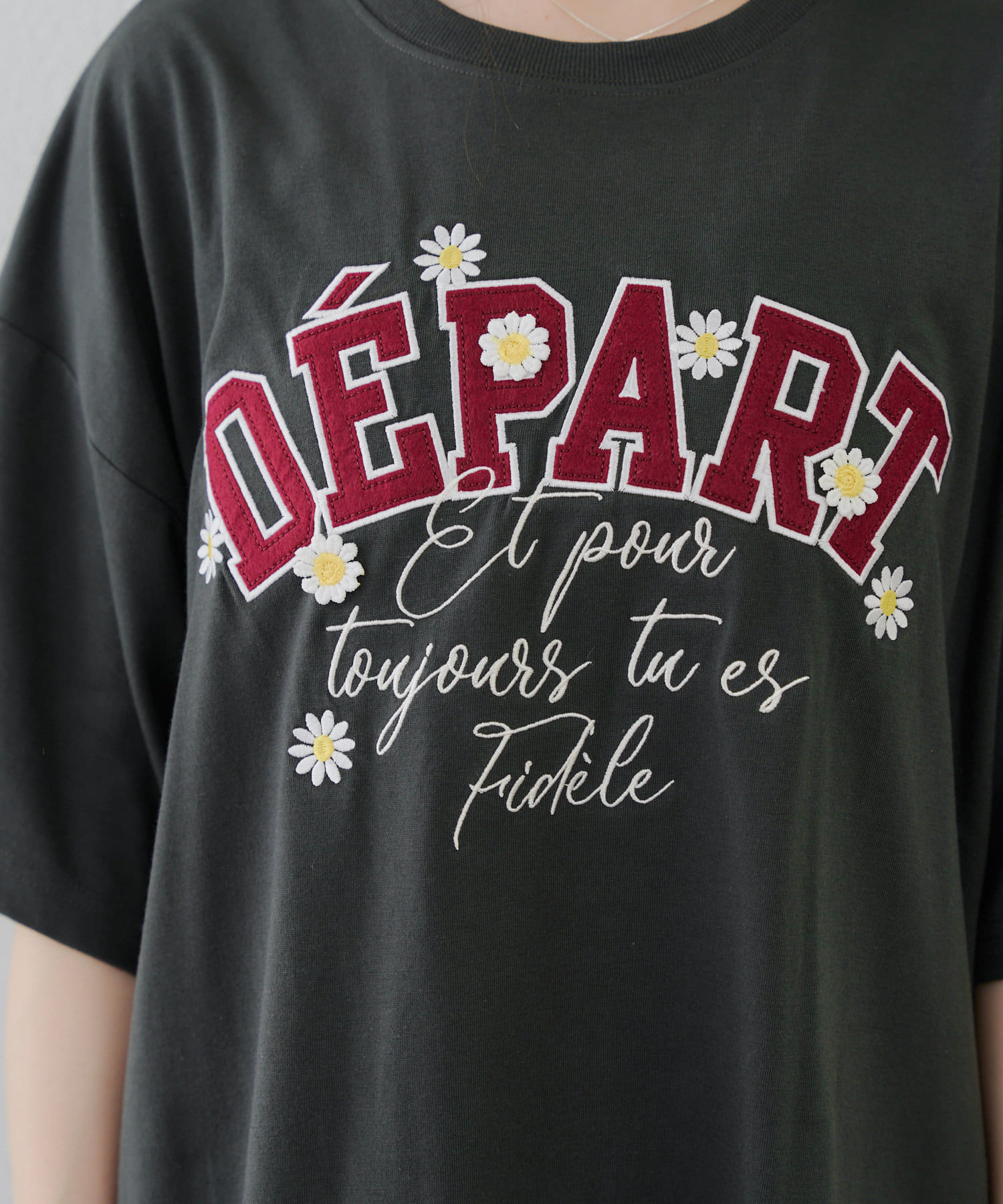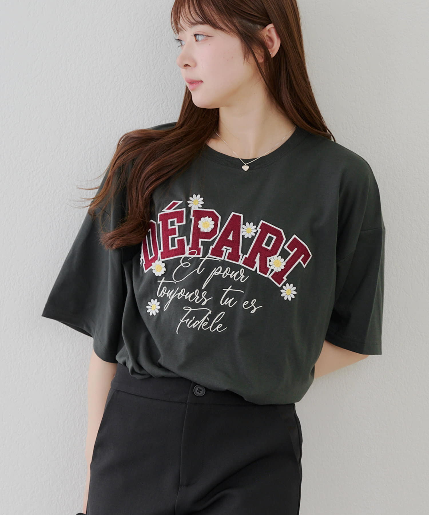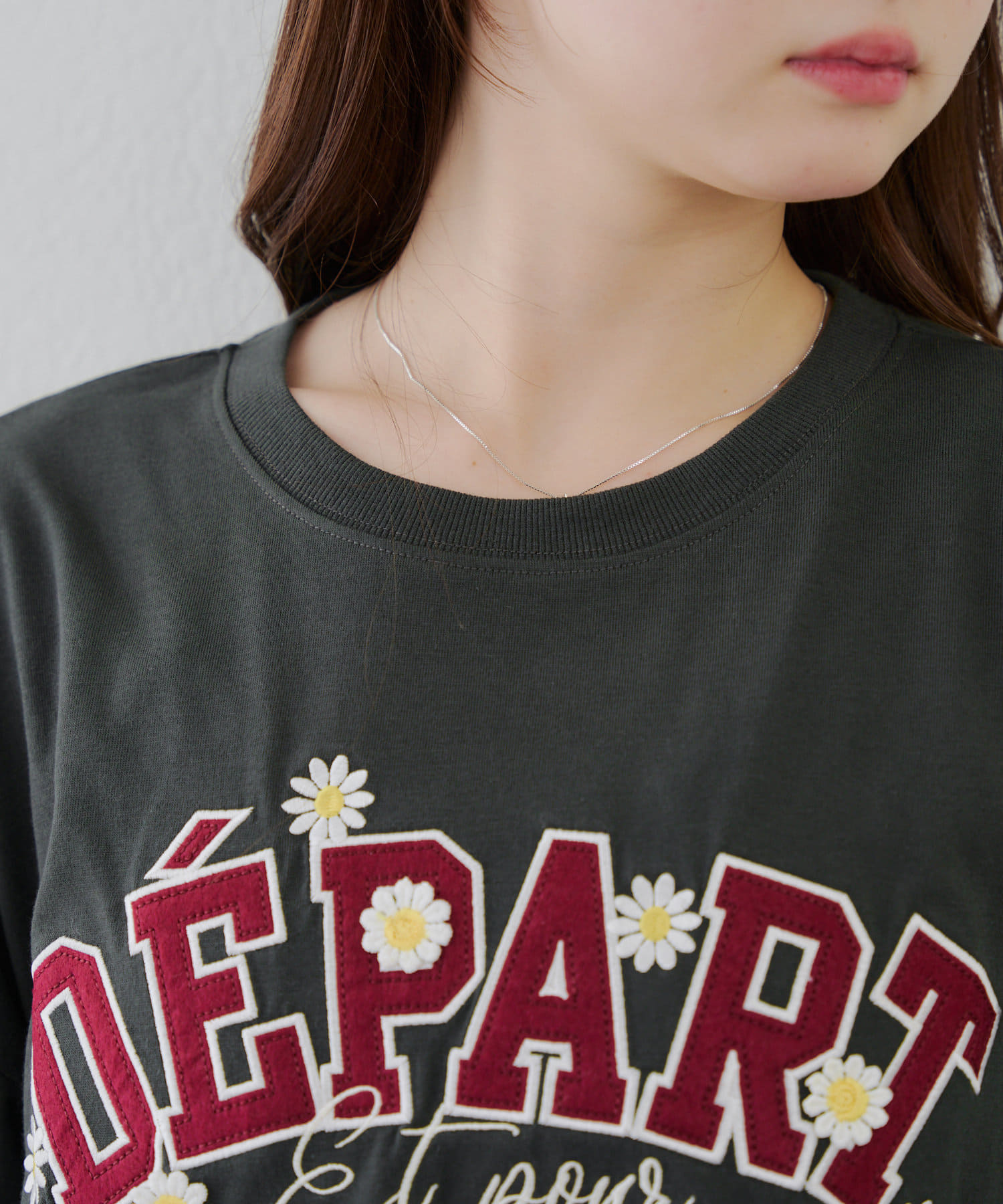 ・目を惹くカレッジロゴ×花刺繍のTシャツ