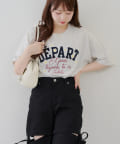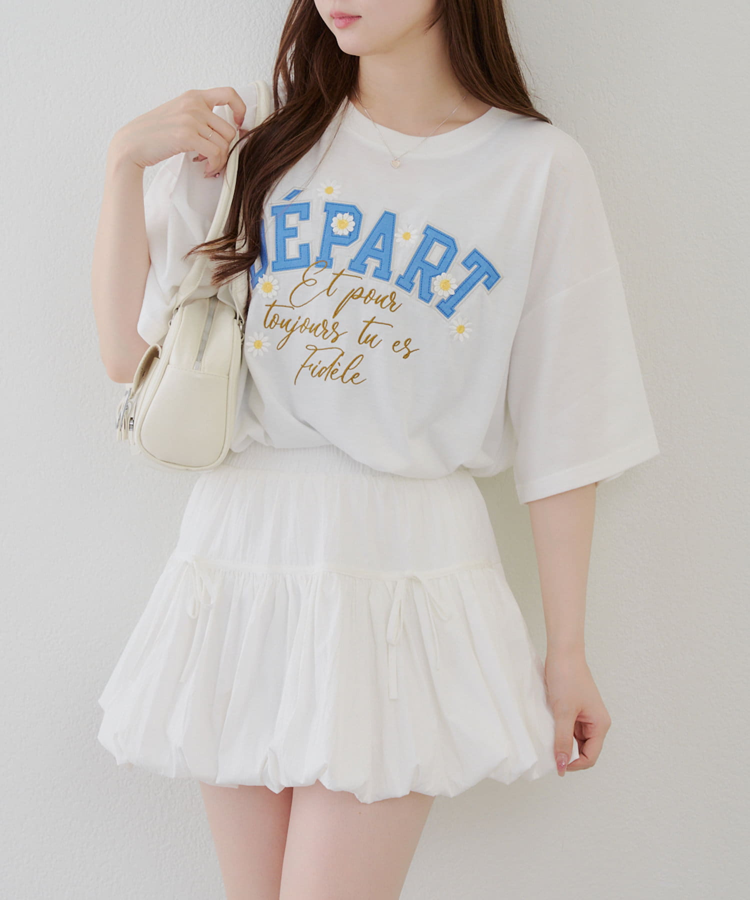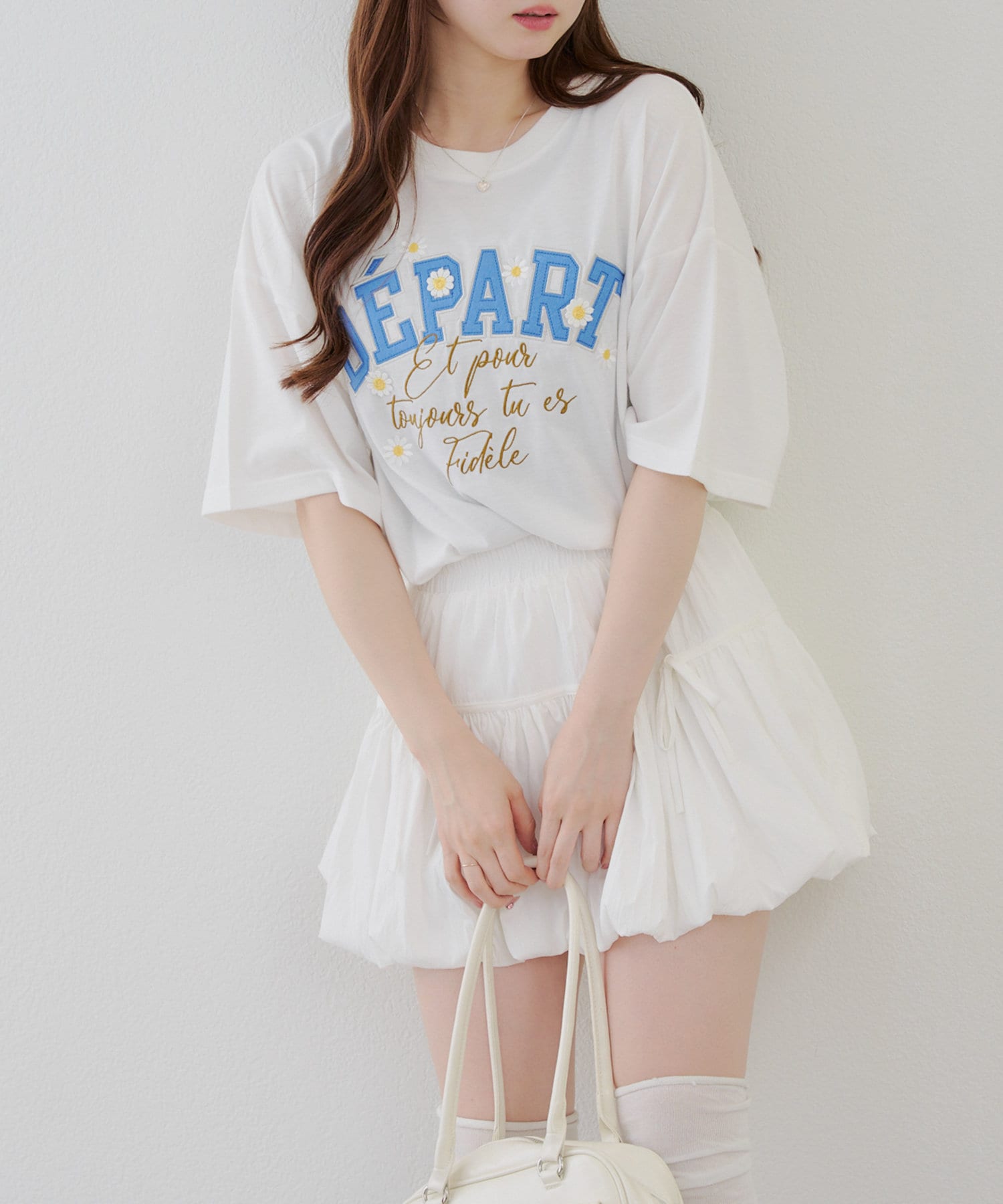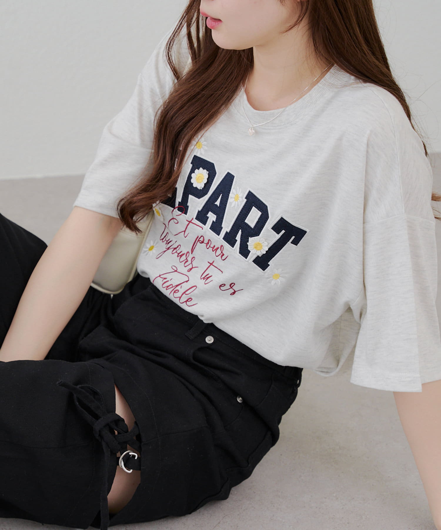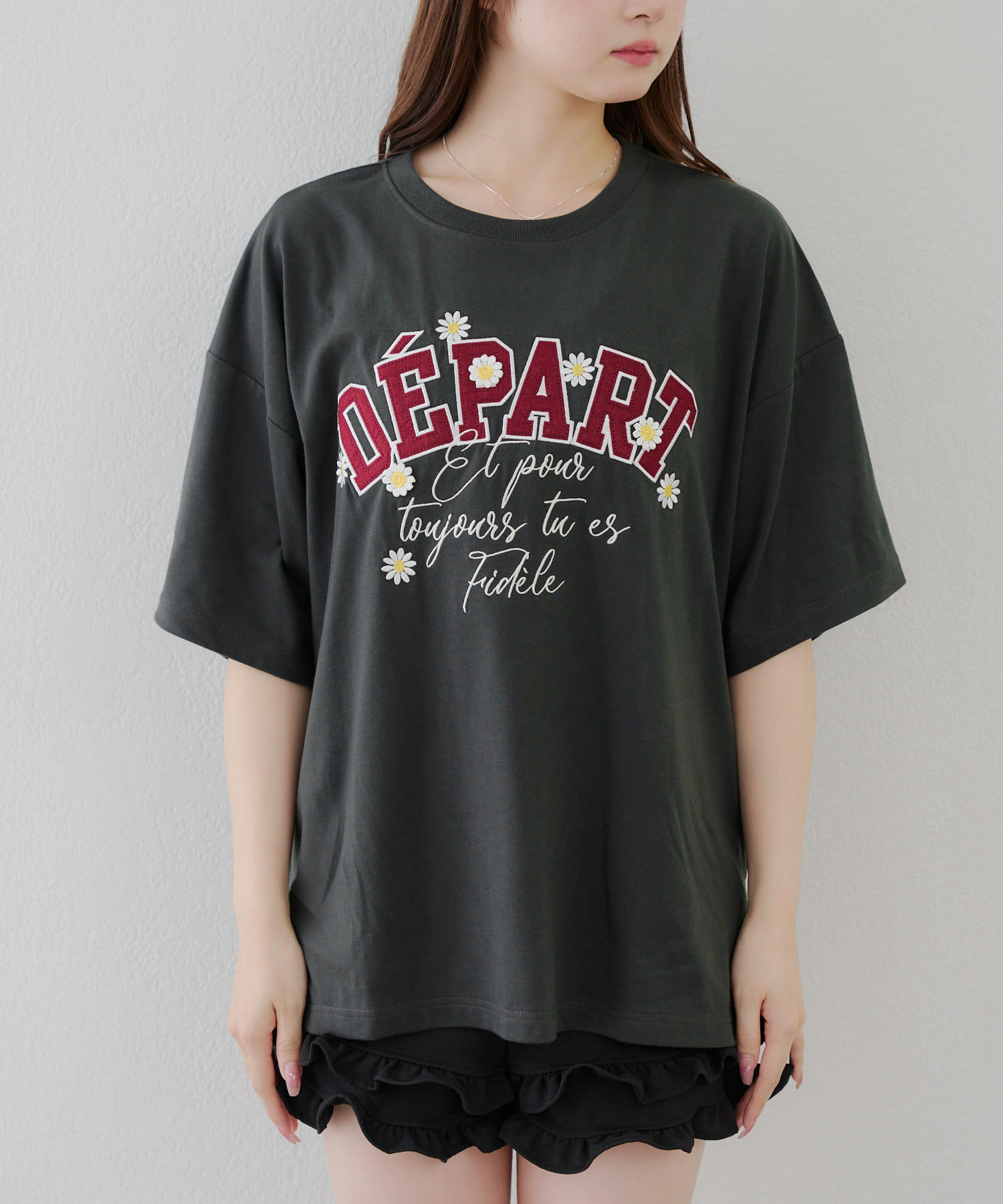 ・目を惹くカレッジロゴ×花刺繍のTシャツ