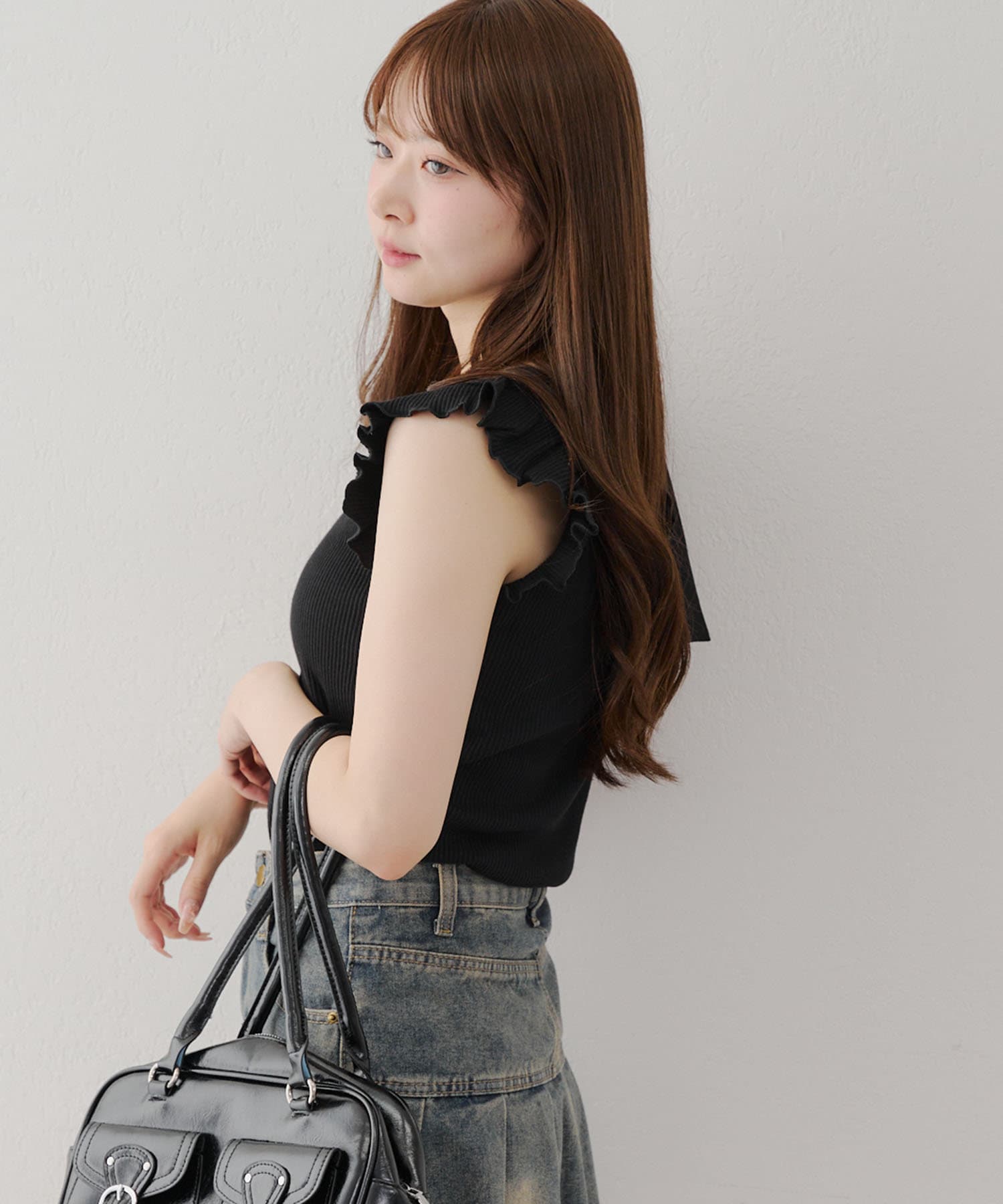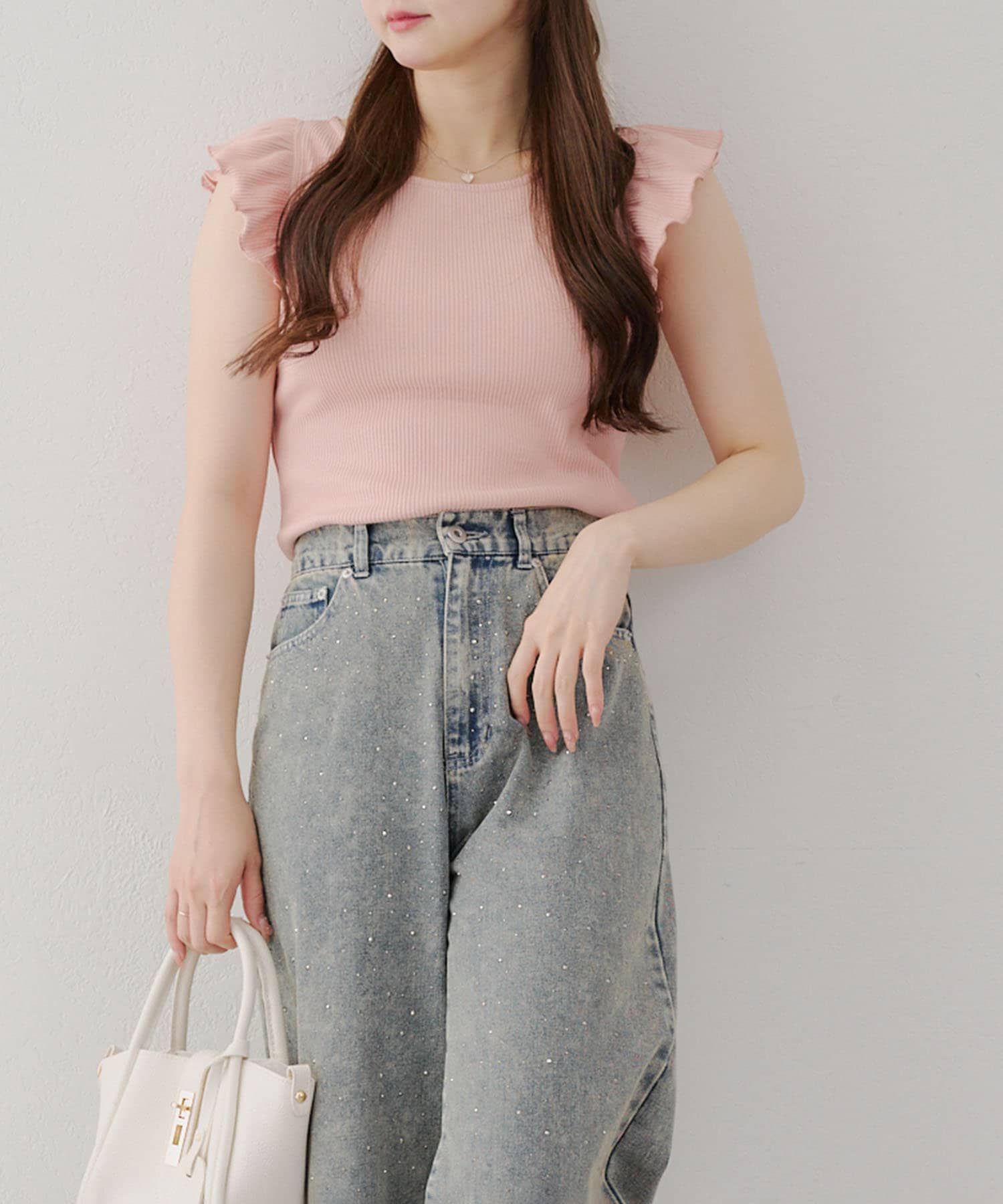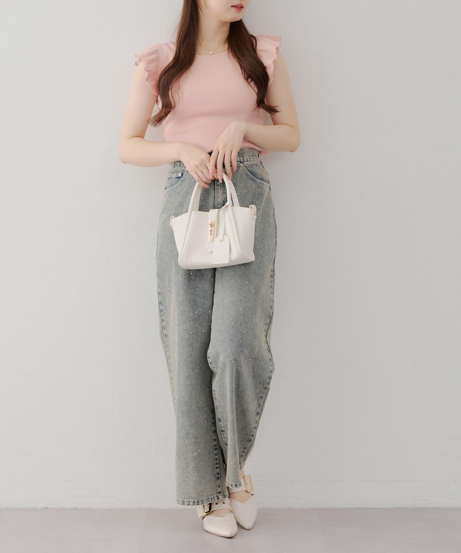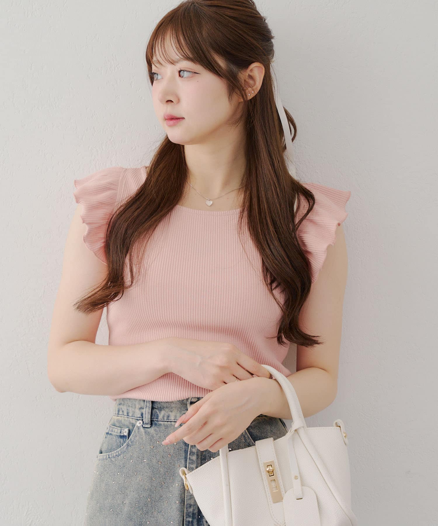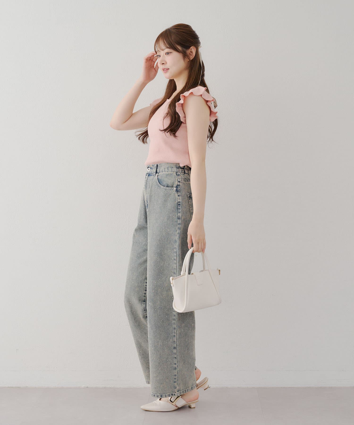・トップスが女性らしい印象なので敢えてデニムパンツやダメージの入った加工デニムとも相性〇