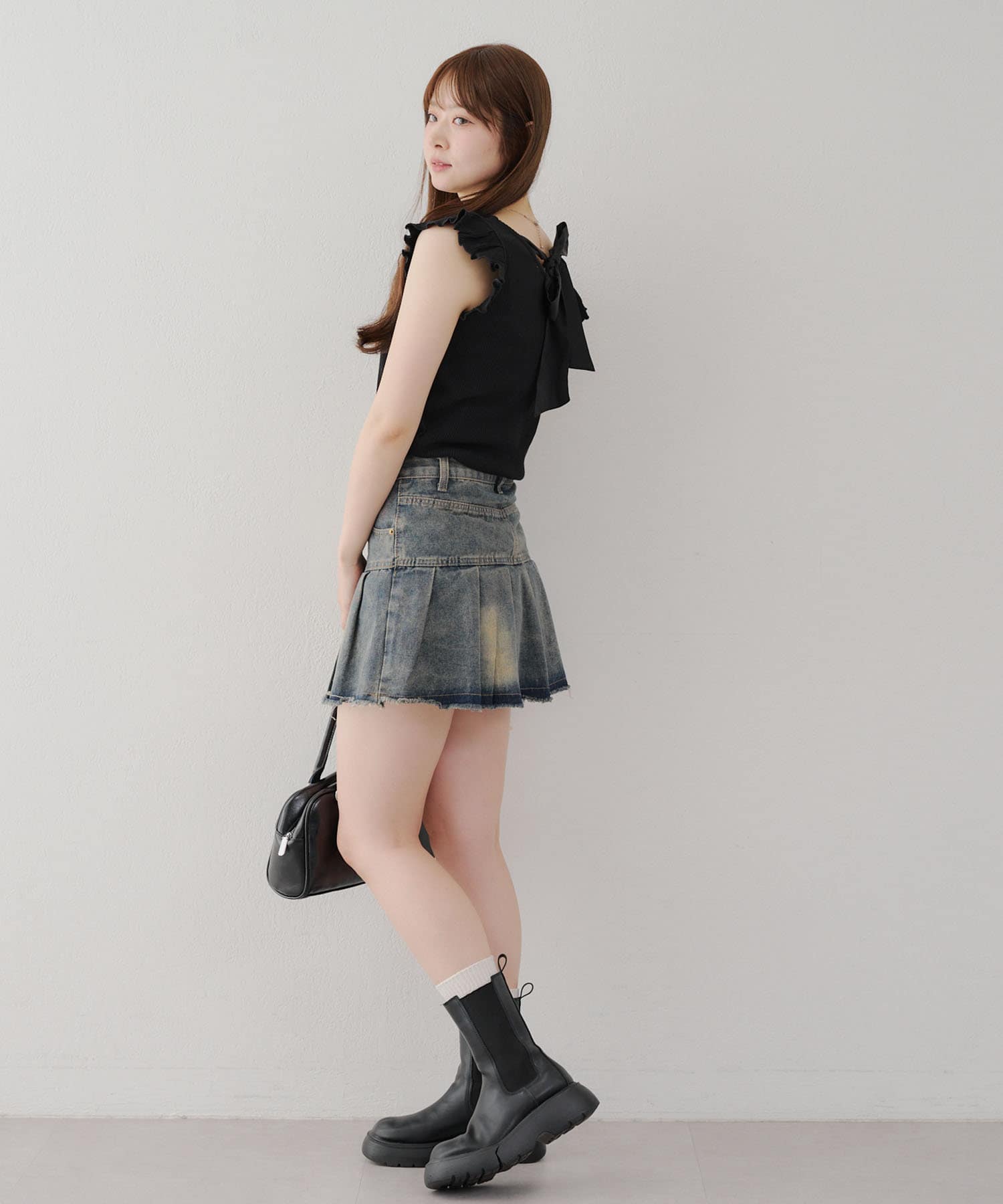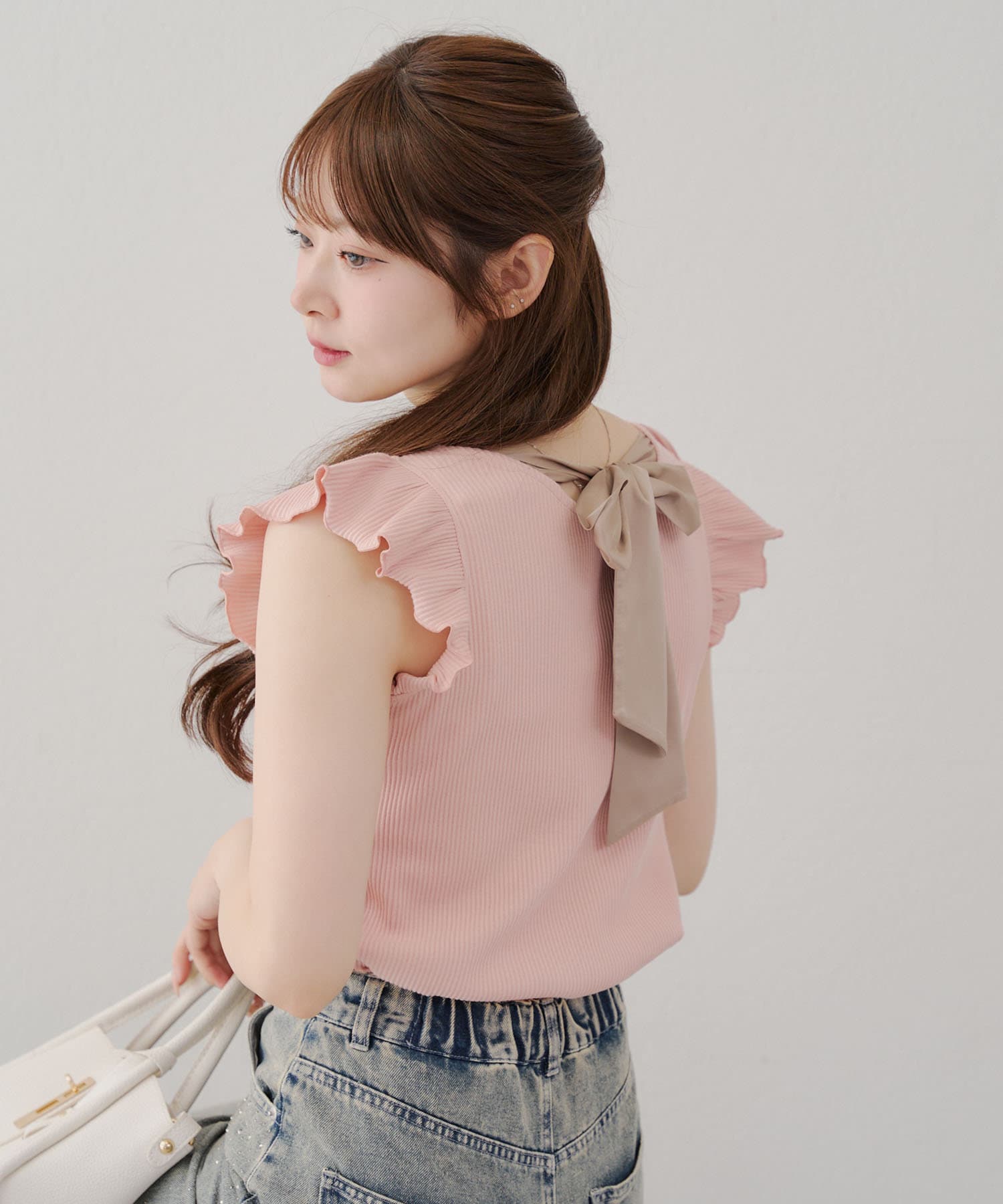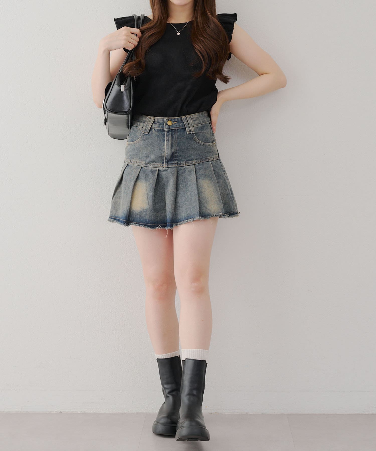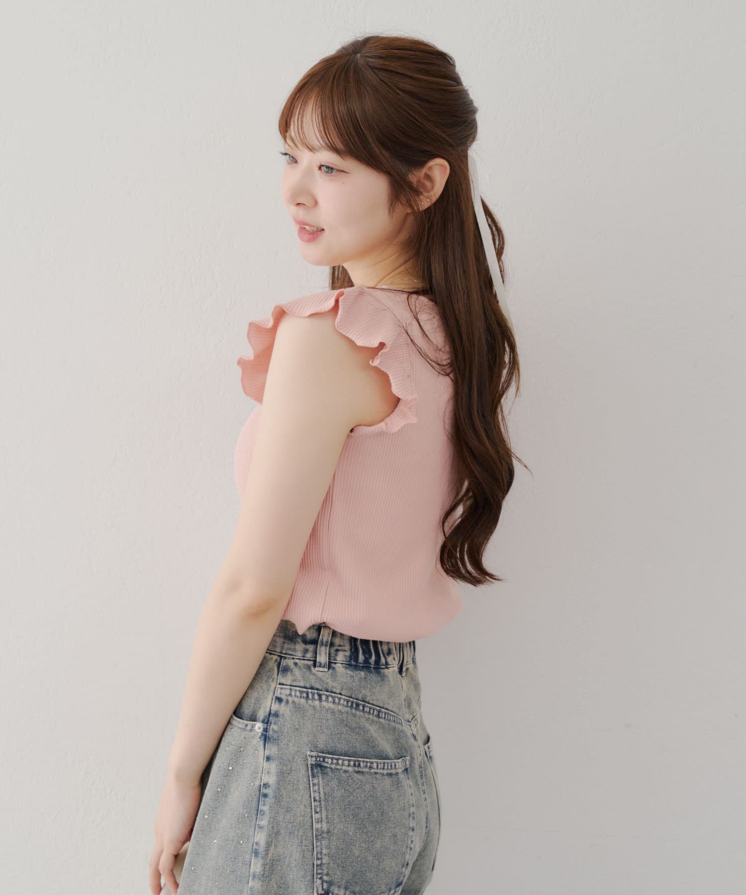 ・トップスが女性らしい印象なので敢えてデニムパンツやダメージの入った加工デニムとも相性〇