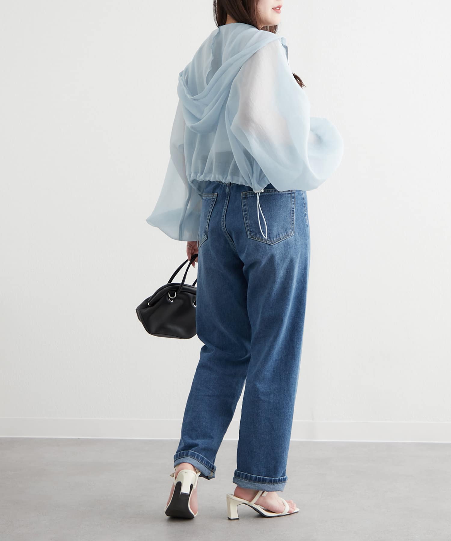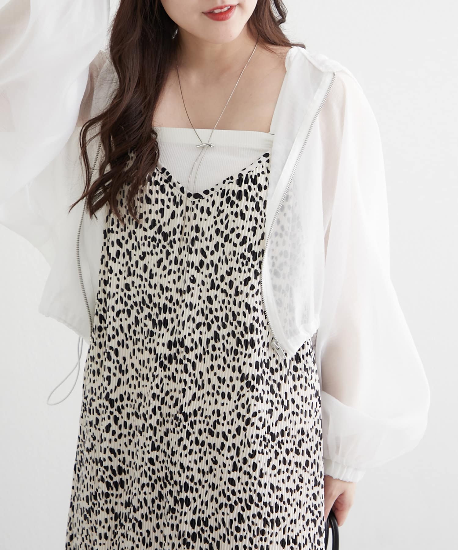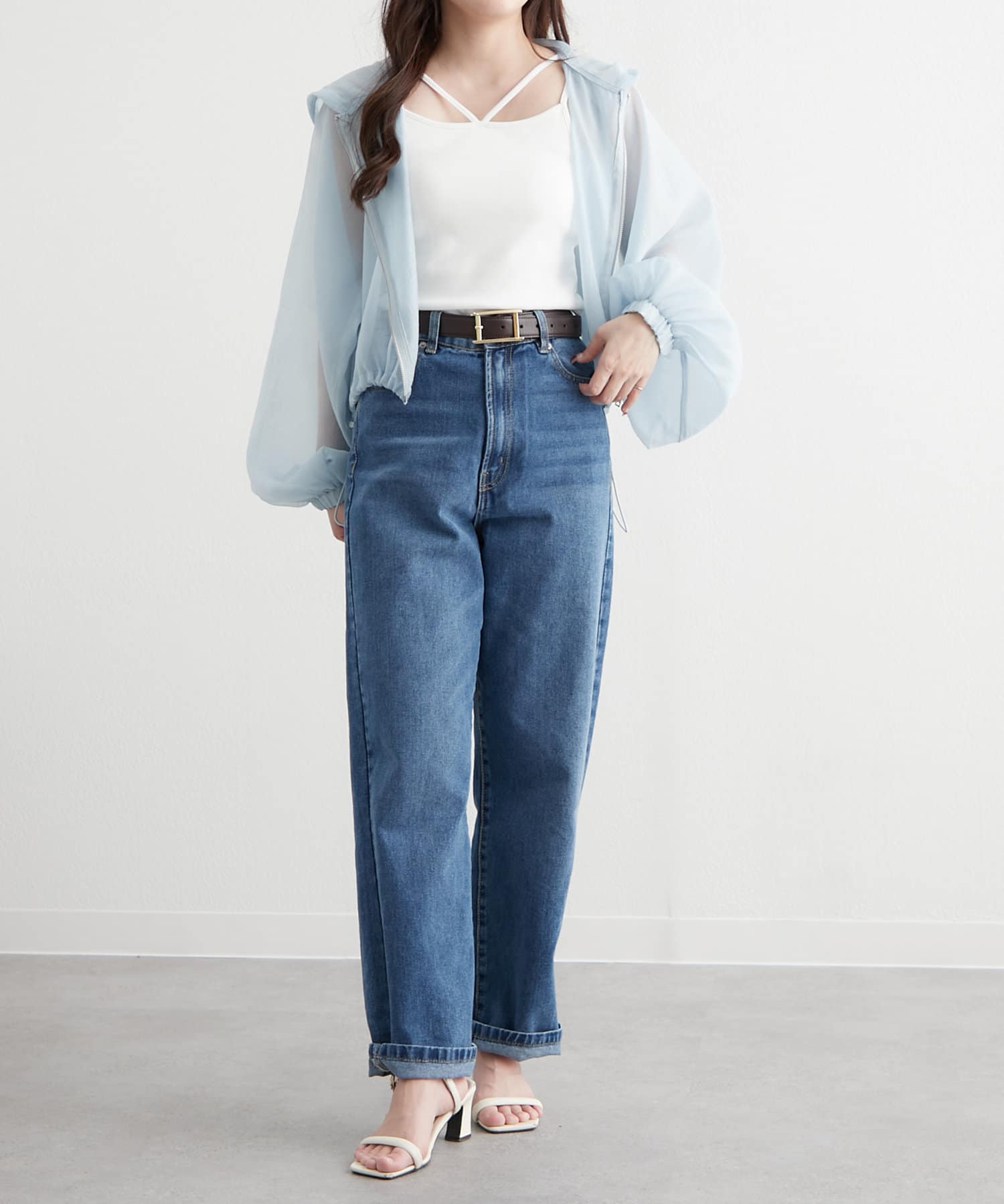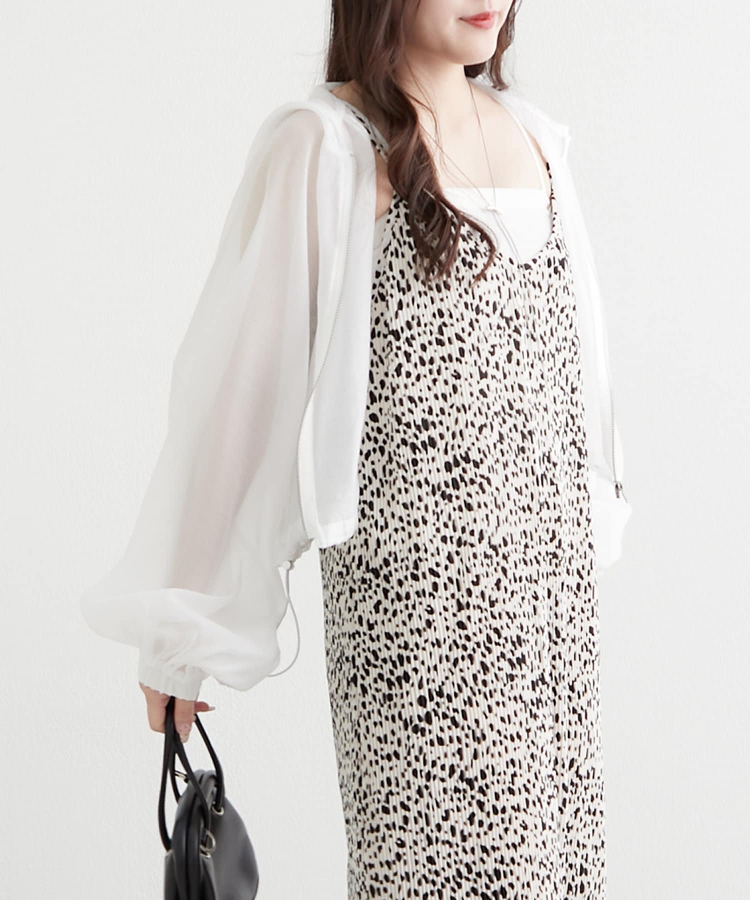 ・ドロストを絞ってショート丈にアレンジして、女性らしいキャミワンピースに羽織ればスタイルアップ効果抜群のスタイリングが完成します。