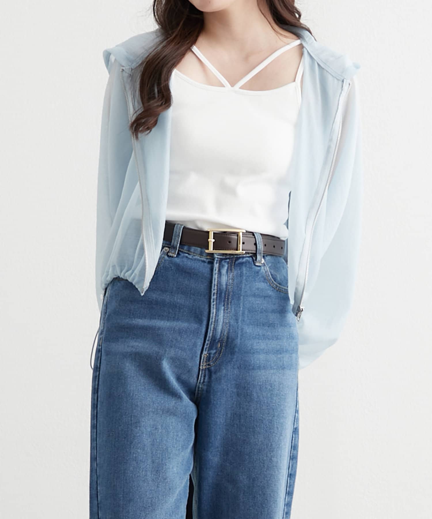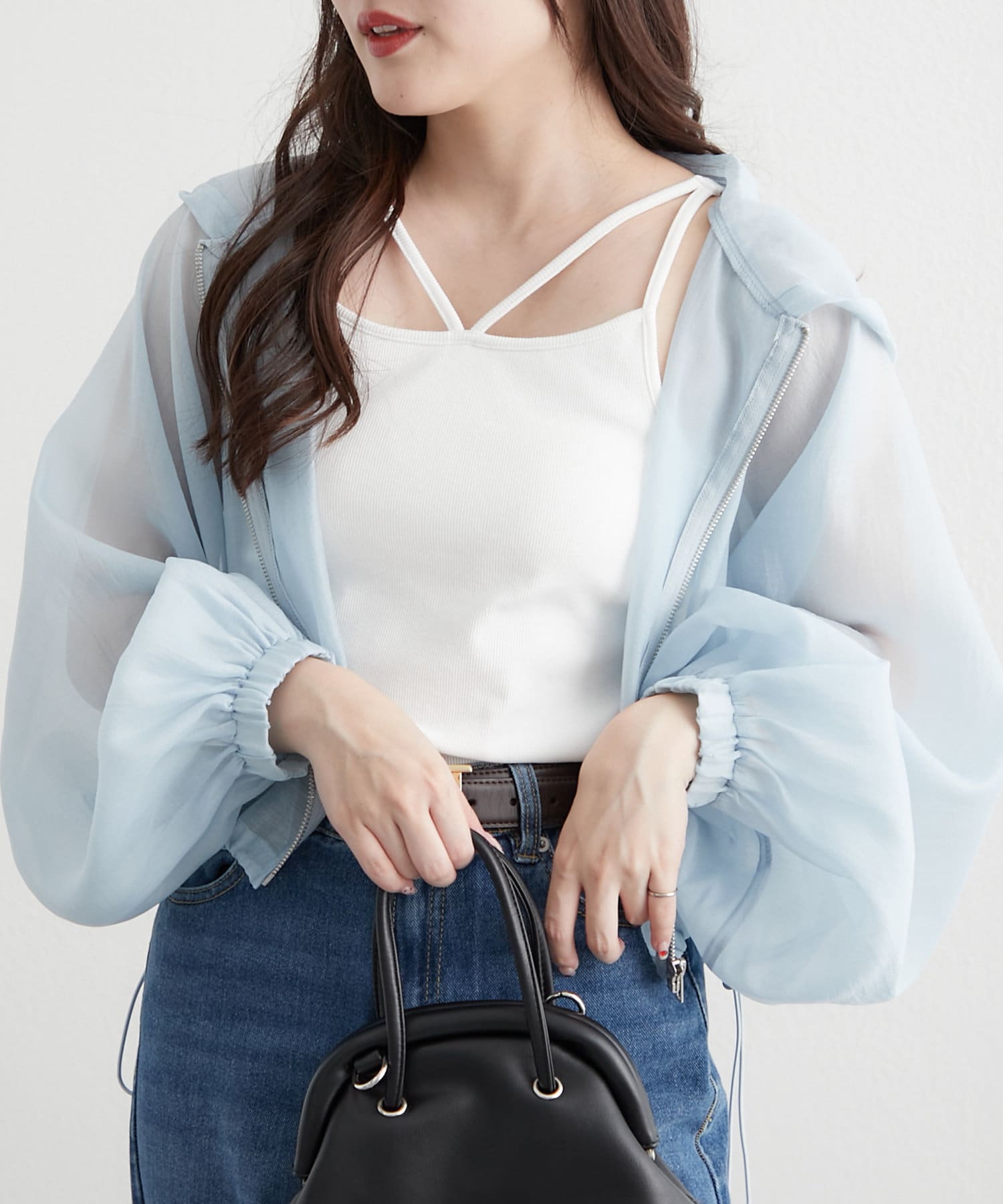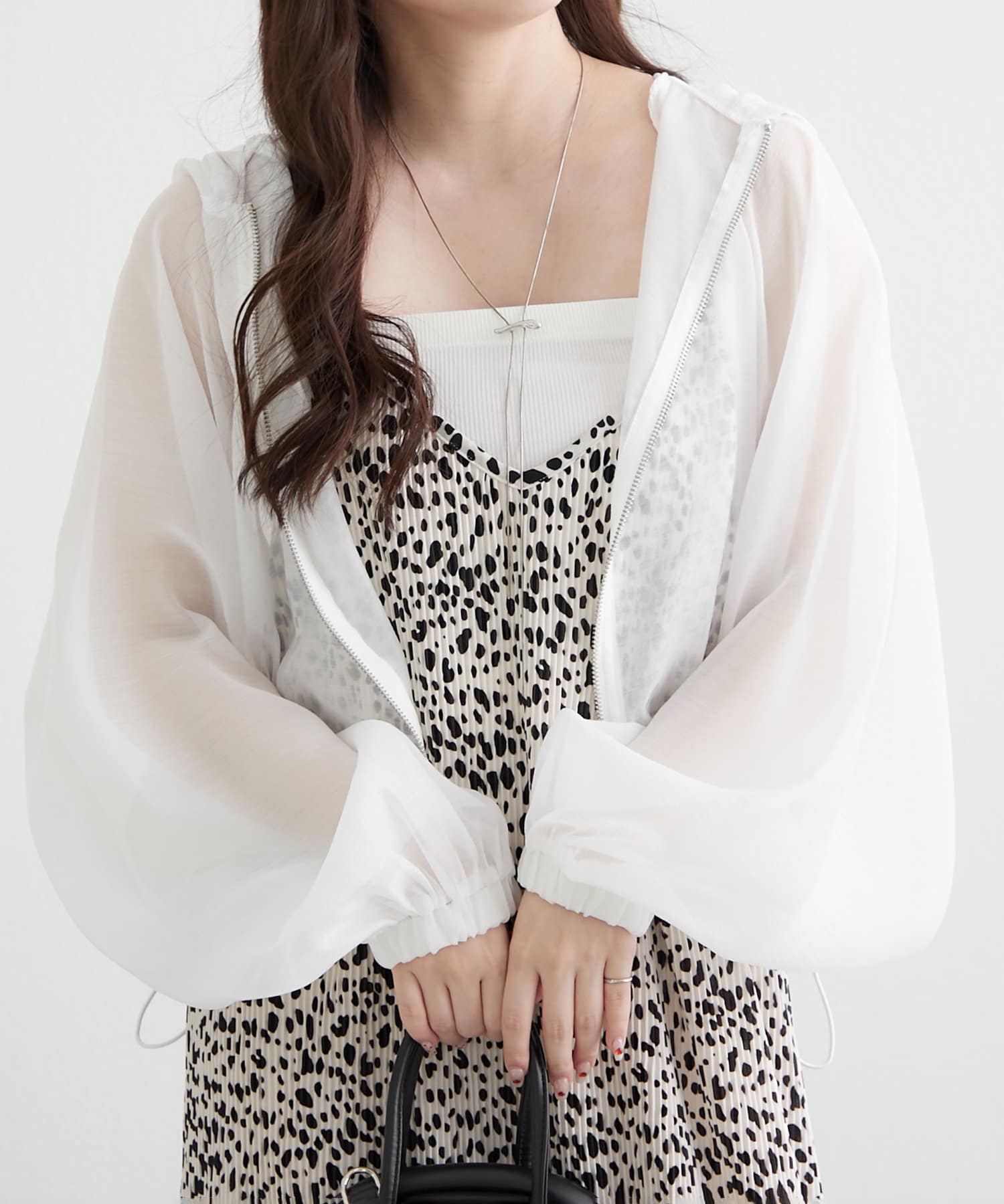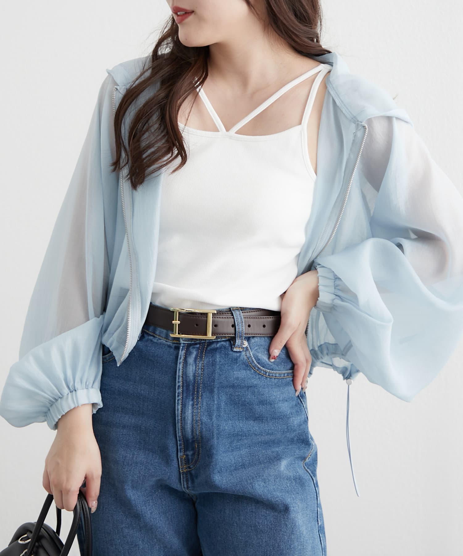 ・ドロストを絞ってショート丈にアレンジして、女性らしいキャミワンピースに羽織ればスタイルアップ効果抜群のスタイリングが完成します。