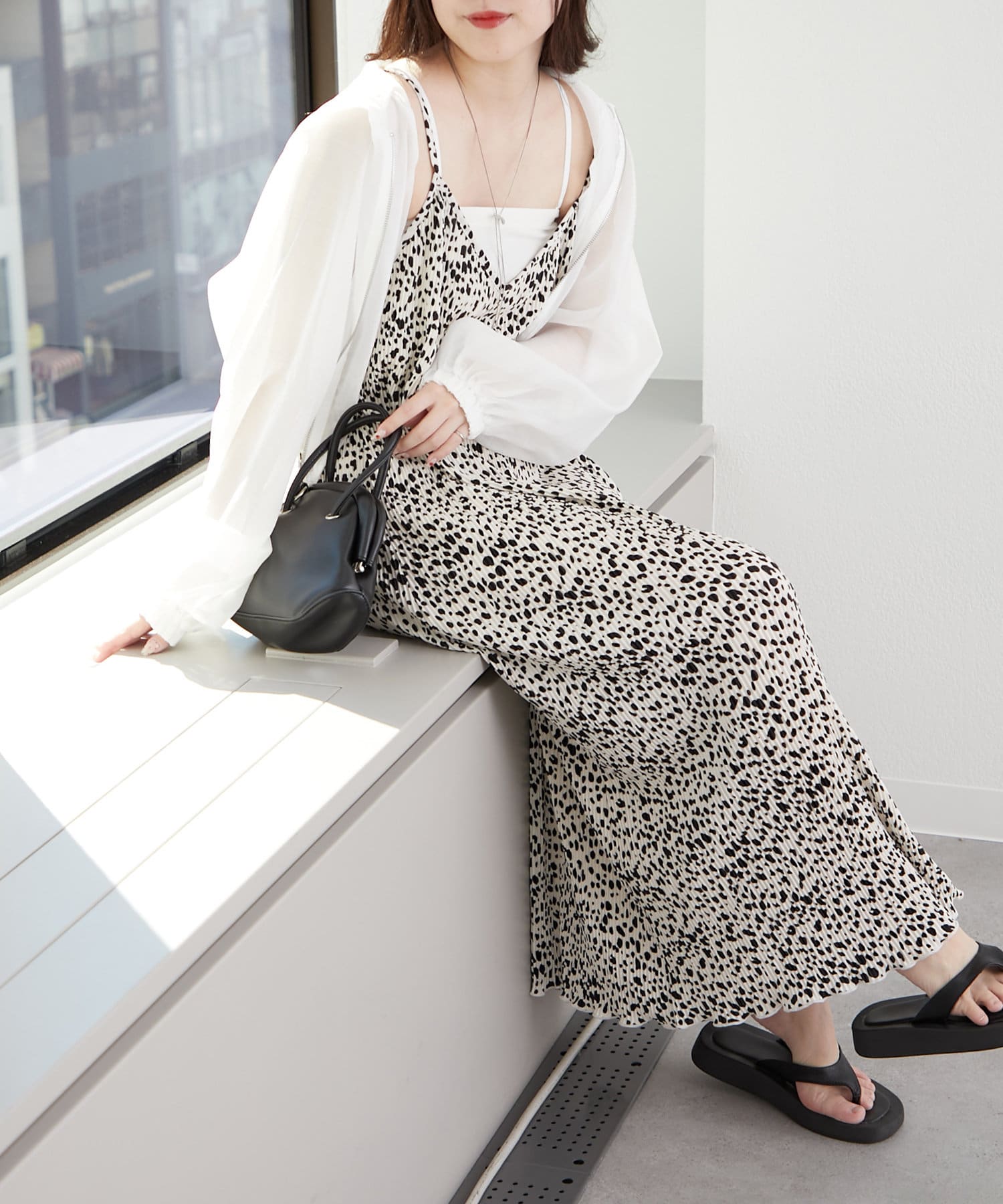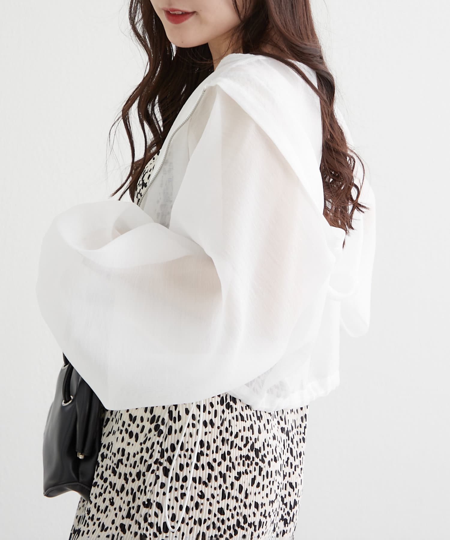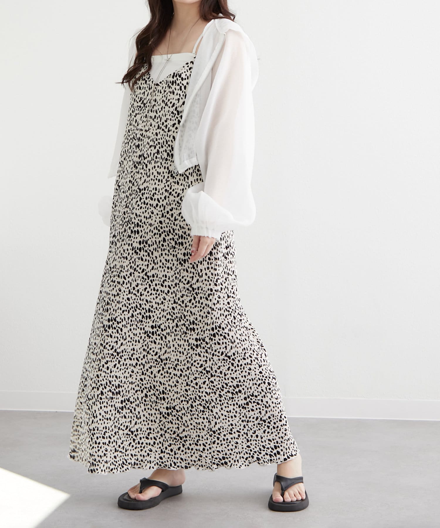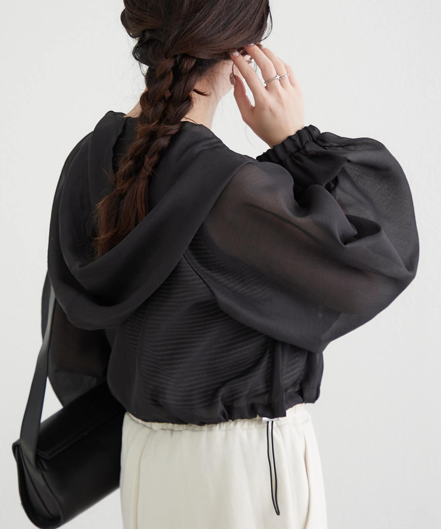 ・ドロストを絞ってショート丈にアレンジして、女性らしいキャミワンピースに羽織ればスタイルアップ効果抜群のスタイリングが完成します。