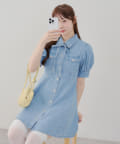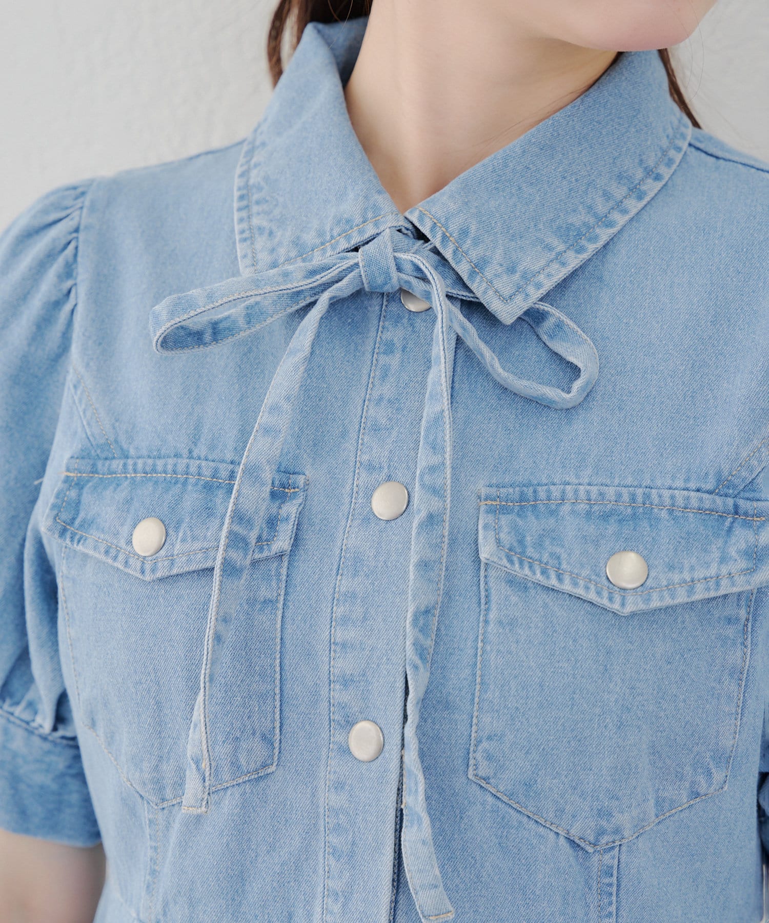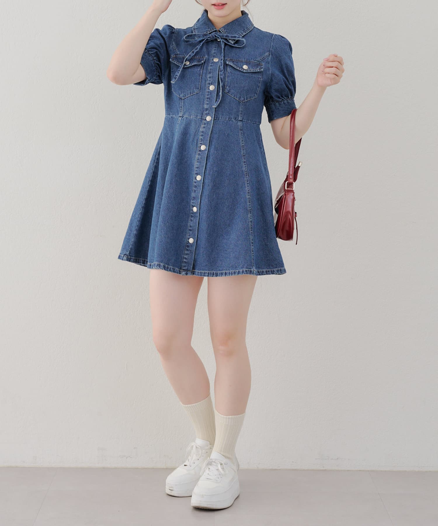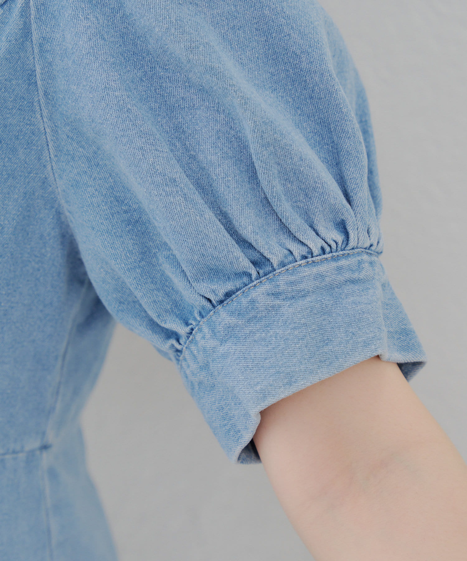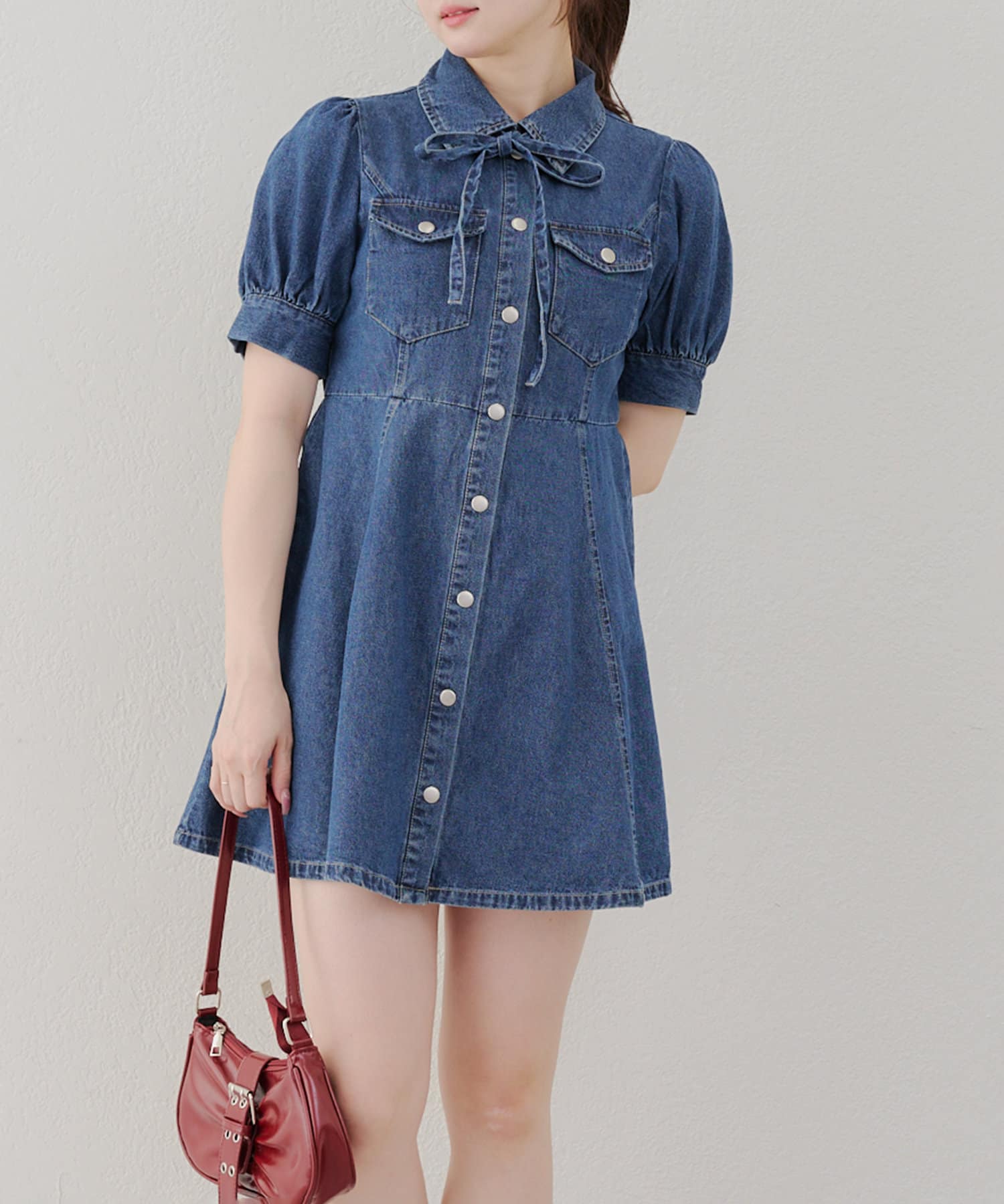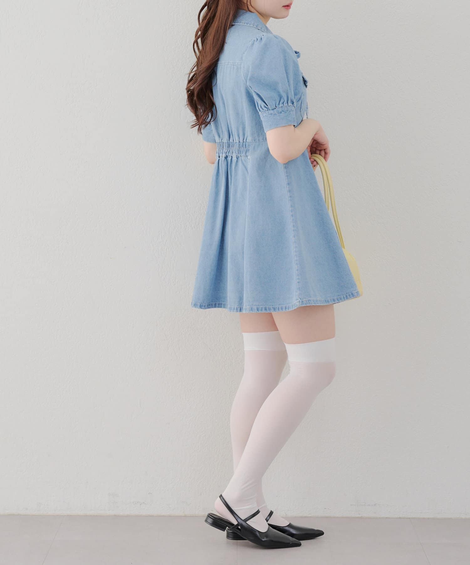 ・ボリュームスリーブと裾フレアデザインがかわいい今季トレンドのデニムワンピース。