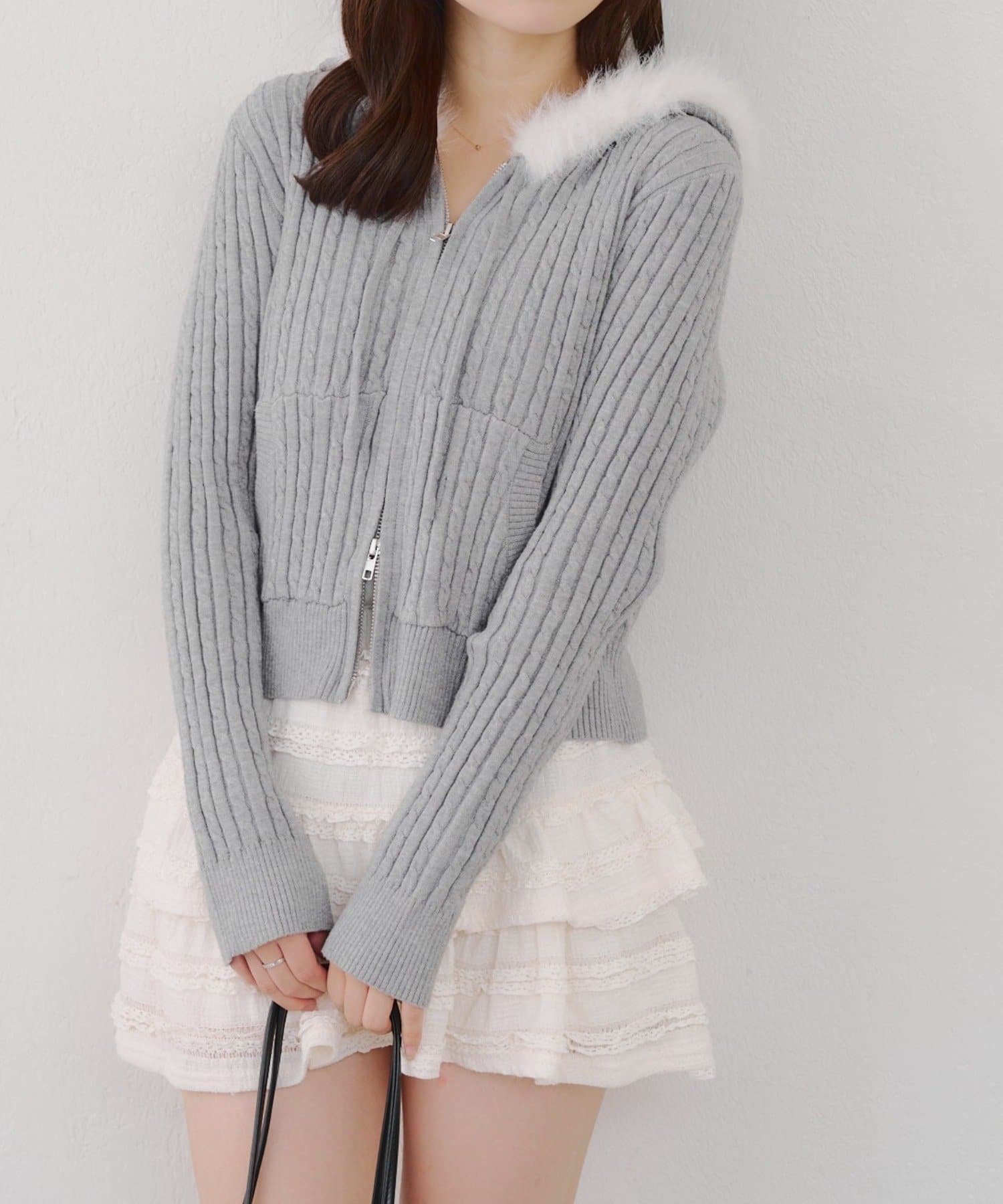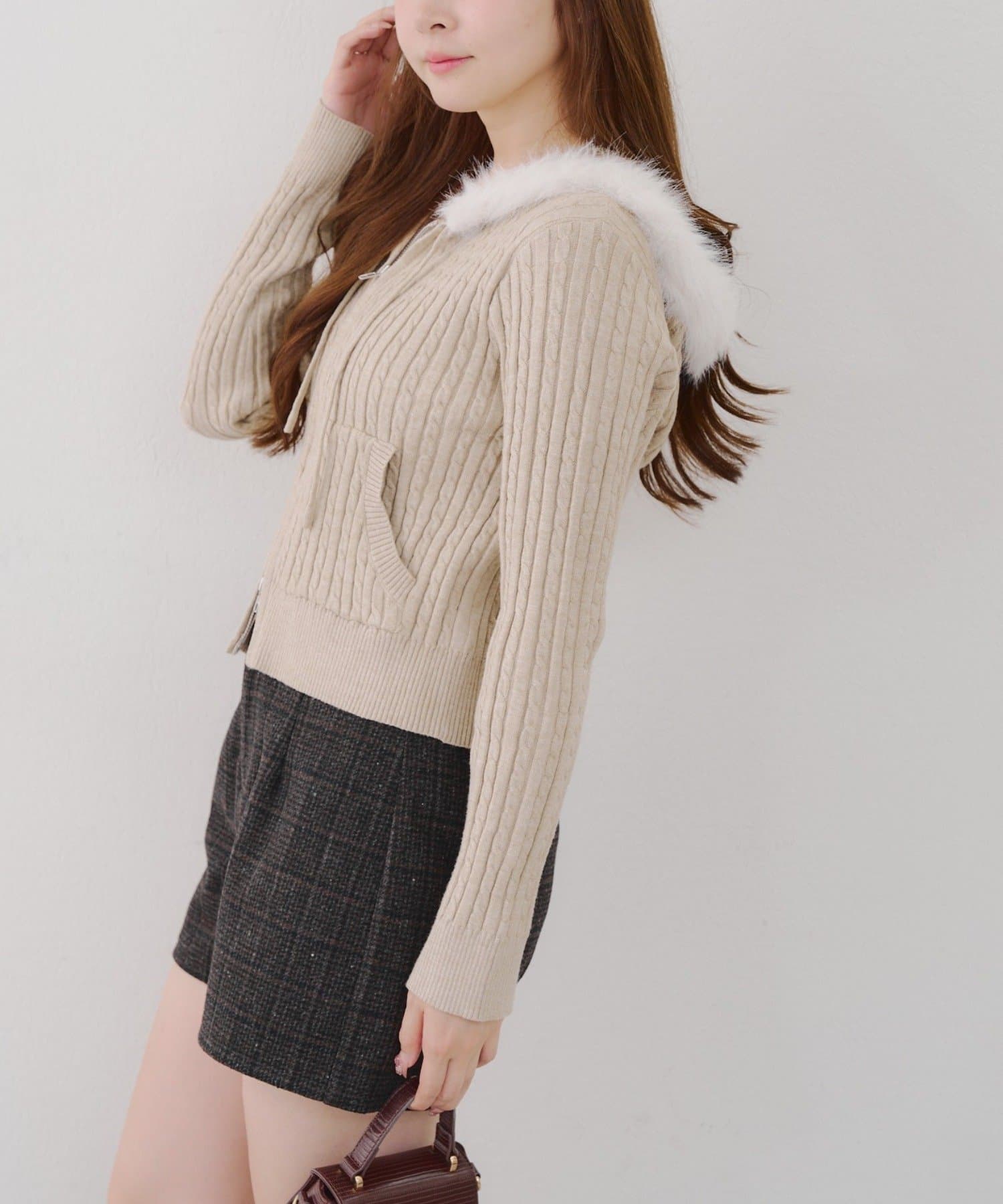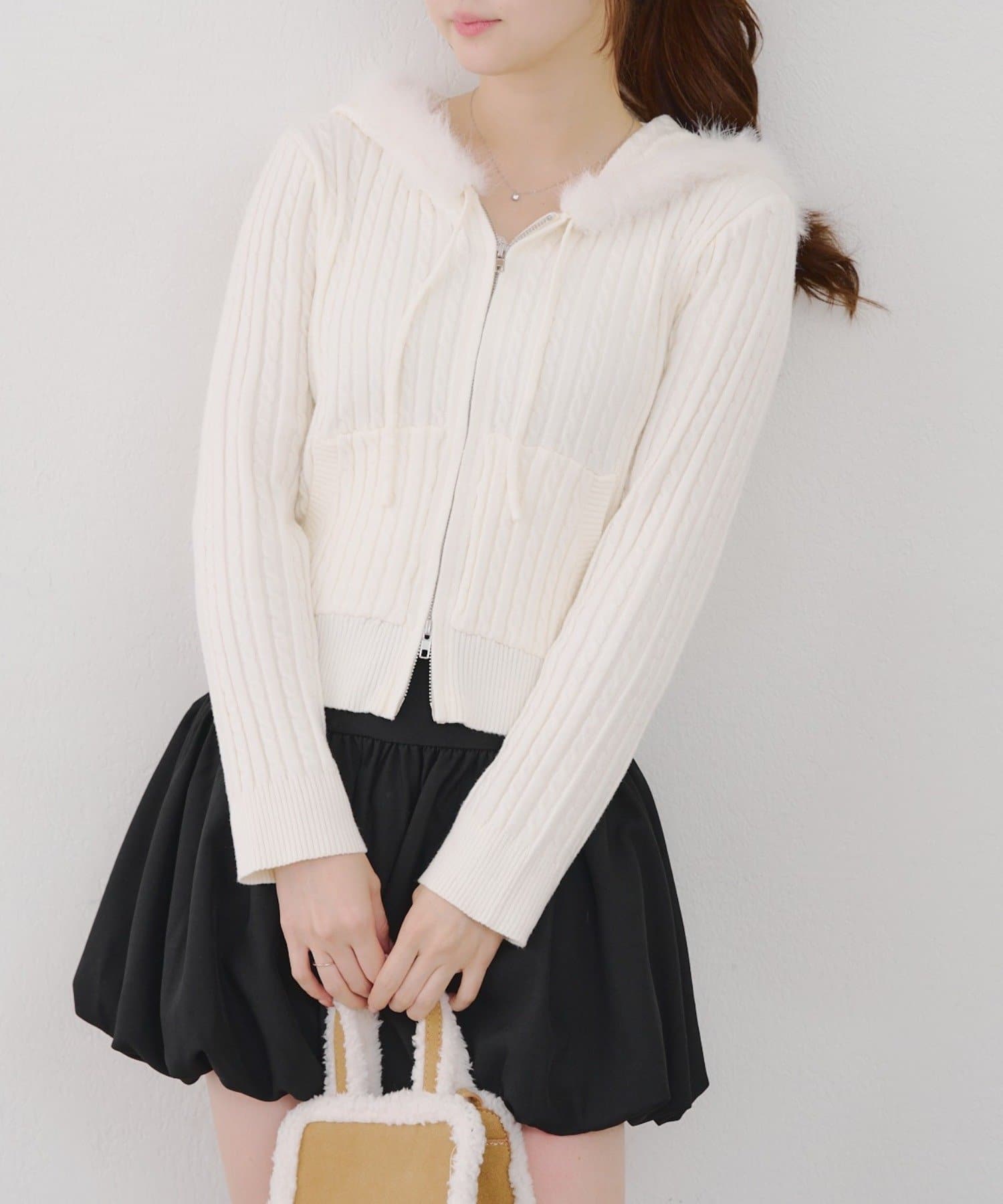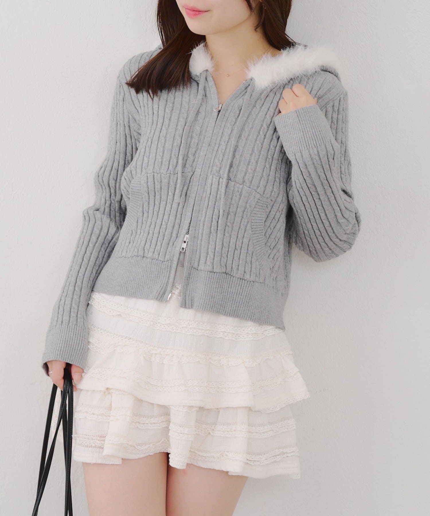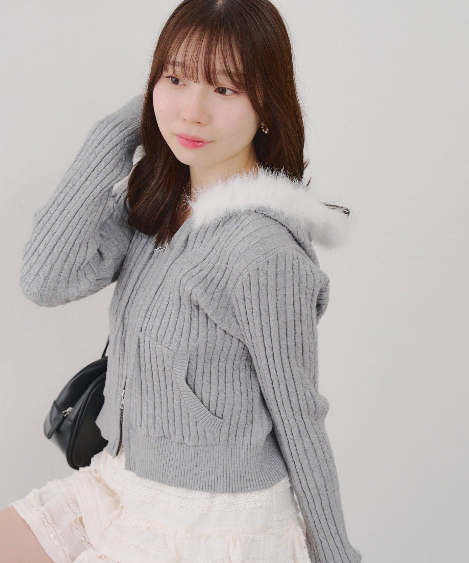 ・ファー付きのフードがトレンドのニットパーカー。