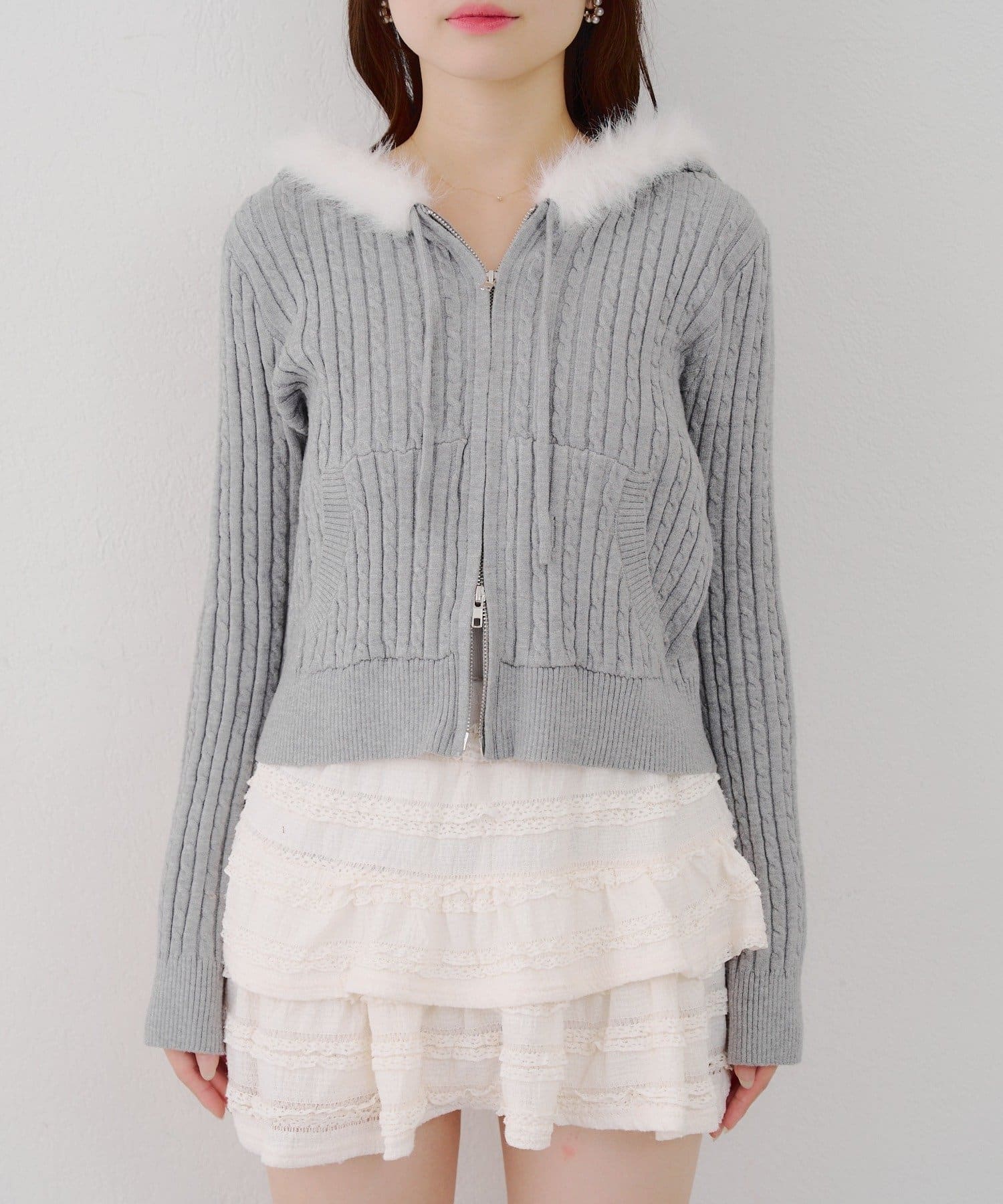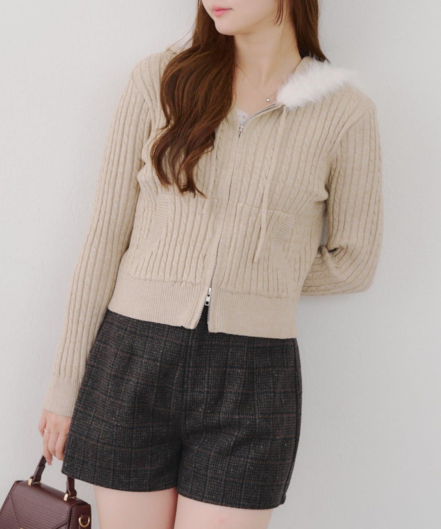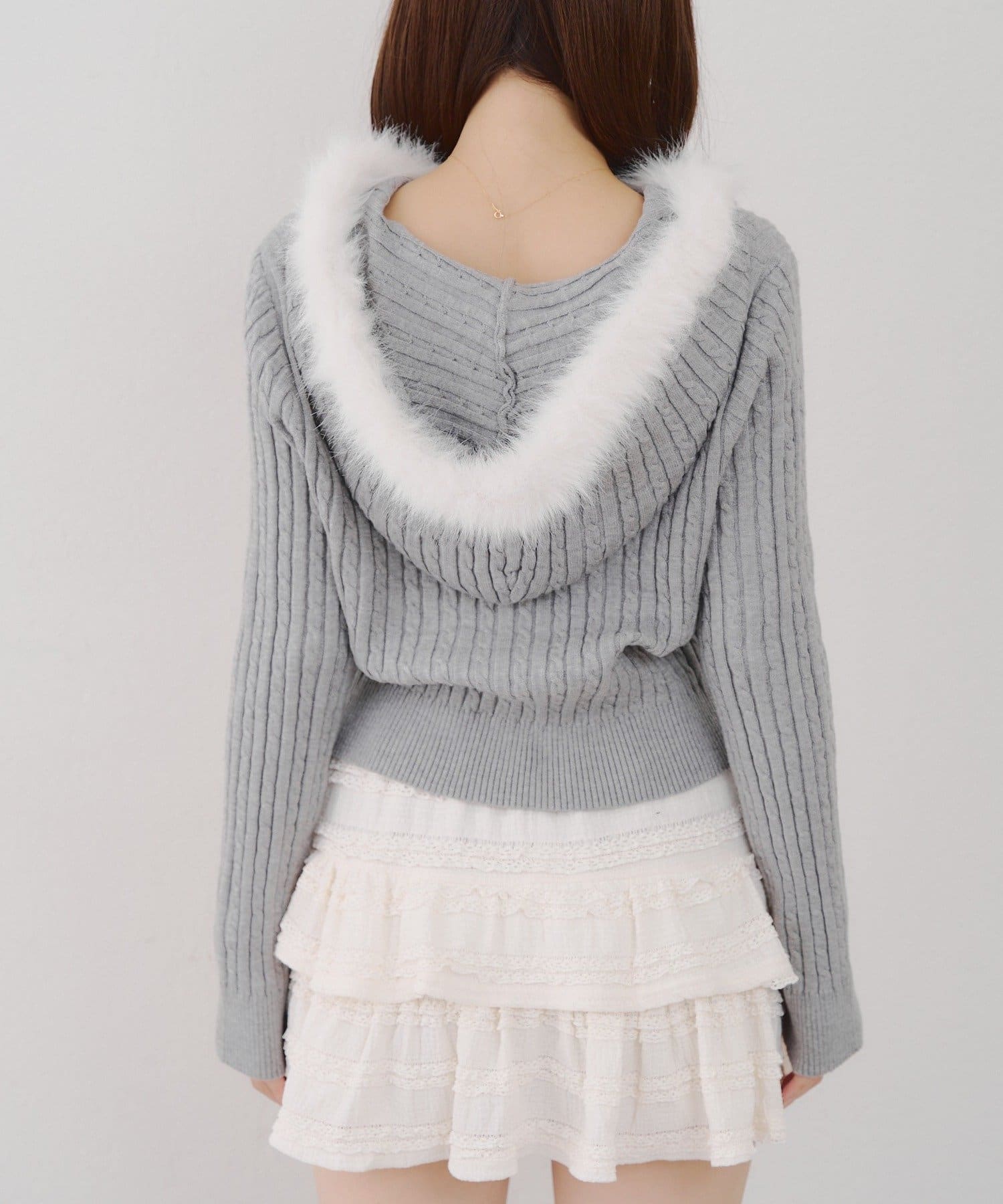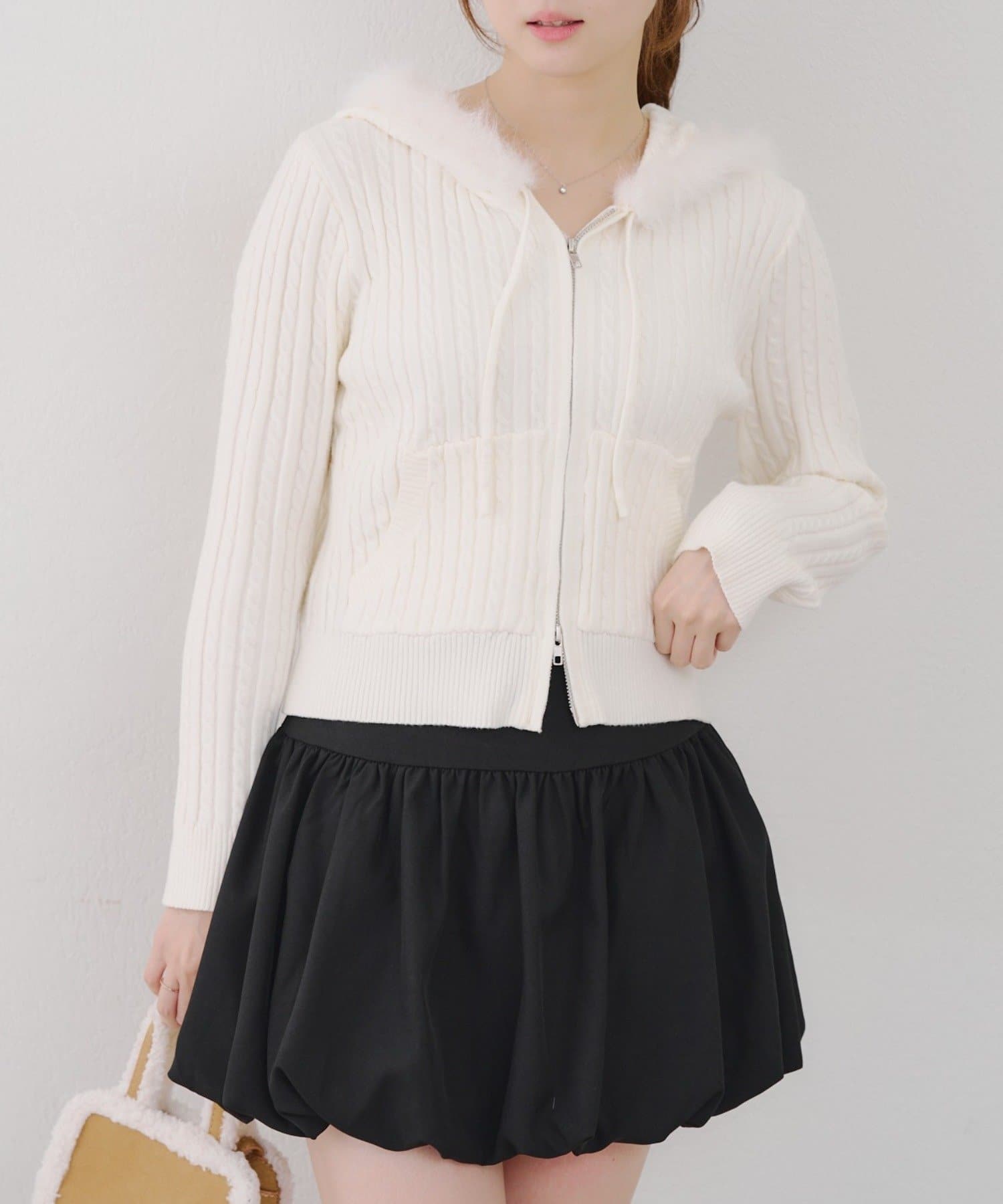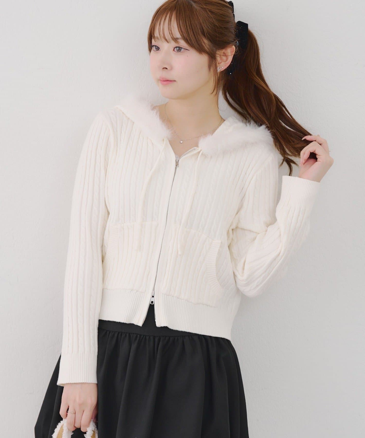 ・ファー付きのフードがトレンドのニットパーカー。