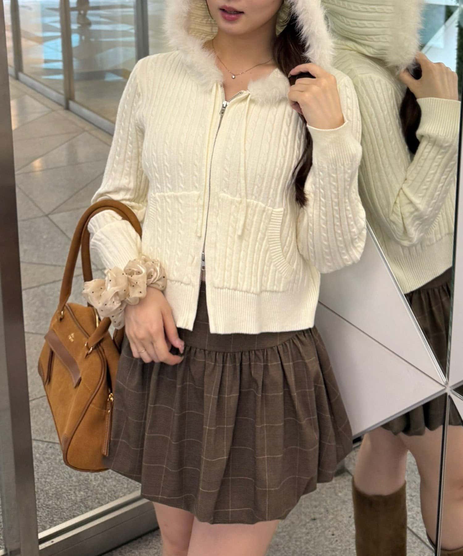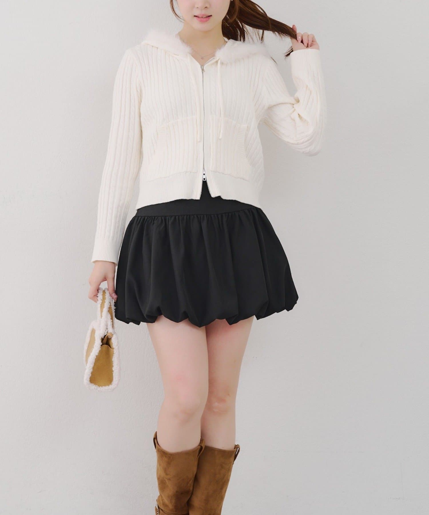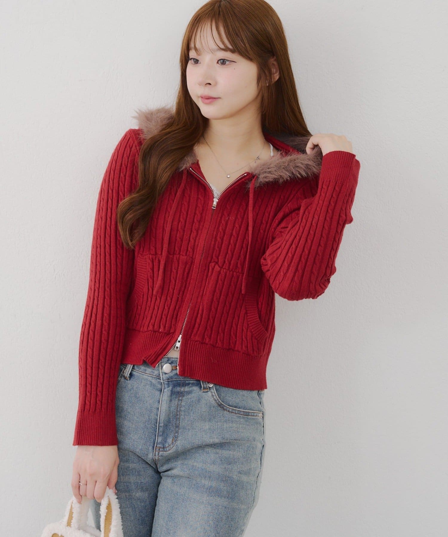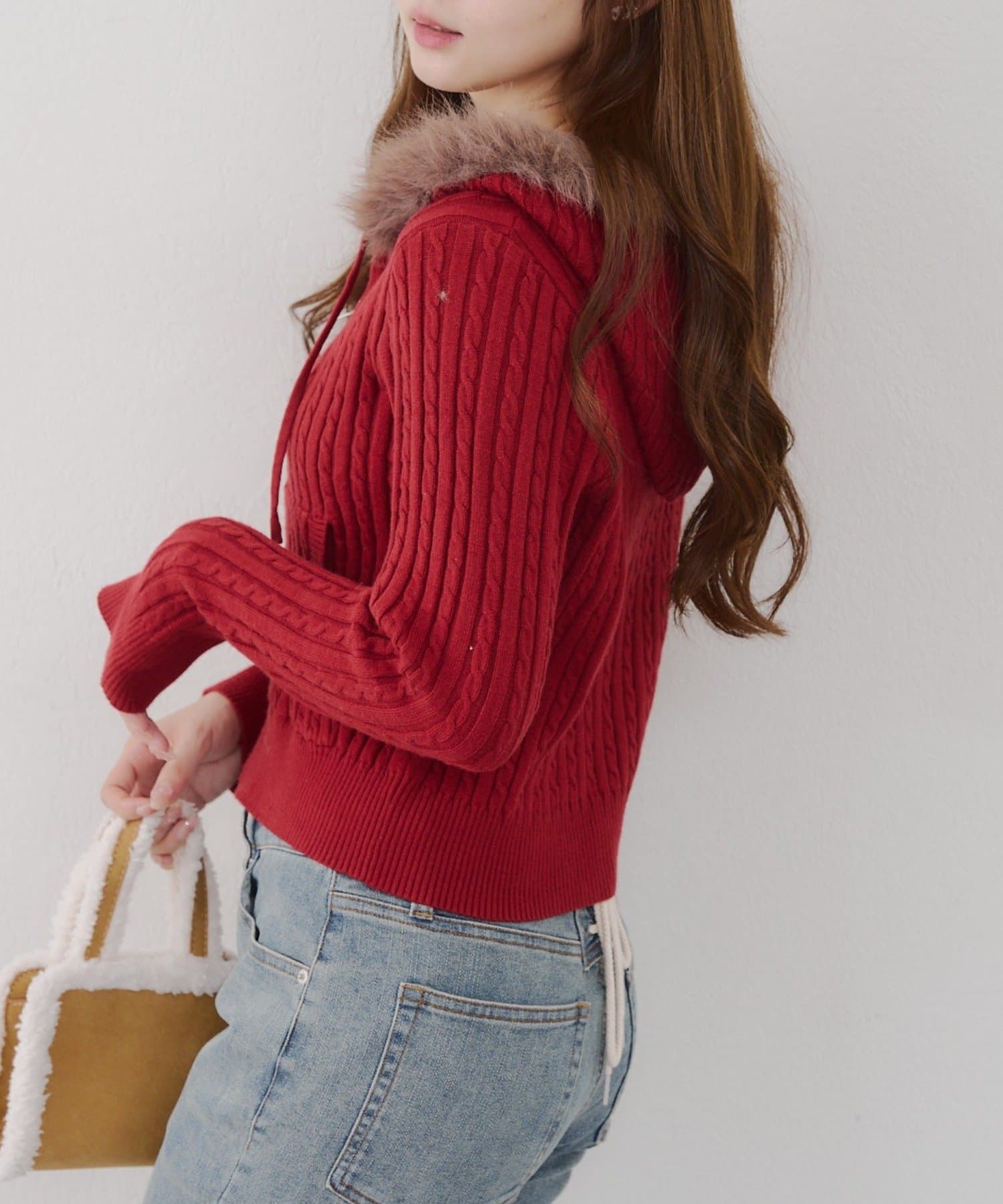 ・ファー付きのフードがトレンドのニットパーカー。