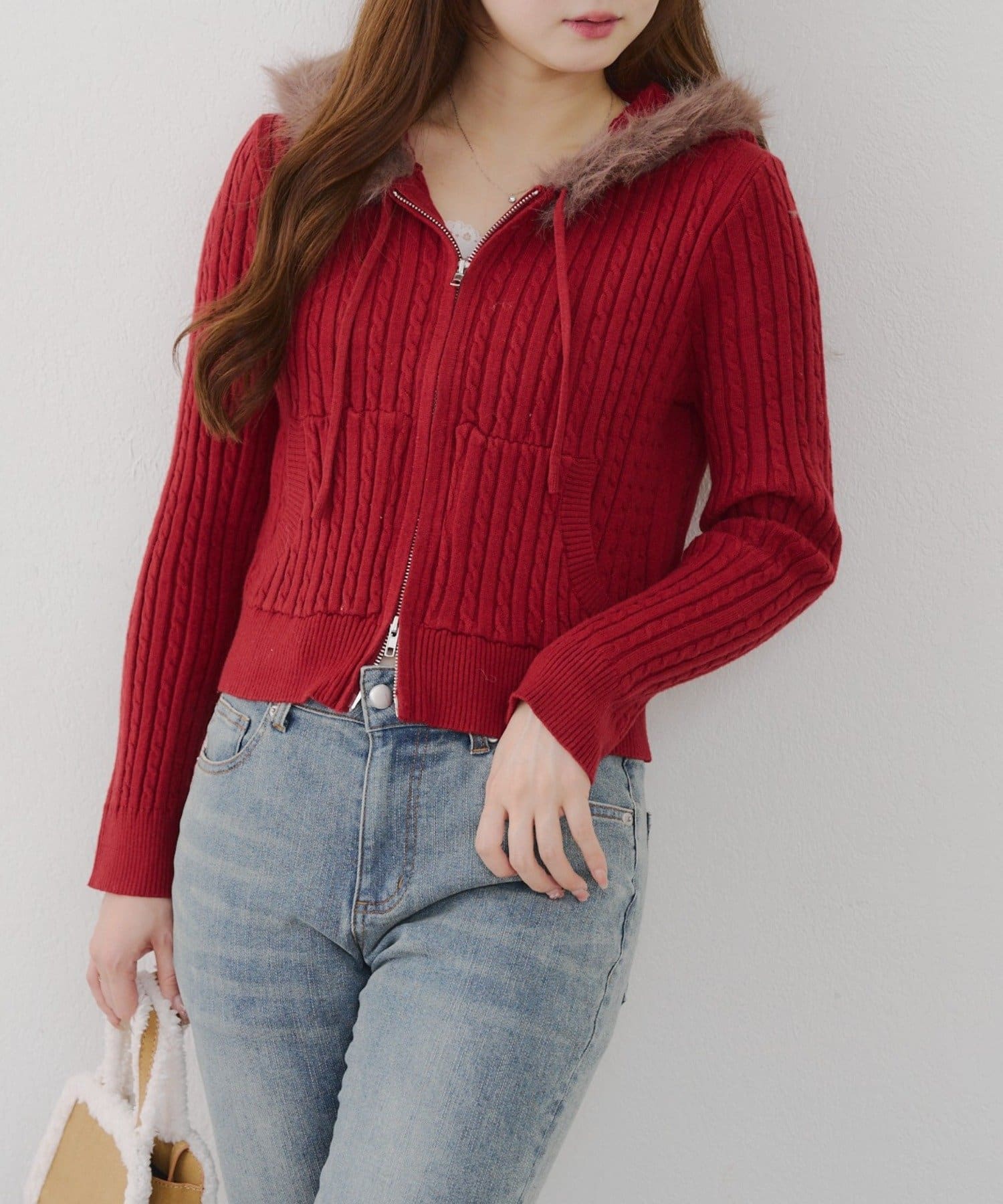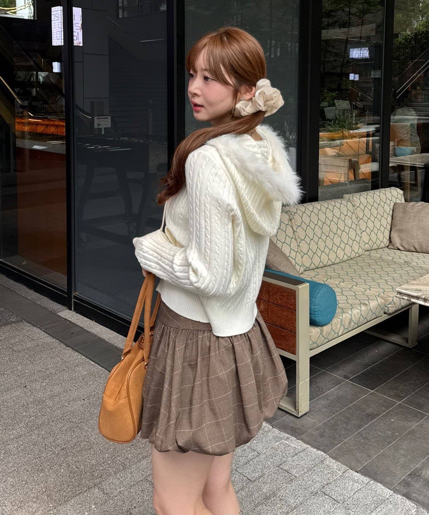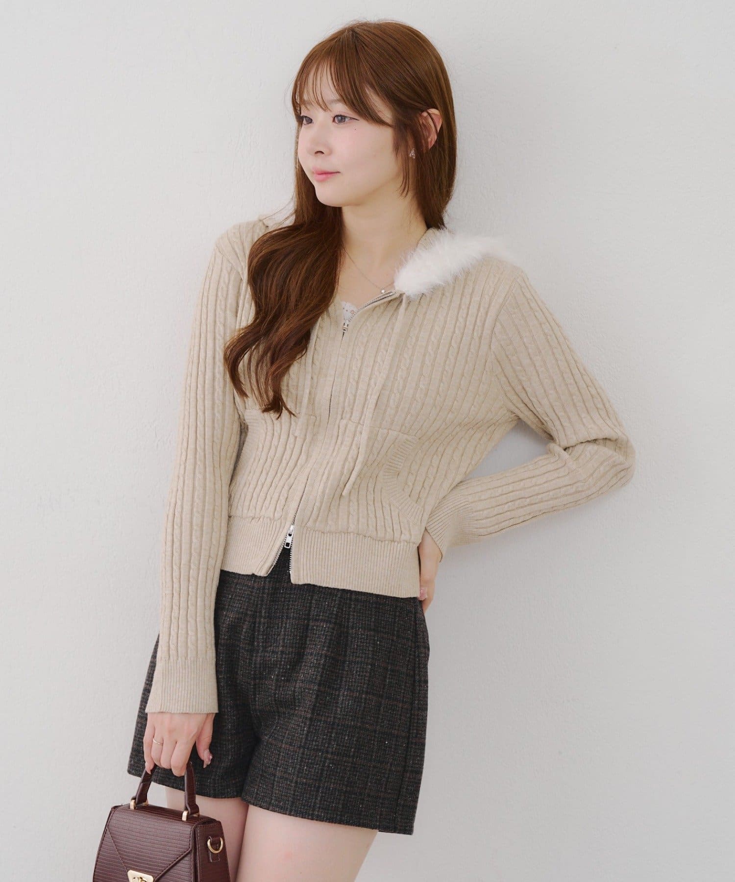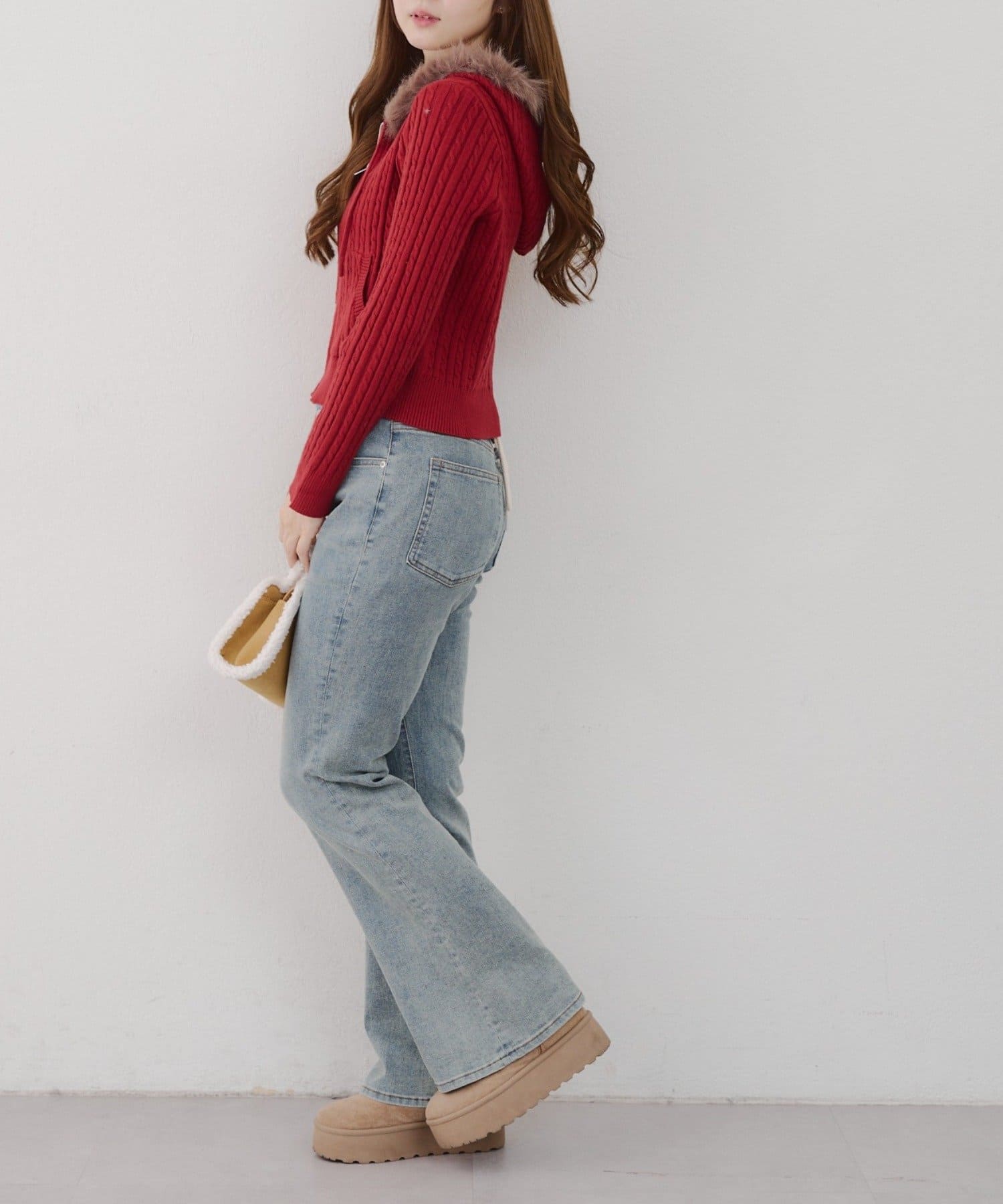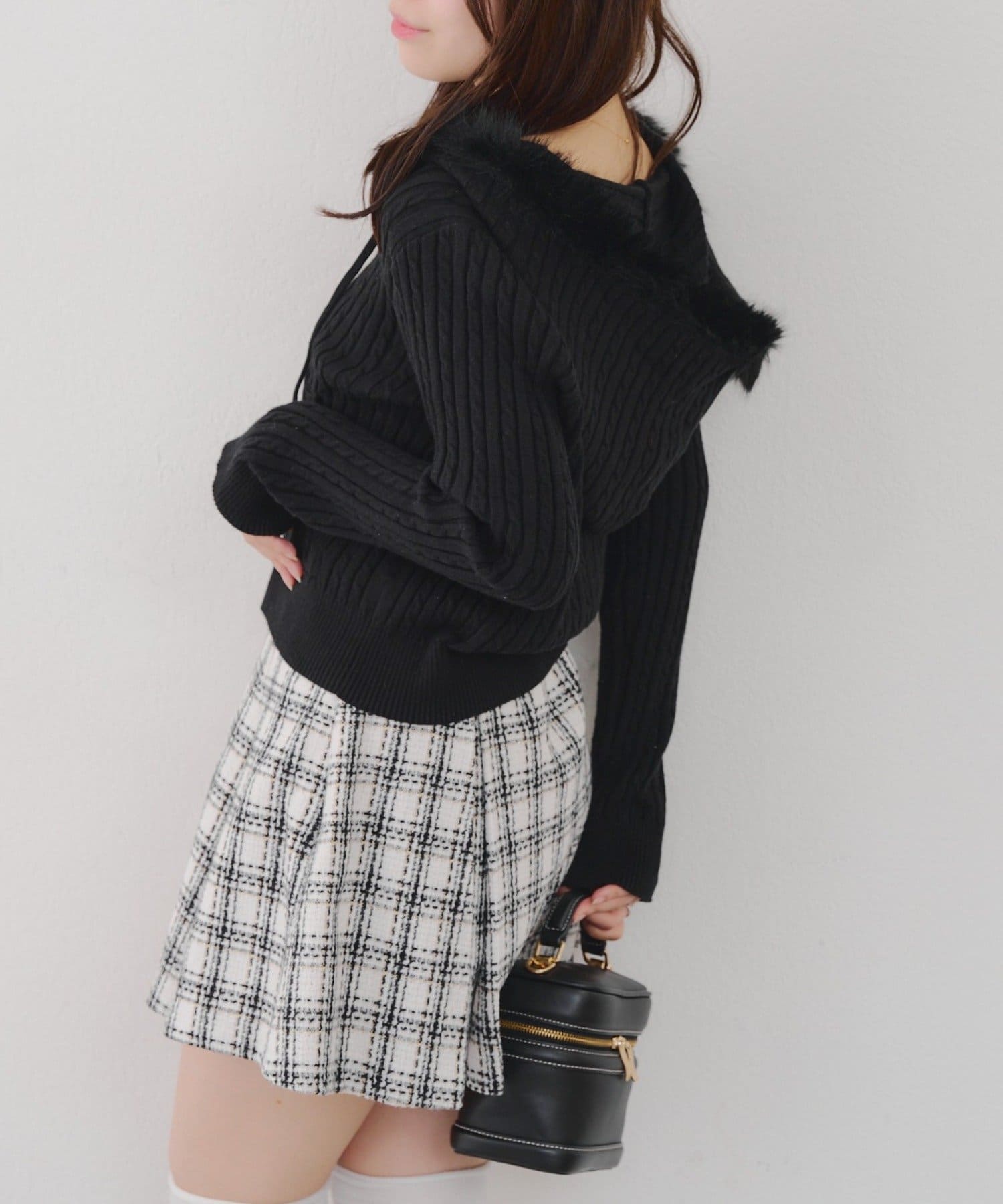 ・ファー付きのフードがトレンドのニットパーカー。