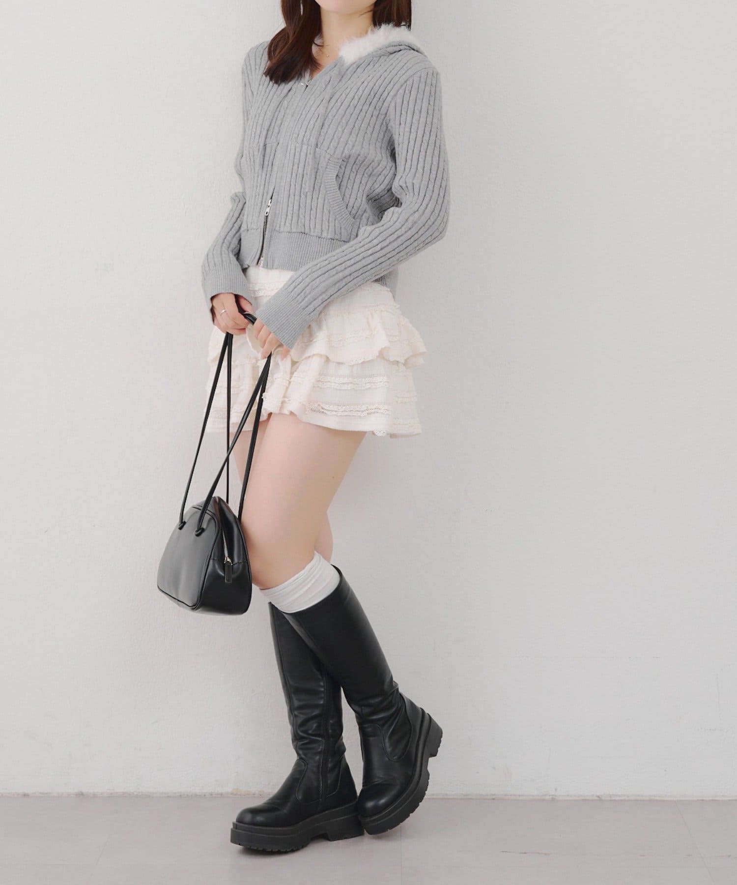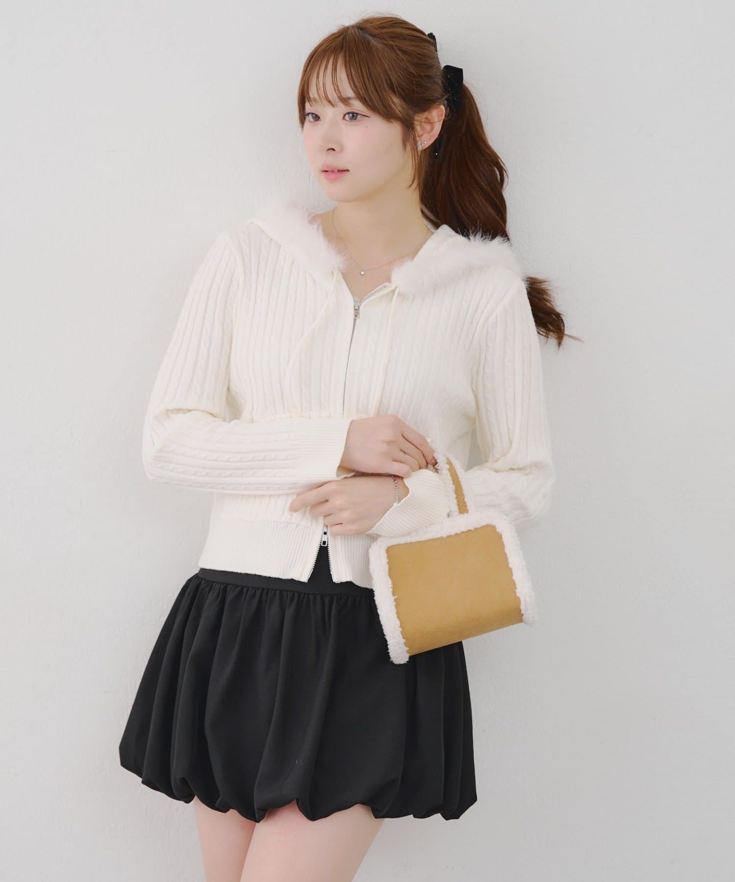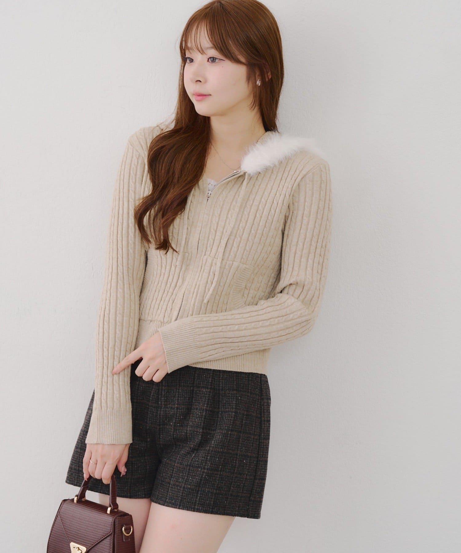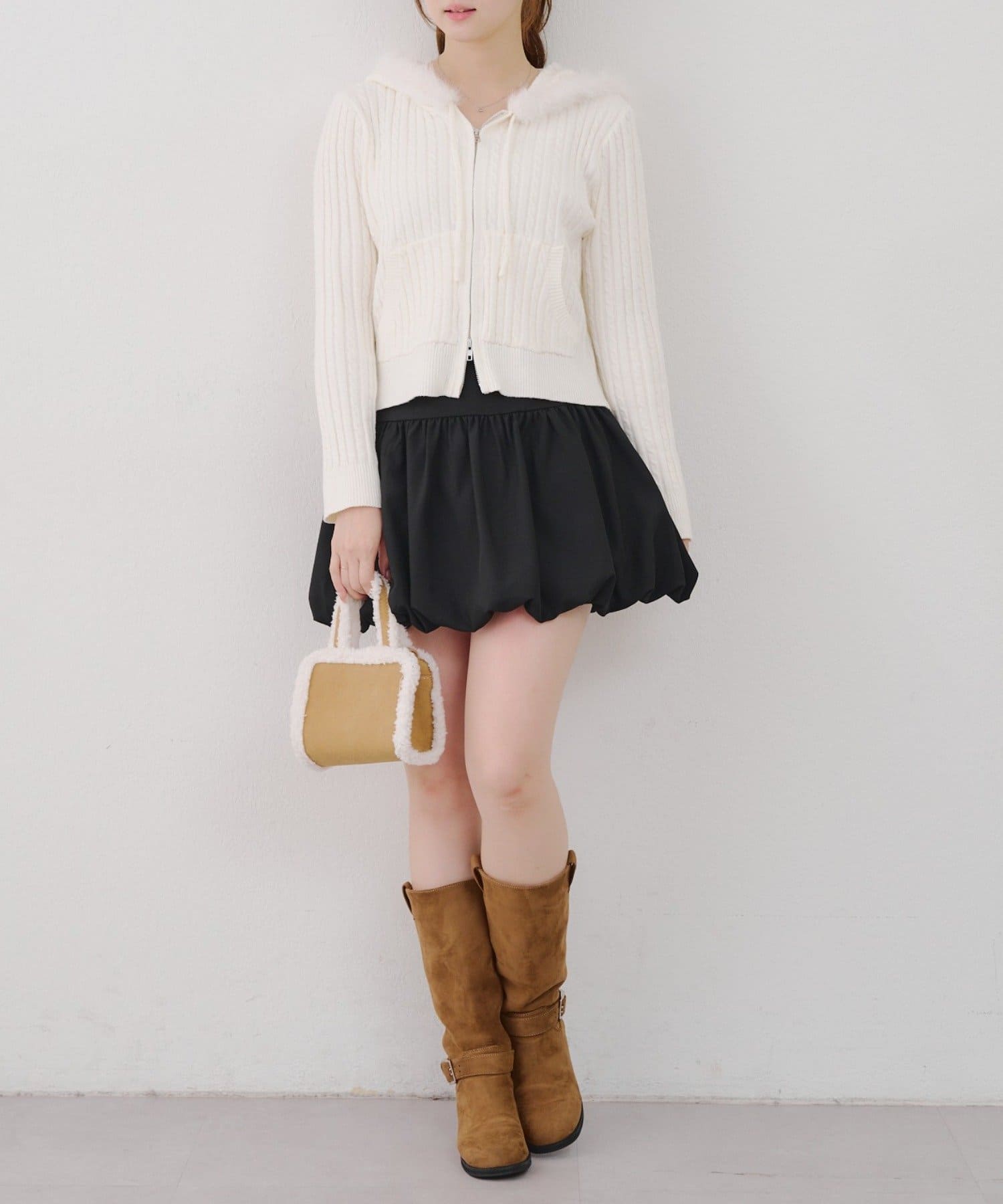 ・ファー付きのフードがトレンドのニットパーカー。