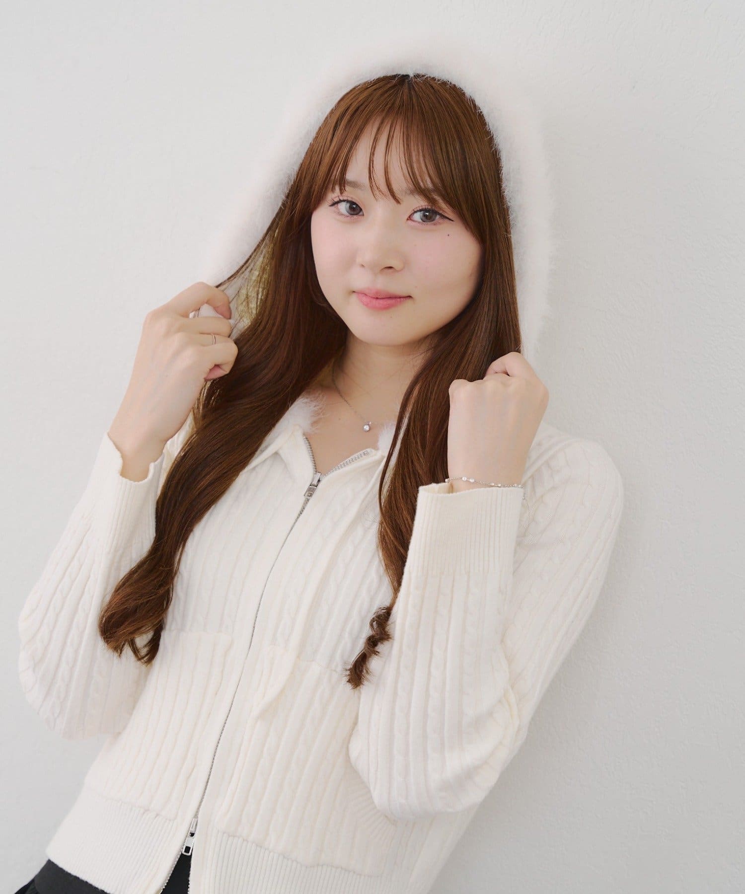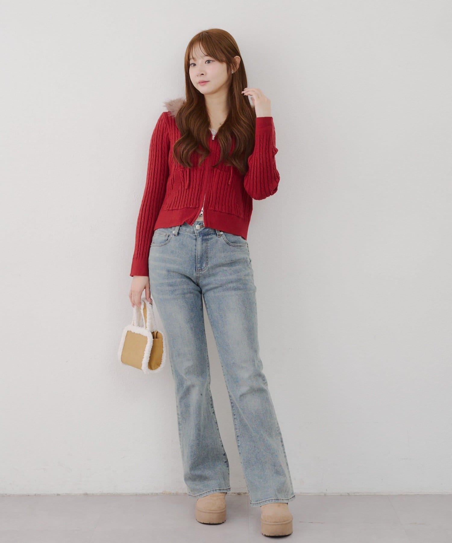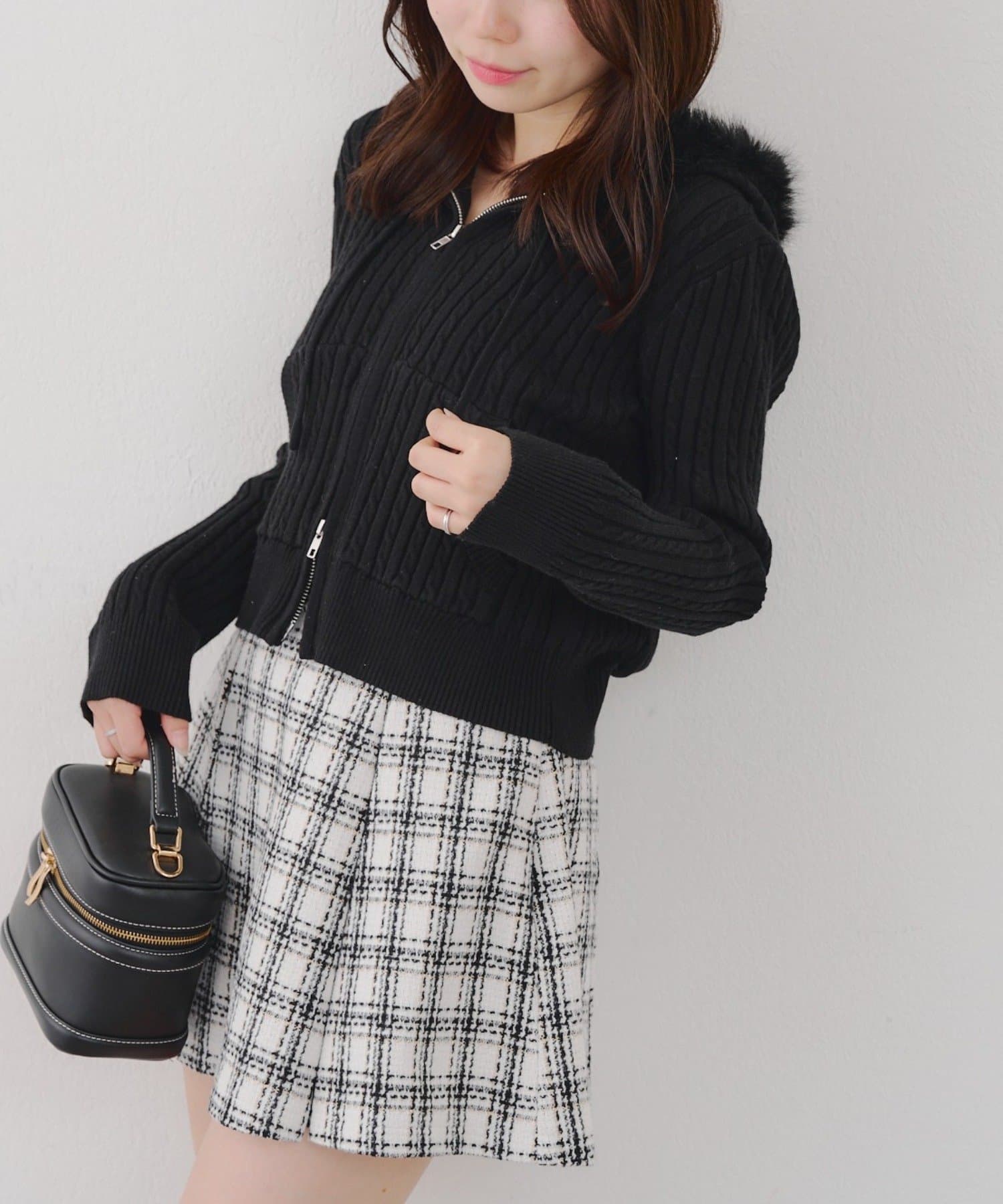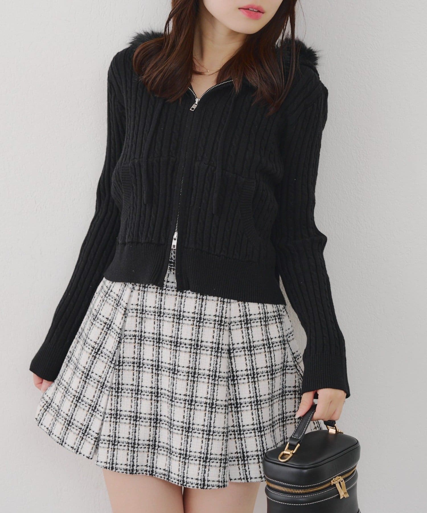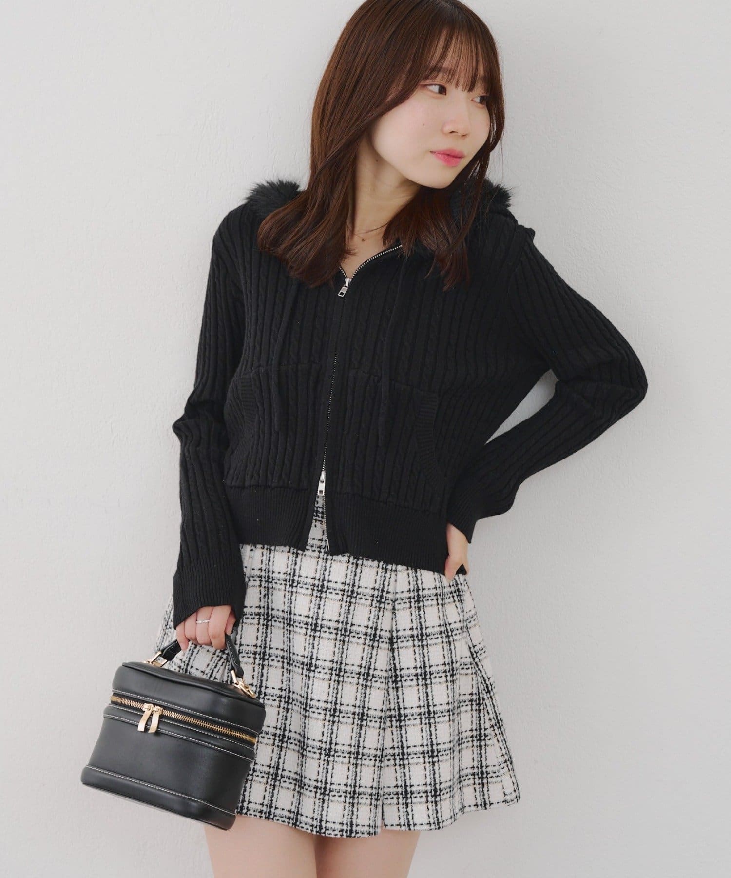 ・ファー付きのフードがトレンドのニットパーカー。
