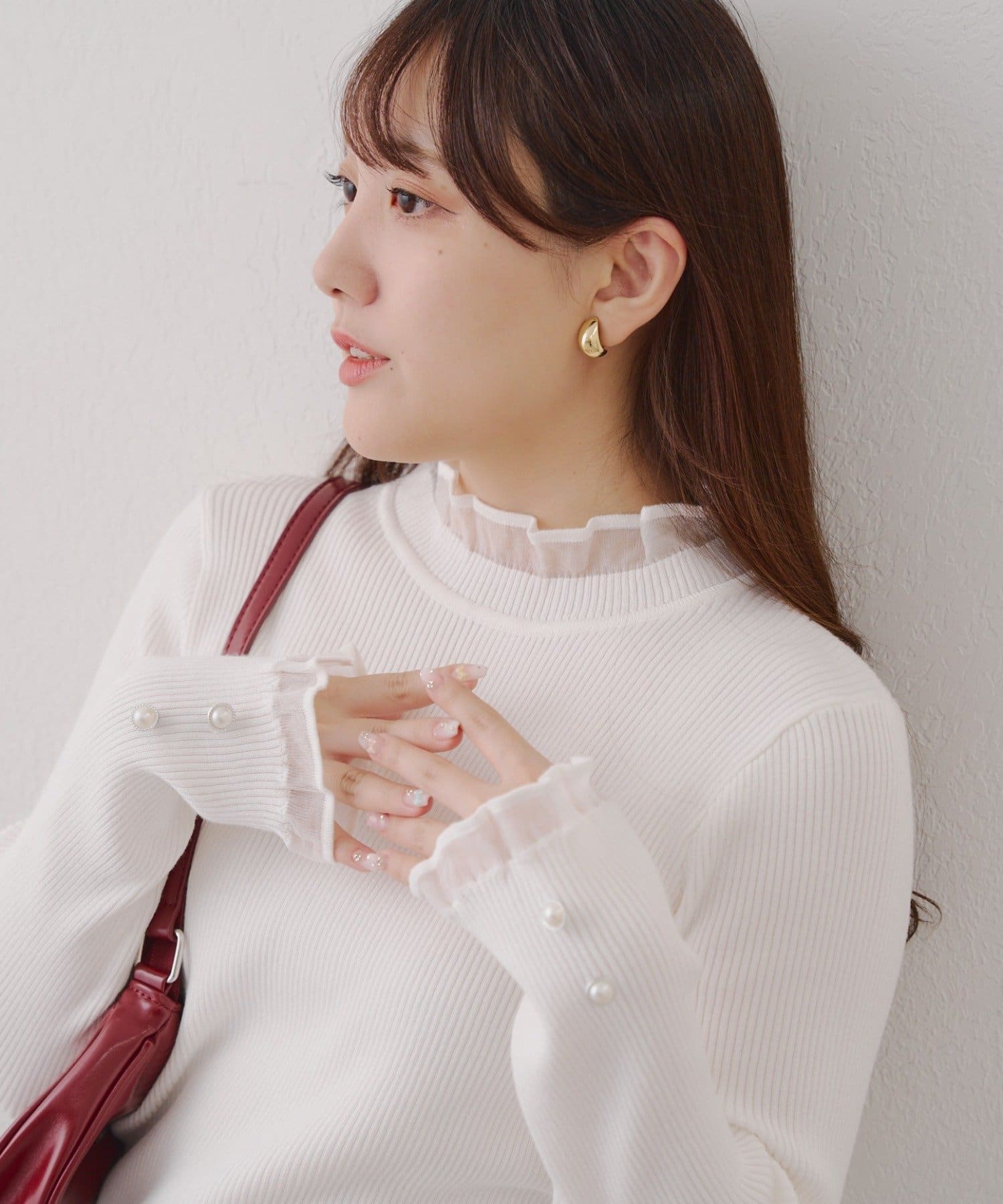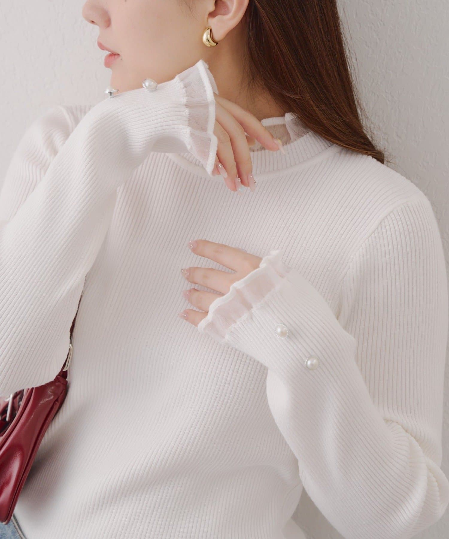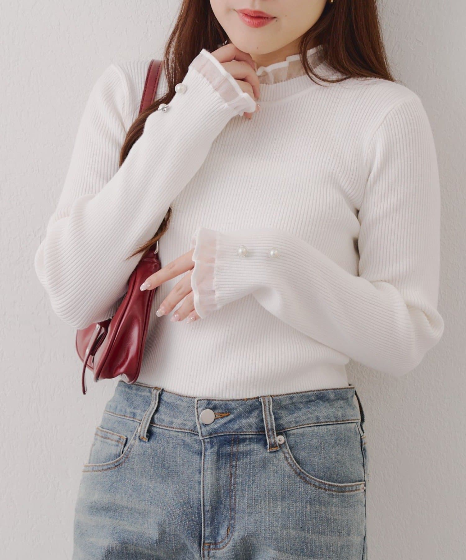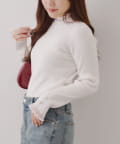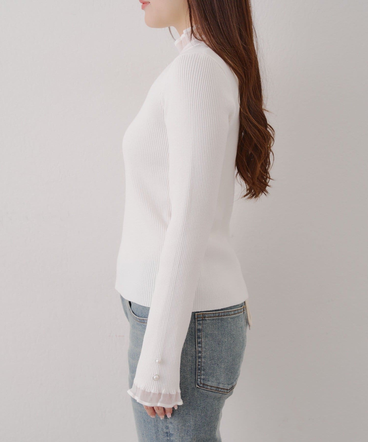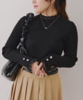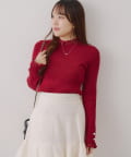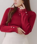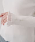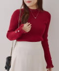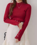 ・袖口のフレアとパール調ボタンが上品なニット。