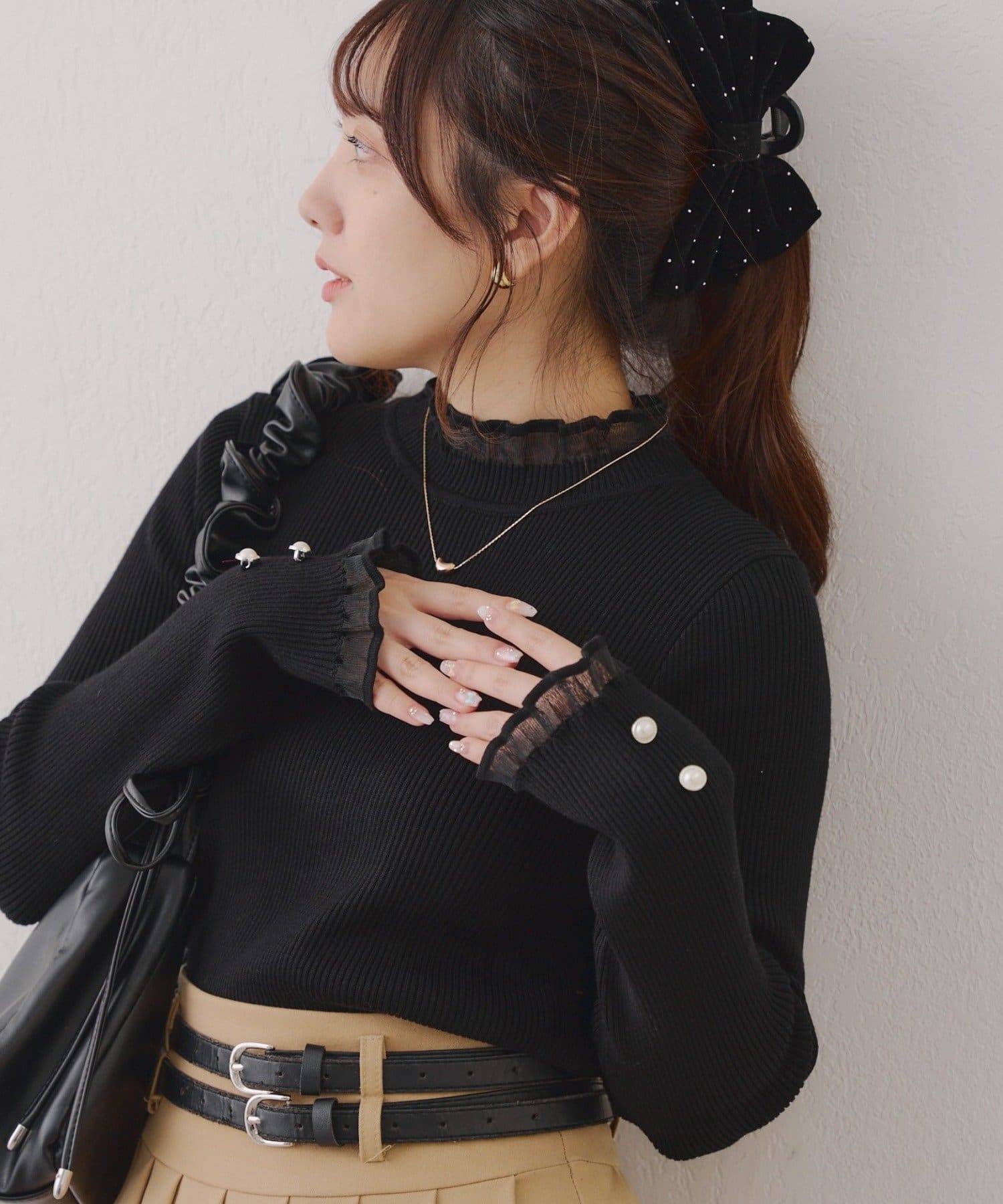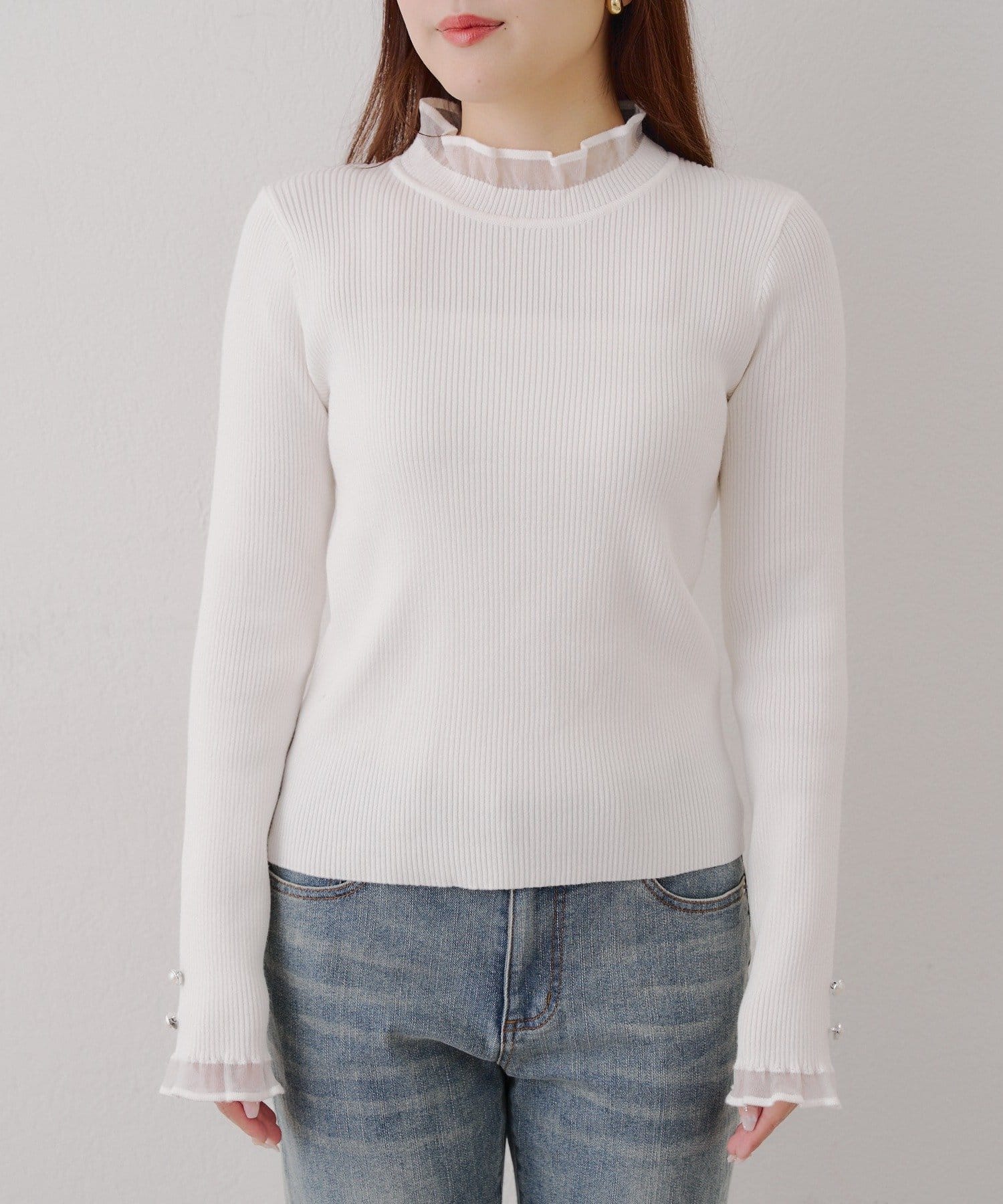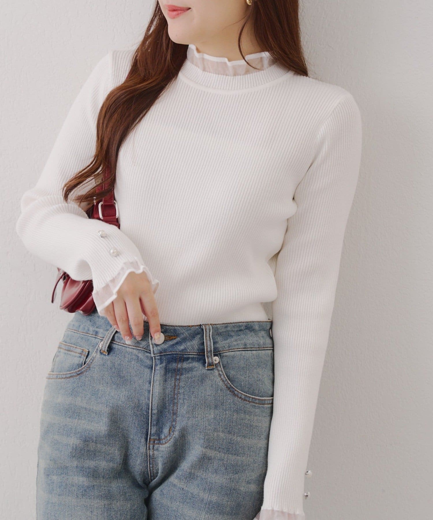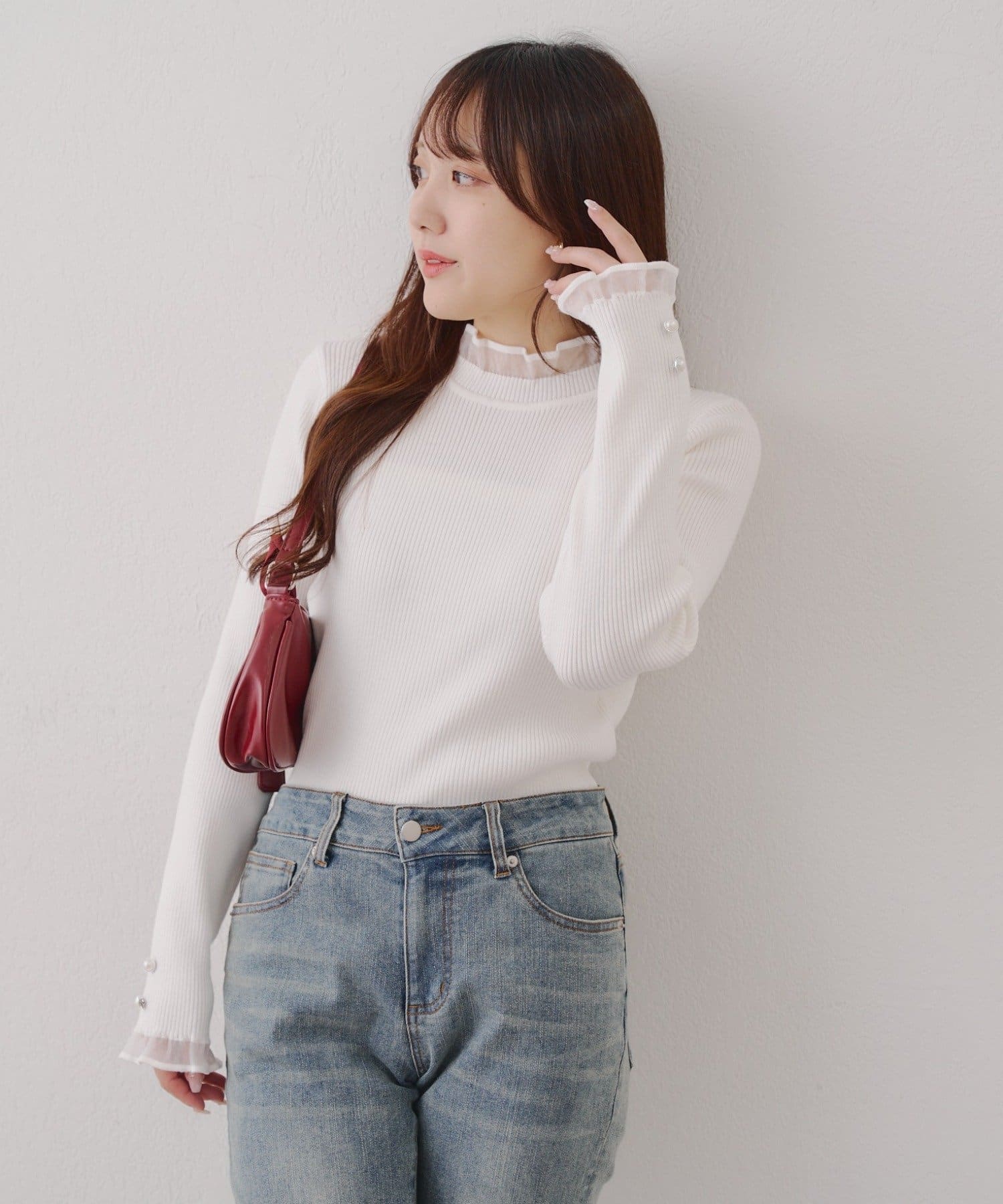 ・袖口のフレアとパール調ボタンが上品なニット。