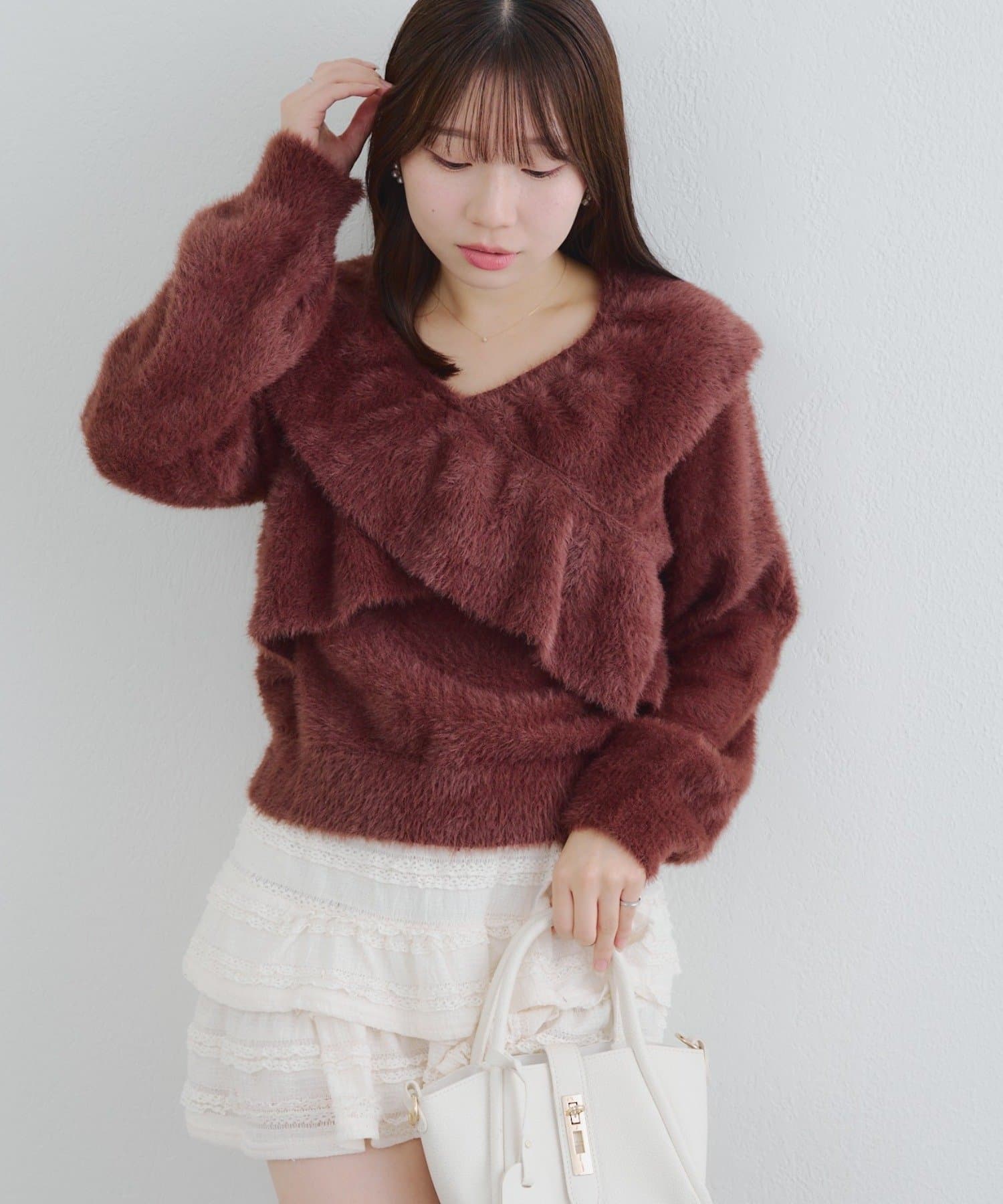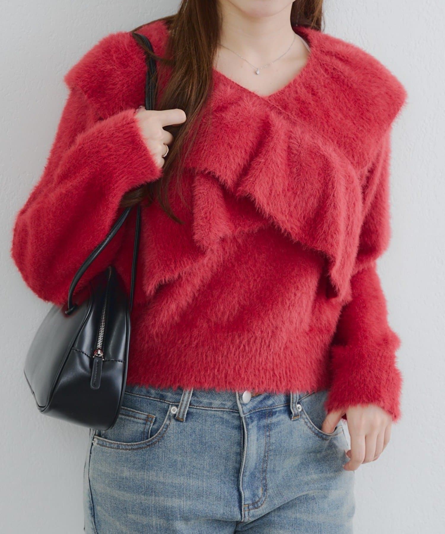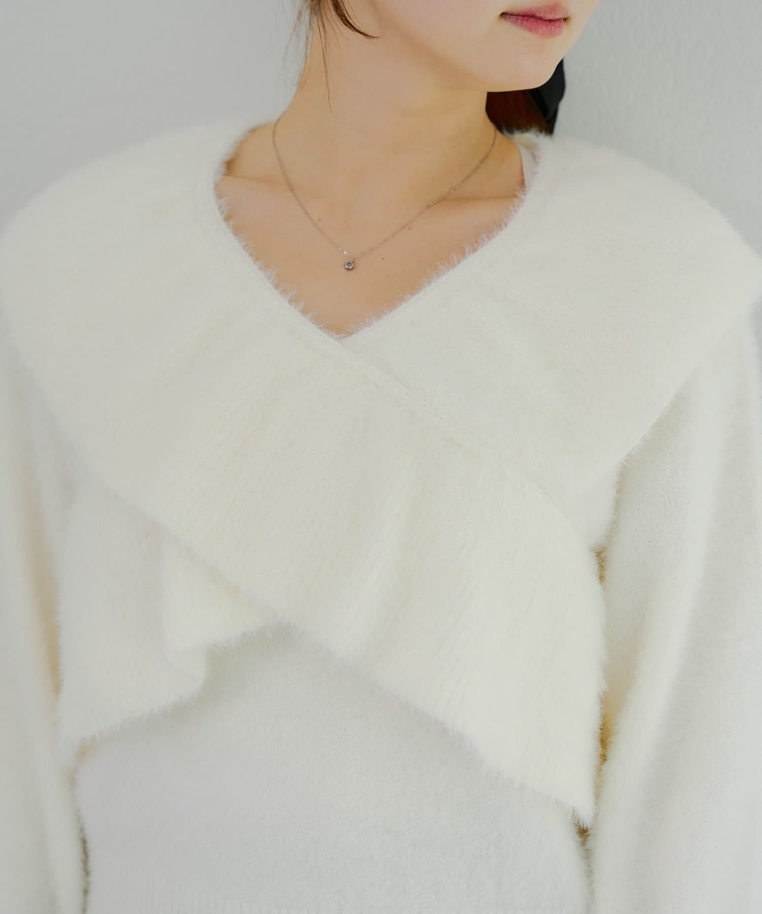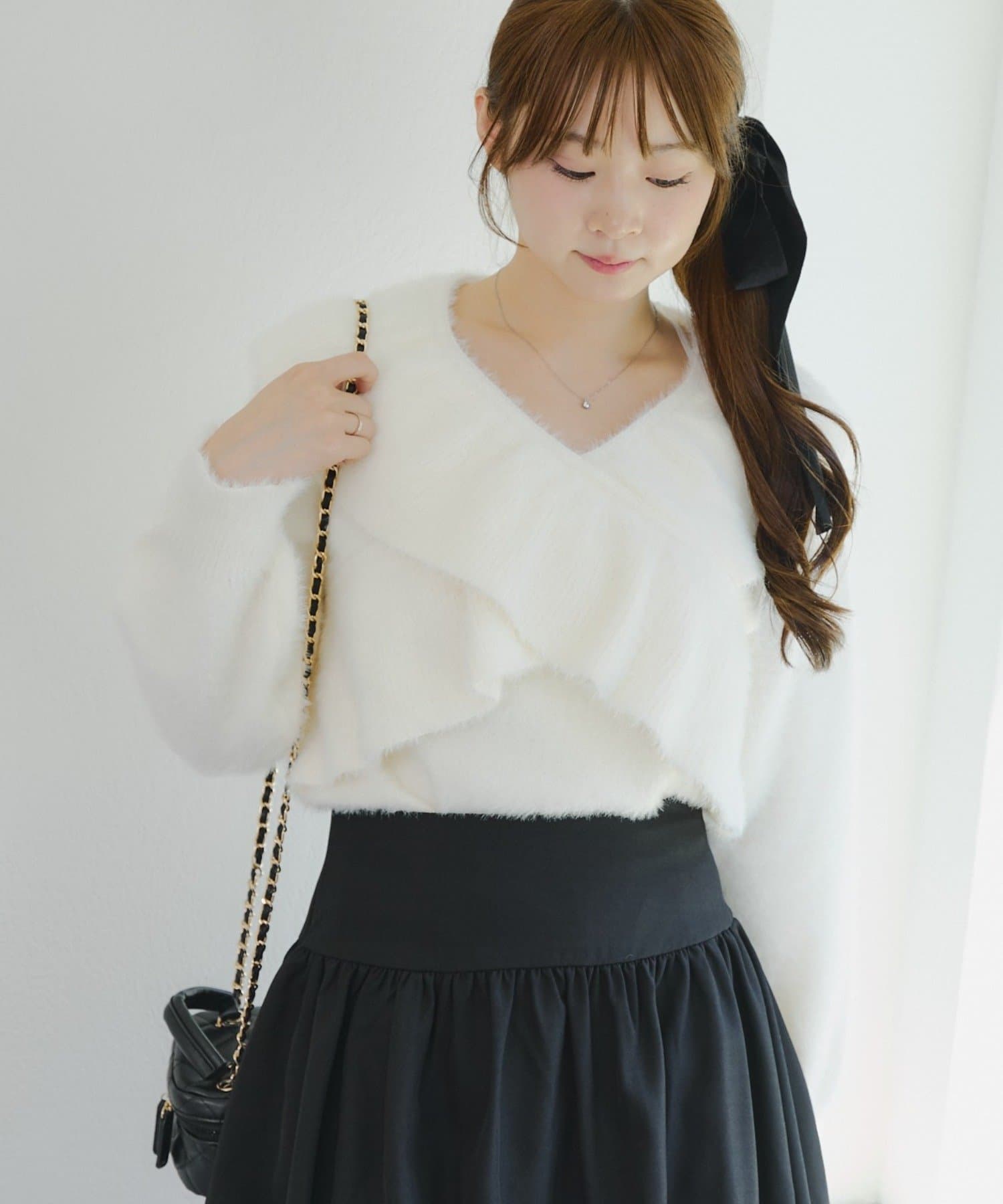 ・デコルテを美しく見せるVネックラインと、さりげないフリルデザインが、女性らしさを引き立てます