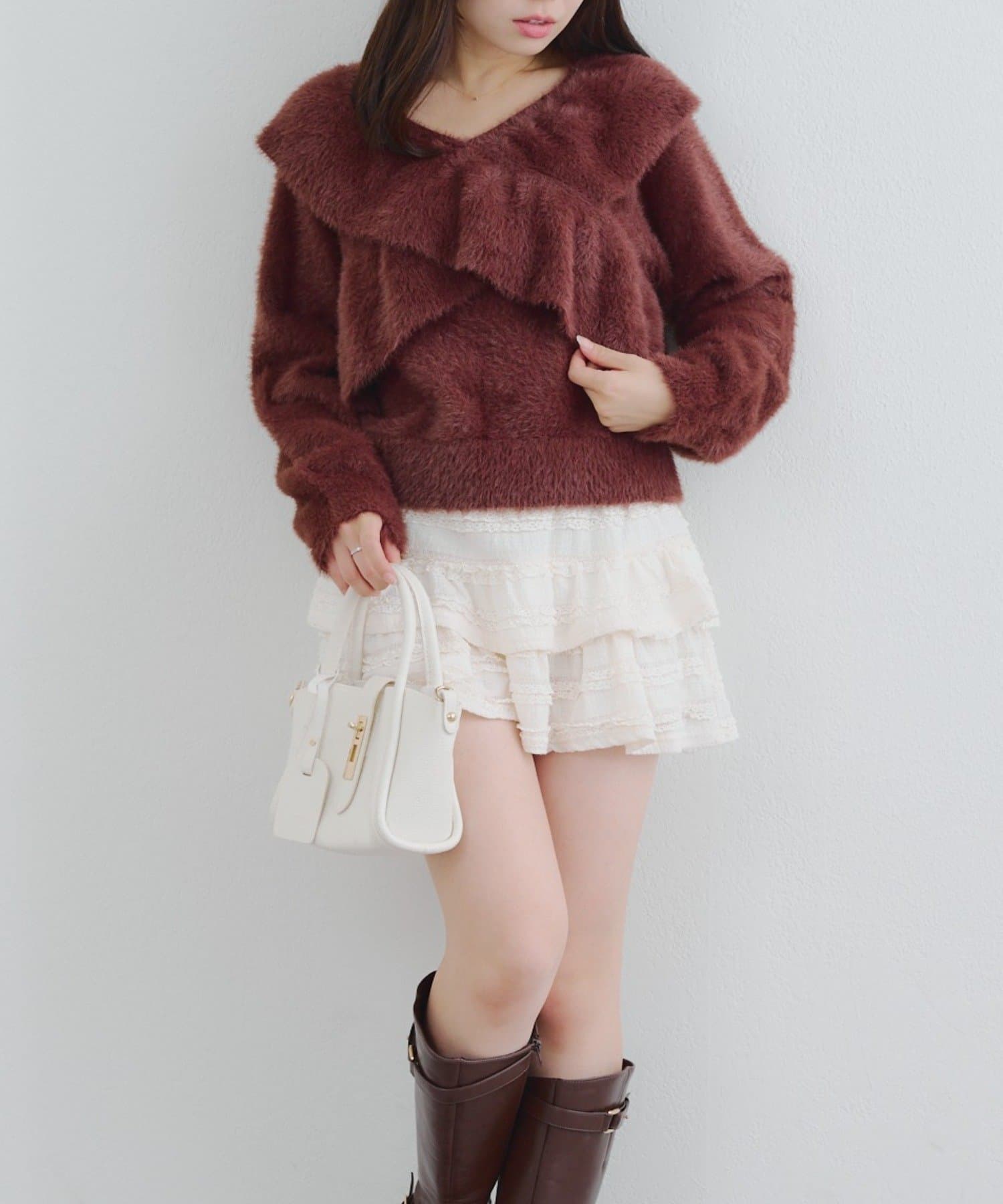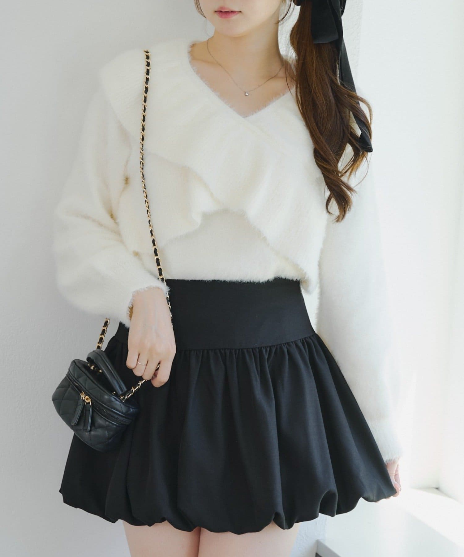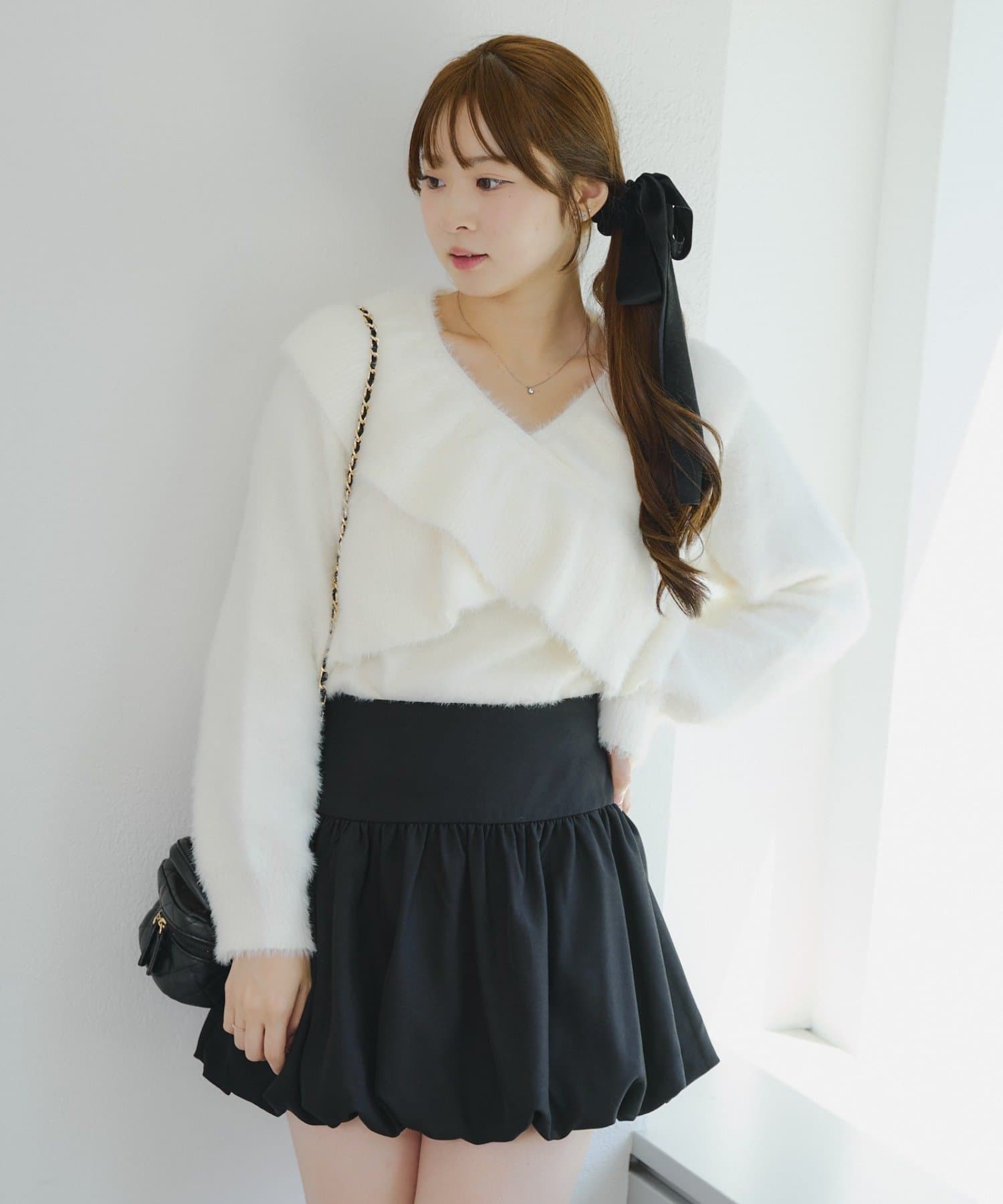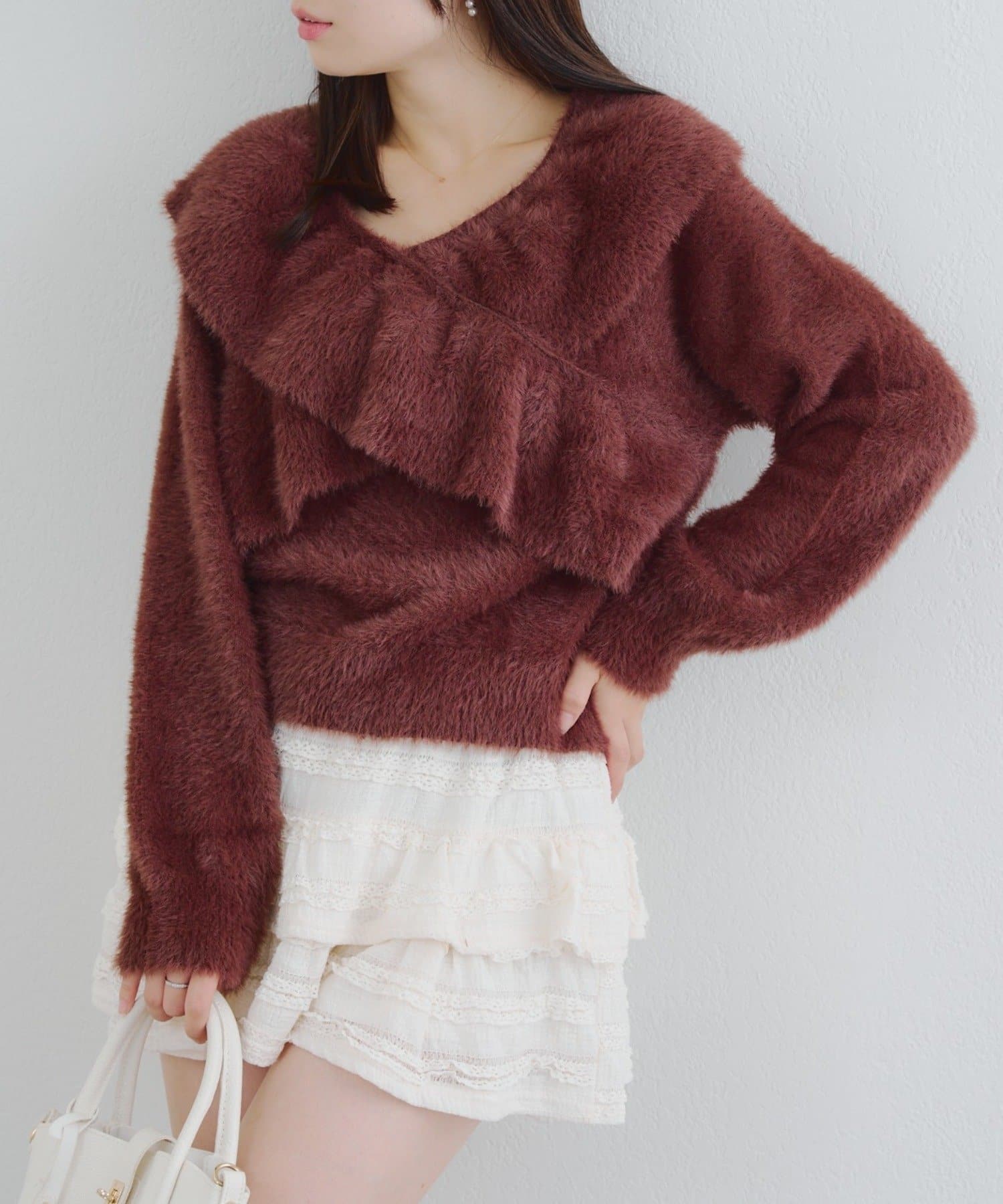 ・デコルテを美しく見せるVネックラインと、さりげないフリルデザインが、女性らしさを引き立てます