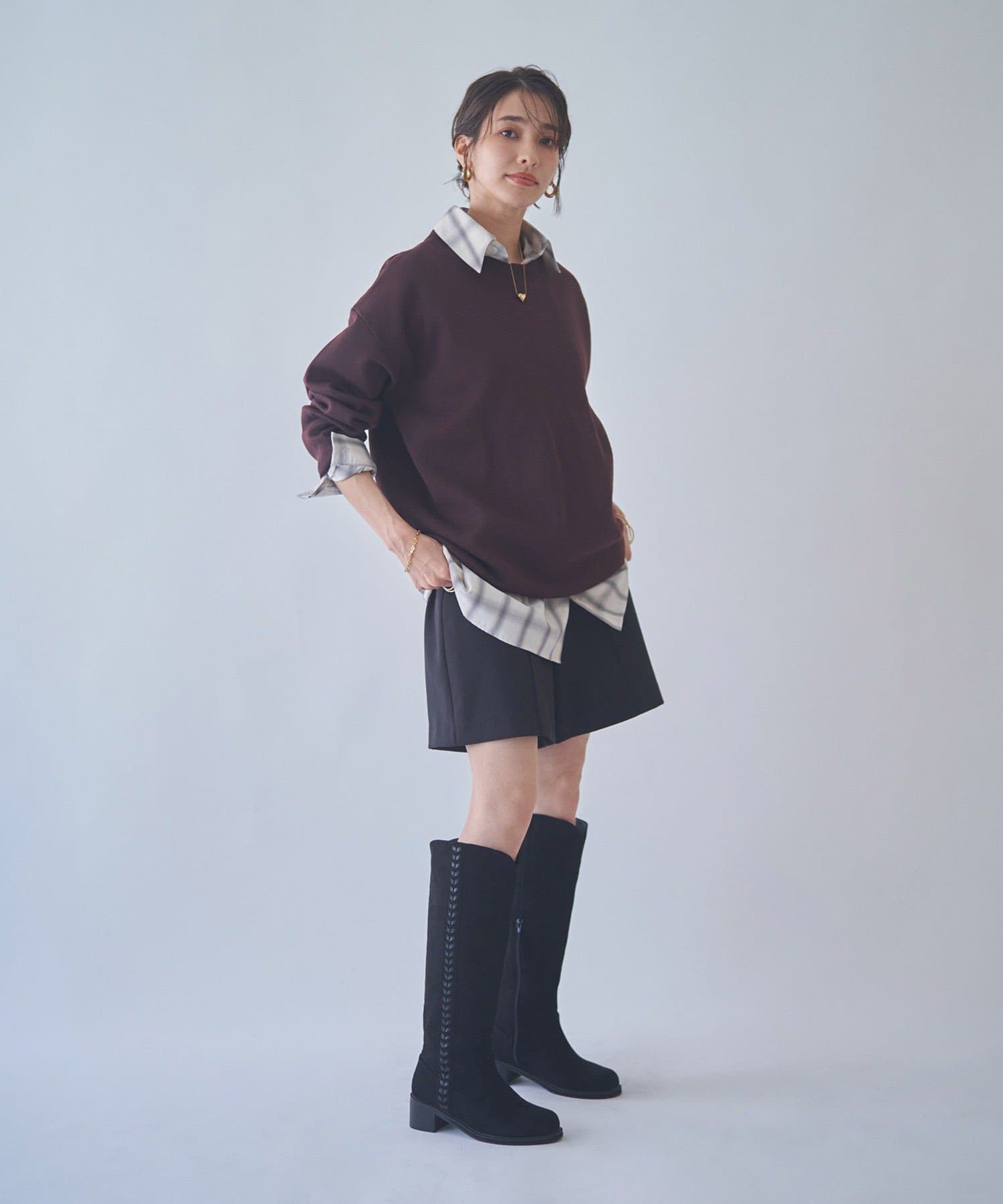 定番のミニボトムにロングブーツ合わせでトレンドライクな印象に◎