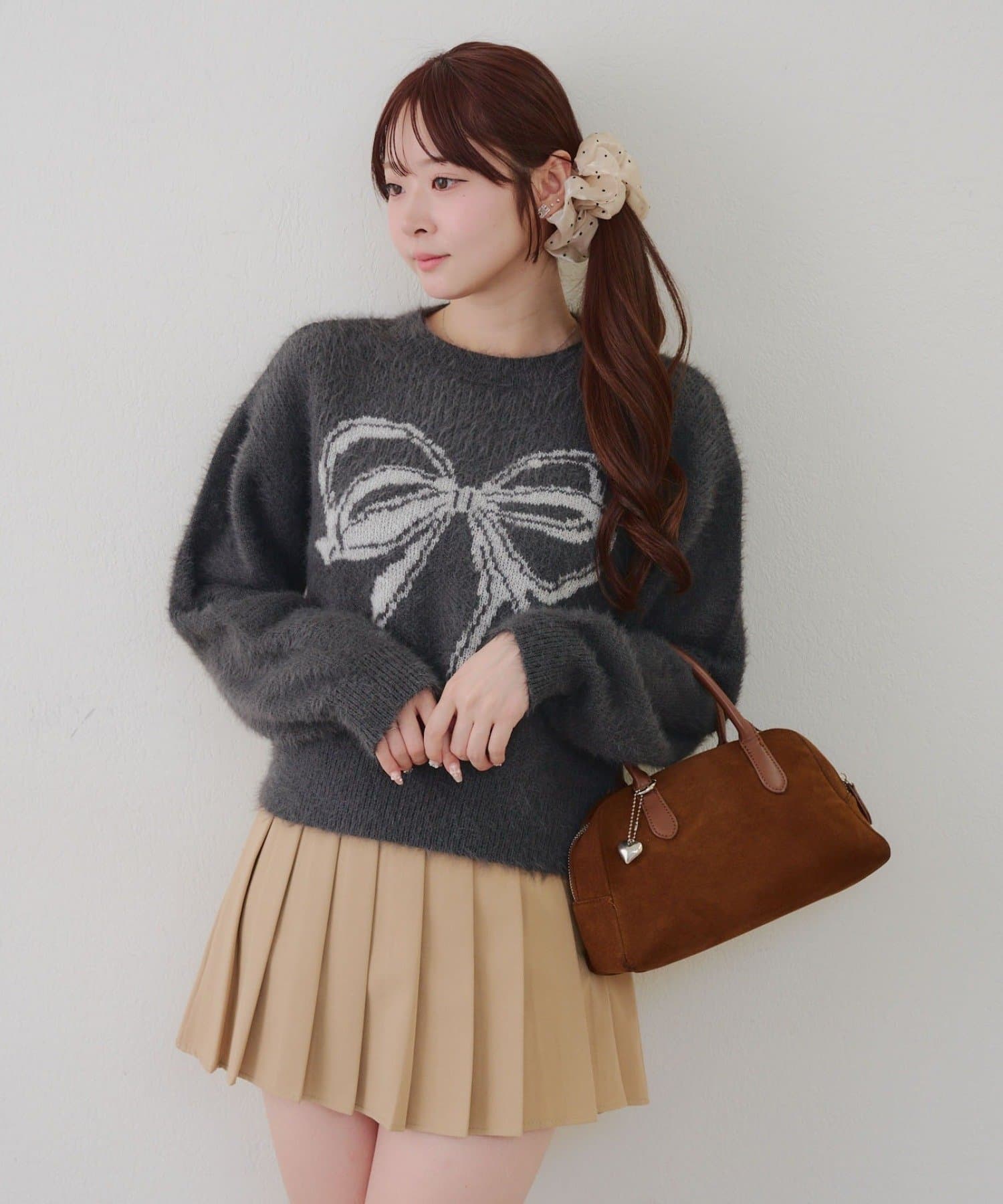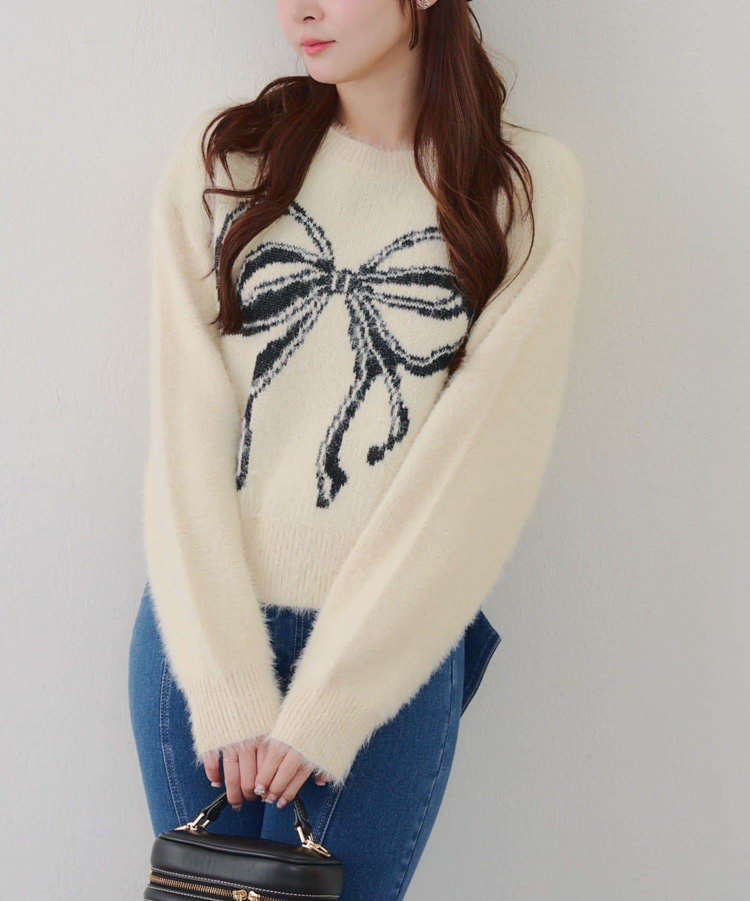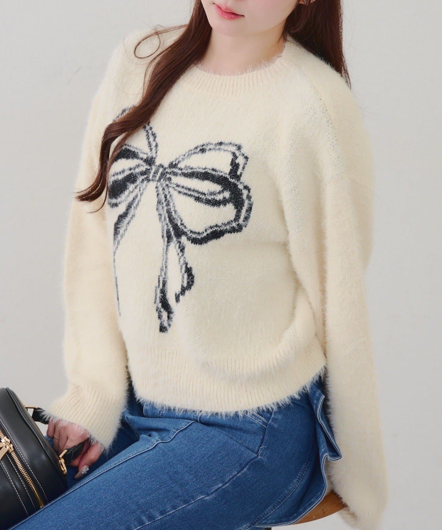 ・大きなリボン柄が存在感のあるデザインのシャギーニット