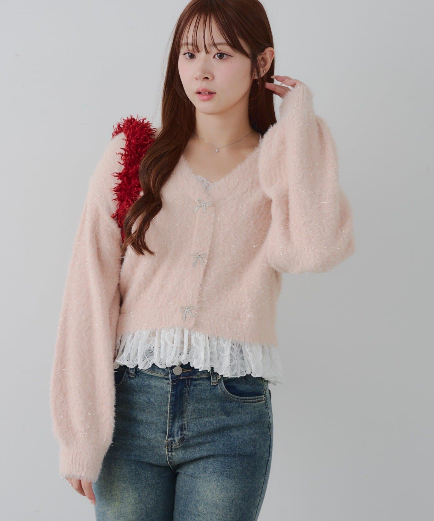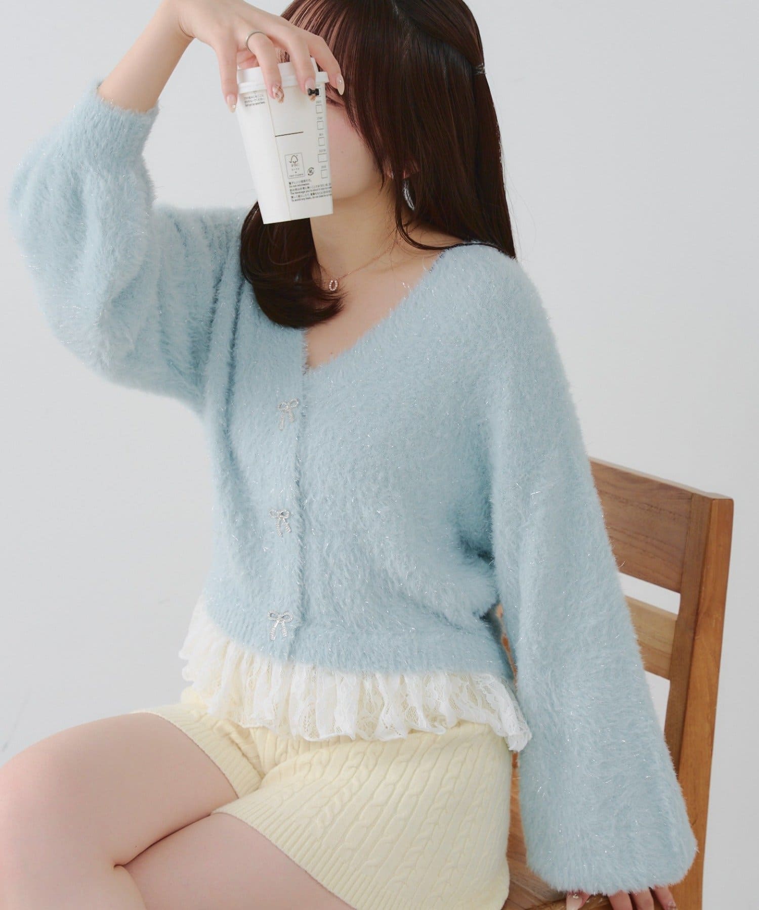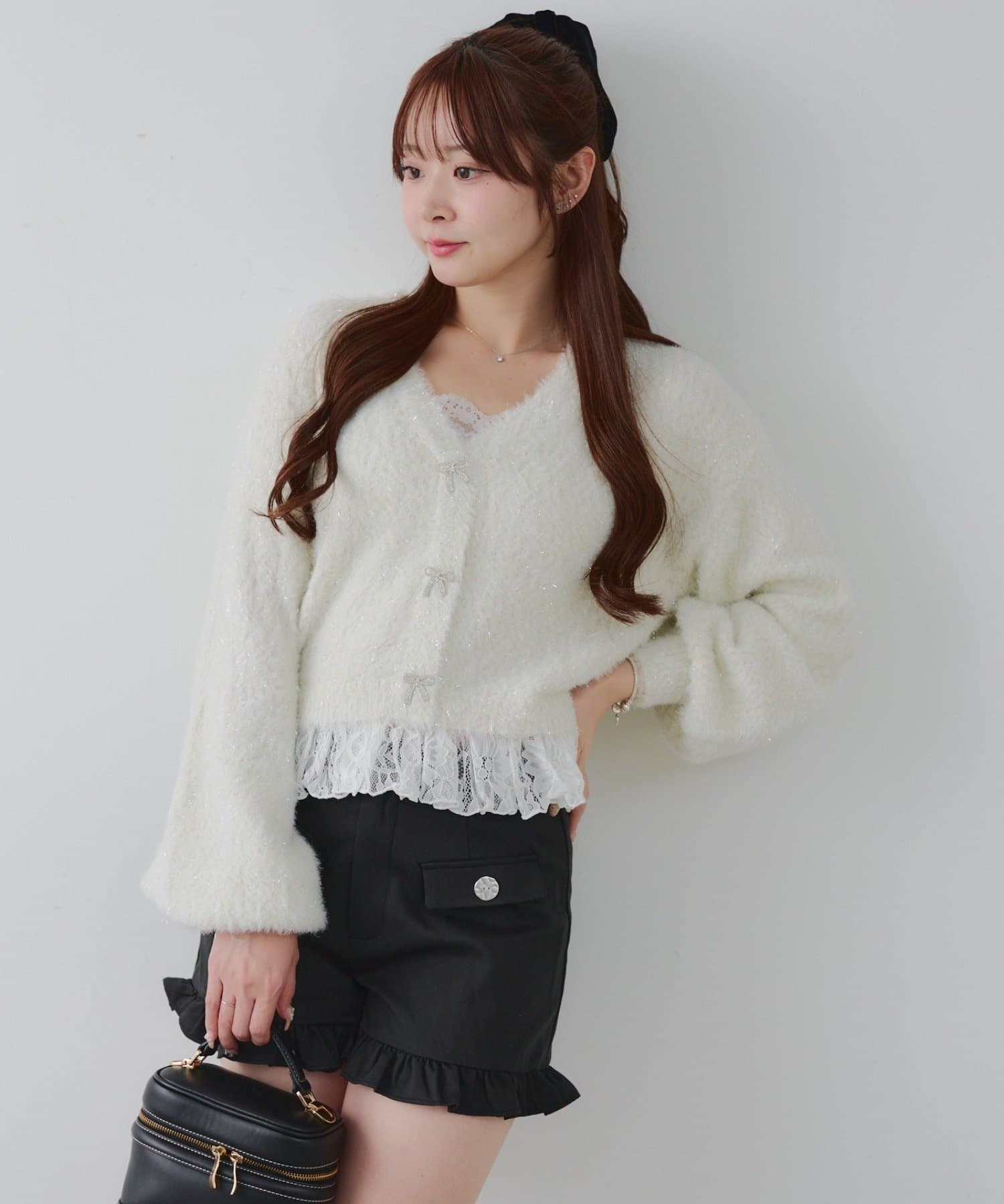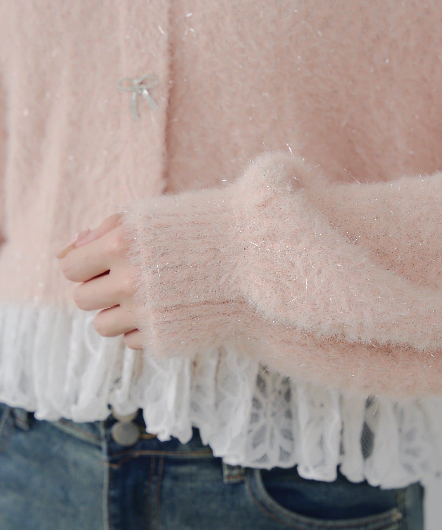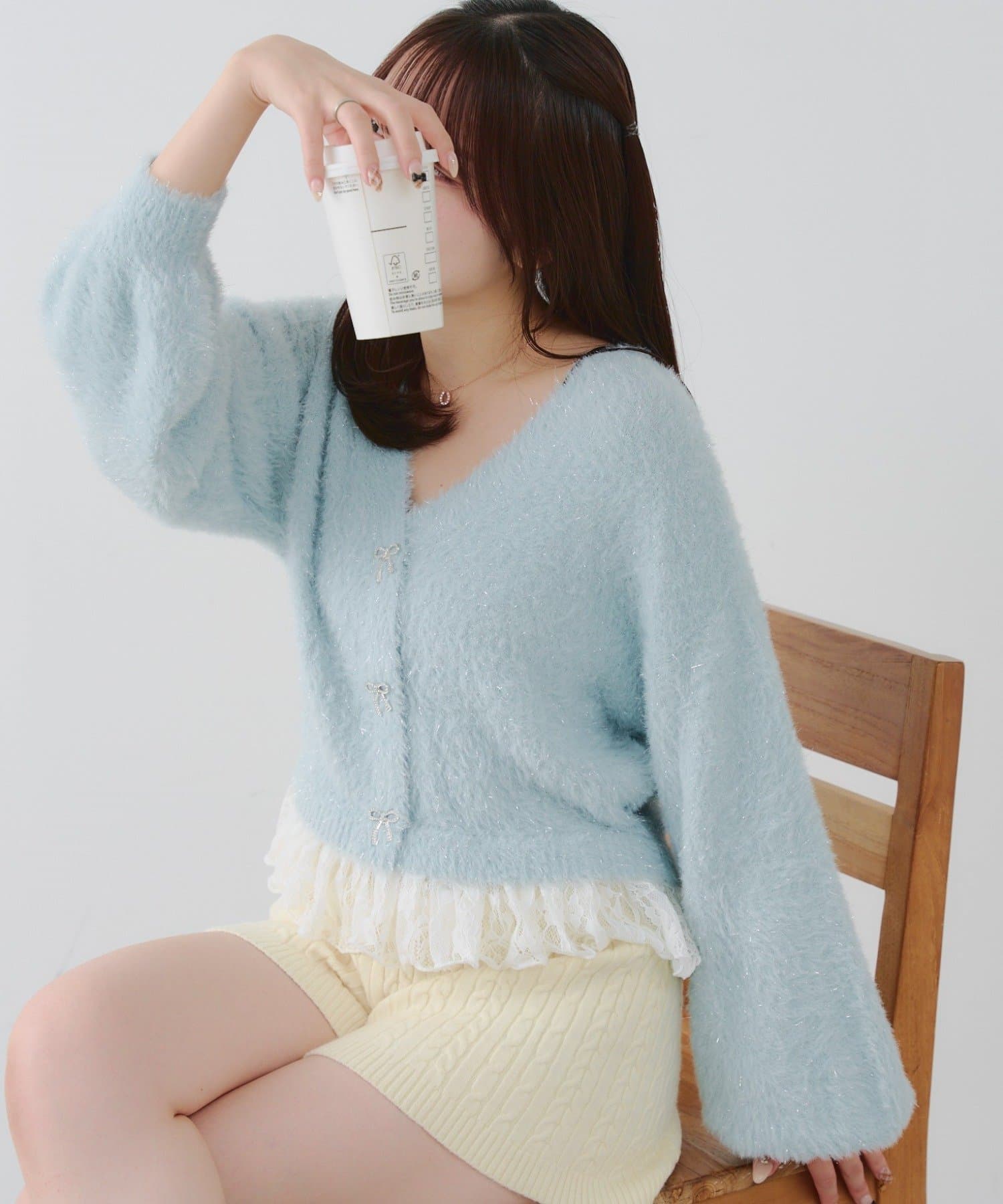 ラメフェザーヤーン裾レース付カーディガン