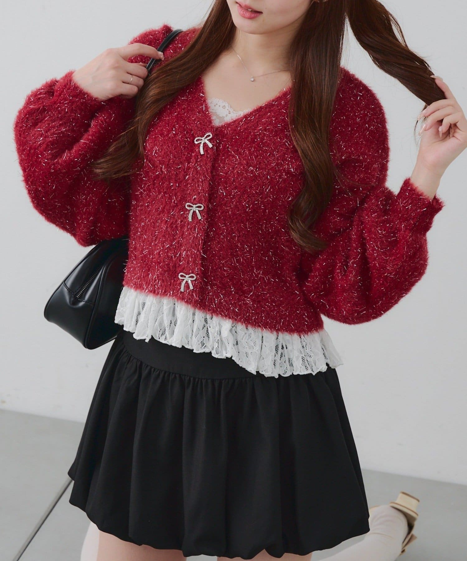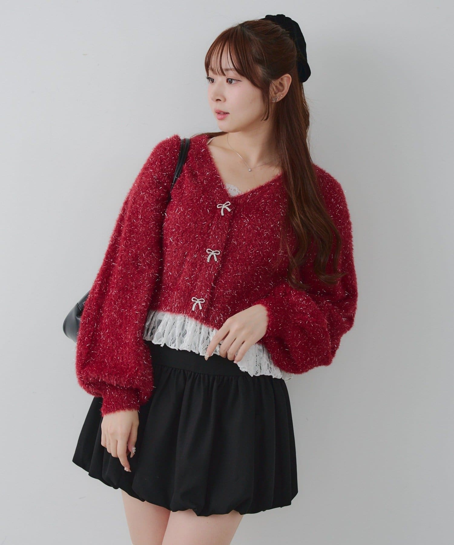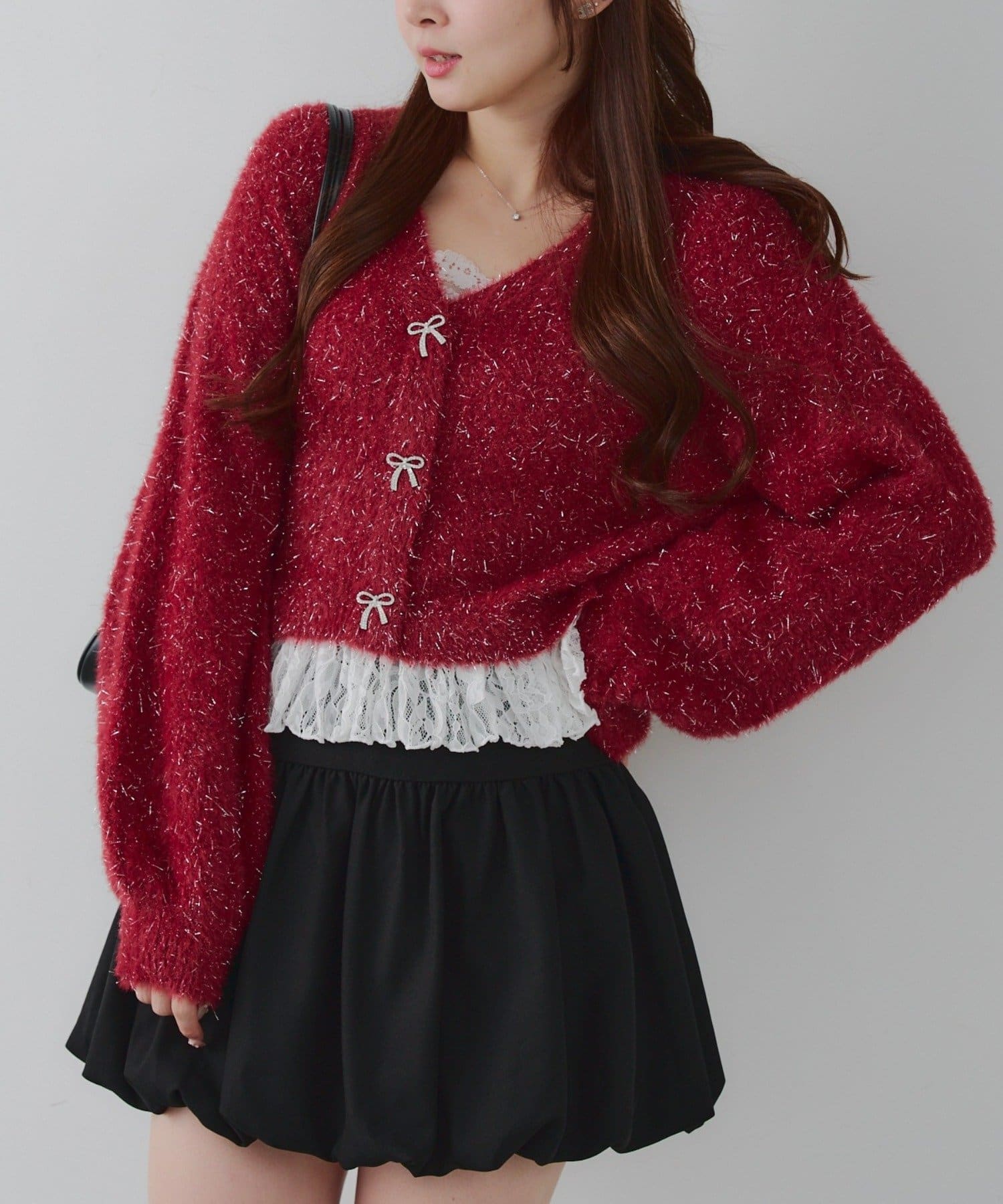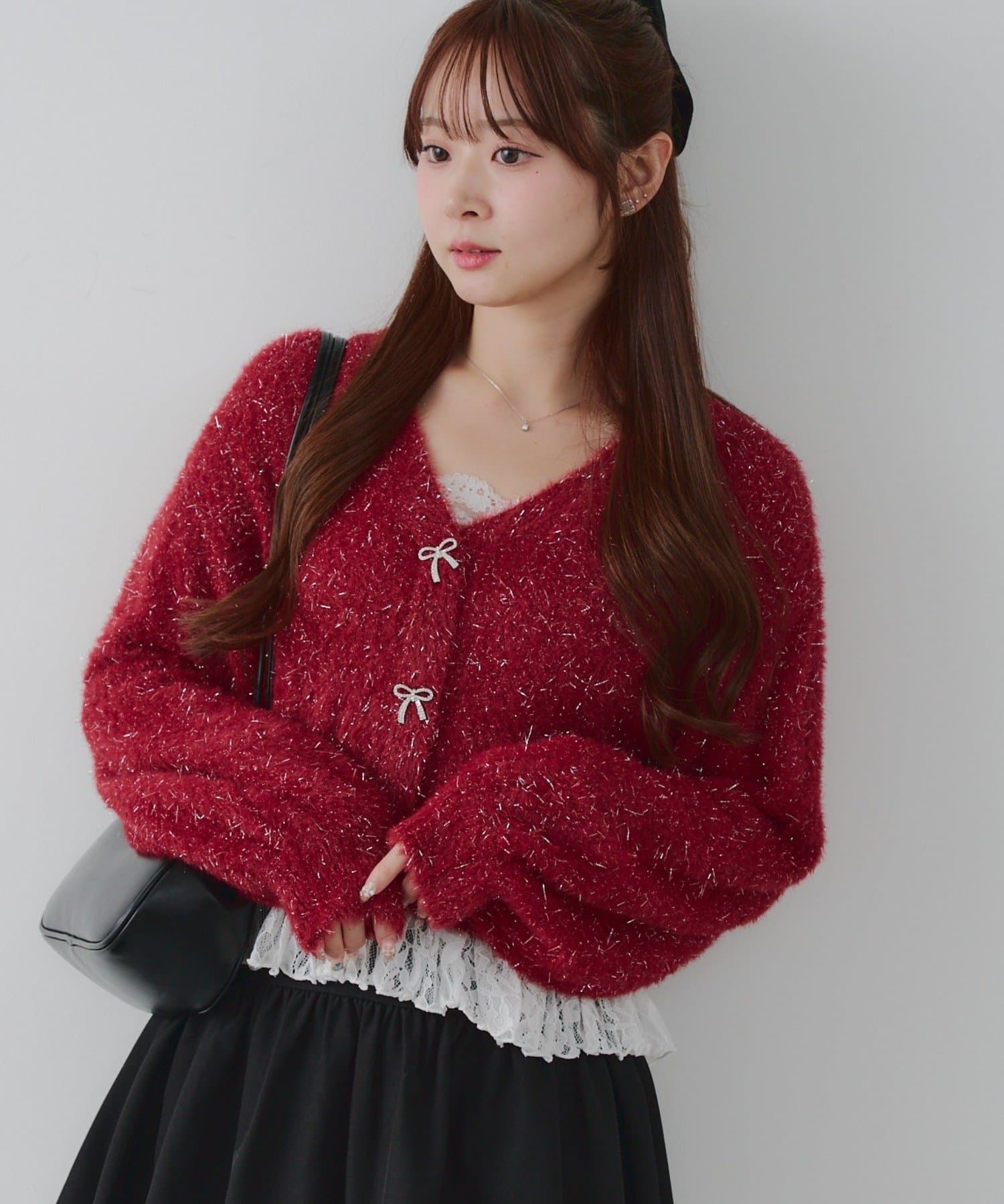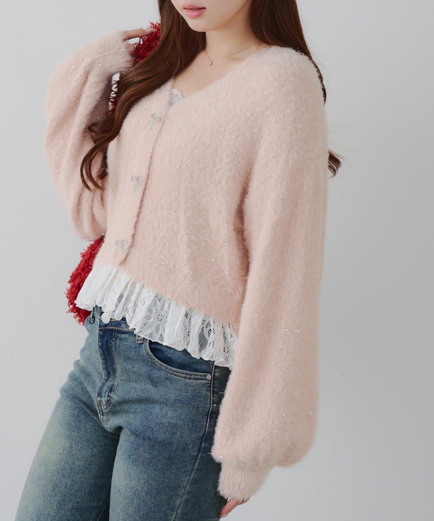 ・キラキラリボンモチーフ付き♪秋冬コーデをさらに可愛くしてくれるショート丈カーディガン