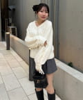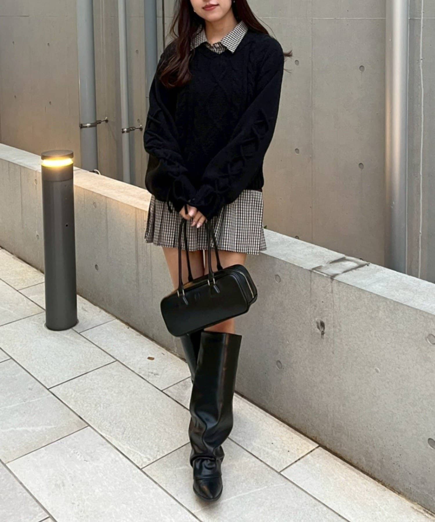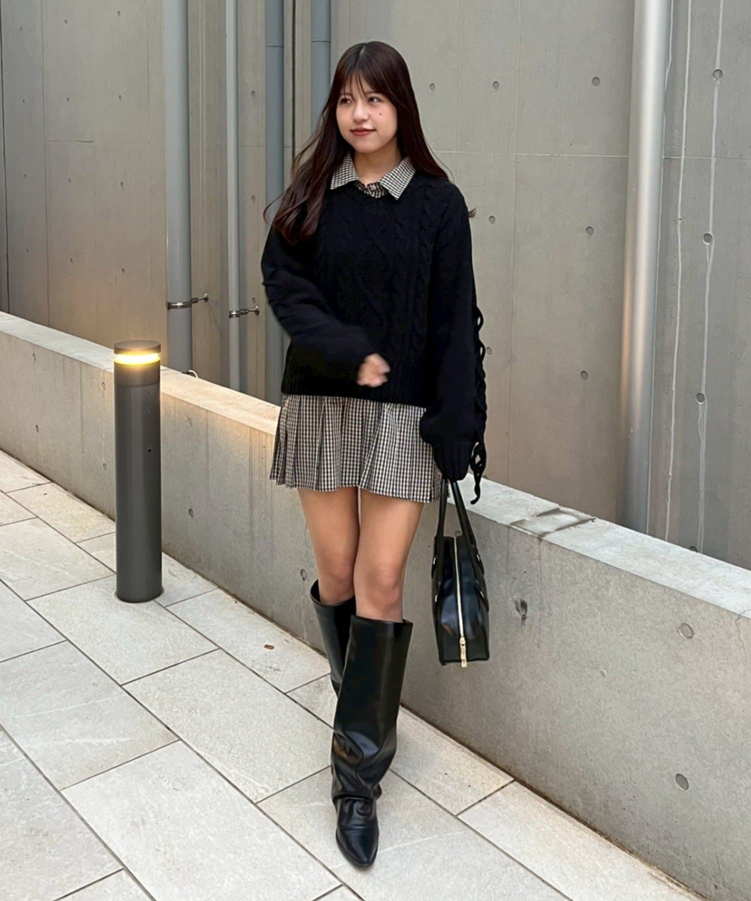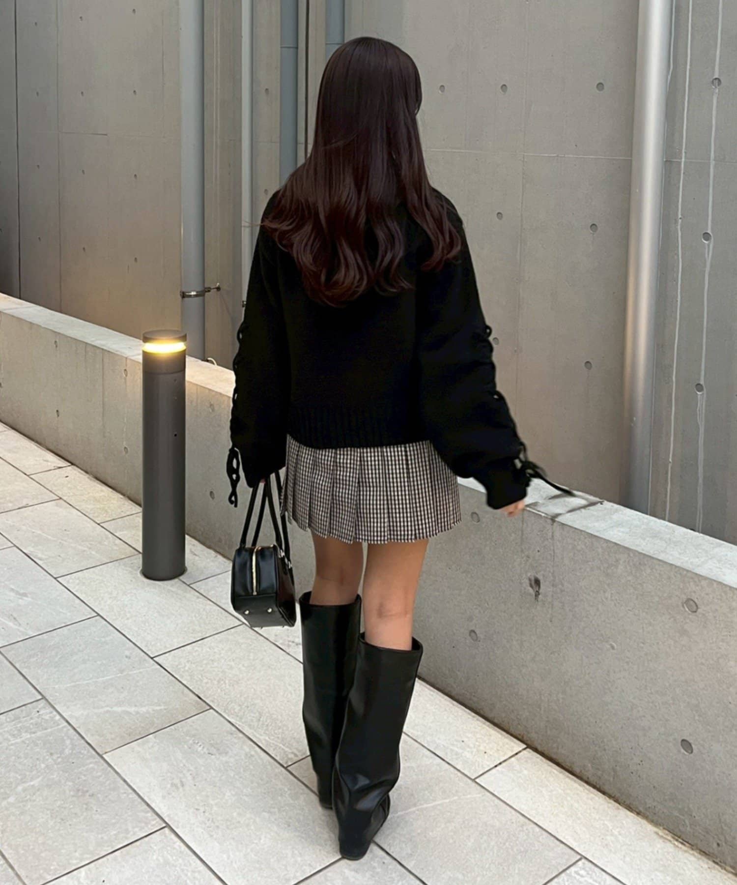 ・デコルテの肌見せが苦手な方は、インナーにハイネックのメロウトップスを選ぶのが◎