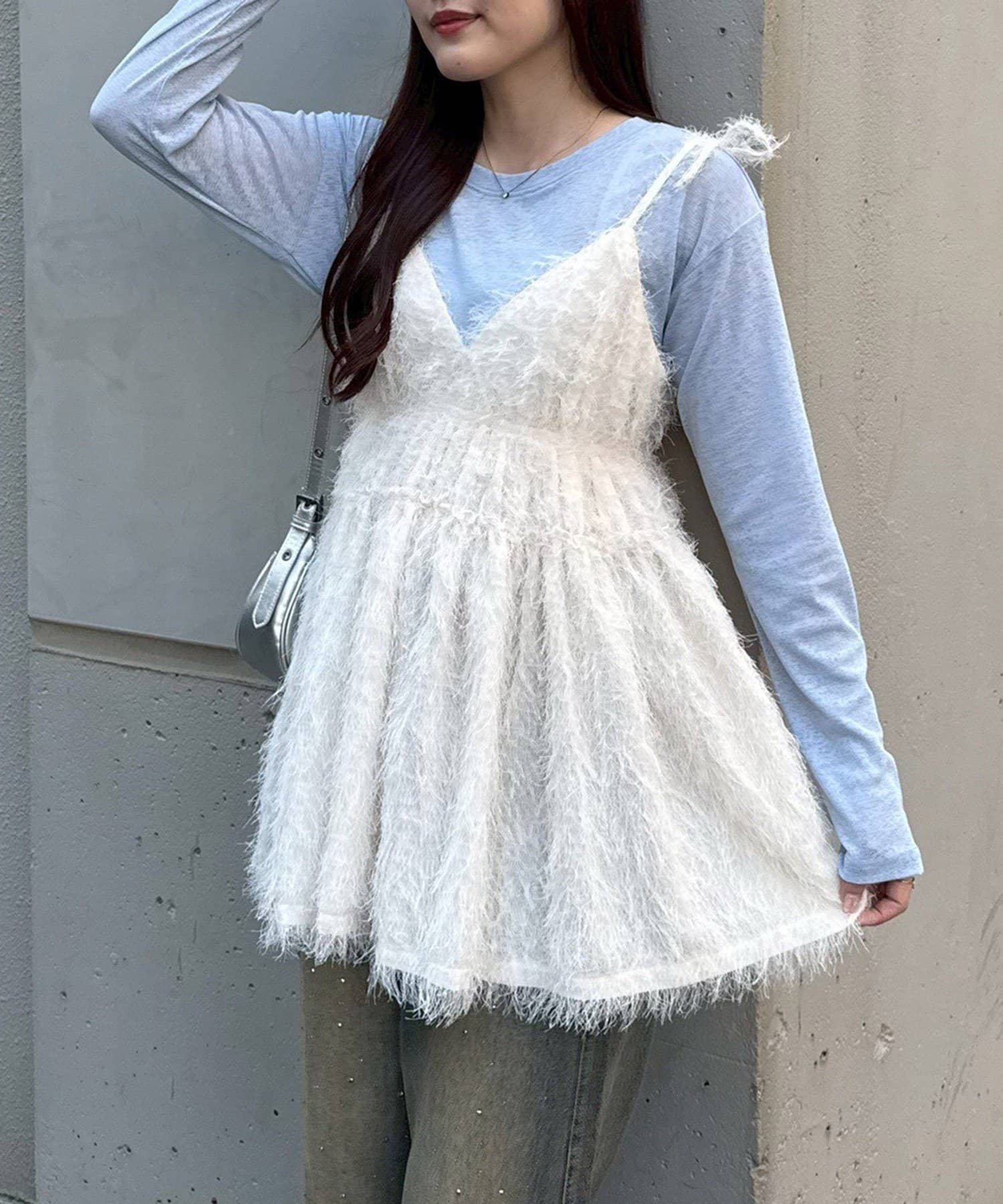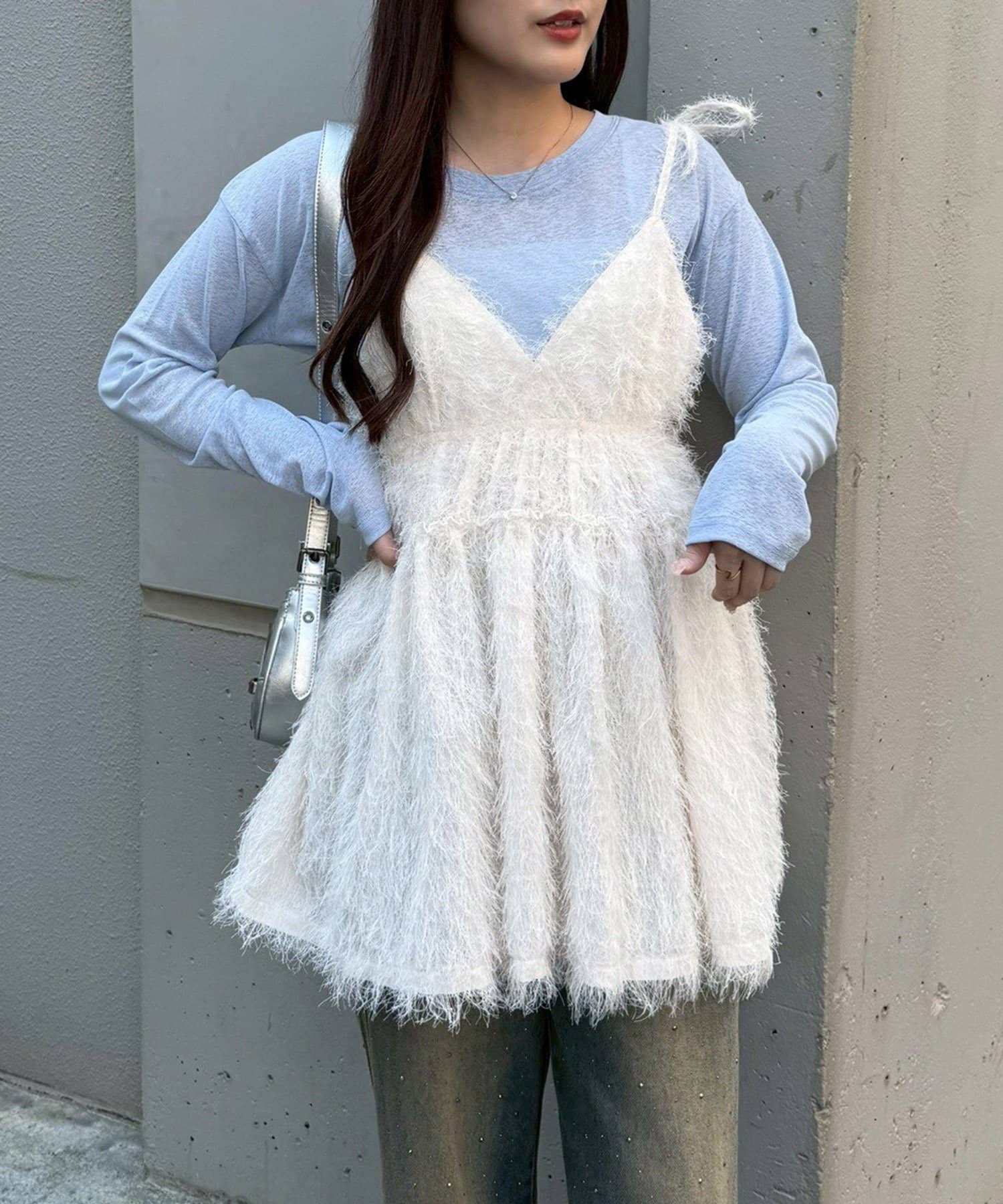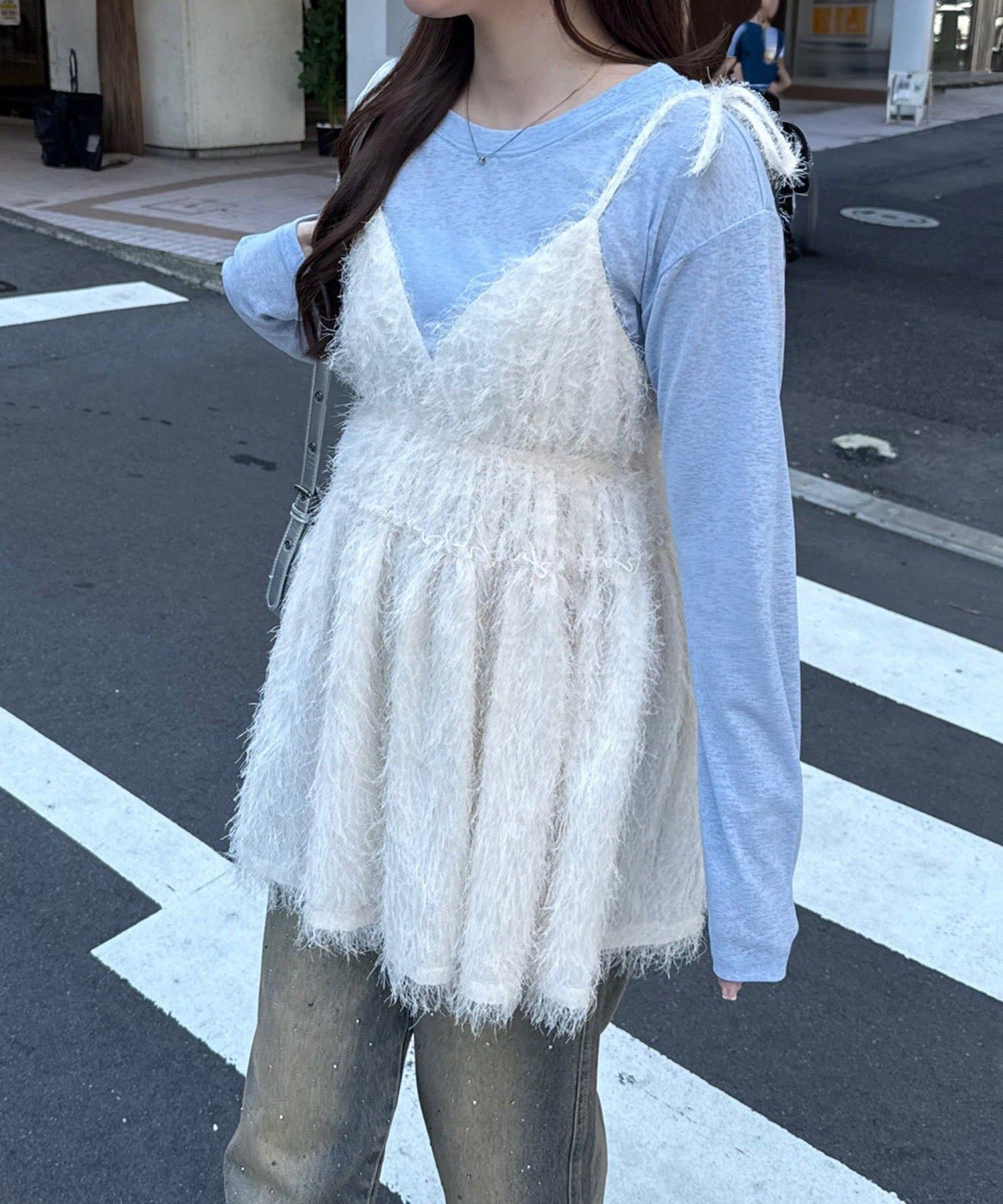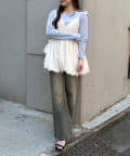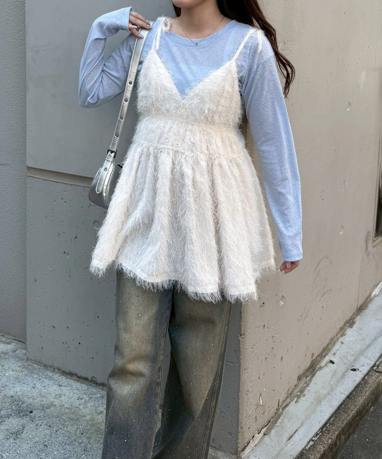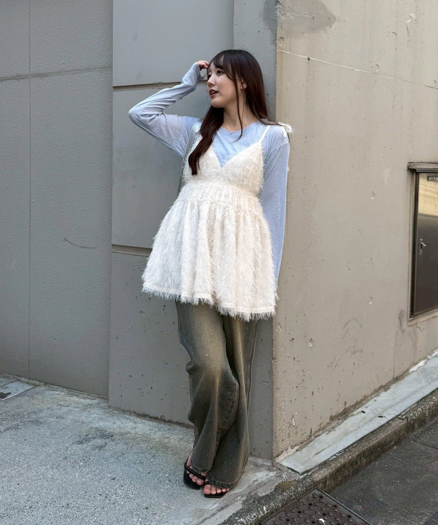 ・一枚で着てもオシャレ見えしますが、キャミビスチェのインナーとして着ると一気にトレンドライクな着こなしに!