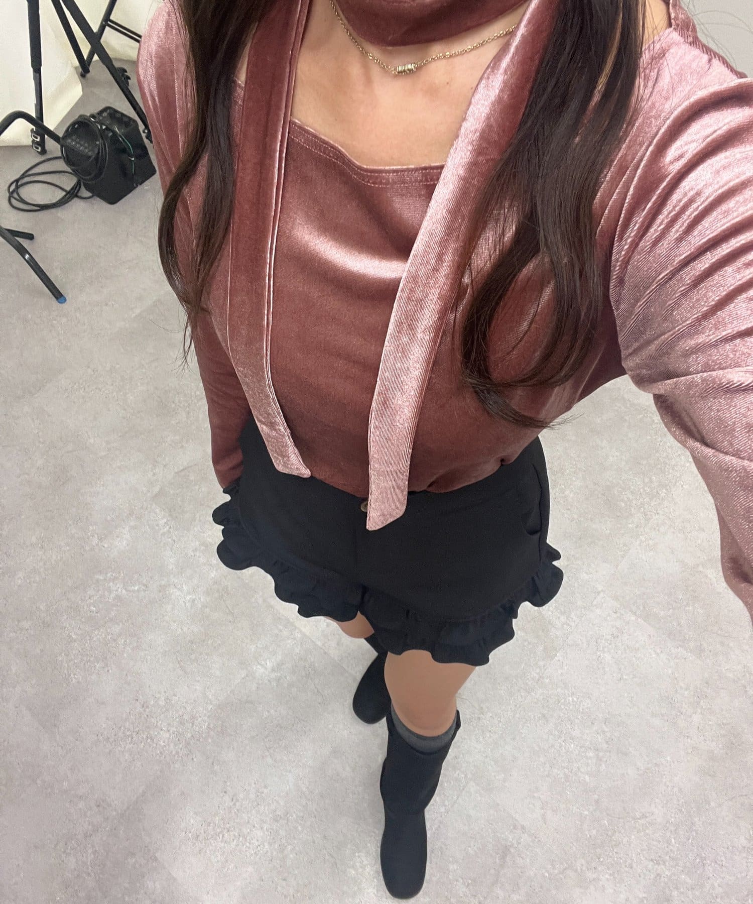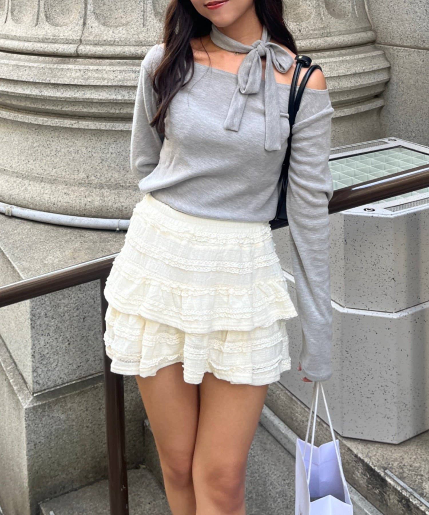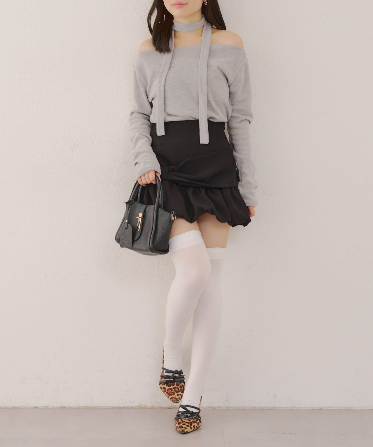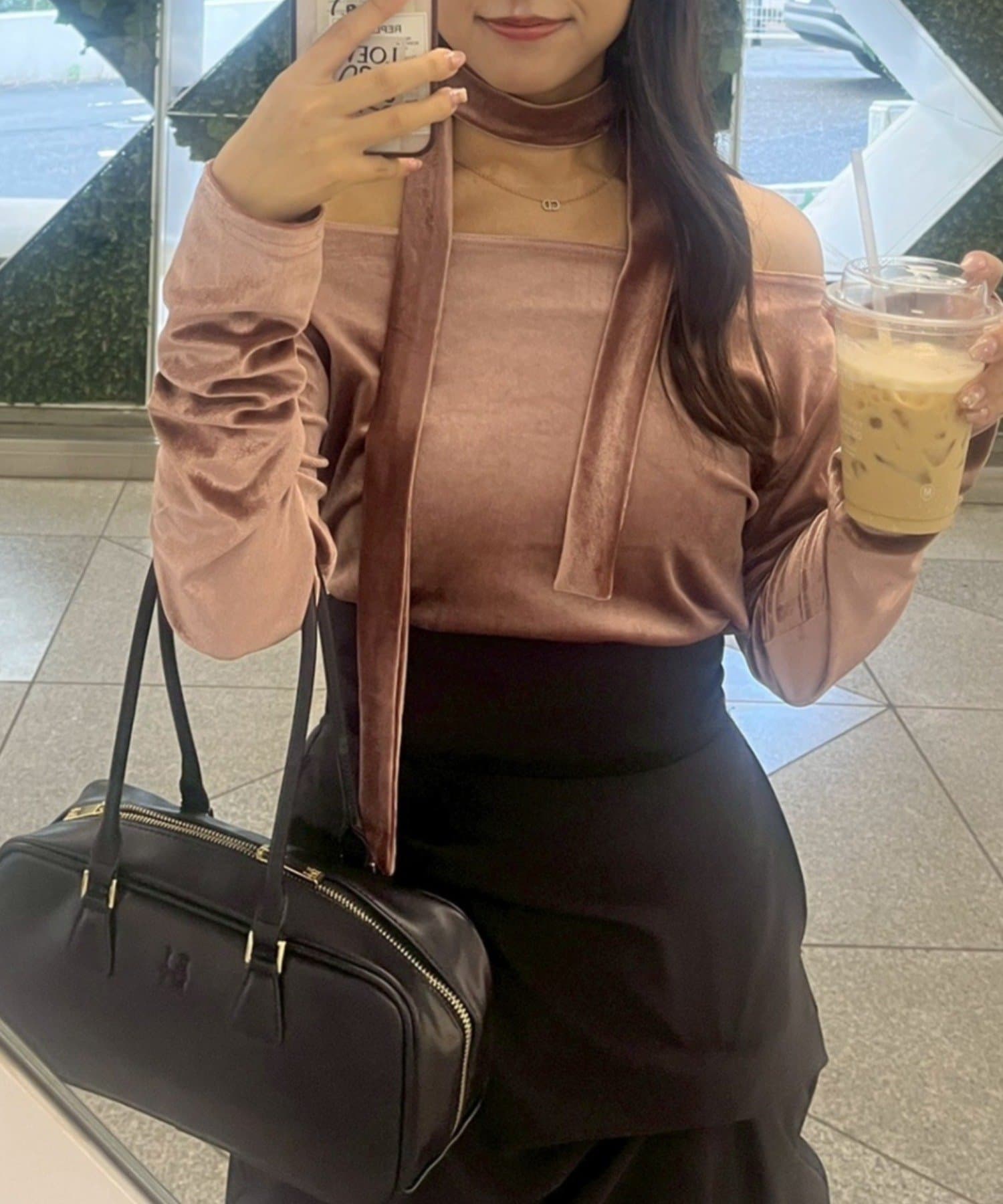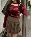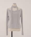 着用感:骨格ナチュラルのコンプレックスである首周りの骨感を綺麗にカバーしてくれます!サラッと落ち着いたシルエットだけどチョーカー付きでデザイン性のあるトップスです!