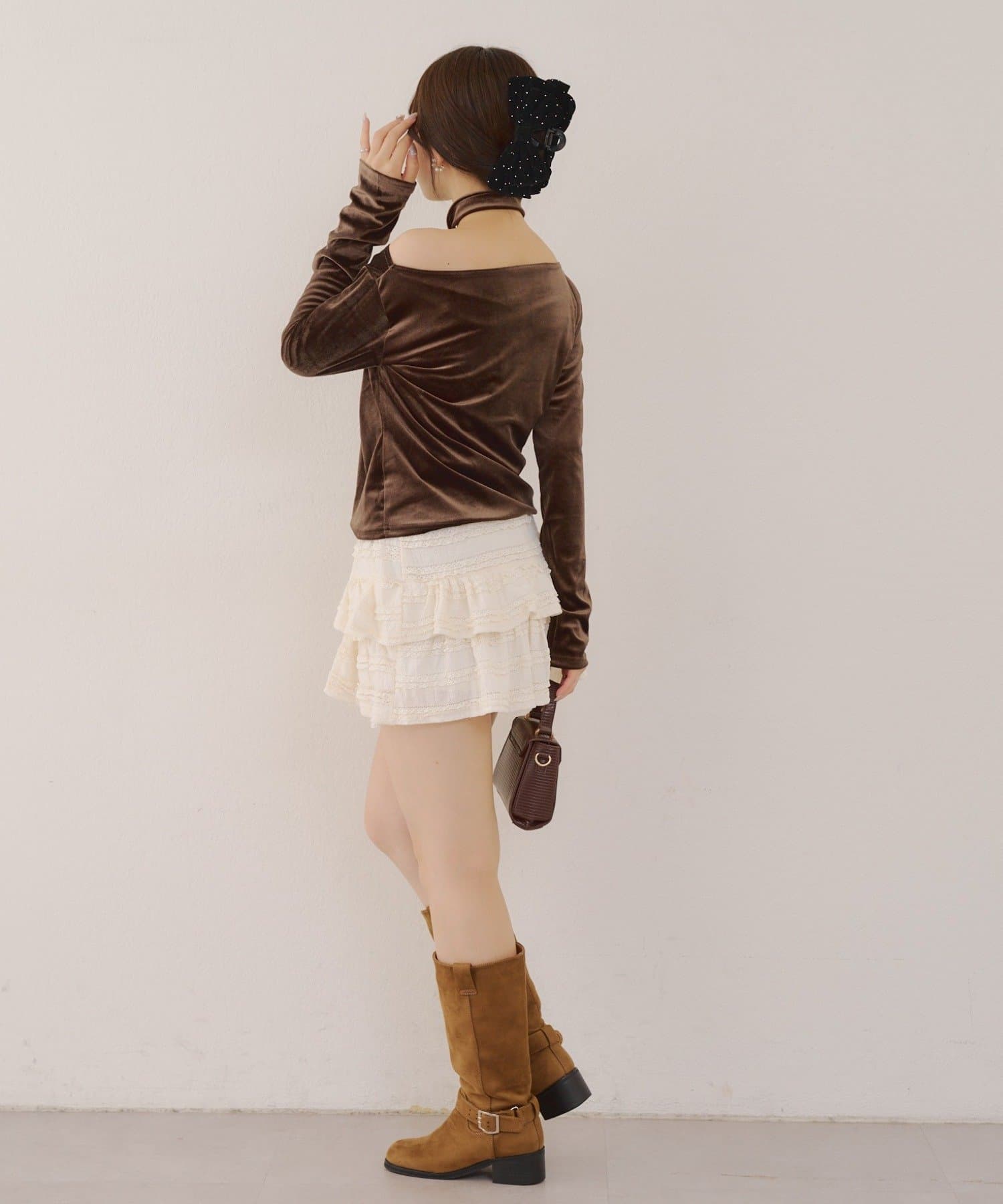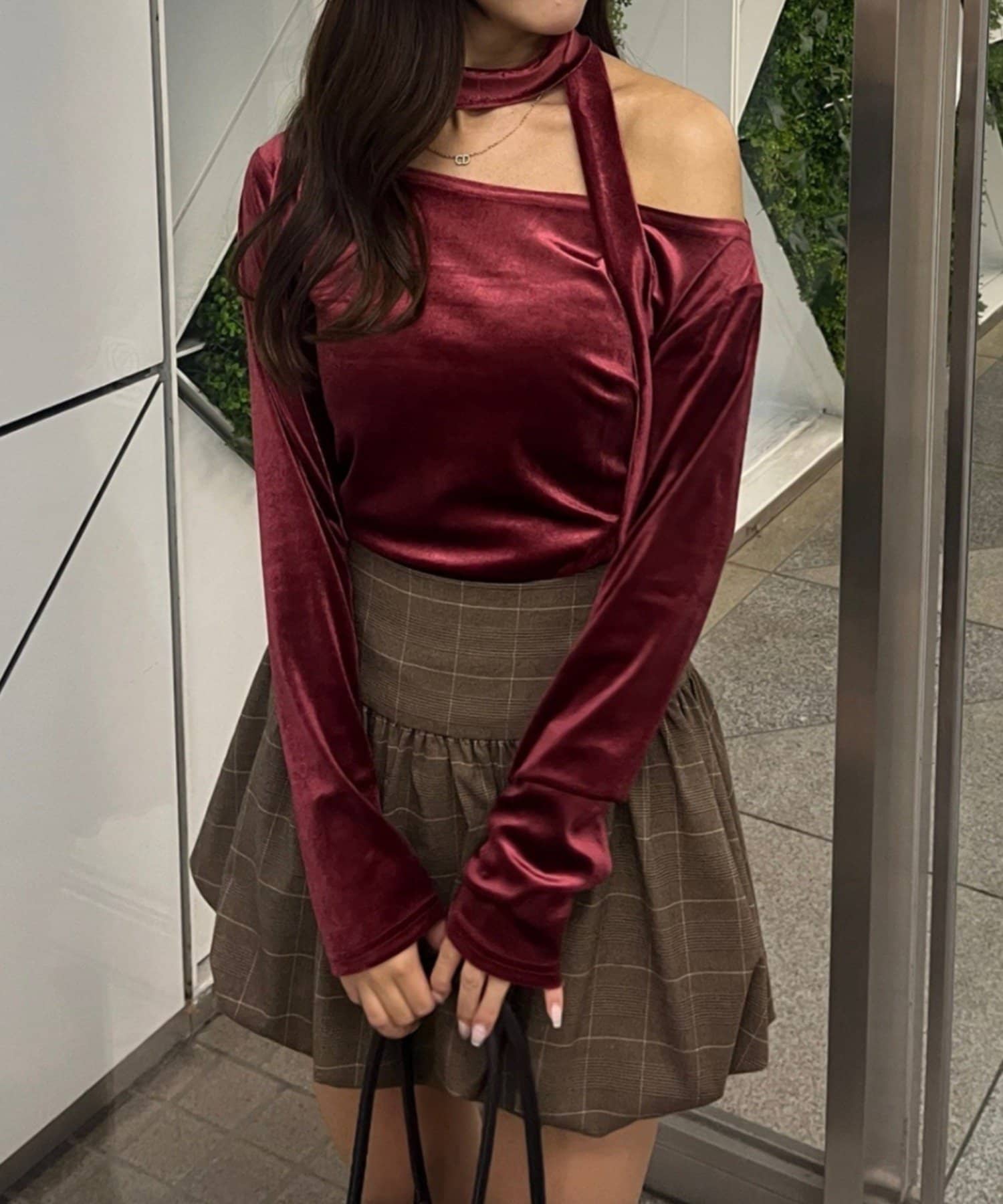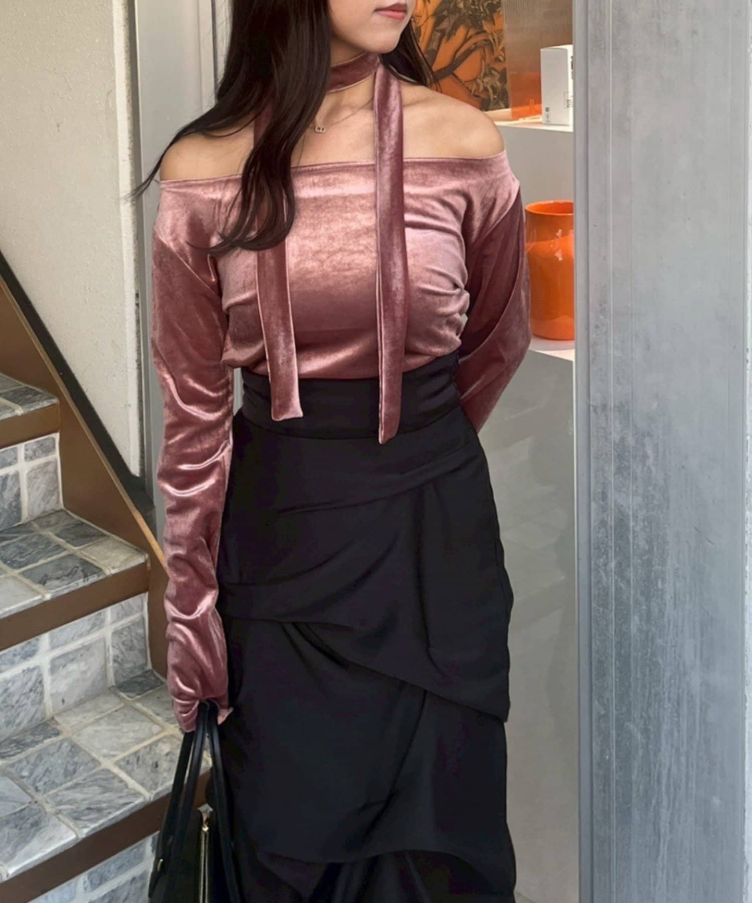 【ゆず@reve.perle_セレクト】ベロア&ニットソーの2素材!オフショルトップス【新色追加!】