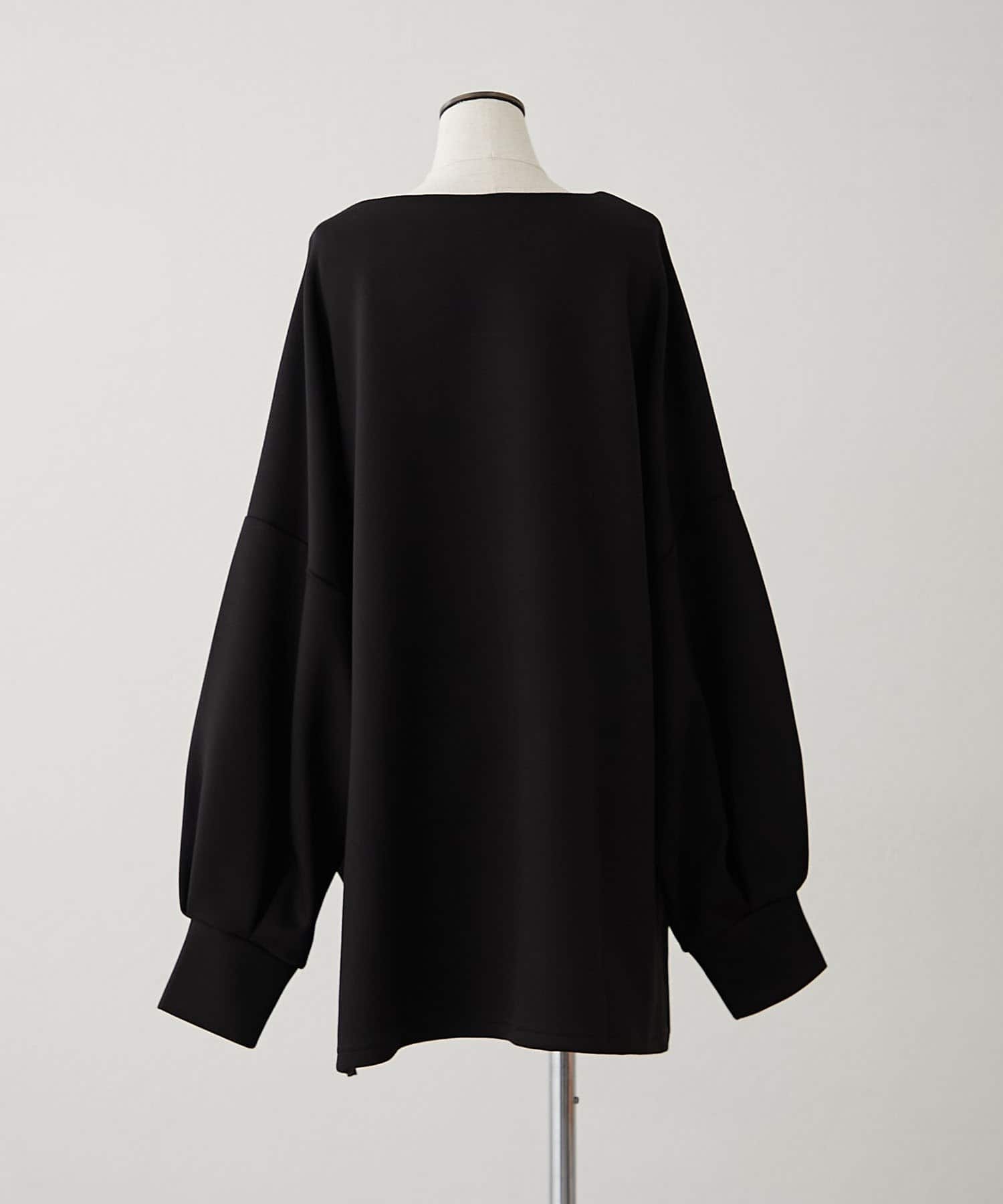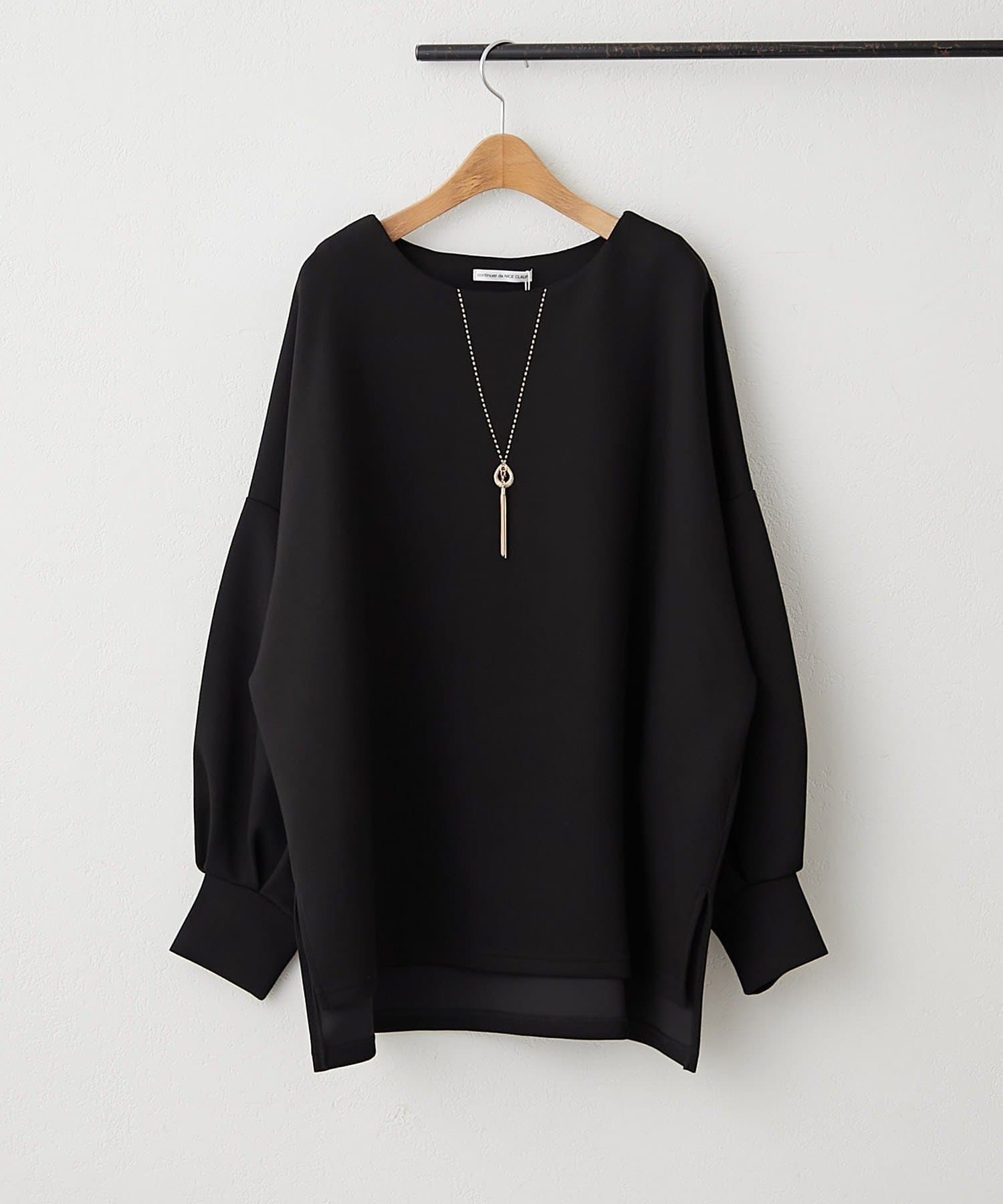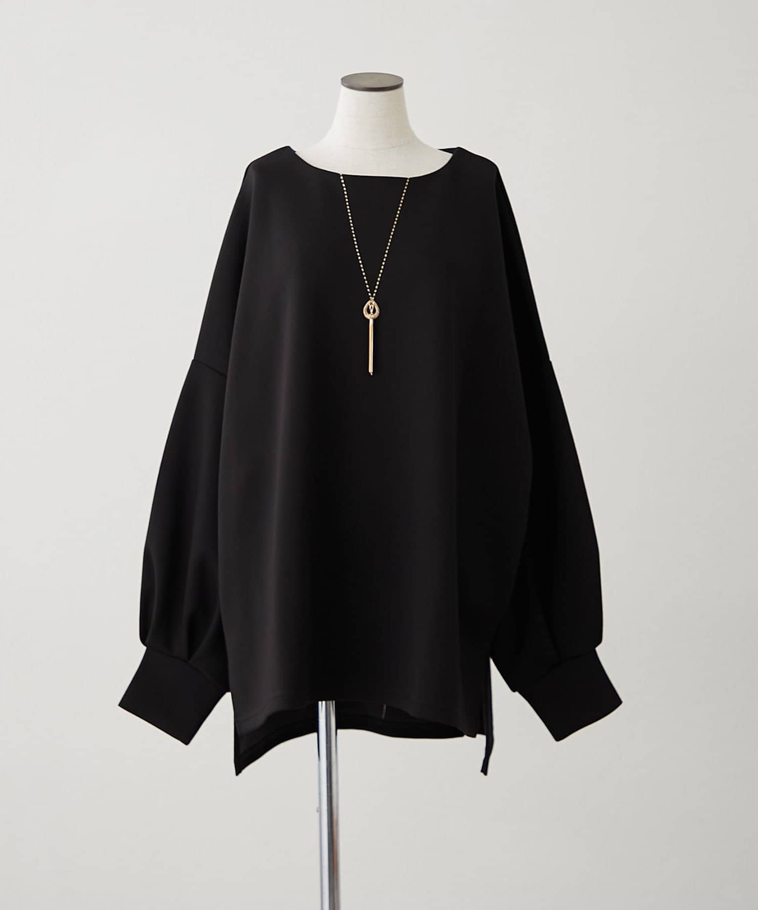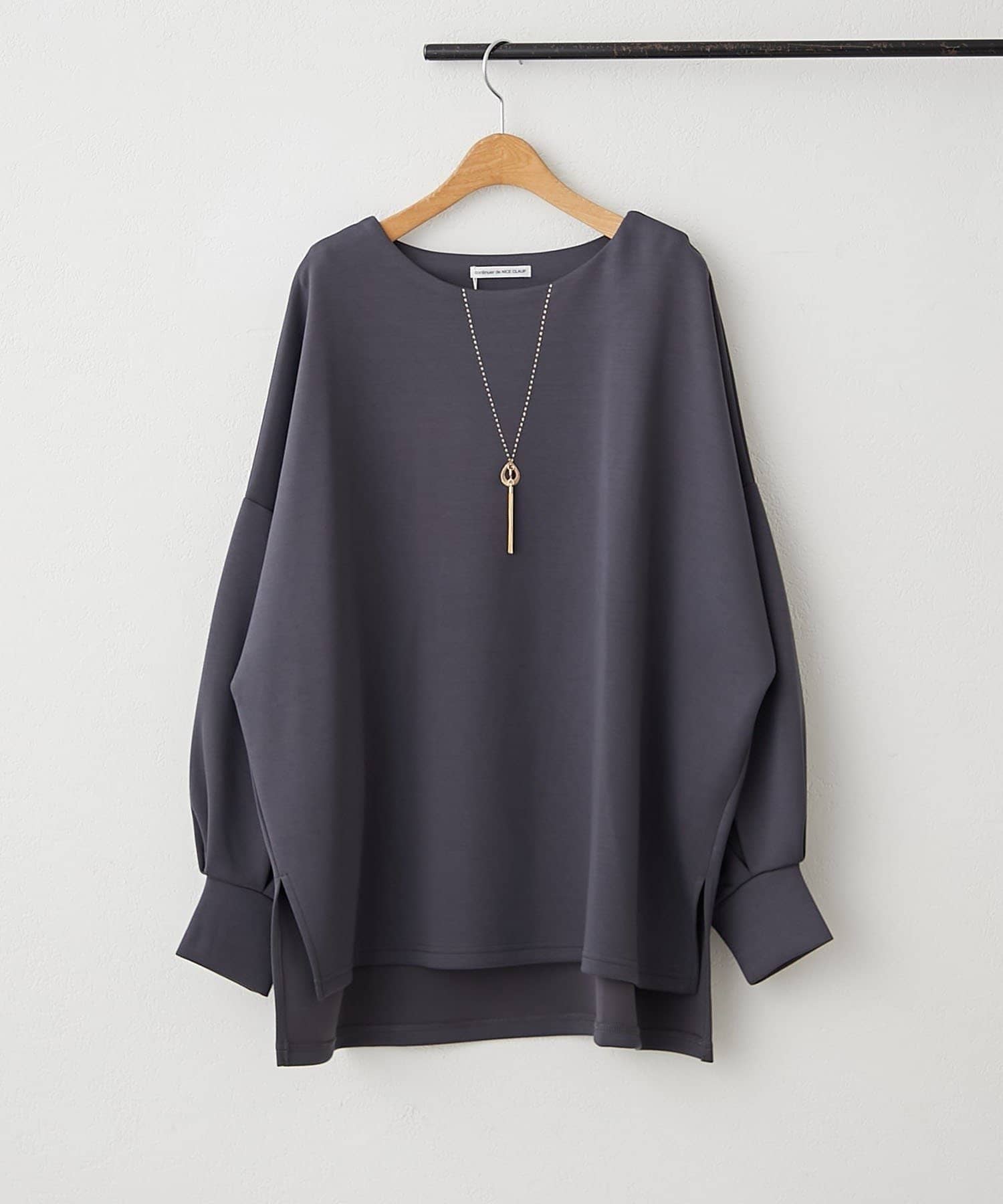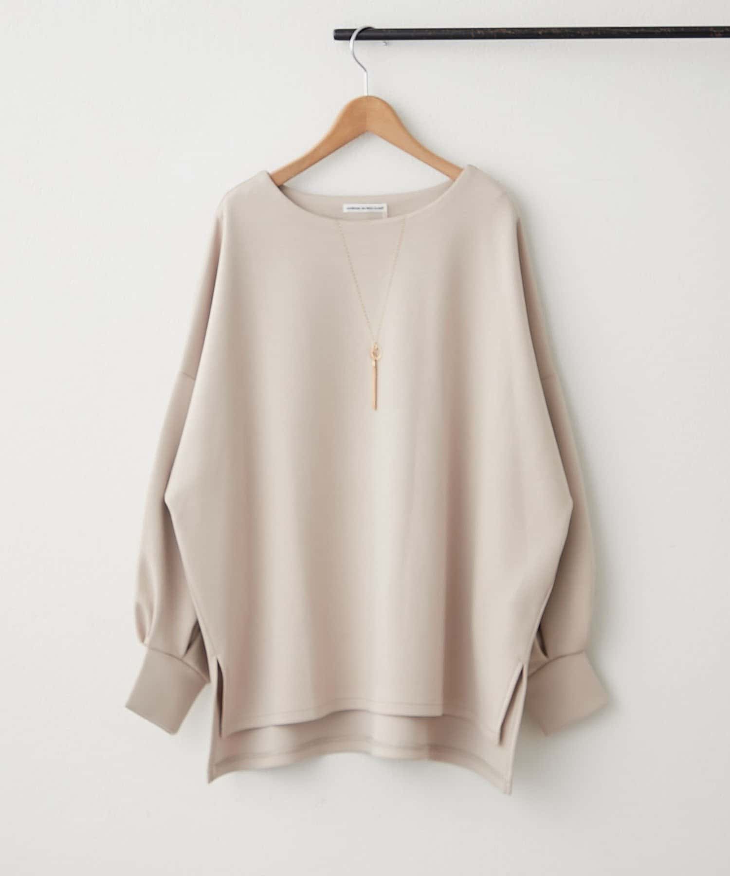 ・首元を美しく見せるボートネックと、さりげないスリットがポイント