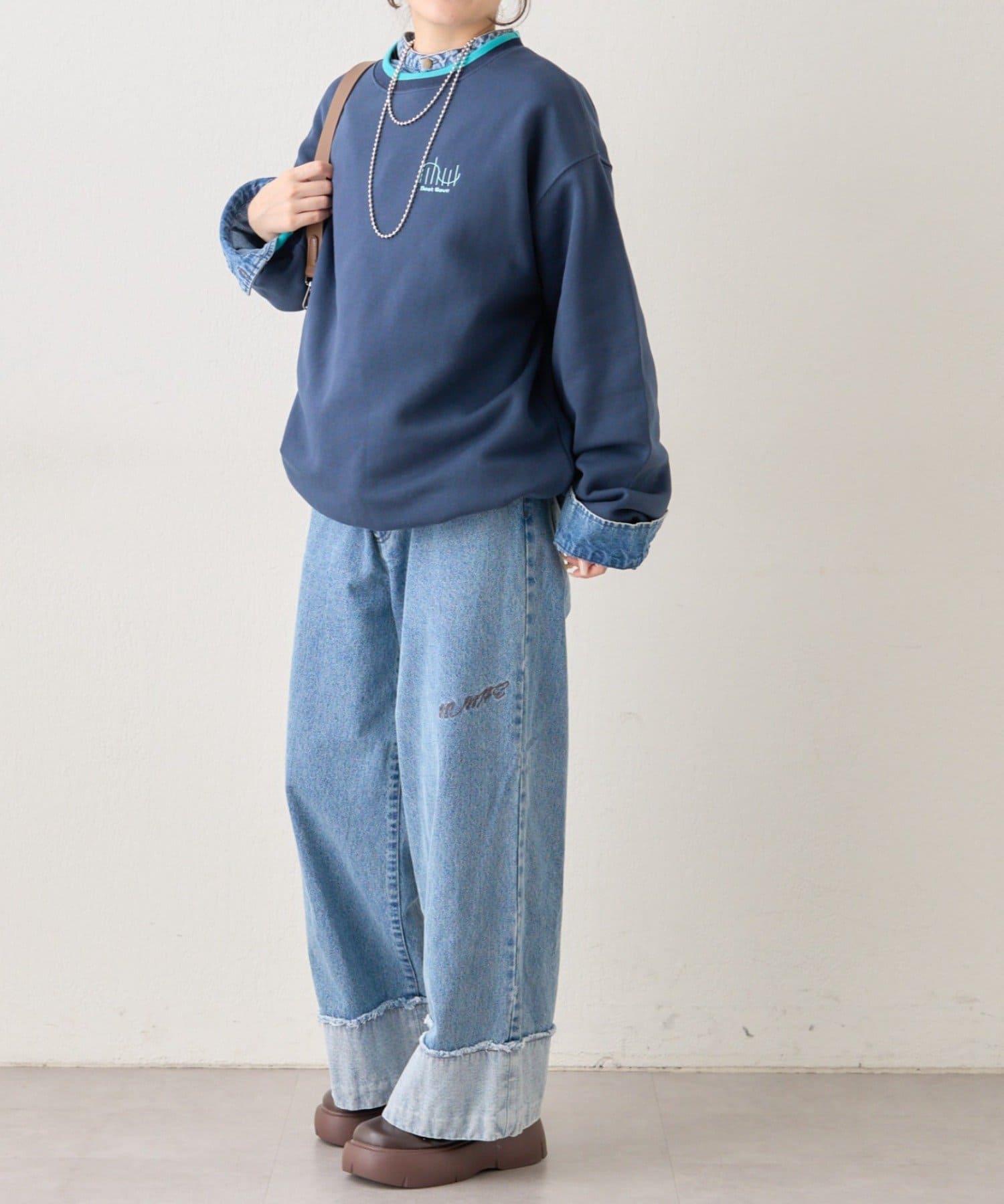 【NUNIFE】ラインリブ胸刺繍スウェット【裏起毛】