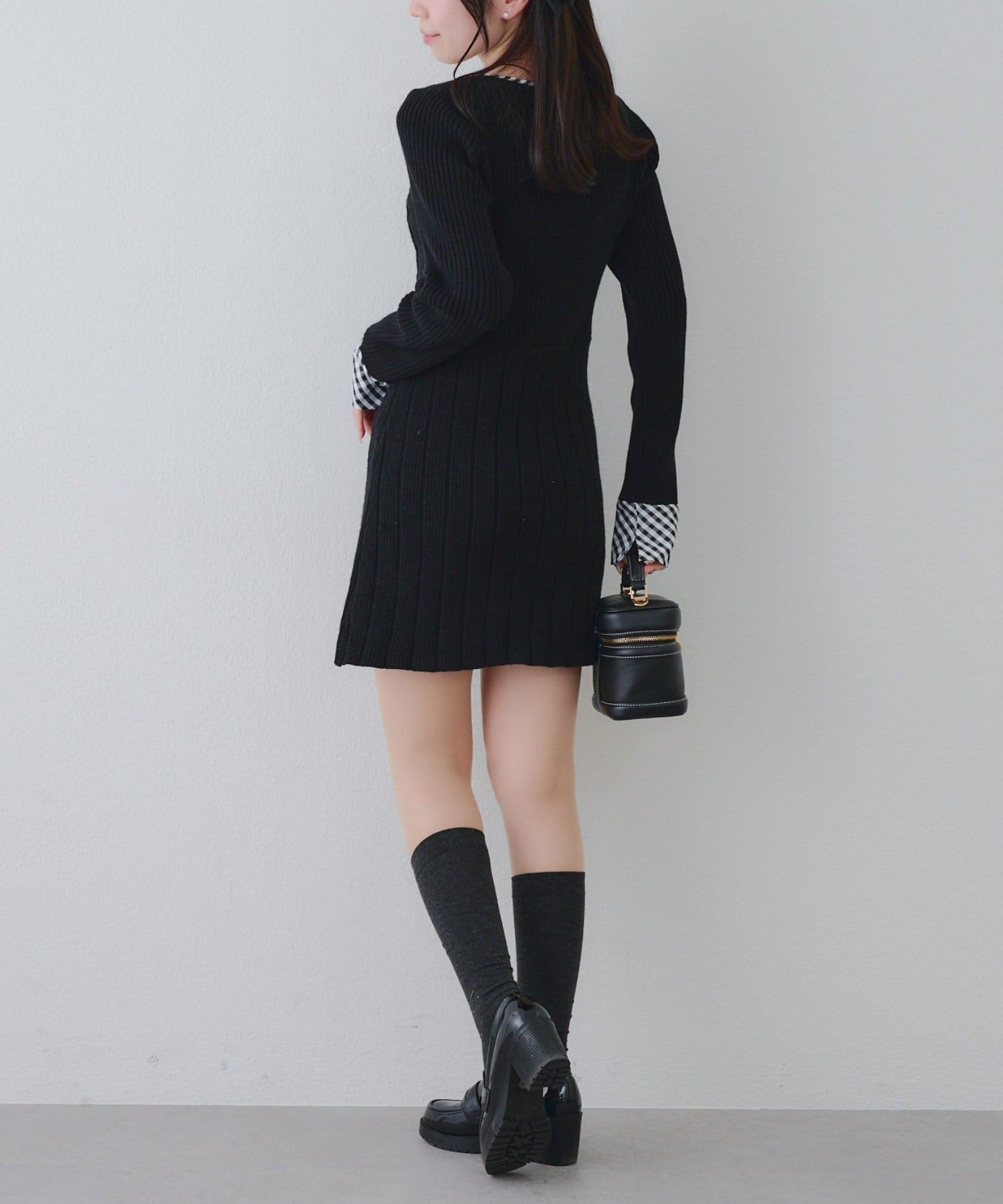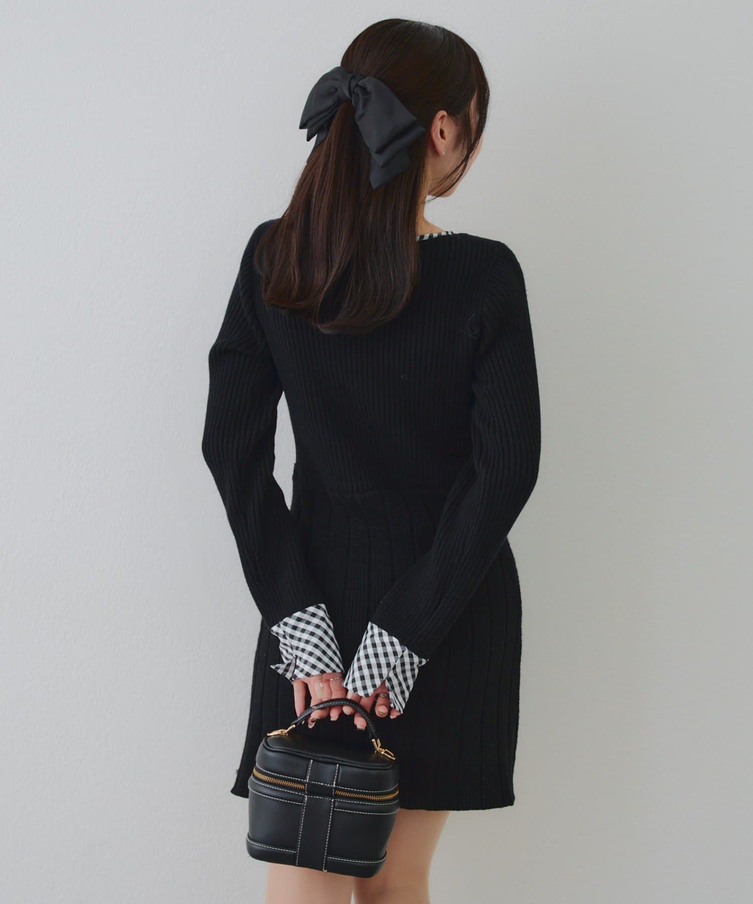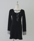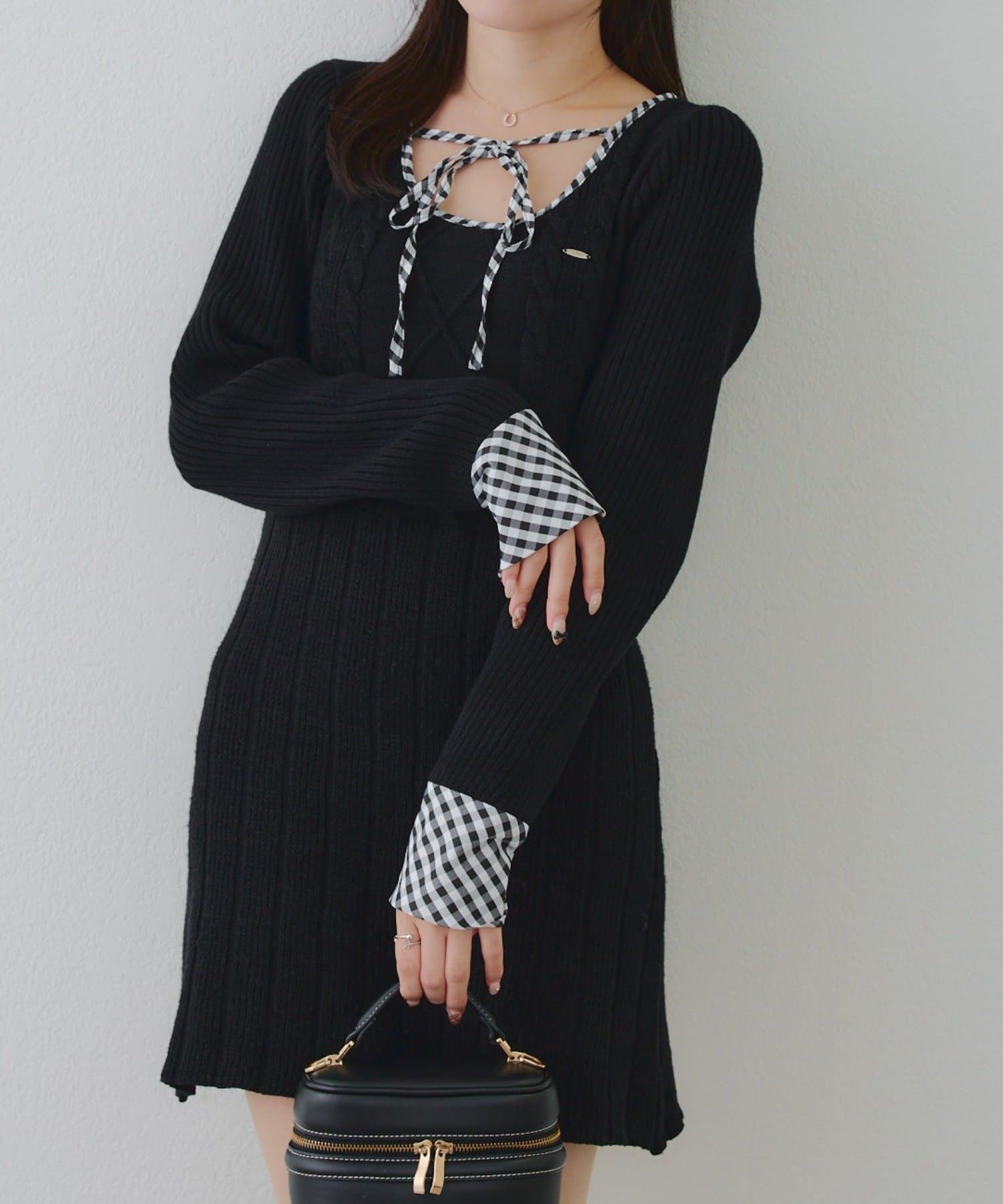 ・首周りと袖部分がチェックの配色になったミニワンピース