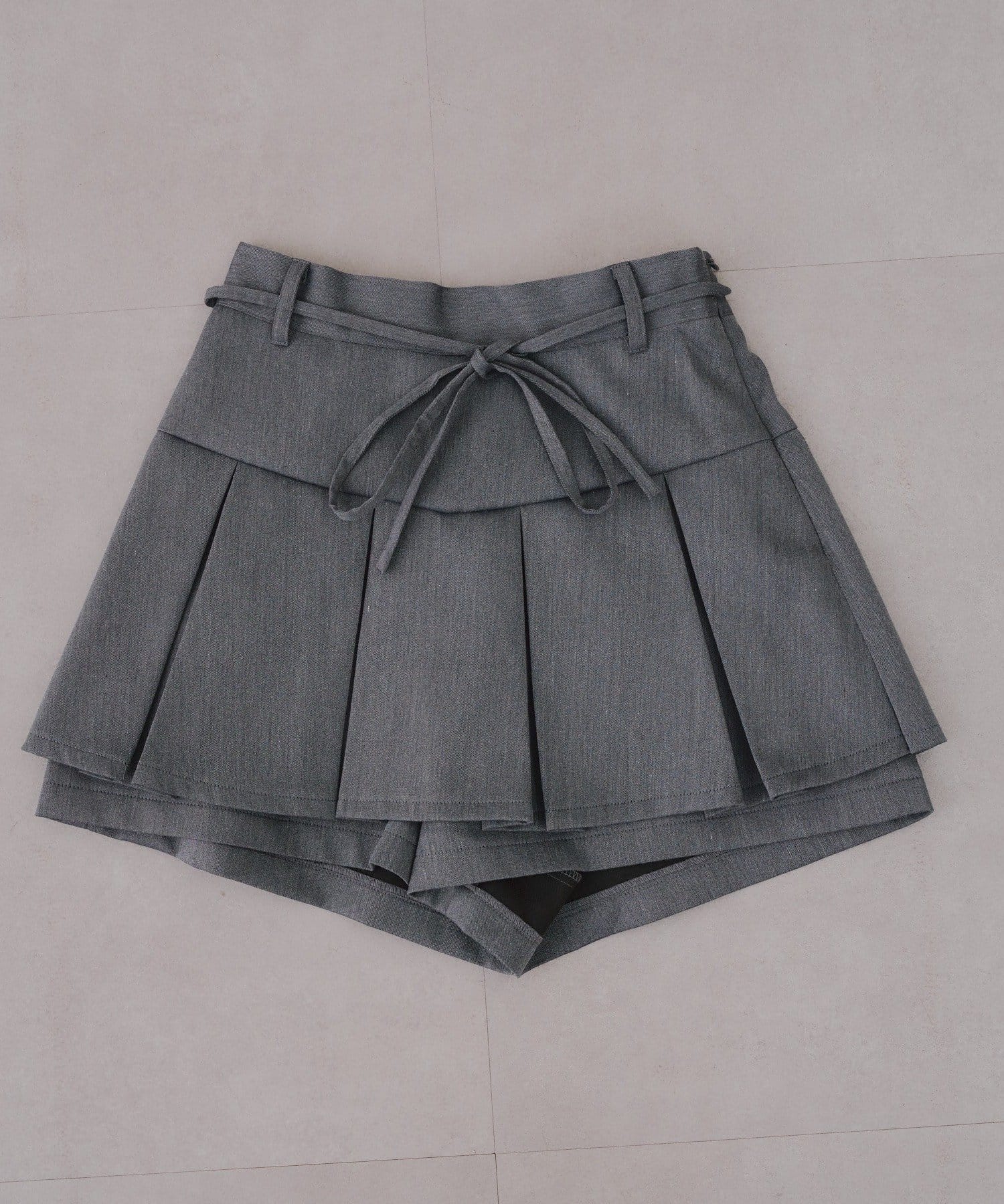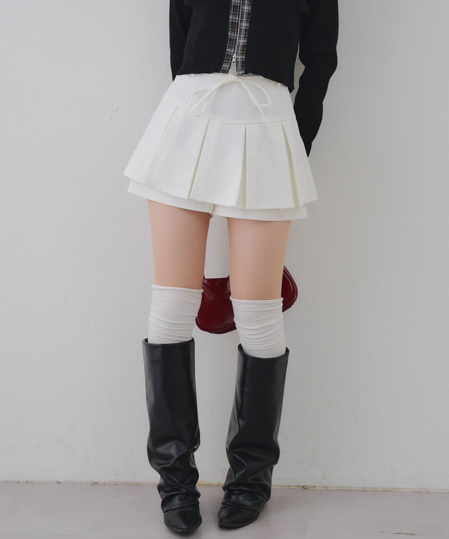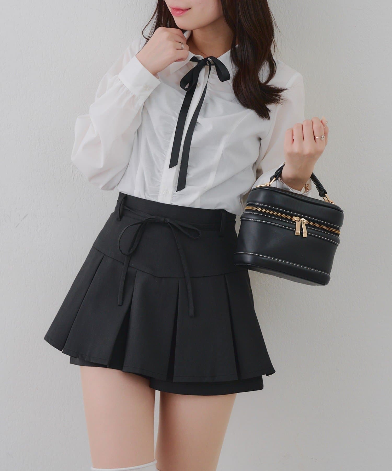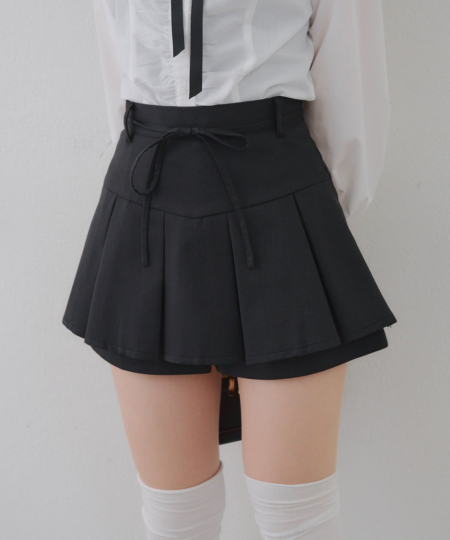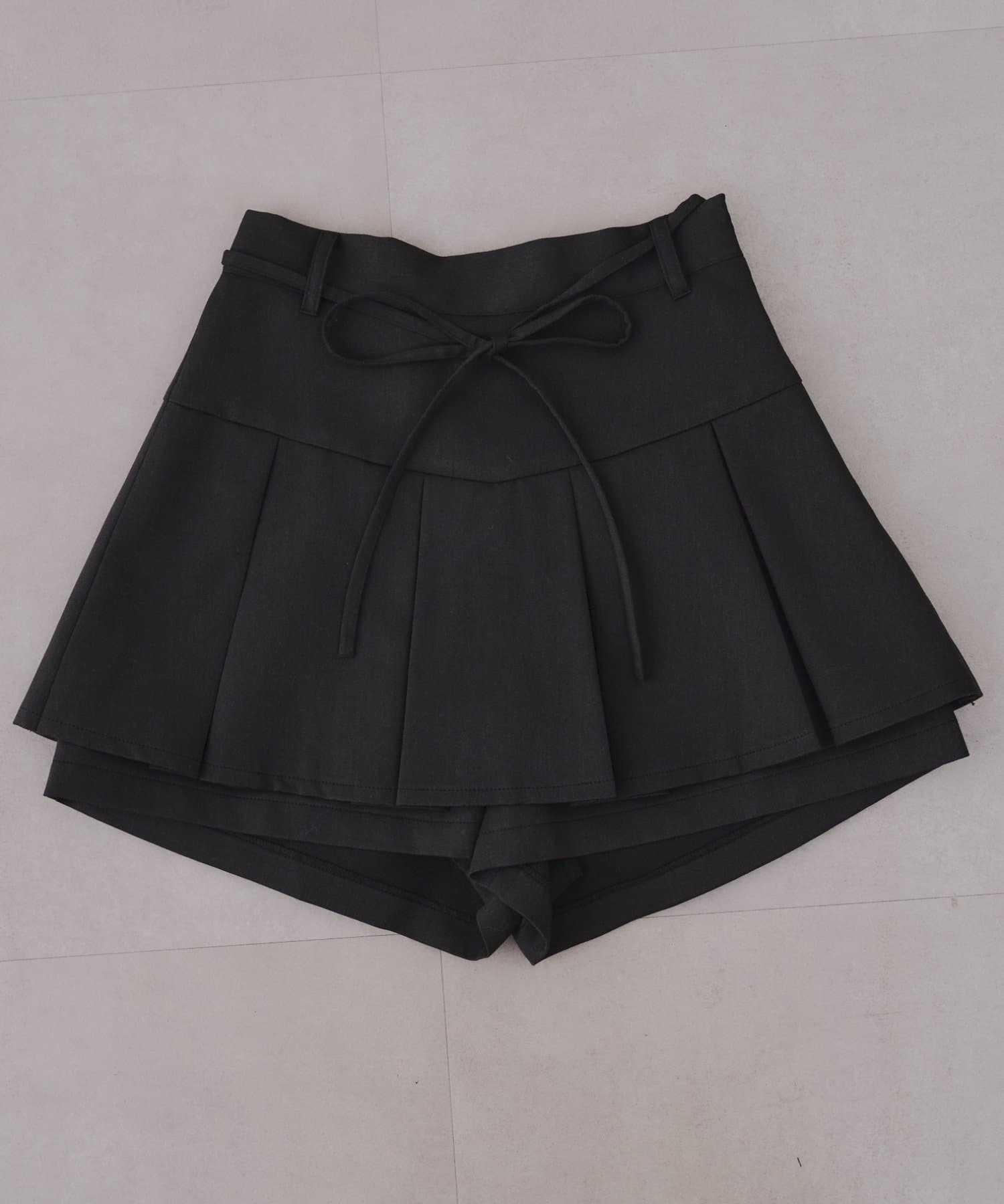 ・ウエストのフロントにあしらったリボンがポイントのミニプリーツスカパン。