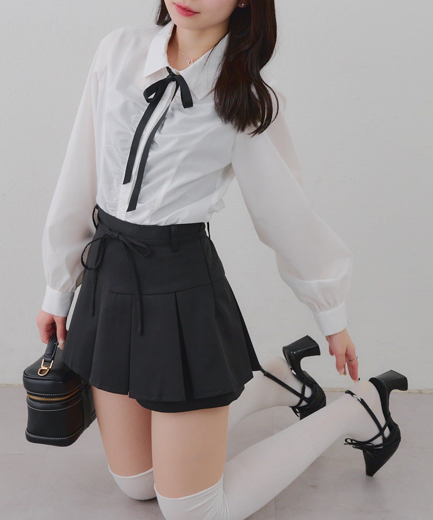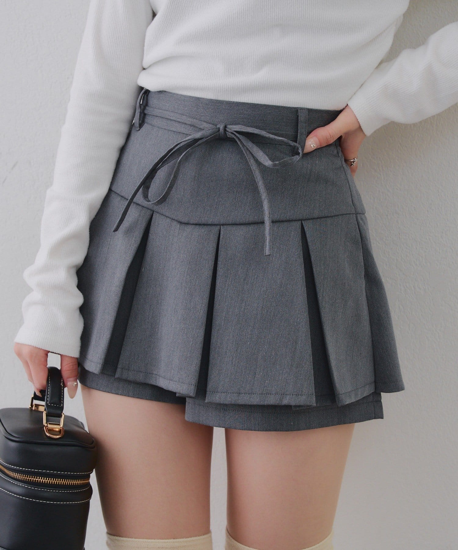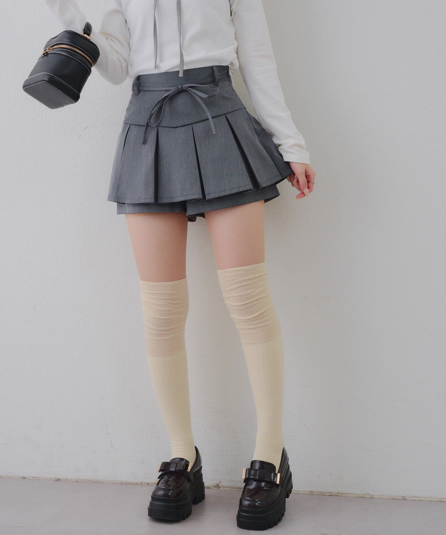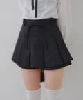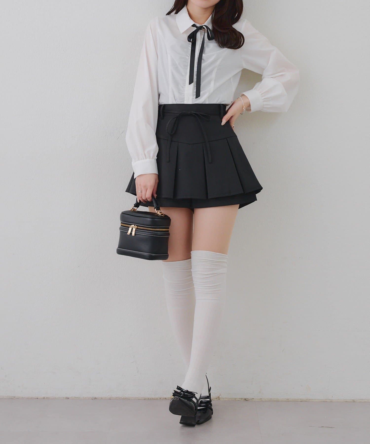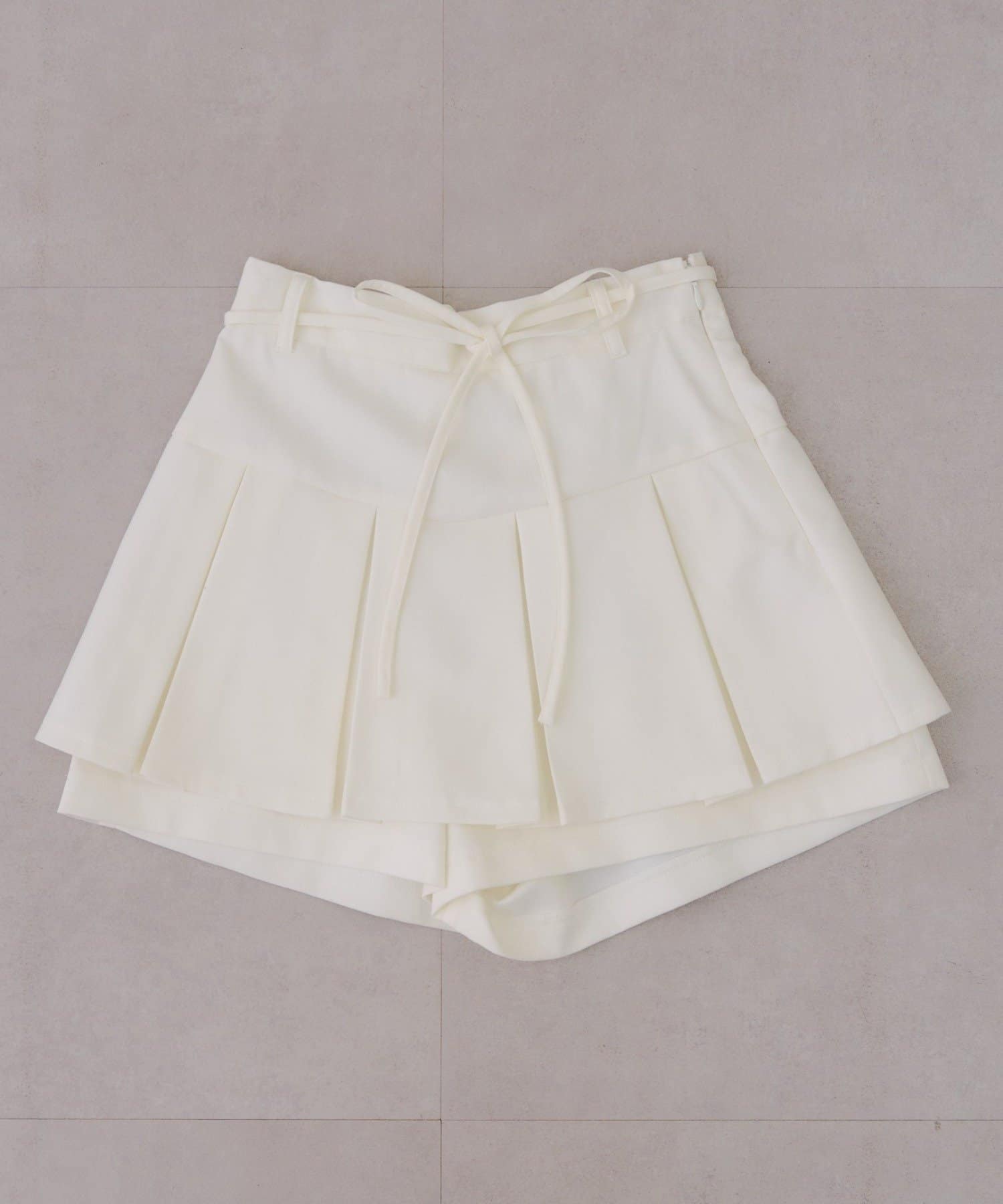 ・ウエストのフロントにあしらったリボンがポイントのミニプリーツスカパン。
