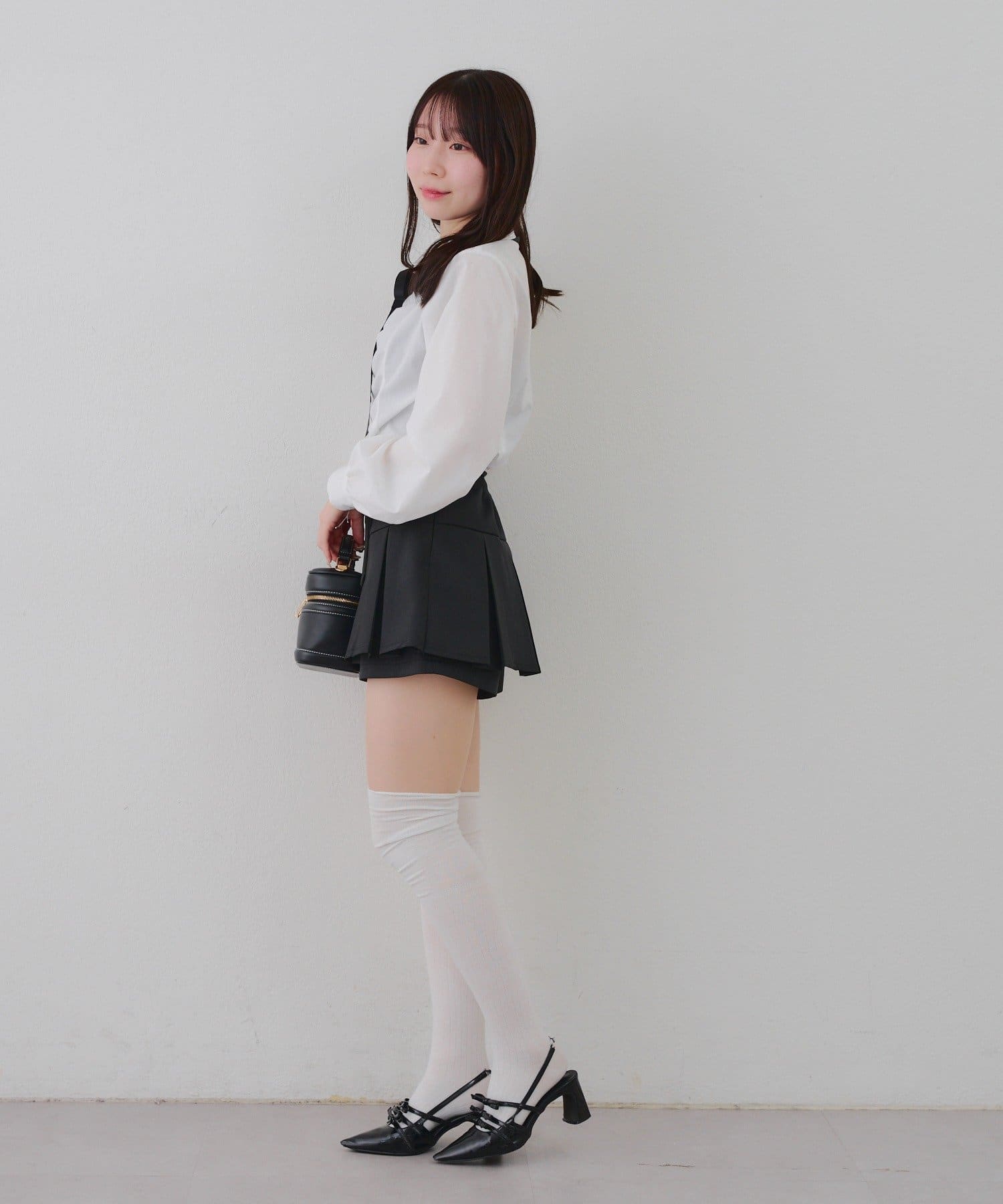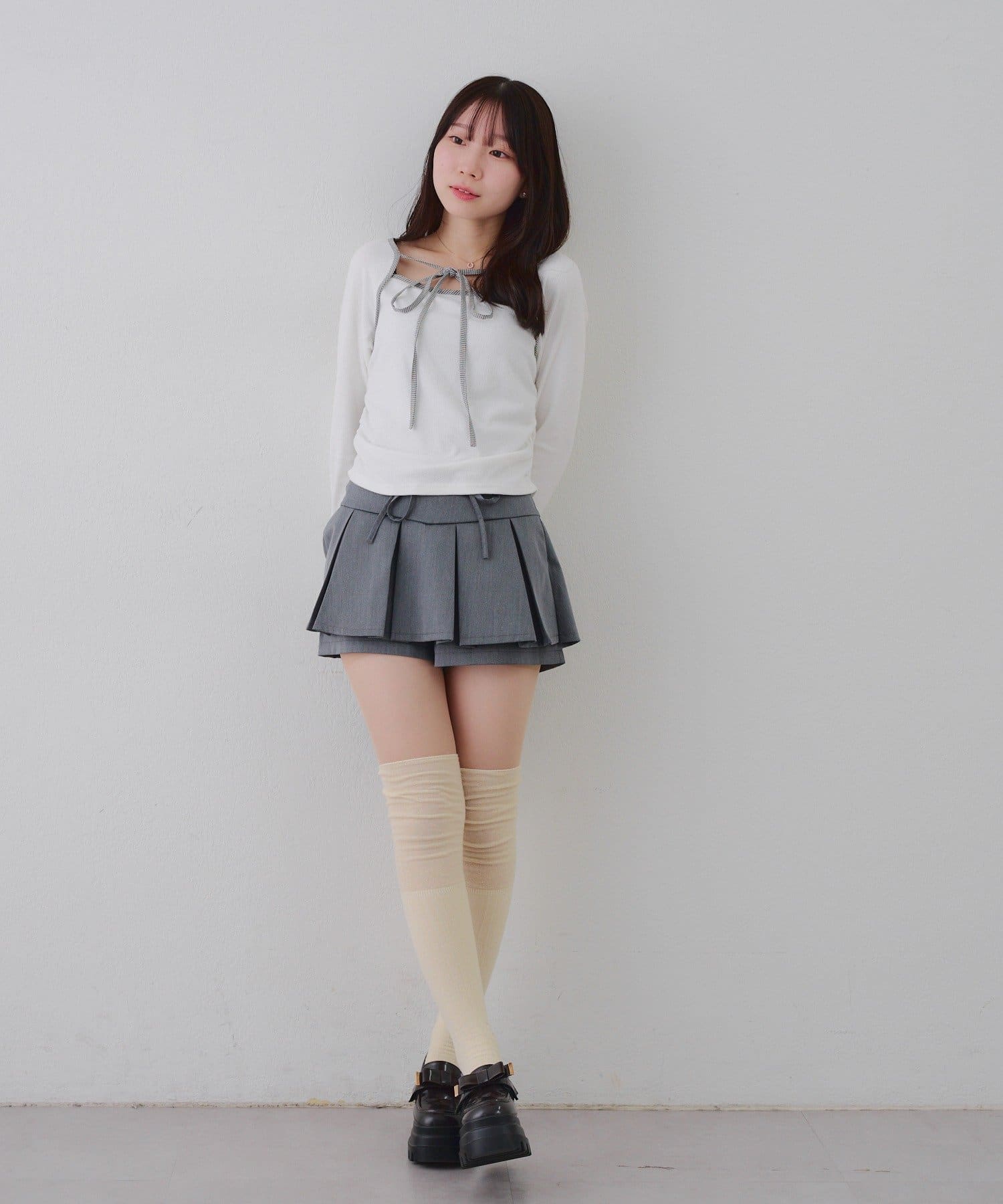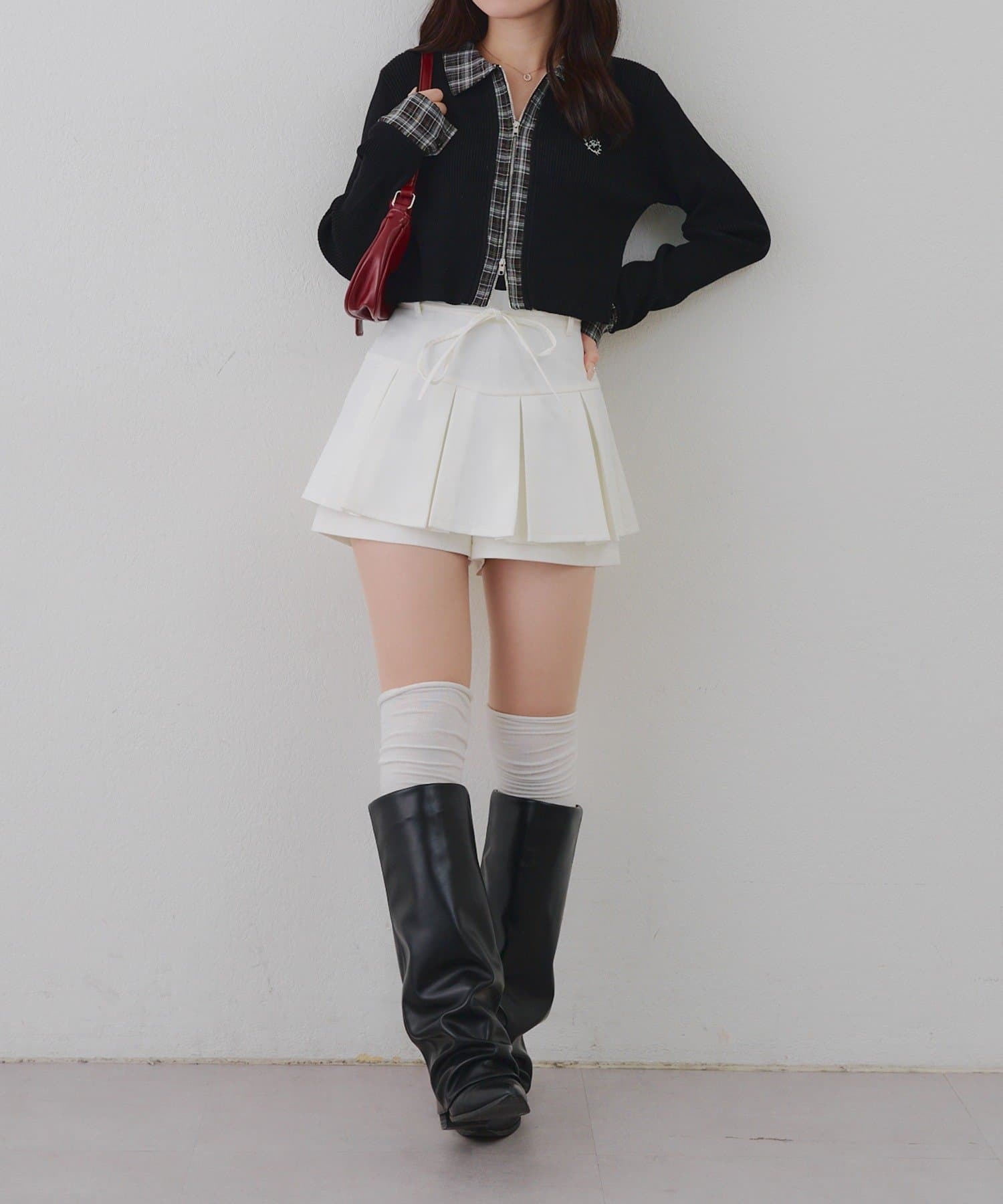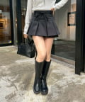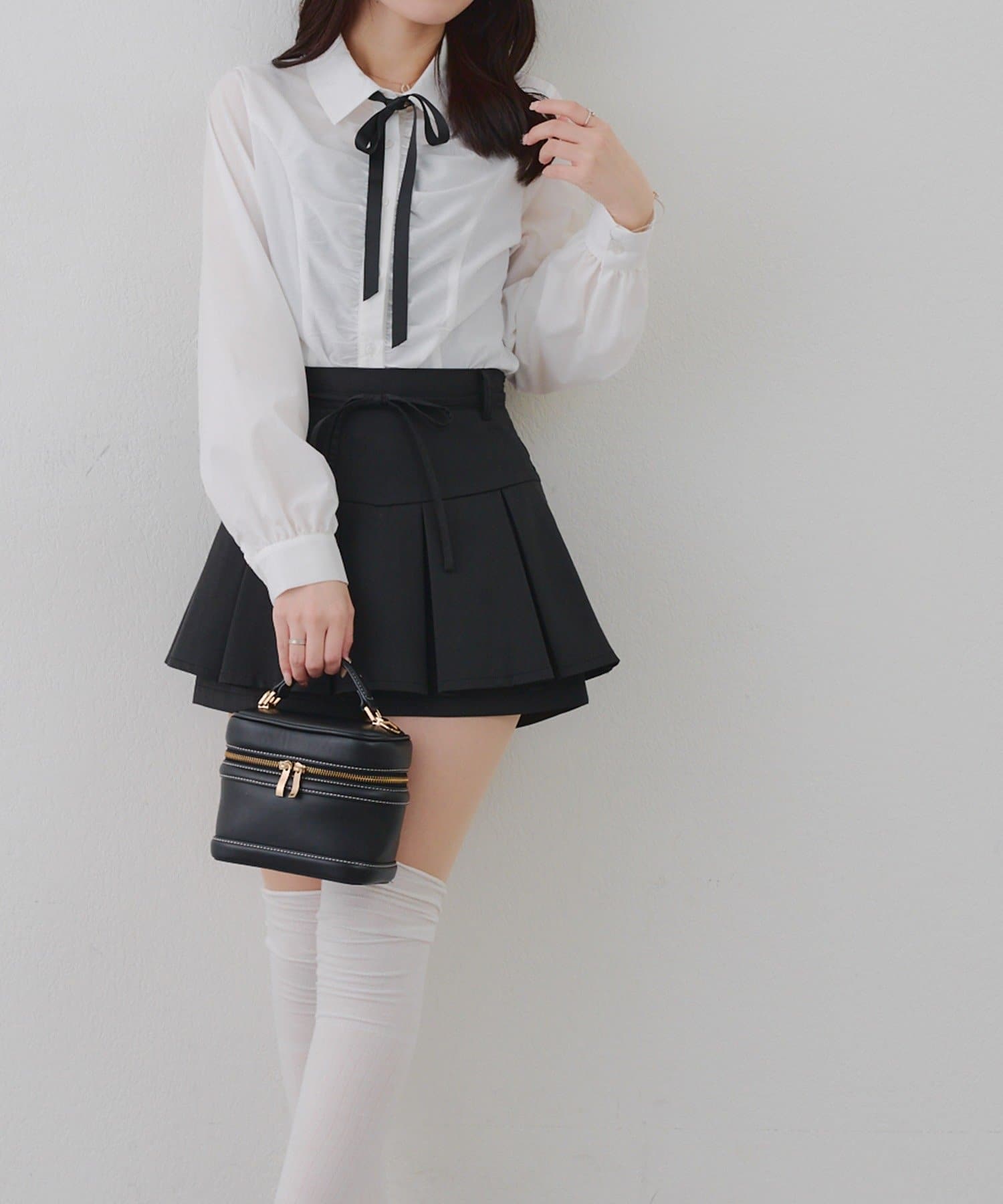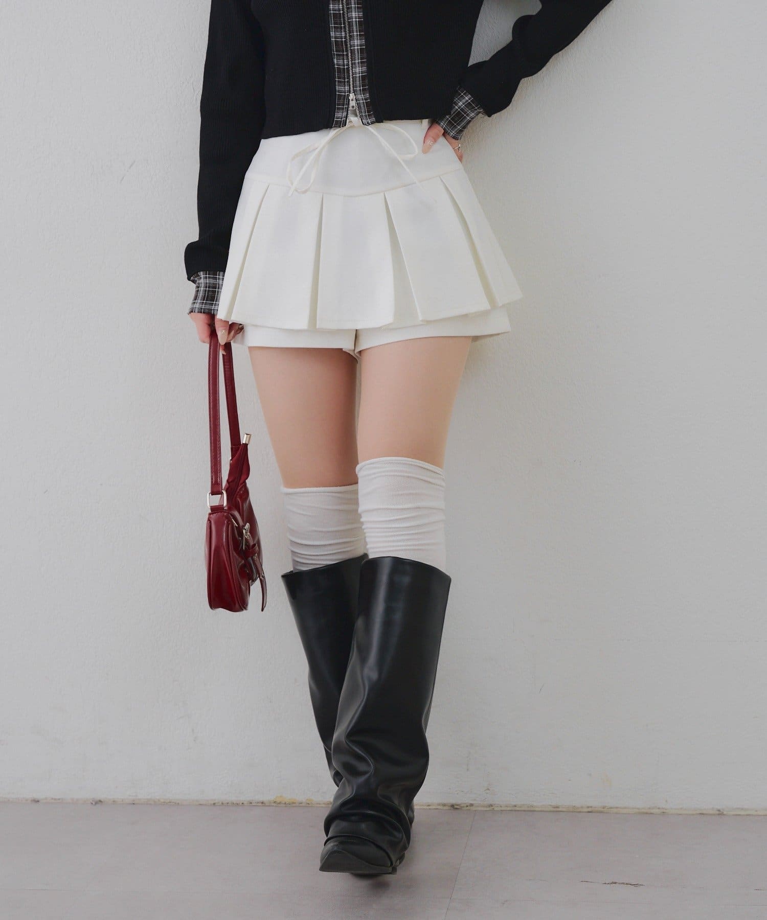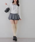 ・ウエストのフロントにあしらったリボンがポイントのミニプリーツスカパン。