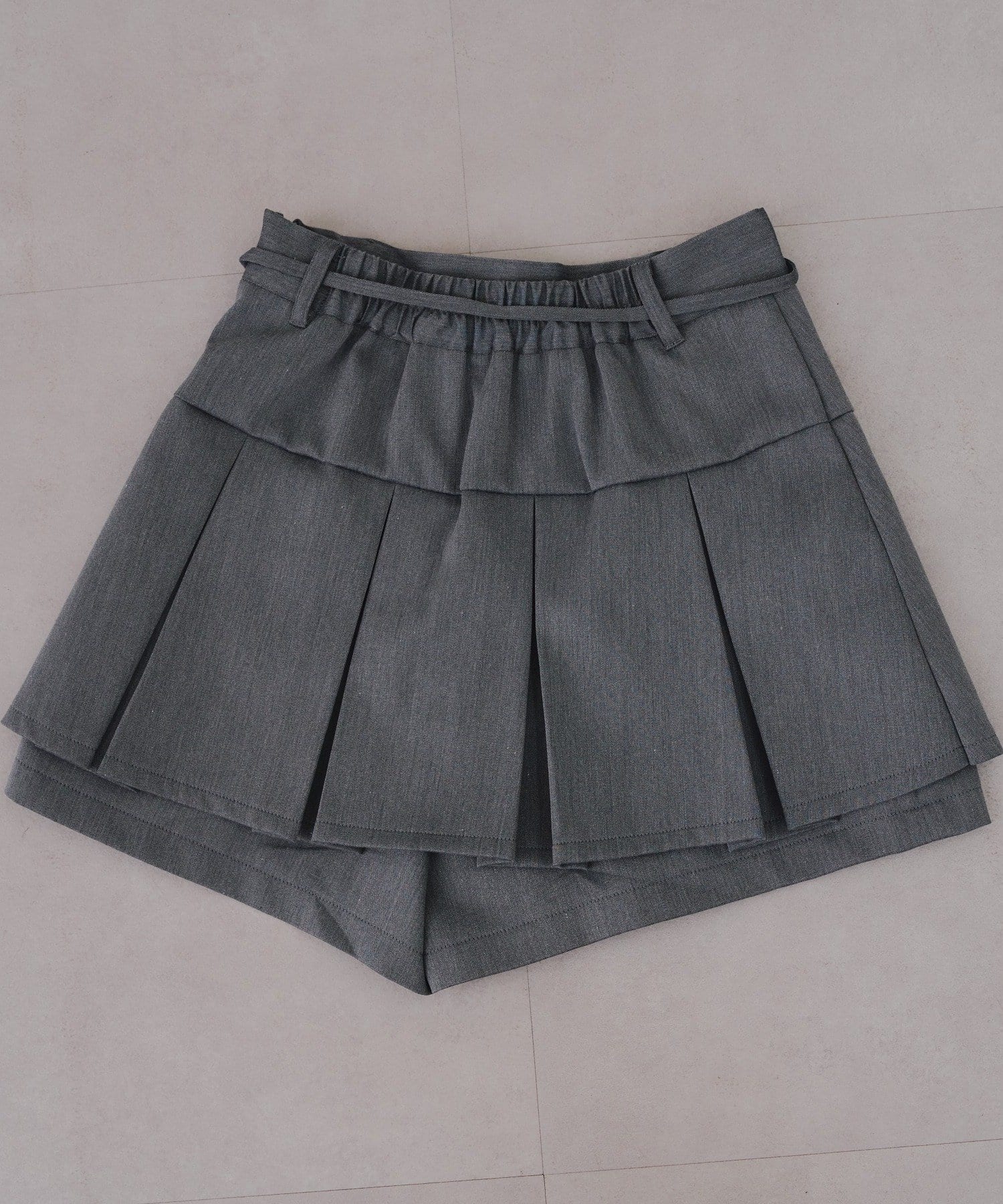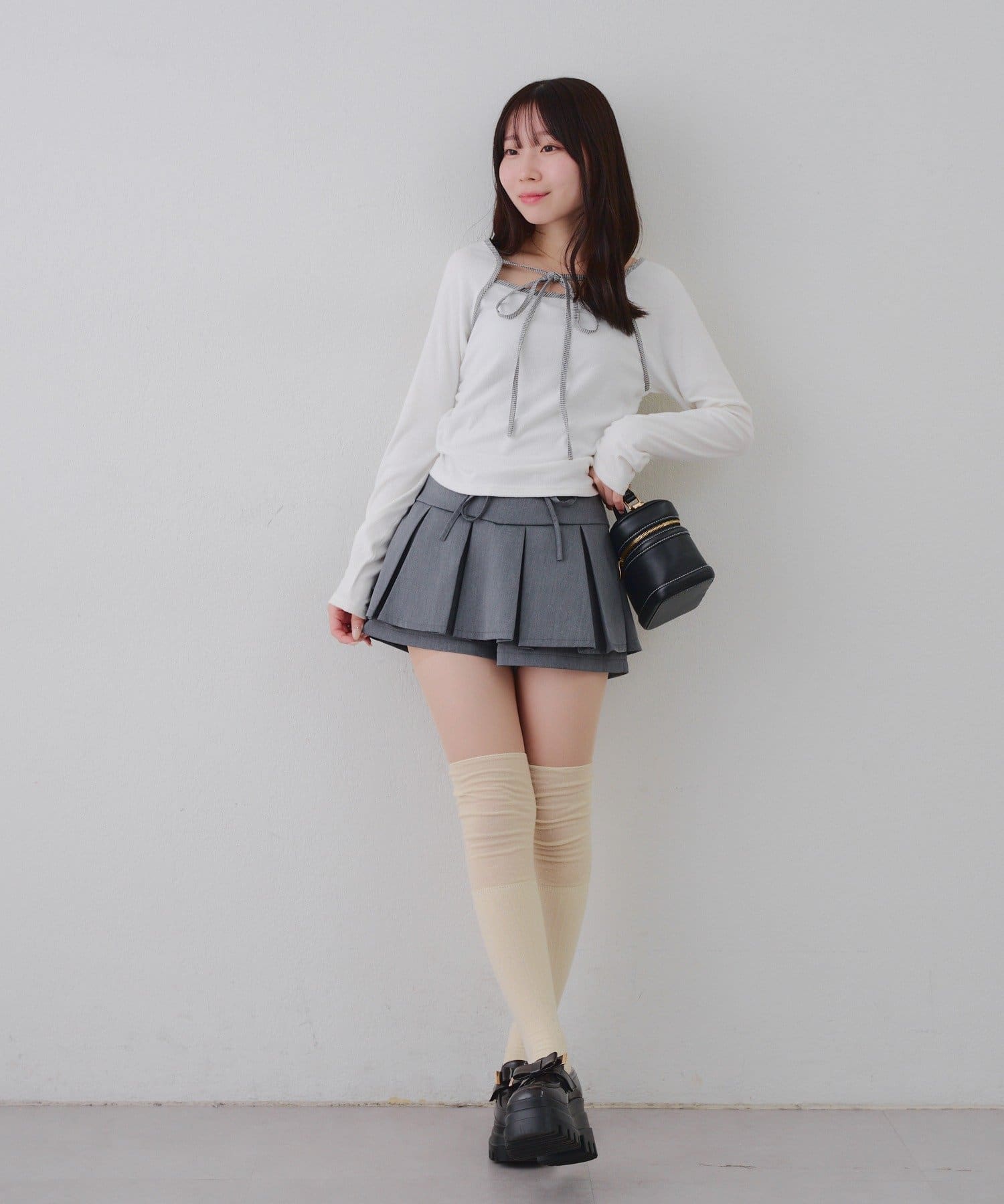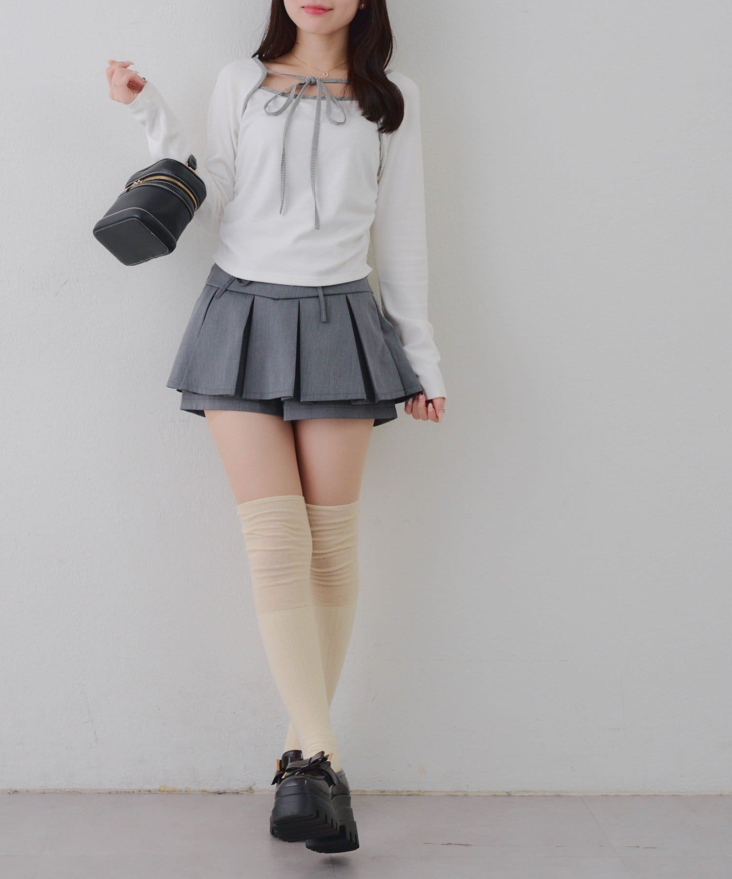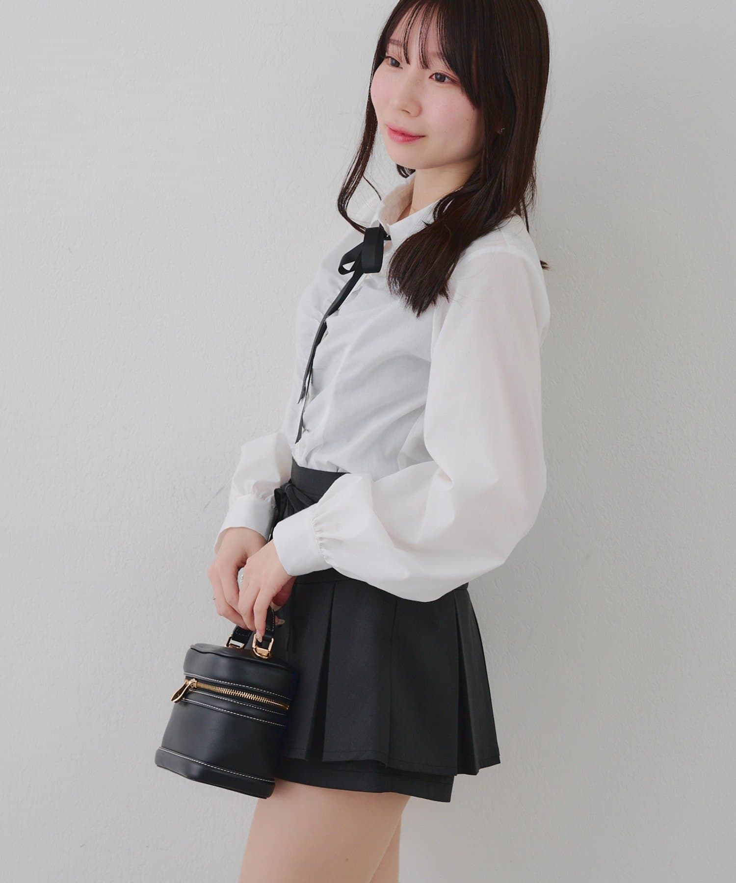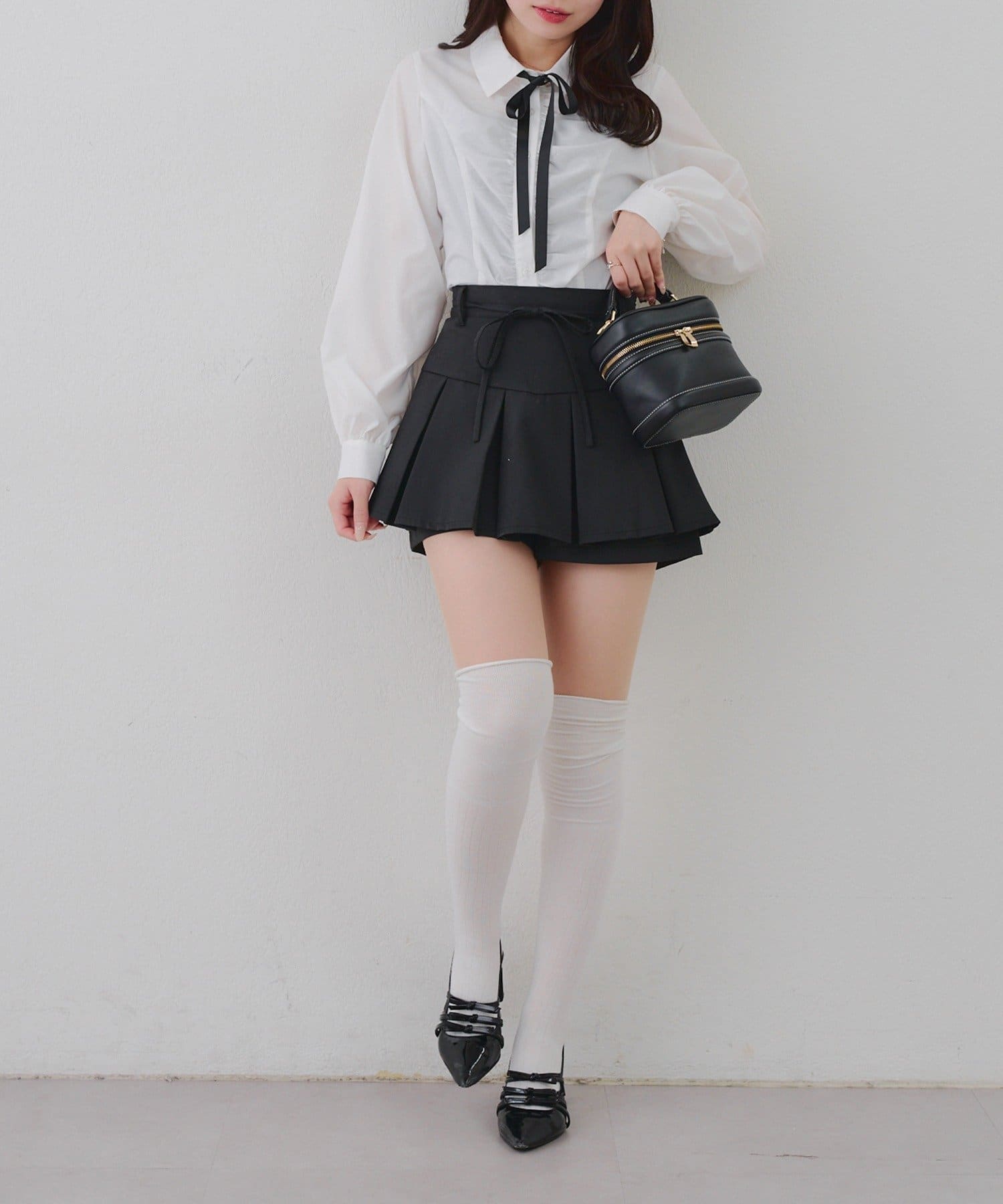 ・ウエストのフロントにあしらったリボンがポイントのミニプリーツスカパン。