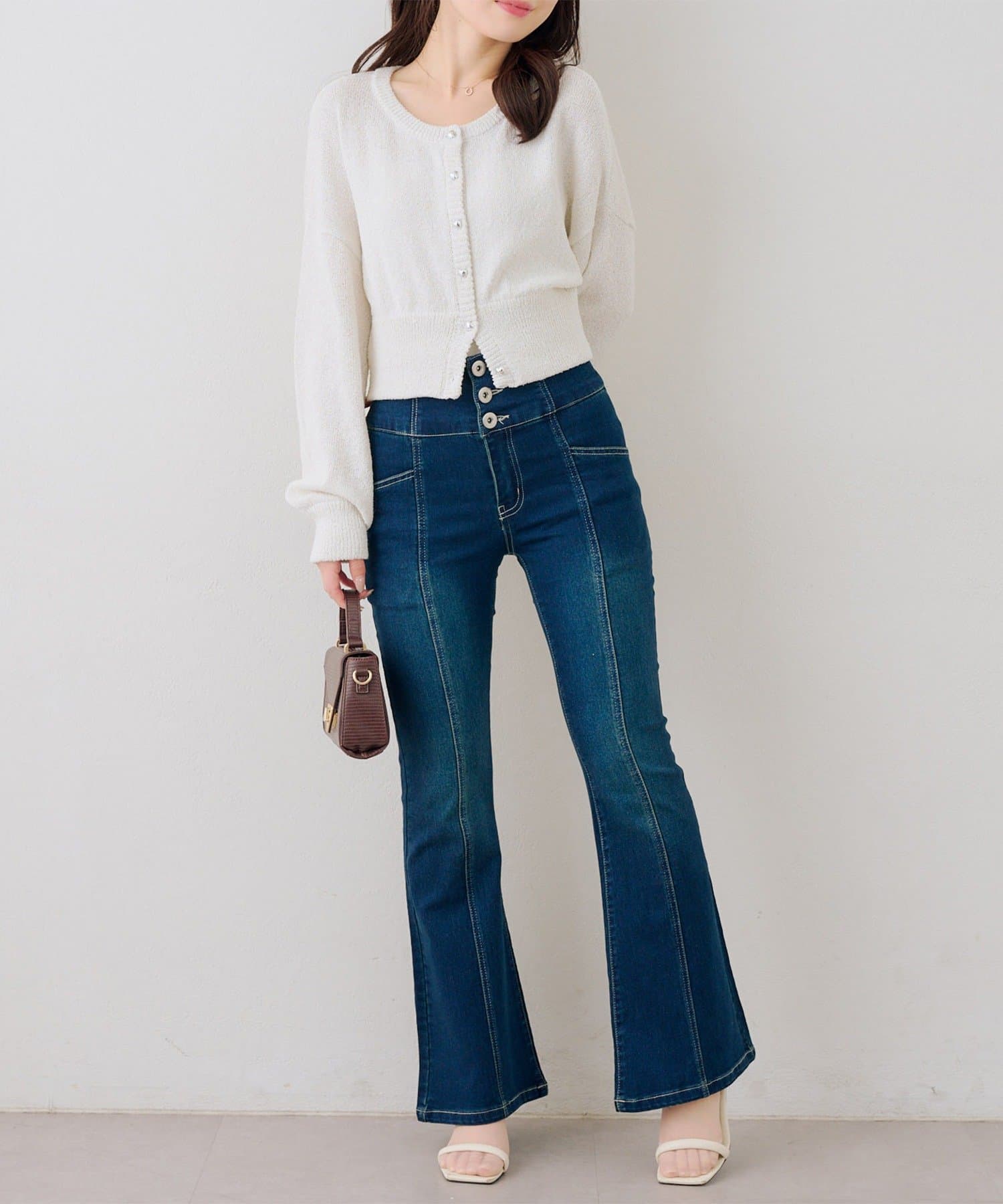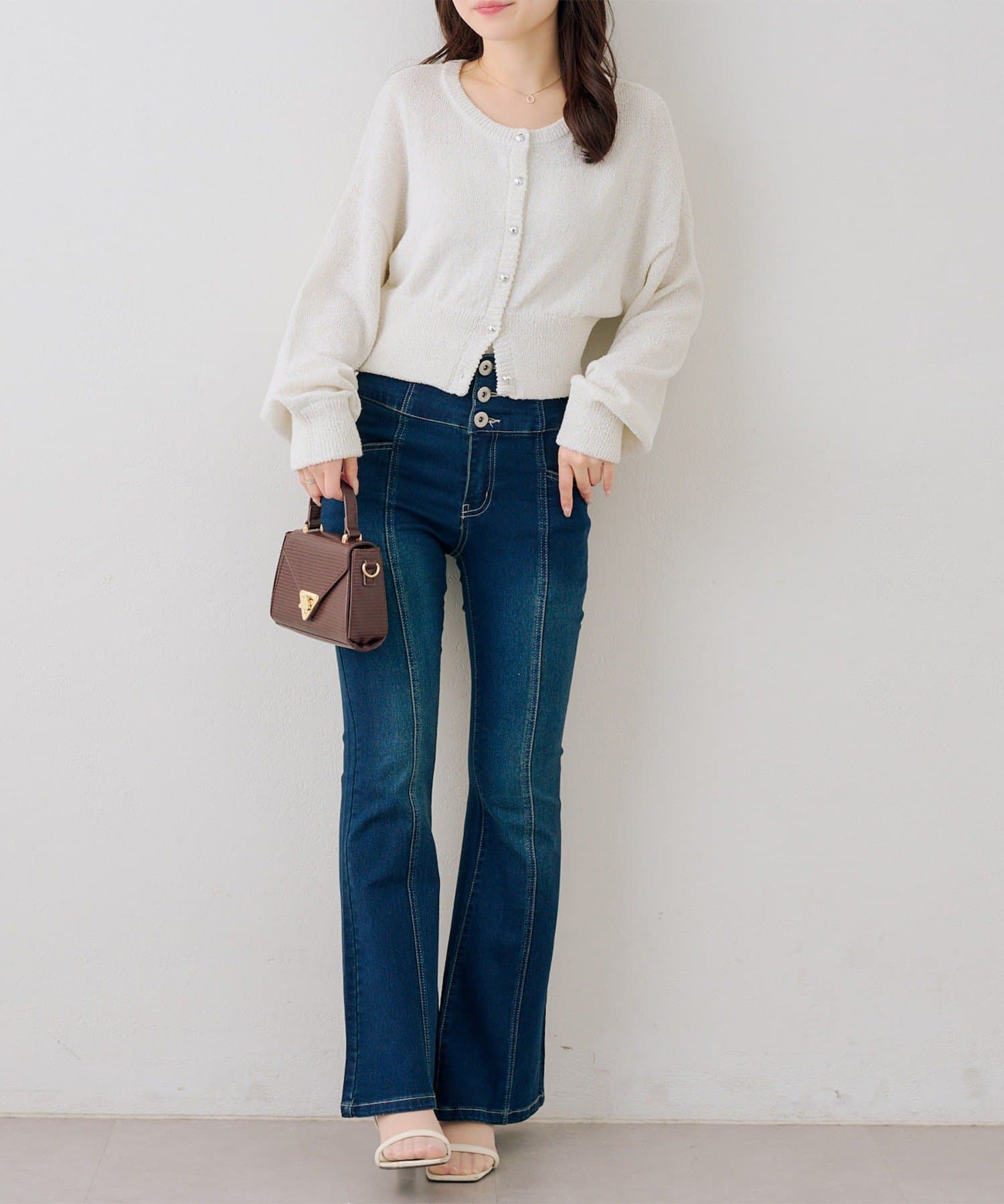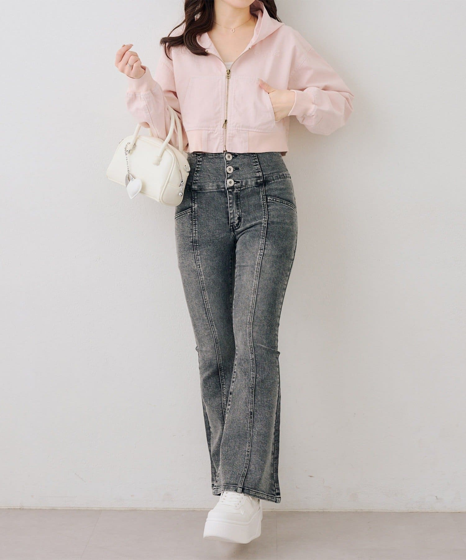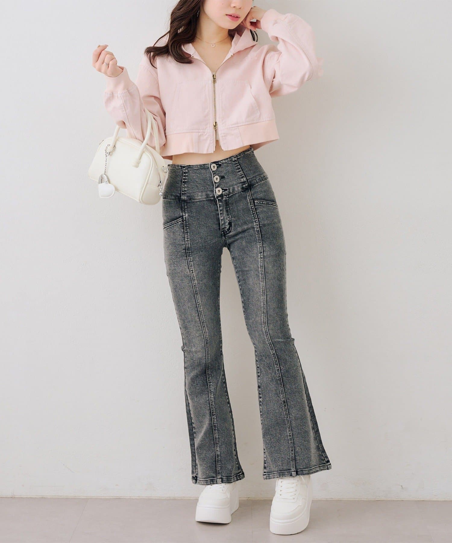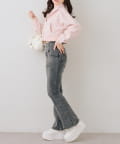・ハイウエストのボトムなので、トップスはコンパクトにまとめるのが◎