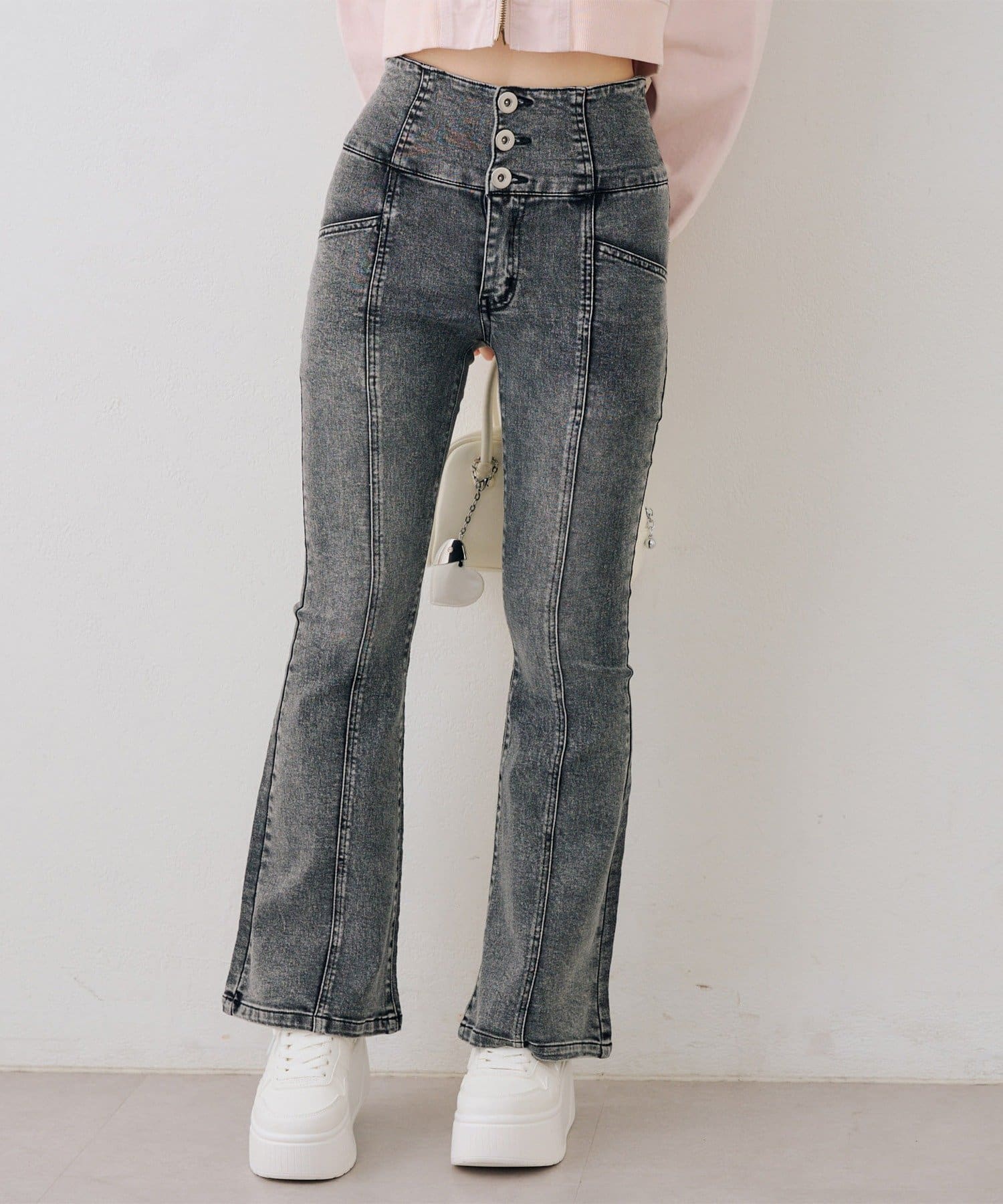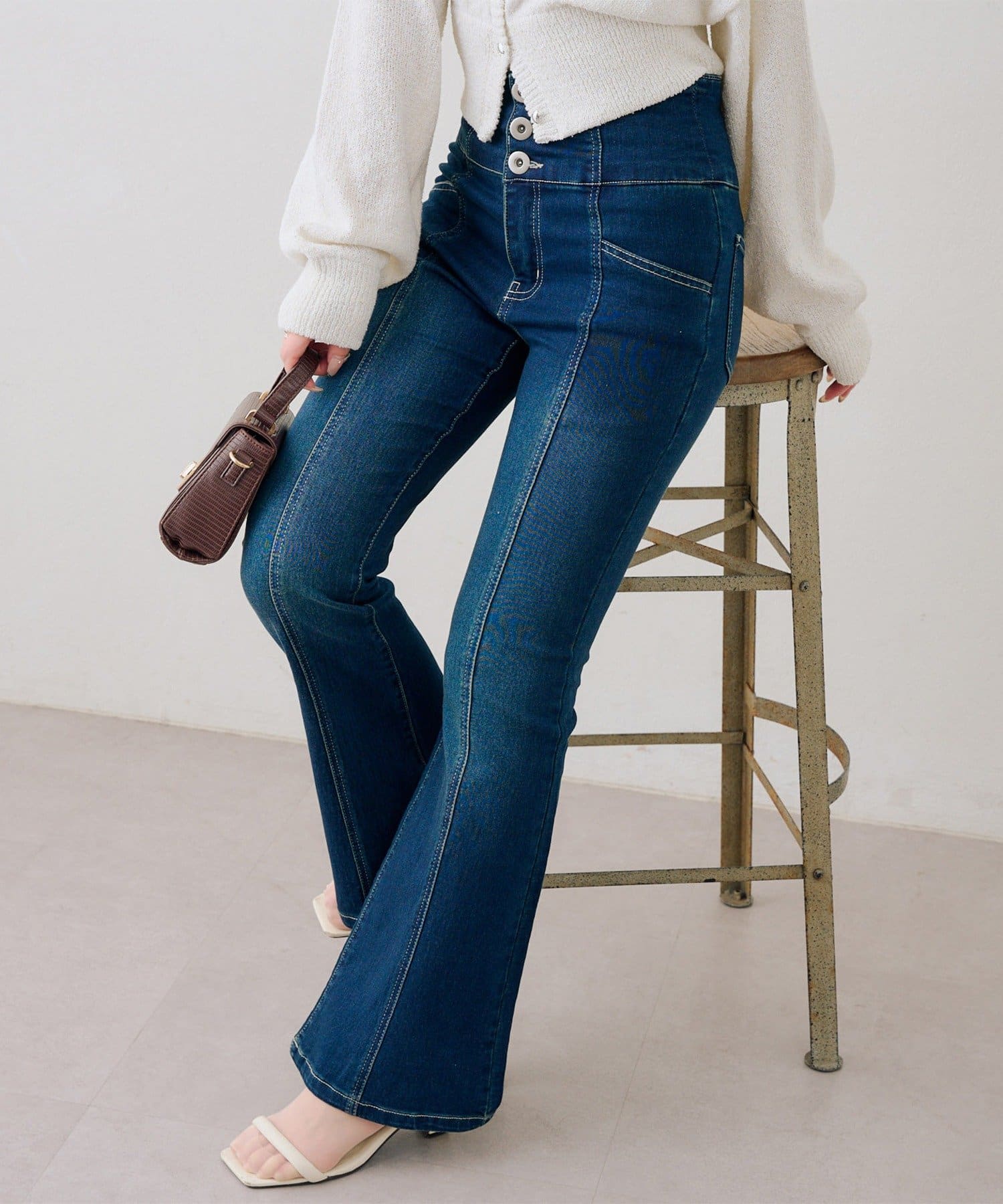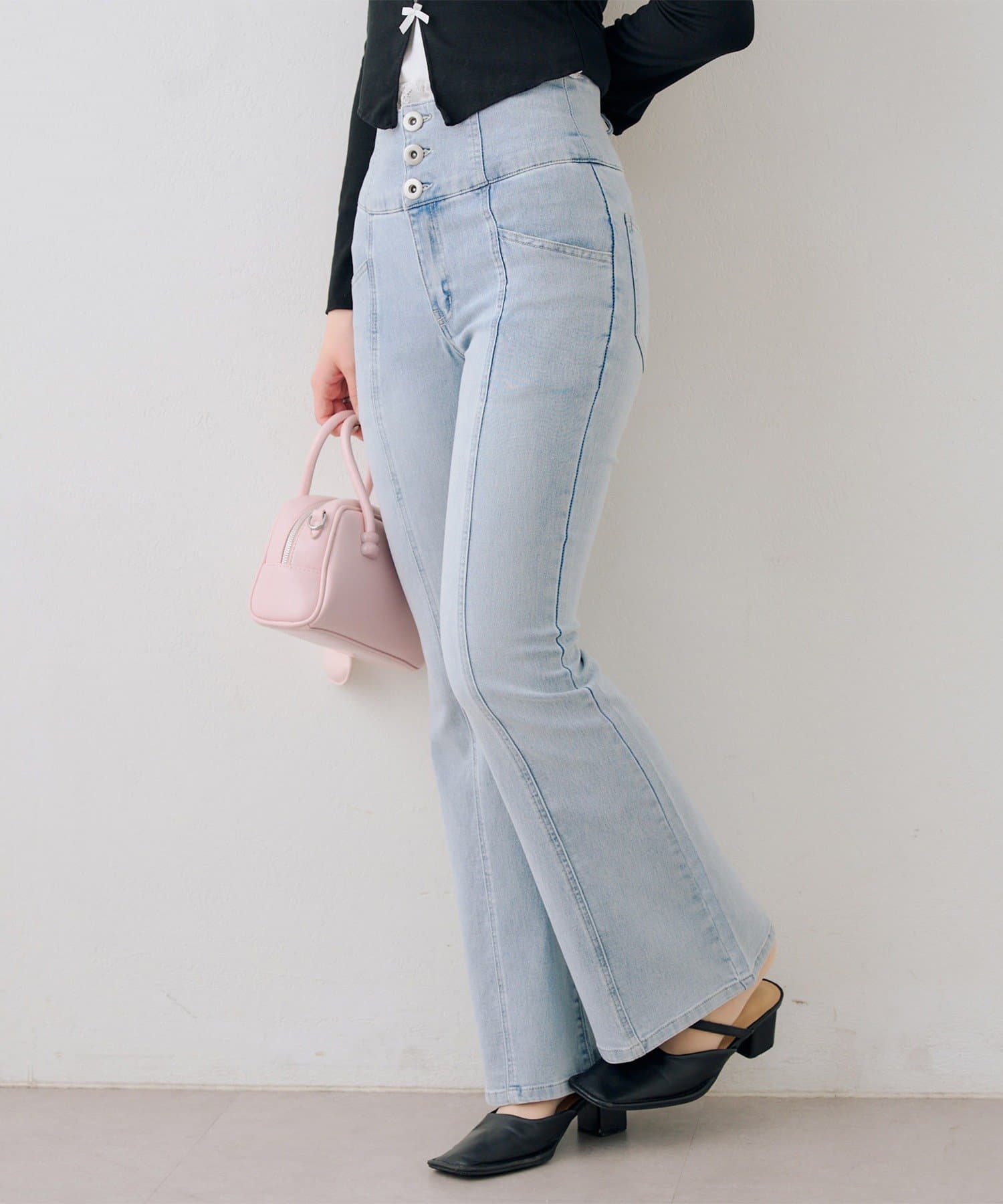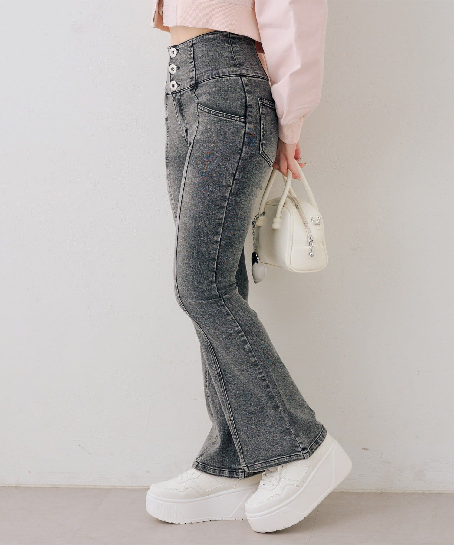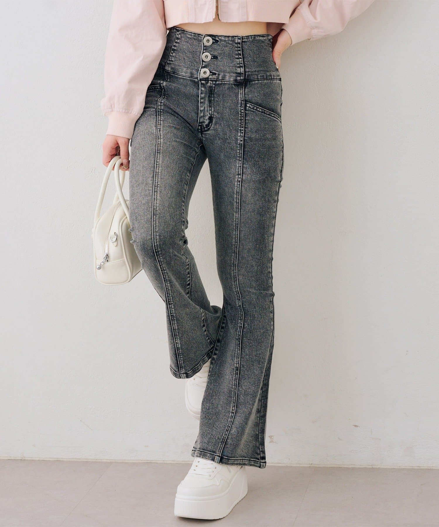 ・ハイウエストのボトムなので、トップスはコンパクトにまとめるのが◎