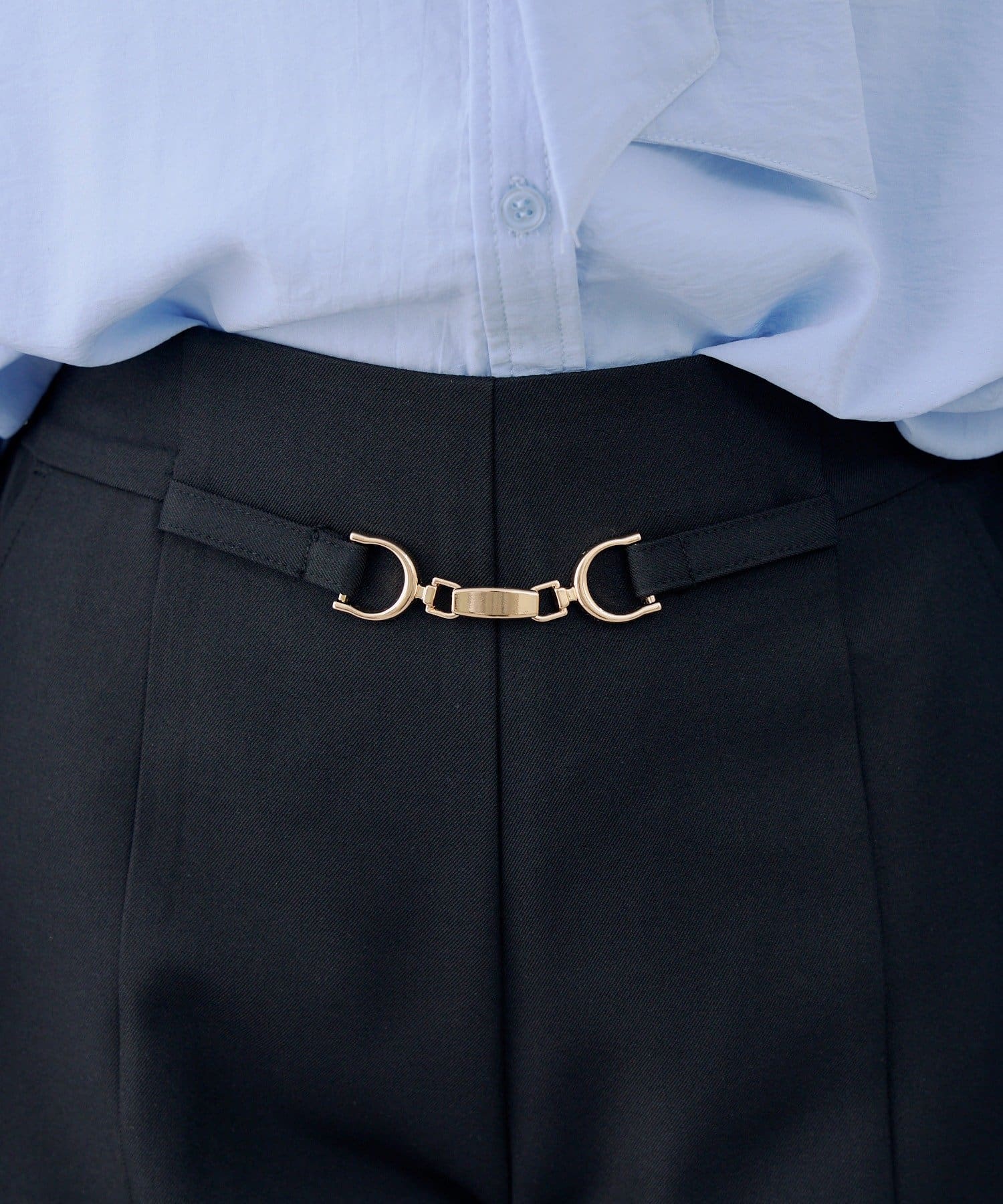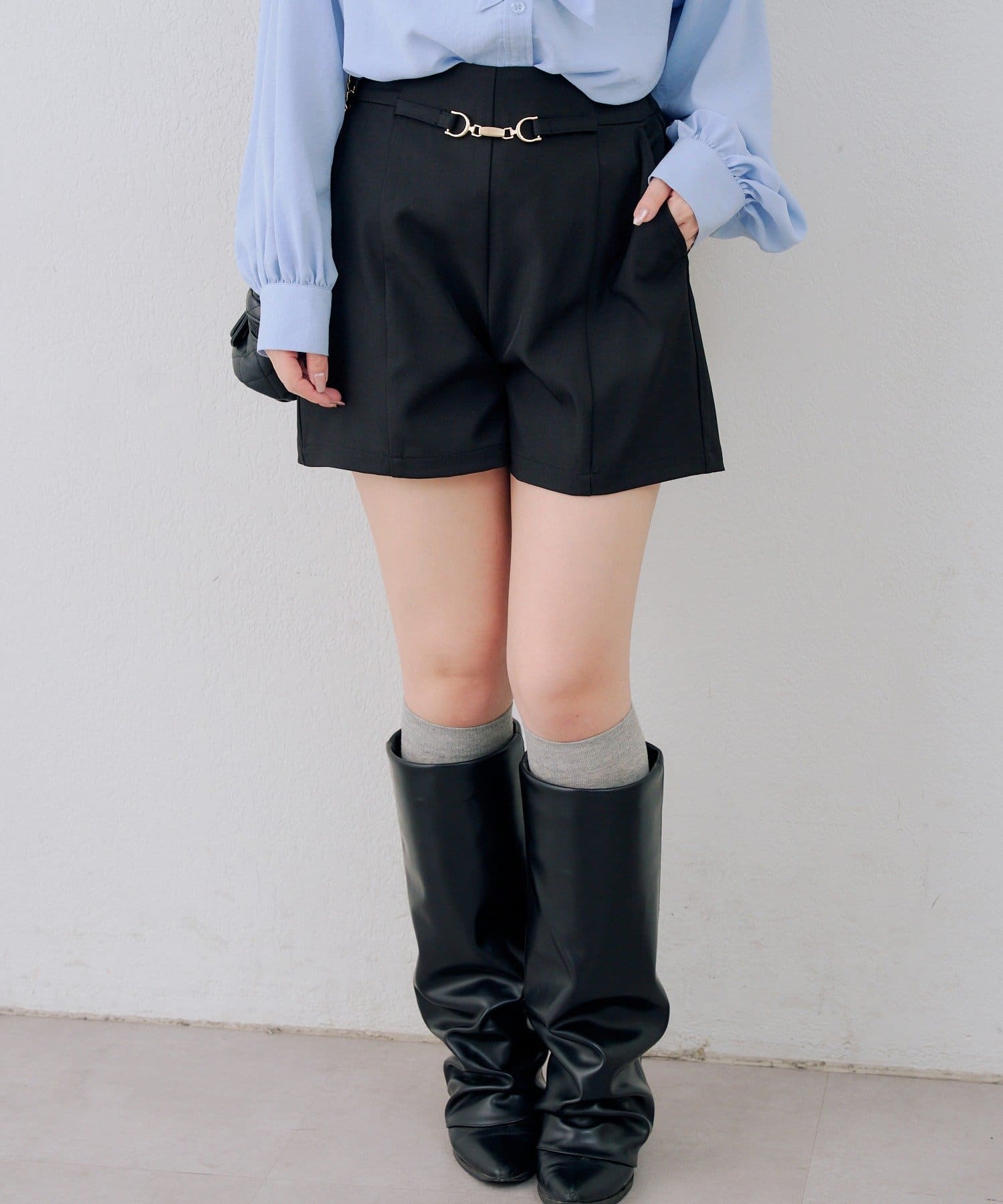 ・目を引くゴールドのビットが、シンプルなデザインにエッジを効かせるショートパンツ