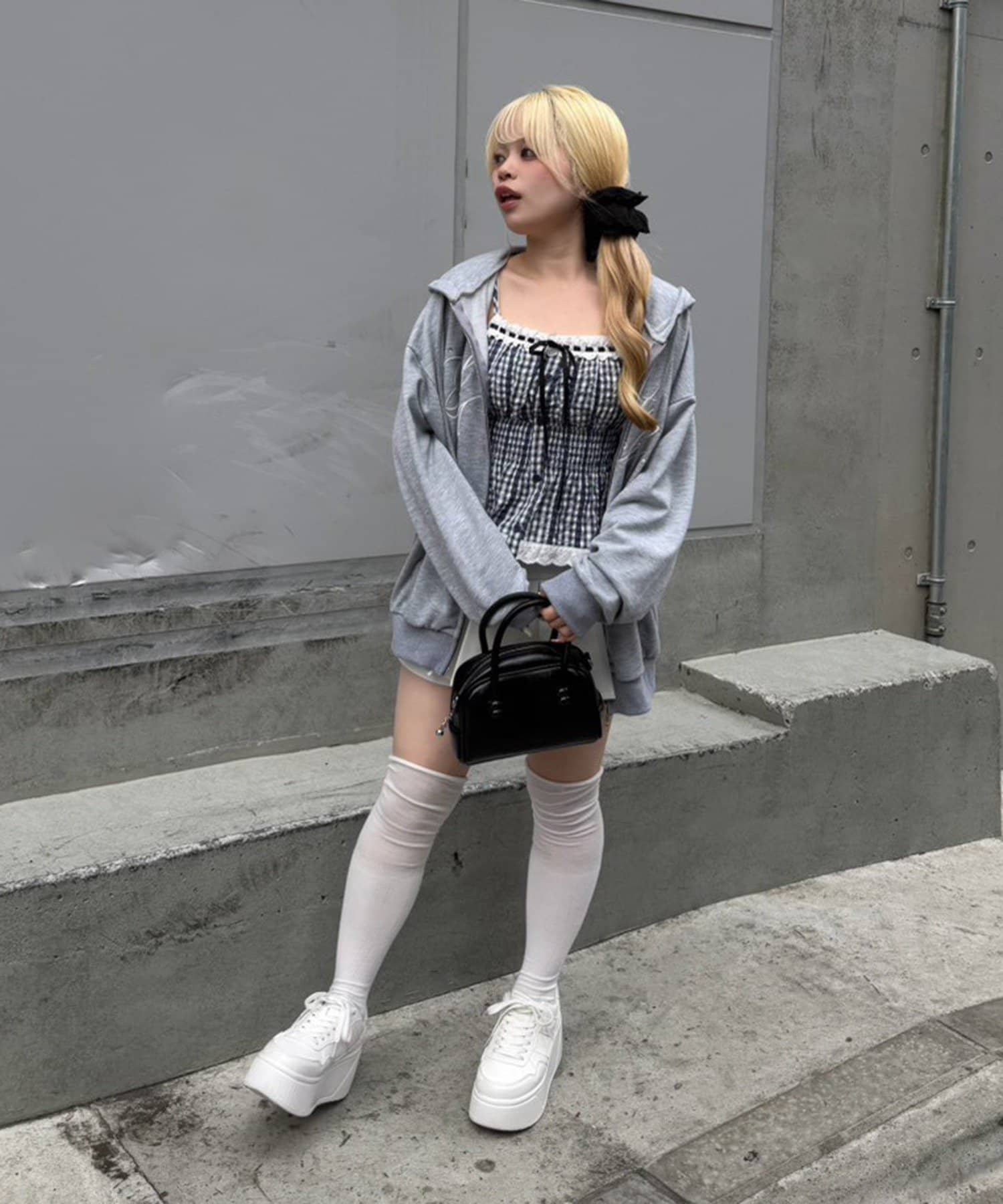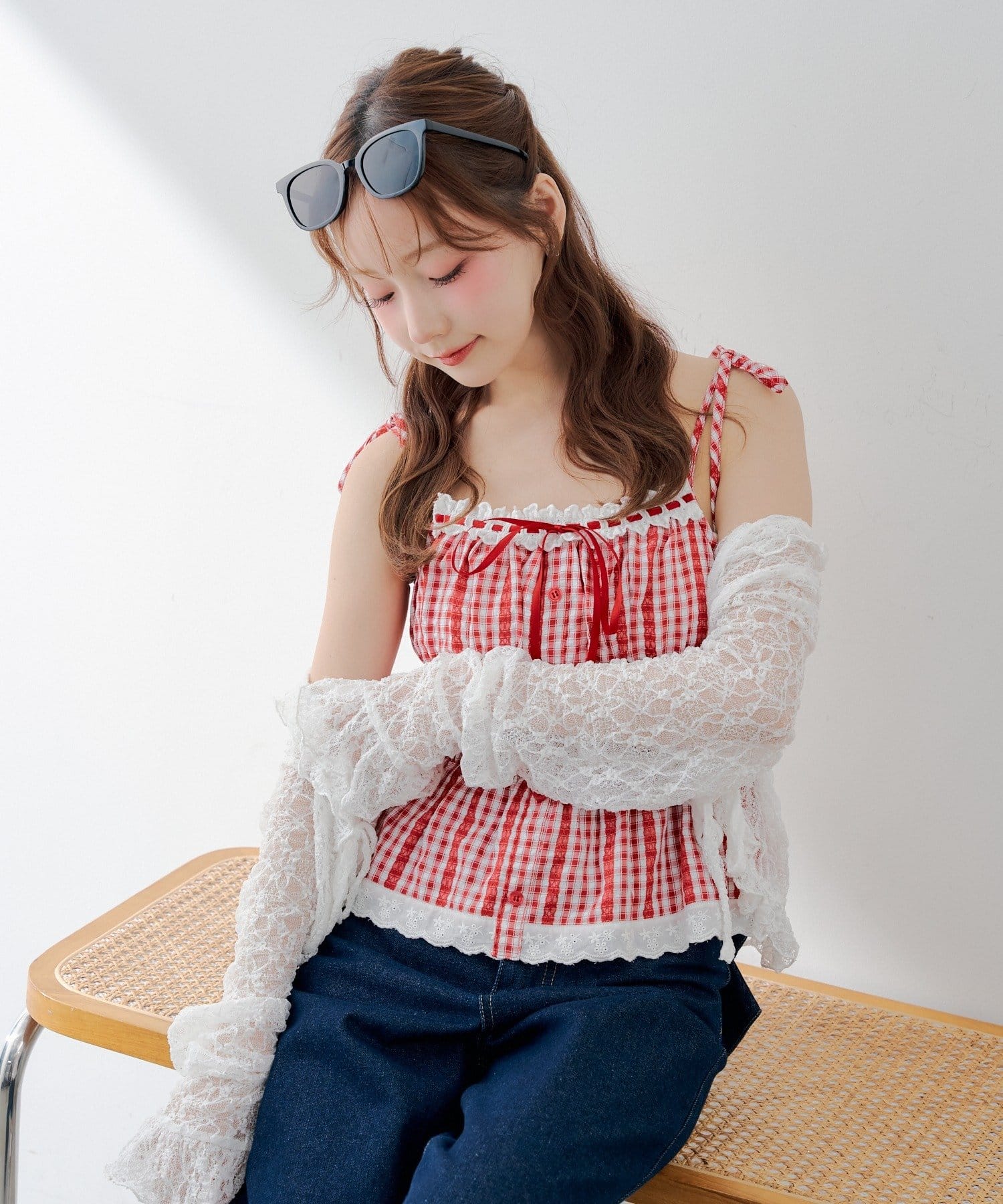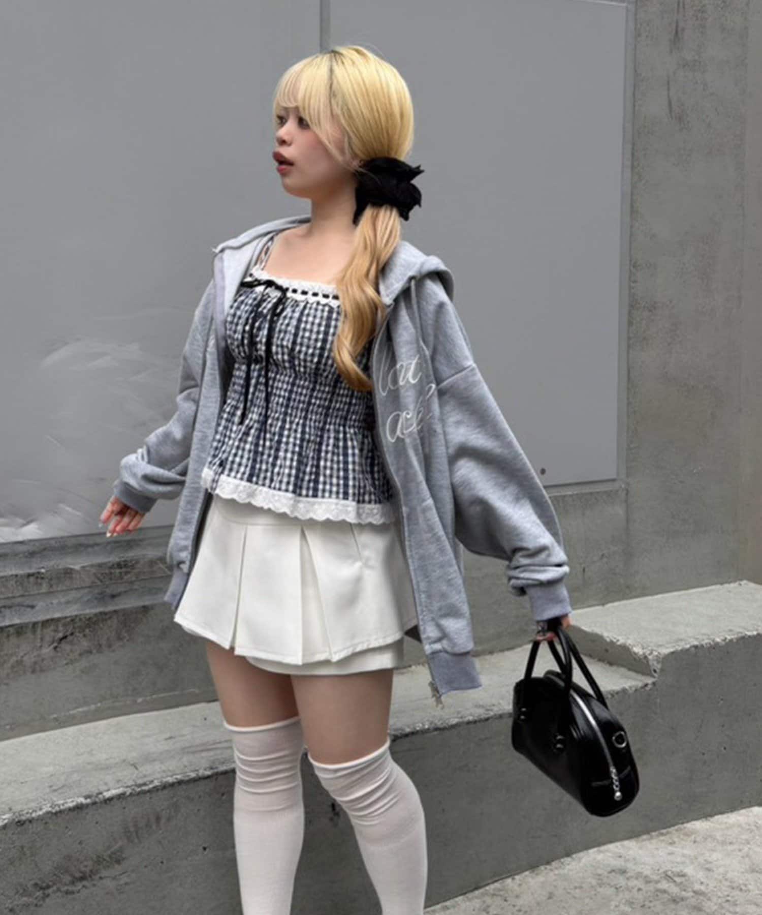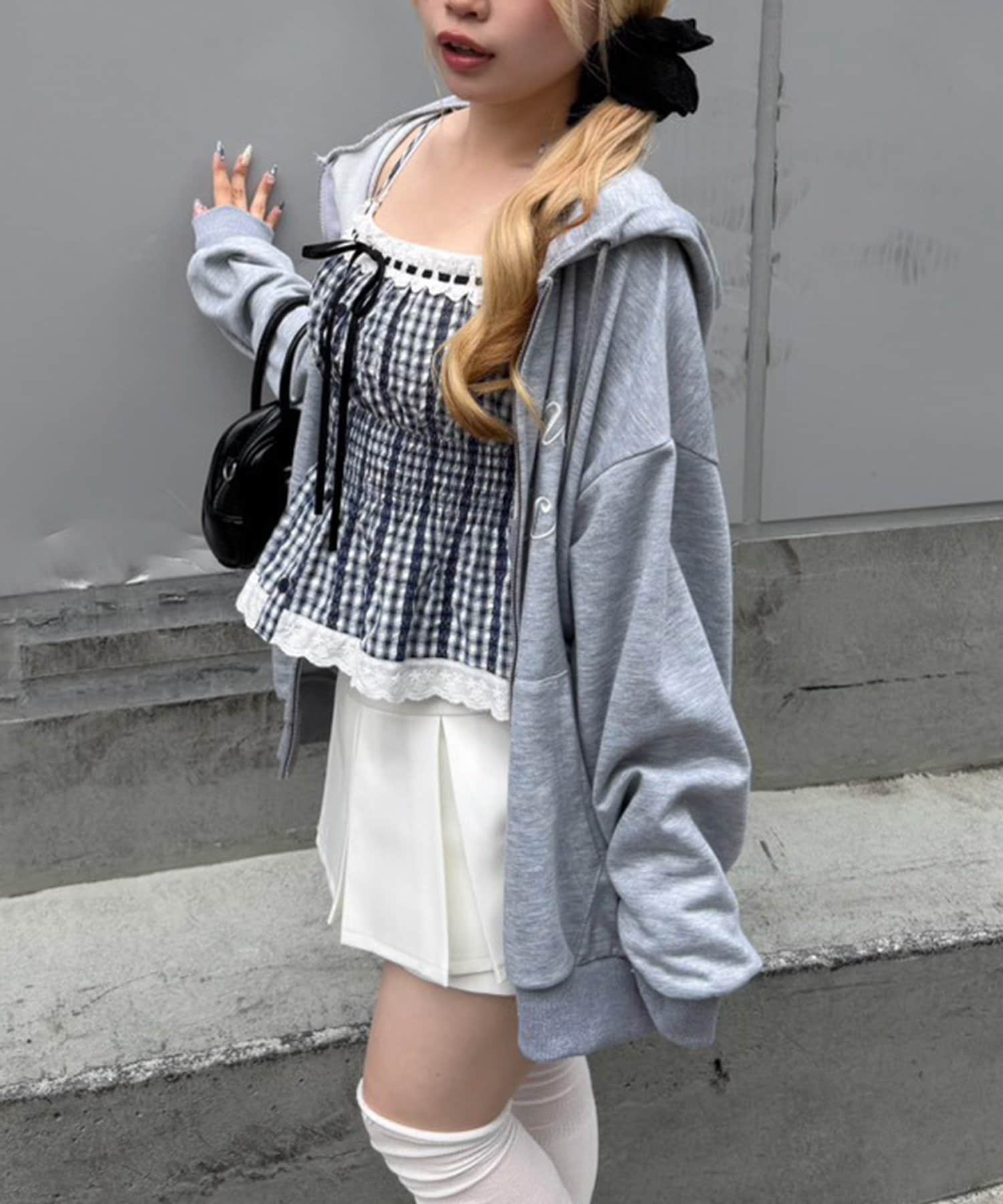 ・キャミソールにデニムミニスカートを合わせて、足元は厚底スニーカーでカジュアルダウン